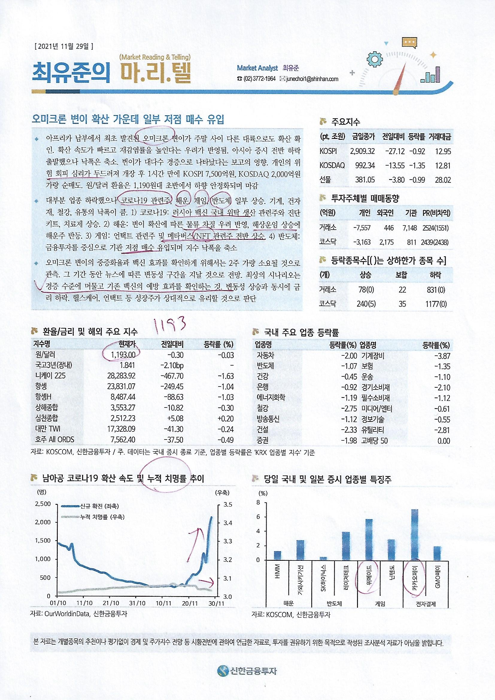 『오미크론 변이 확산 가운데 일부 저점 매수 유입』 - 오미크론 변이 대륙 간으로 확산 확인되며 불확실성 확대 - 개인의 위험 회피 심리 두드러지나 기관, 외국인 일부 저점 매수 - 코로나19 관련주, 해운, 게임, 반도체 일부 상승 - 변이의 중증화율과 백신 효과 확인하기 위한 2주 가량 소요 - 최상의 시나리오는 변이가 경증 ...