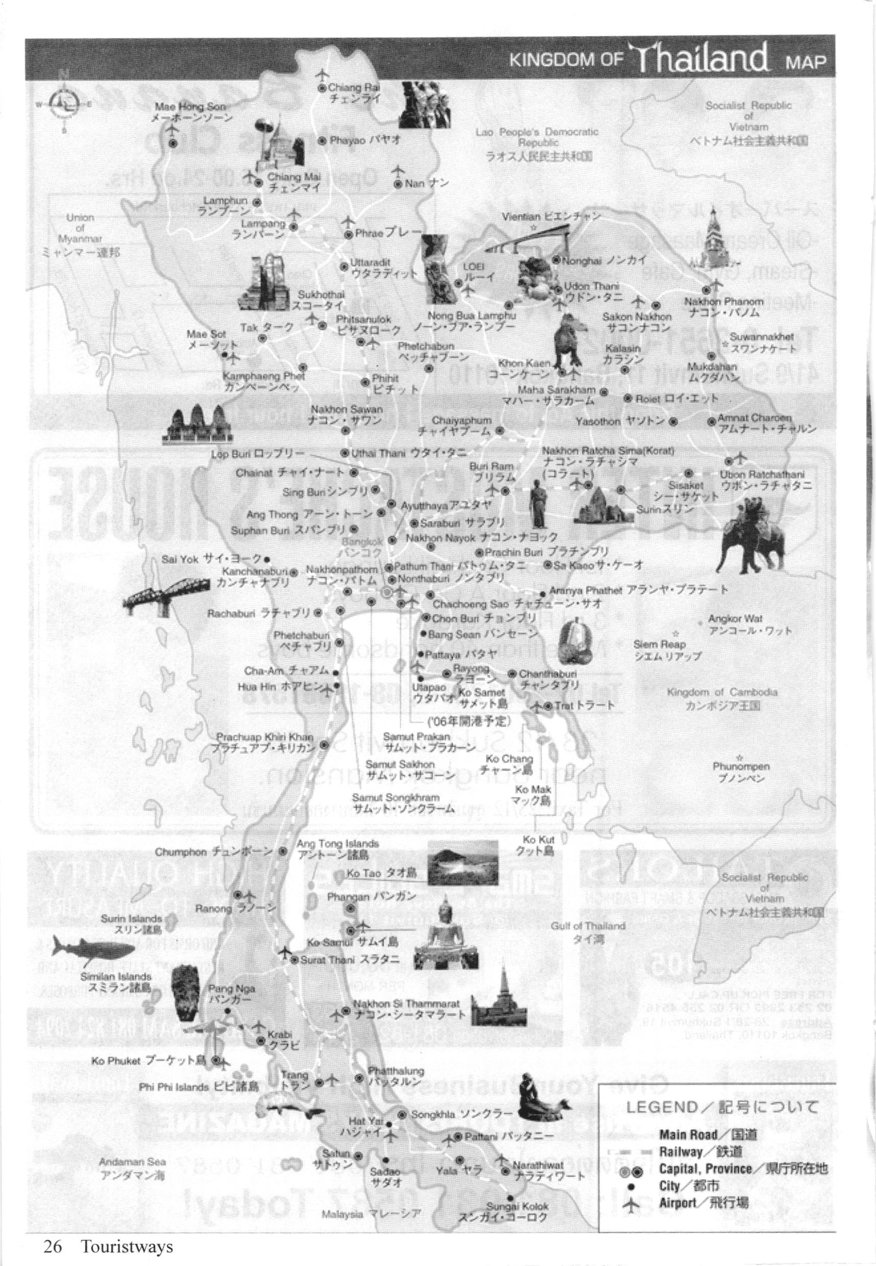 プレー ウボンラ Thong アーン・トーン アユタヤ メンガイ ウクラディット レイ Sukhothai Un There スコータイ Hann Phenom Nong thua Lamphu Pharuok チコン・パノム ヨーグ ピサヌローク ノーン・ファ・ランナー コンナコン ●小 Phetchabun スワンナ ベッチャブーン Khon Kaen Madyan コーンケー ンペッ Maha Sankham a マハー・サラカーム Nakhon Sawan ナコン・サン Anal Ch Chaiyaphum チャイヤゲーム ムナート ラブリー Uthai Thani ウタイ・クニ Nakhon Ratina ma ナコン・チャンマ チャイナート Burt Rum (コラート) Ute Ras Sing Bun シー・サケット sum スリン サラブリ m Bun スパンブリ Nakton ok ナコン・ナヨック バンコク Prochin Bun プラチンプリ shonpattomatum Then パトゥムタニサ・ケーオ ナプリ ナコン・パトム Nortober ノンタブリ、 ランド・プラテート ["hacheerg Saoチャチューンサオ ラチャプリ ●Chon Bar チョンプリ Angkor Wat アンコール・・ Phetchabun ●Blang Sean パンセーン ・ペチャプリ Siem Reap シェムリアップ Amチャアム Hin ホアヒント チャンタブリ Kingdom of Cambod トラ カンボジア王 (06年 Khiri Khan Samut Prakan プ・キリカン サムットプラカーン Ke Chang Samut Sakhon チャーン島 サムット・サコーン プノンペン Ke Mak Samut Songkhram マック島 サムット・ソンクラーム Ray Charithabu Ulap Ko Samet ウタパオサメット Ang Tong Islands 「アントーン島 タット島 Social Ko Tao タオ パンガン 「ベトナム社会 Gulf of Thailand タイ oraeru サムイ島 Surat Thanki スラタニ Nakhon Si Thammarat チコン・シータマラート スクラビ Phatthalung タルン LEGEND/記号に Hot Yo ・Songhia ソンクラー Main Road |