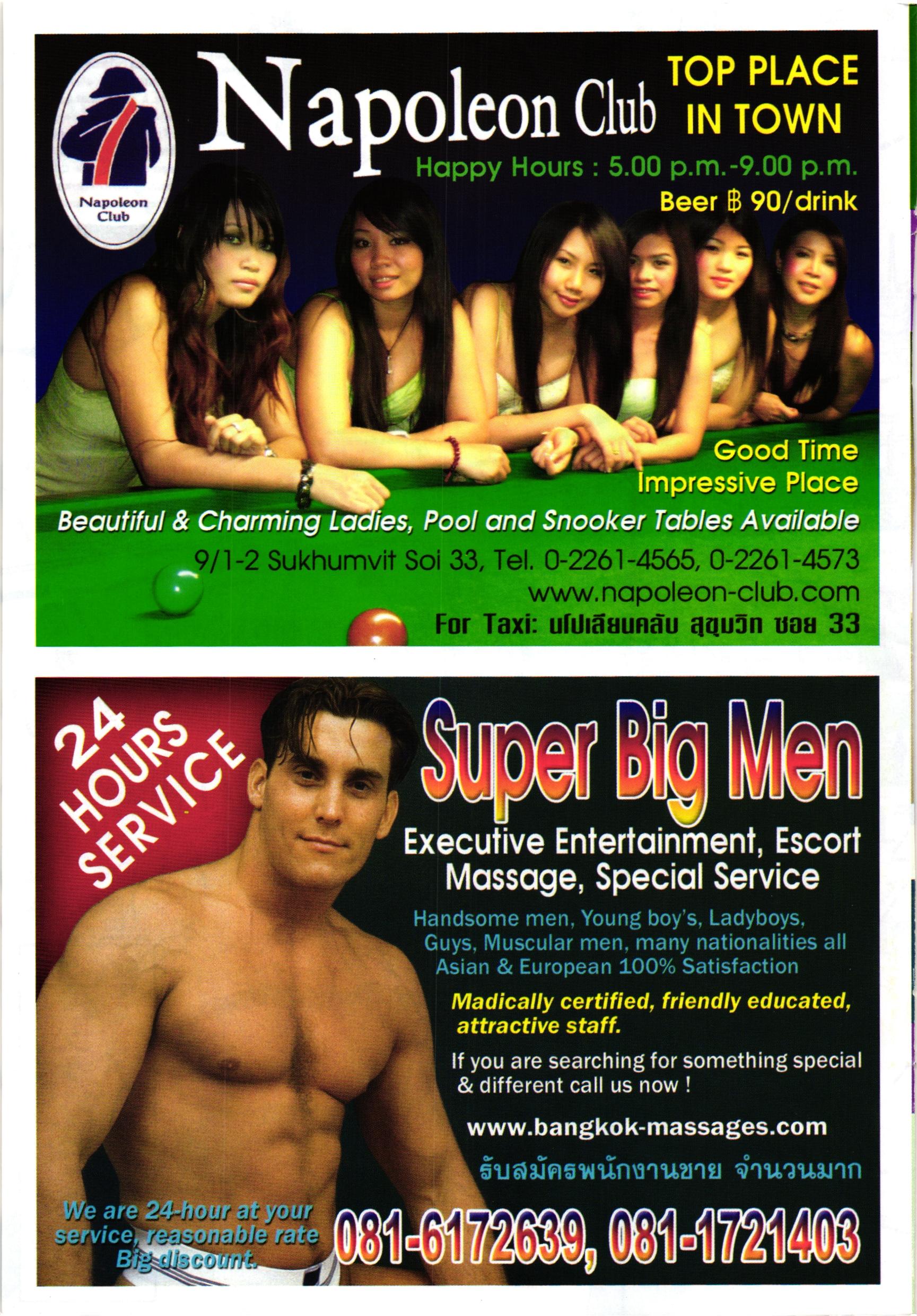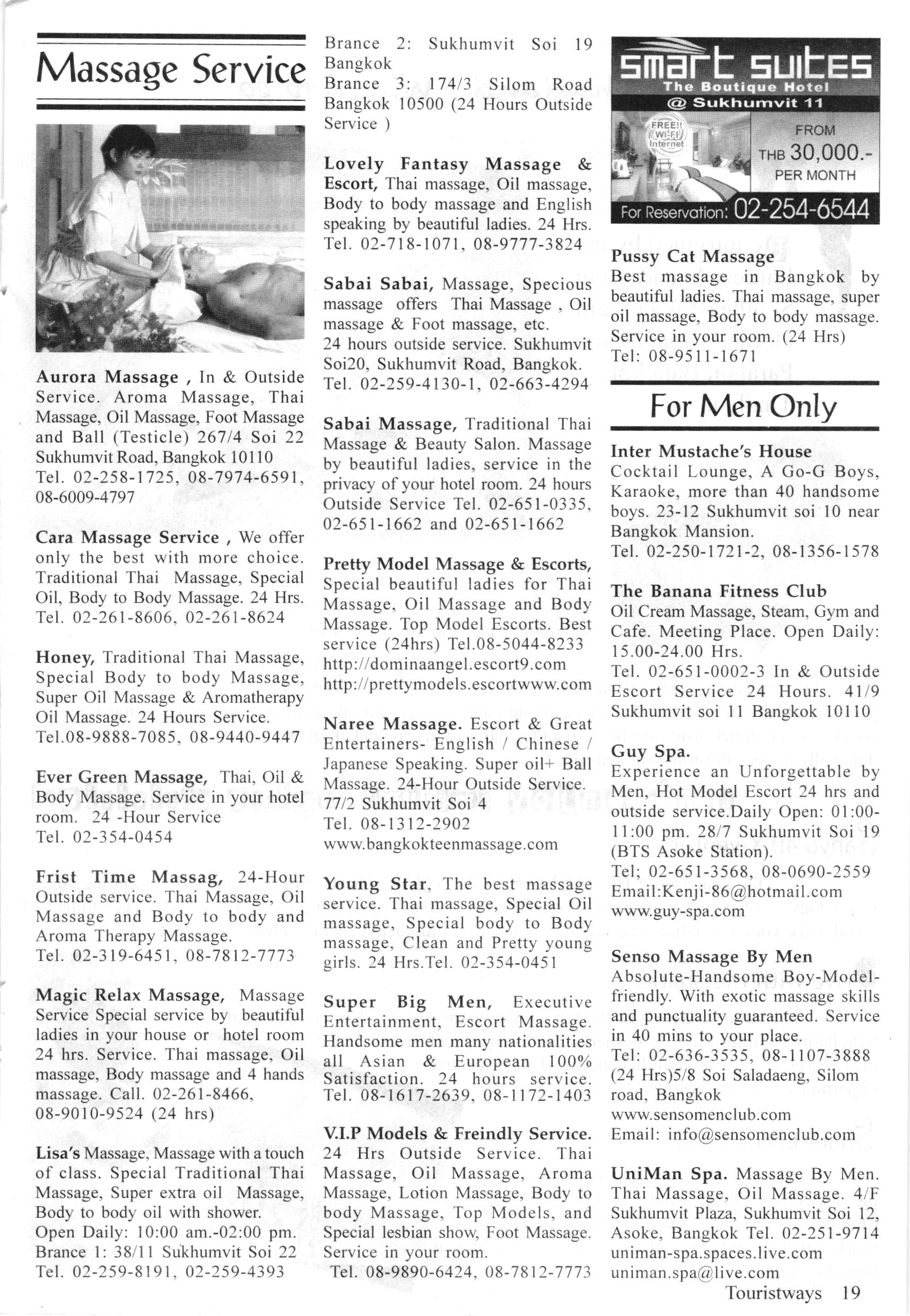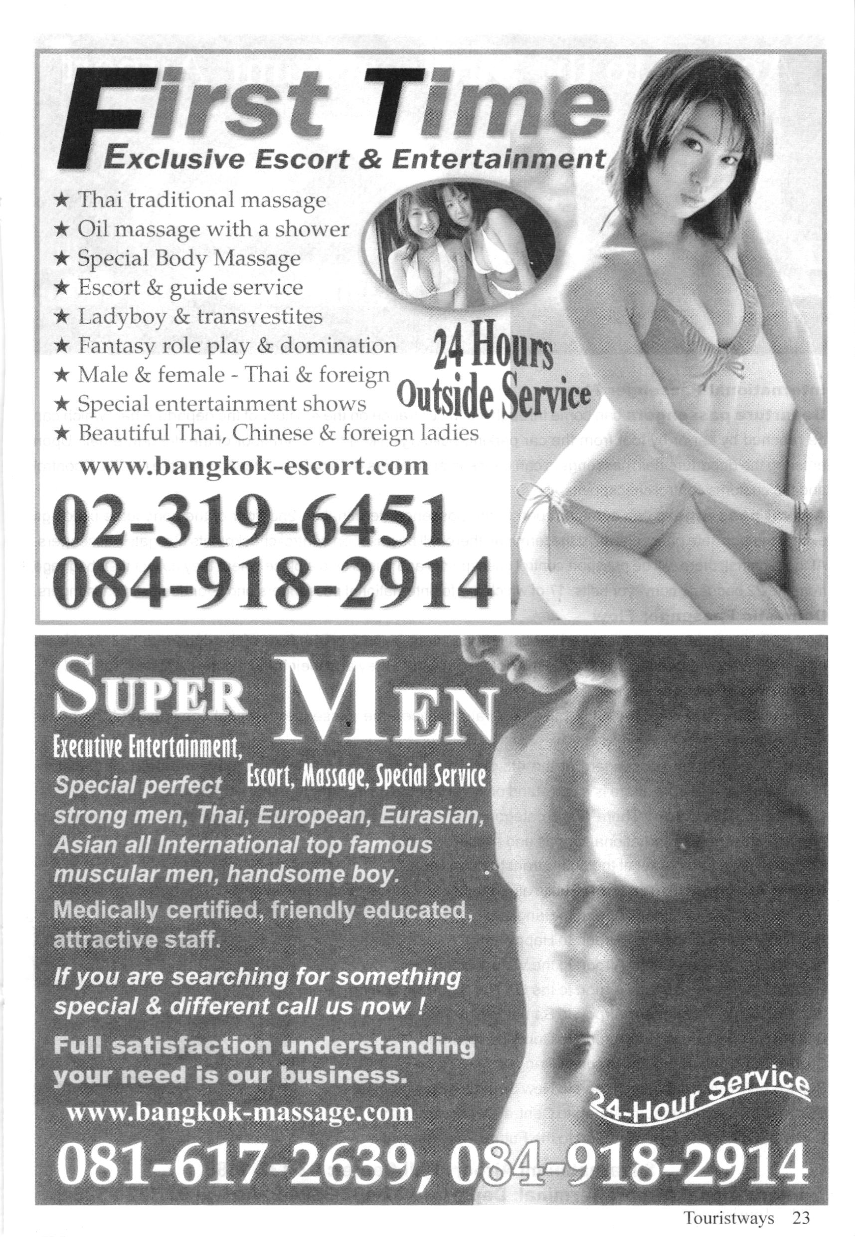 5 6 First Time Exclusive Escort & Entertainment * Thai traditional massage * Oil massage with a shower. * Special Body Massage * Escort & guide service * Ladyboy & transvestites * Fantasy role play & domination * Male & female-Thai & foreign * Special entertainment shows 24 Hours Outside Service * Beautiful Thai, Chinese & foreign ladies www.bangkok-escort.com 02-319-6451 084-918-2914 SUPER MEN Executive Entertainment, Special perfect Escort Massage, Special Service strong men, Thai, European, Eurasian, Asian all International top famous muscular men, handsome boy, Medically certified, friendly educated, attractive staff. If you are searching for something special & different call us now! Full satisfaction understanding your need is our business. www.bangkok-massage.com 24-Hour Service 081-617-2639, 084-918-2914 Touristways 23 |