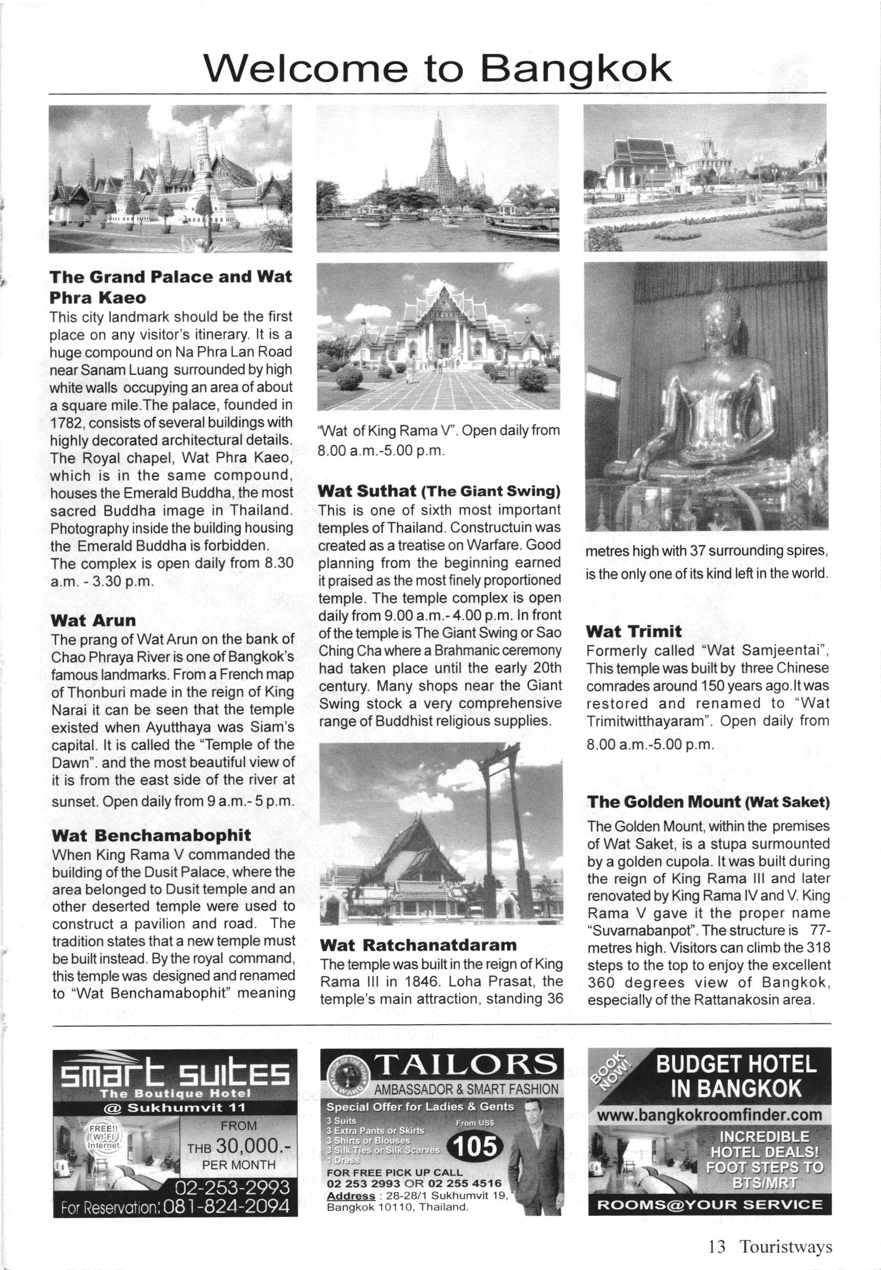 | 2 3 Welcome to Bangkok The Grand Palace and Wat Phra Kaeo This city landmark should be the Stat place on any visitor's itinerary, it is a huge compound on Na Phra Lan Road near Sanam Luang surrounded by high white wals occupying an area of about a square mile. The palace, founded in 1782 consists of several buildings with highly decorated architectural detais The Royal chapel. Wat Phra Kaeo. which is in the same compound. houses the Emerald Buddha, the most sacred Buddha, image in Thailand Photography inside the building housing the Emerald Buddha is forbidden The complex is open daily from #30 am-3:30pm. Wat Arun The prang of Wat Arun on the back of Chao Phraya Riverone of Bangkok's famous landmarks From a French map of Thonburi made in the reign of King Narai it can be seen that the temple existed when Ayutthaya was Sam's capital. It is called the Temple of the Dawn and the most beautiful view of it is from the east side of the river at sunset. Open daily from 9am-5pm Wat Benchamabophit When King Rama V commanded the building of the Dusit Palace where the area belonged to Dust temple and an other deserted temple were used to construct a pavilion and road. The tradition states that a new temple must be built instead By the royal command this temple was designed and renamed to "Wat Benchamabophit meaning smart suites The Boutique Hotel 4 Sukhumvit 11 The 30,000. PER MONTH 02-253-2993 For Reservation 081-824-2094 Wat of King Rama V Open day from 8.00am-5.00pm Wat Suthat (The Giant Swing) This is one of sixth most important samples of Thailand Construct was created as a treatise on Warfare. Good planning from the beginning earned prased as the most finely proportioned temple. The temple complex is open, daily from 9:00 am-4.00pm in front of the temple is The Giant Swing or Sao Ching Chawhera Brahmanc ceremony had taken place unst the early 200 century Many shops near the Giant Swing Meck a very comprehensive range of Buddhilit religious supplies Wat Ratchanatdaram The temple was built in the reign of King Rama in 1846 Loha Prasat, the temple's main attraction, standing 36 TAILORS AMBASSADOR & SMART FASHION Special Offer for Ladies & G 105 metres high with 37 surrounding spres as the only one of its kind let in the wond Wat Trimit Formerly called "Wat Sameentar This temple was built by three Chinese corades around 150 years ago It was restored and renamed to "Wat Trimitwithayaram Open daily from 8.00am-5.00 pm. The Golden Mount (Wat Saket) The Golden Mount within the premises of Wat Saket is a stupa surmounted by a golden cupola. It was built during the reign of King Rama II and later renovated by King Rama Vand V. King Rama V gave it the proper name "Suvarnabanpor The structure is 77 metres high Visitors can climb the 318 steps to the top to enjoy the excellent 360 degrees view of Bangkok especially of the Rattanakosin area BUDGET HOTEL IN BANGKOK www.bangkokroomfinder.com INCREDIBLE HOTEL DEALS! FOOT STEPS TO FOR FREE PICK UP CALL 02 253 2993 OR 02 253 451E S ROOMS@YOUR SERVICE 13 Touristways tat NOW! |