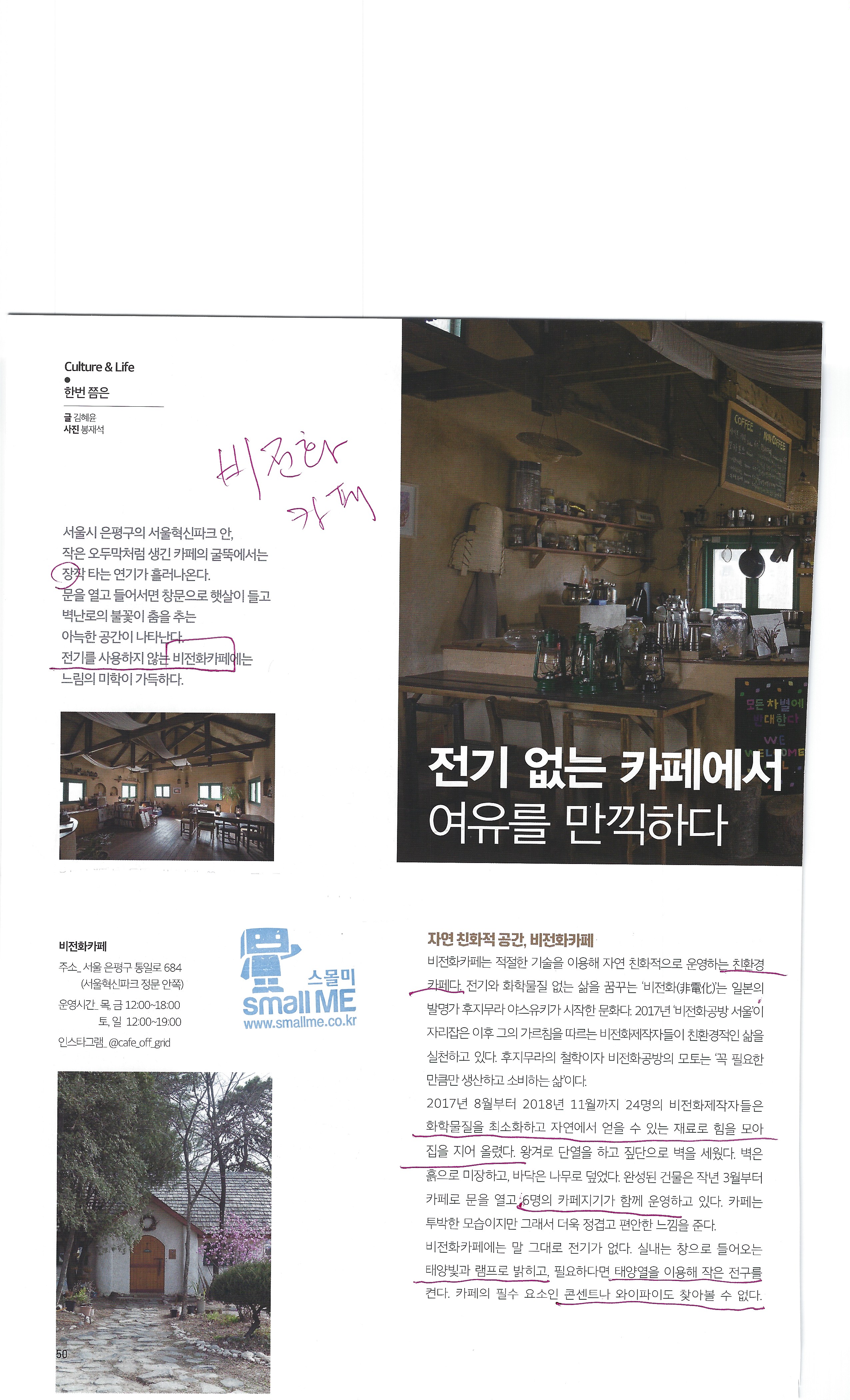 서울시 은평구의 서울혁신파크 안 작은 오두막처럼 생긴 카페의 굴뚝에서는 장작타는 연기가 흘러나온다. 눈을 열고 들어서면 창문으로 뱃살이 들고 벽난로의 불꽃이 춤을 추는 아늑한 공간이 나타난다 전기를 사용하지 않는 비전화카페에는