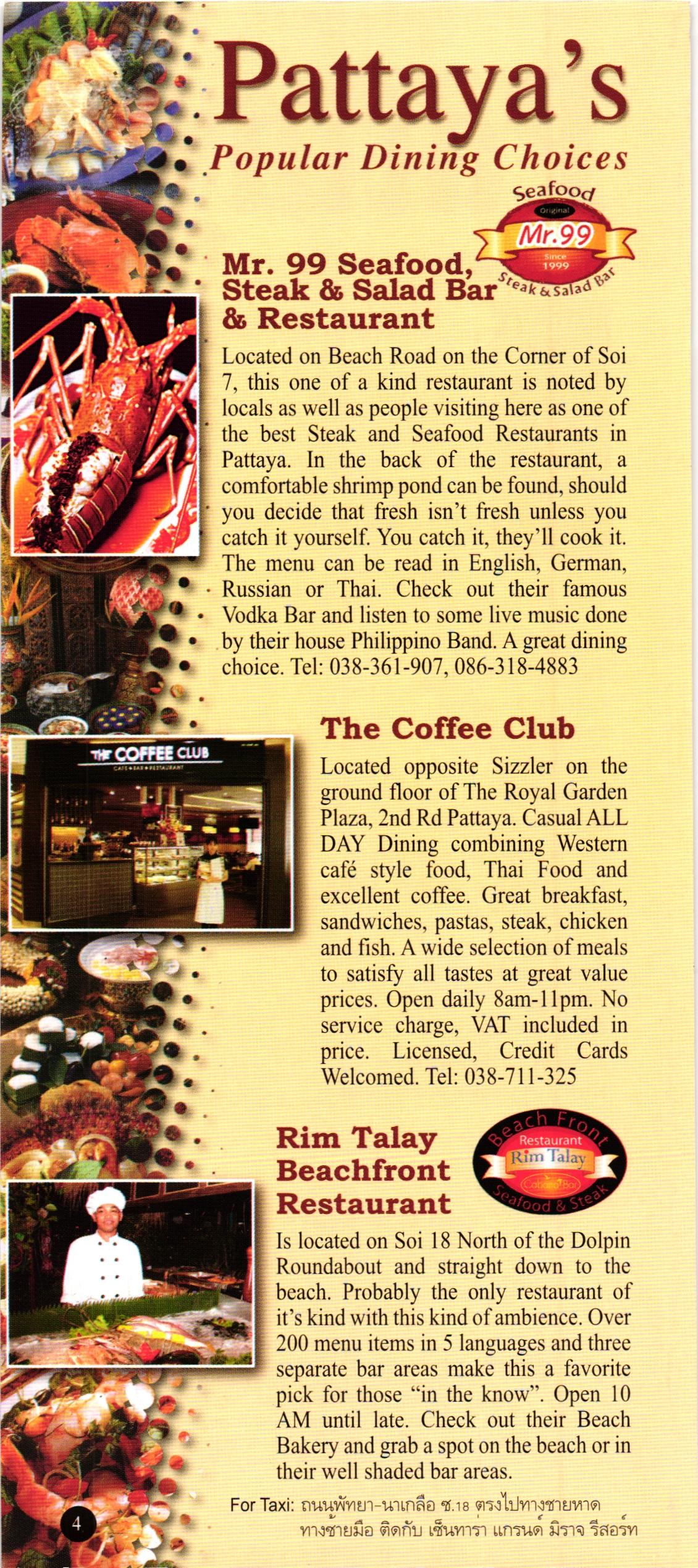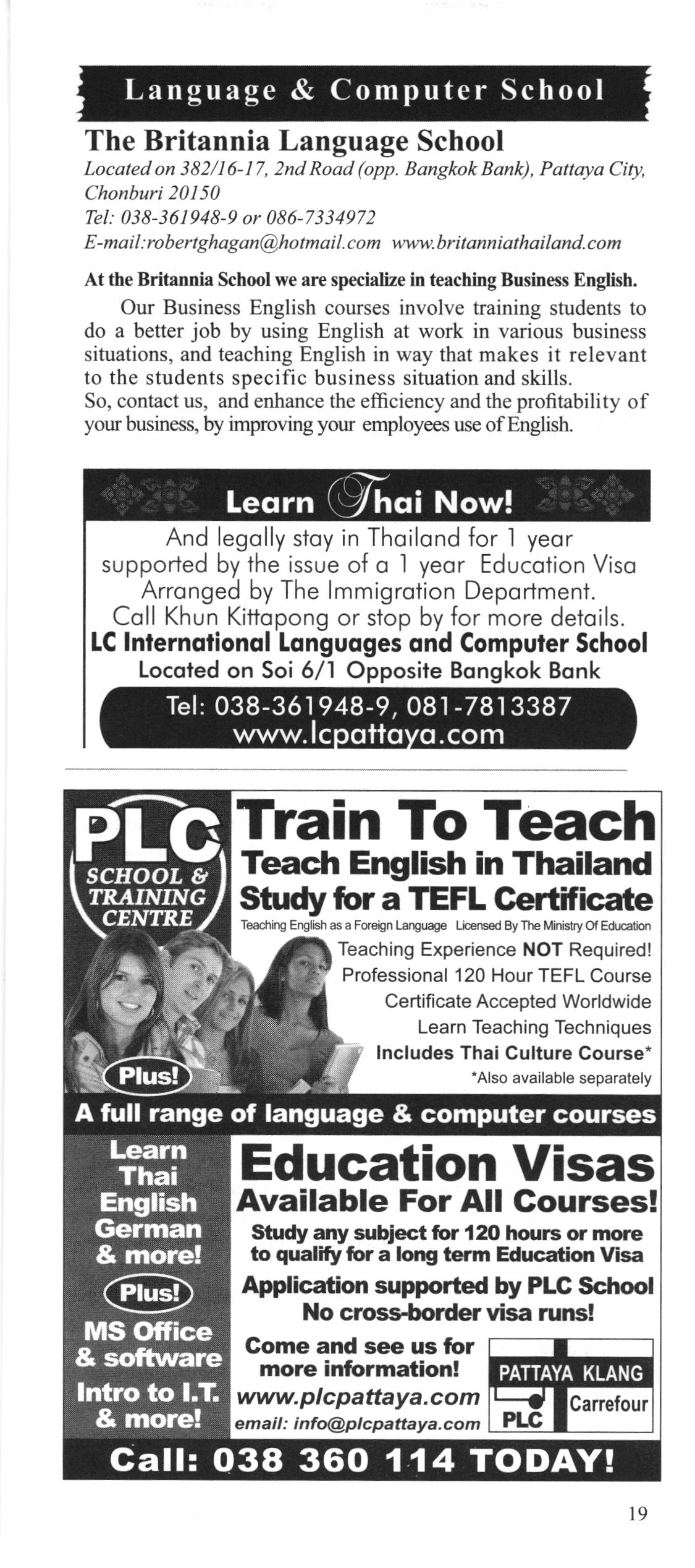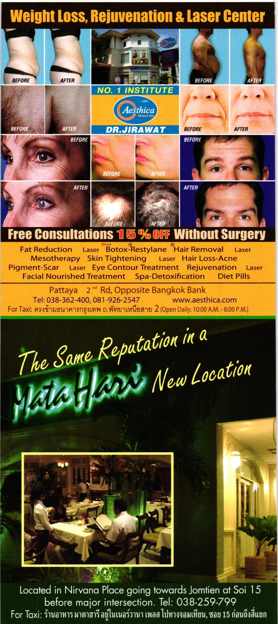 | >THAI EKY ADVENTURES DI SHOPPING ENTERTAINMENT Jump from 4000m/13,000ft Freefall Speed of 200km/h/120mph!!! One of life's most memorable moments, safe, highly experienced professionals and equipment. See the world from a different perspective... experience true freedom. Return transfer incl. from Pattaya Tandem Skydive Traveller USPA Drop Zom call: 085 900 3412 www.thaiskyadventures.com LIVING The Hottest Real Estate Deals in the City info@thaiskyadventures.com 2 Directory Of Businesses & Locations No. Name 2 Easyriders Bar Pub 4 Sitpholek Gym 7 Hippo Restaurant 10 Mike's Mexican Restaurant 13 Da Tiziano 14 Tequila Reef Restaurant 15 Bonkai Resort 18 PROGRESS Language & Computer School 19 Le Mignon 20 Pungpon 21 Cafe Amis 22 Mata Hari 23 Chaiyapoon Inn 25 Dream Teen Massage 29 Mr. 99 30 Nana Bar & Happy Hand Massage 33 Iron Horse Motorcycles 34 Marriott-Royal Garden Plaza B 4 35 Text-And-Talk Academy 36 The Coffee Club 37 Tattoo Studio 39 El Paso 40 Easykart.net 41 First Class 42 Siam Massage&Facial Massage 43 Hard Rock Cafe 44 Lobster Pot 45 Aesthica Medical Spa 46 Happy Home Thai Cooking School C 3 47 Pattaya Royal Beaty Clinic C3 48 The Blues Factory 49 The Mini Golf Pub B4 B4 Grid No. Name 50 Dr. Olivier Clinic 51 Edelweiss Fondue House & Restaurant 52 Captain's Corner 53 Rim Talay 54 Aesthica 55 Bungy Jump 64 PLC Language School 65 Languagecorps 67 Rosie O'Gradys 68 Lighthouse 70 Dive South East Asia 71 Le Pétrus 73 Pipo's Restaurant JOMTIEN 66 Hongsa Kitchen 80 Linda's Restaurant 81 Mermaids Dive Center 82 L'Olivier 83 Hot Stone Grill 84 The Bristol Music Bar 85 Highlander Bar&Guesthouse E Land Office Department E Pattaya Provincial Court E Revenue Office E Amari Hotel Grid E Bangkok Pattaya Hospital D2 E Bus Station to Bangkok E City Hall E Foodland E Highway Police Station E Immigration E Lotus E Pattaya International Hospital D2 B4 ation |