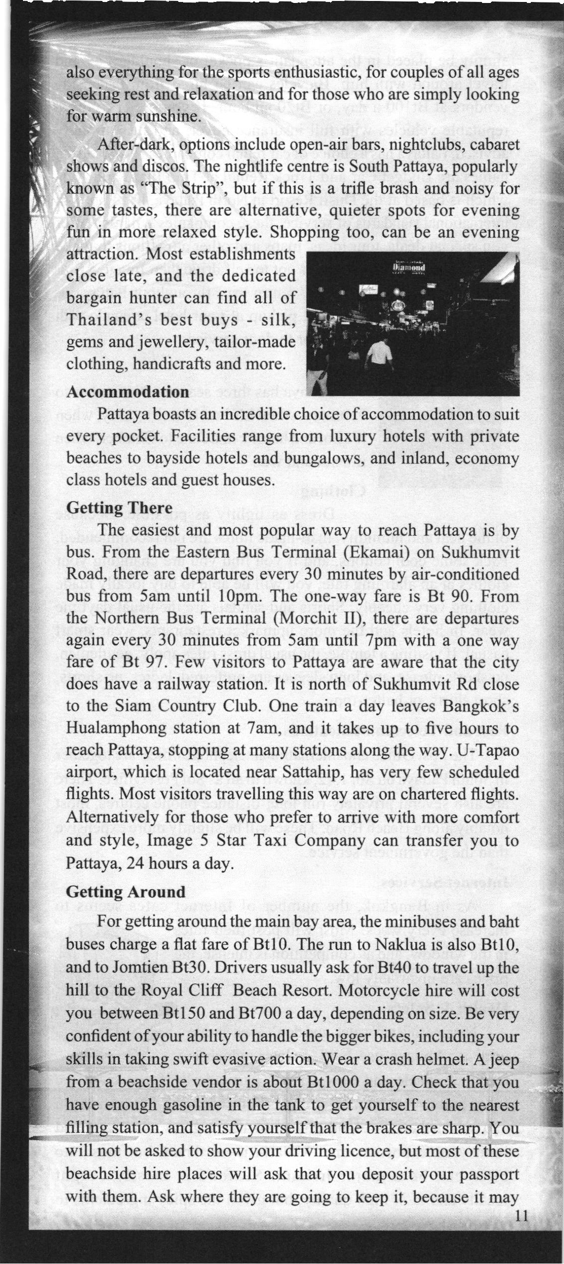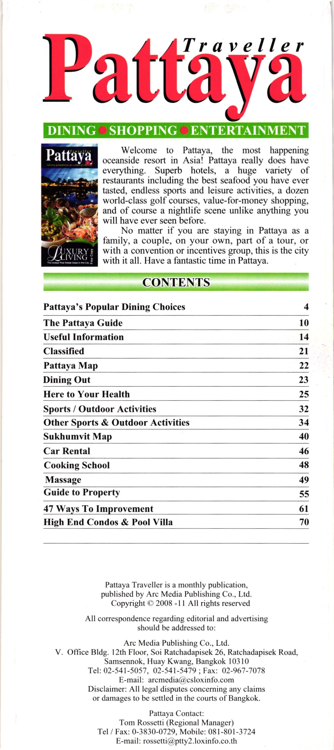 Pattaya Traveller DINING SHOPPING ENTERTAINMENT Pattaya Welcome to Pattaya, the most happening oceanside resort in Asial Pattaya really does have everything. Superb hotels, a huge variety of restaurants including the best seafood you have ever tasted, endless sports and leisure activities, a dozen world-class golf courses, value-for-money shopping. and of course a nightlife scene unlike anything you will have ever seen before. LUNY No matter if you are staying in Pattaya as a family, a couple, on your own, part of a tour, or with a convention or incentives group, this is the city with it all. Have a fantastic time in Pattaya. CONTENTS Pattaya's Popular Dining Choices The Pattaya Guide 4 10 Useful Information 14 21 Classified 22 23 25 Pattaya Map Dining Out Here to Your Health 32 34 Sports / Outdoor Activities Other Sports & Outdoor Activities 40 46 48 Sukhumvit Map Car Rental Cooking School 49 55 Massage Guide to Property 61 70 47 Ways To Improvement High End Condos & Pool Villa Pattaya Traveller is a monthly publication. published by Are Media Publishing Co., Ltd. Copyright © 2008-11 All rights reserved All correspondence regarding editorial and advertising should be addressed to: Are Media Publishing Co., Ltd. V. Office Bldg. 12th Floor, Soi Ratchadapisek 26, Ratchadapisek Road, Samsennok, Huay Kwang, Bangkok 10310 Tel: 02-541-5057, 02-541-5479; Fax: 02-967-7078 E-mail: arcmedianesloxinfo.com Disclaimer: All legal disputes concerning any claims or damages to be settled in the courts of Bangkok. Pattaya Contact: Tom Rossetti (Regional Manager) Tel/Fax: 0-3830-0729, Mobile: 081-801-3724 E-mail: rossetti ptty2 loxinfo.co.th |