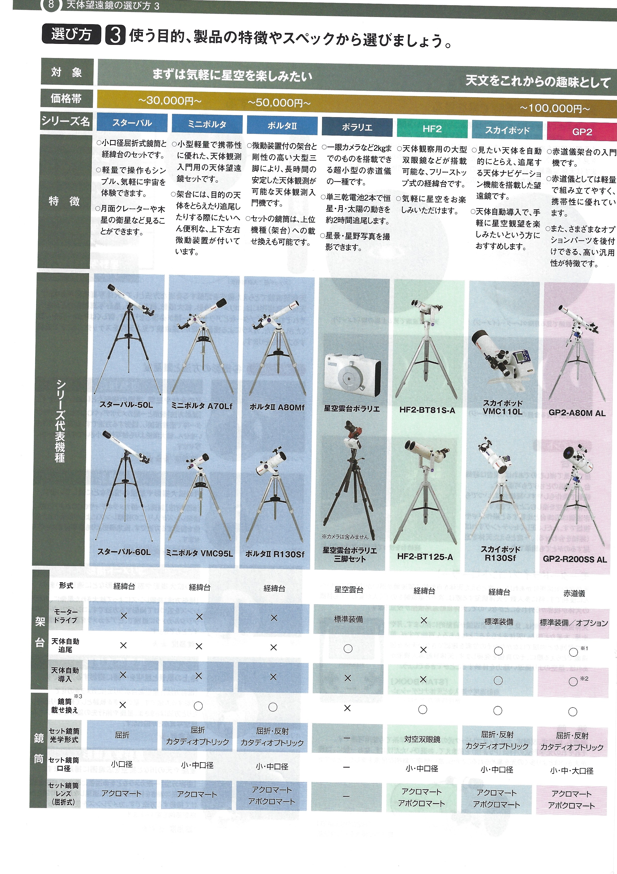 | Vixen Catch the Emotion なる 美景 私の知らない美しさだった。 そこに映る風景は、 Vixen AXD 赤道儀が グッドデザイン賞を受賞。 「使用する人にとって、何よりも重要な ことは精度だと考えられるが、その方 面での評価が高い製品は、無駄な・ ことはせずに作りこまれた から、その高さが伺える」との評 価を受け、グッドデザイン賞を受賞。 デザイン. より多くの方に光学製品に親しみを 持って使っていただくためには、デザイ ンはとても大切です。 従来の形態にと らわれない自由な発想とデザインをまと い生まれるビクセン製品は、これまでに グッドデザイン賞を7度受賞しています。・ ション選定商品にもなっています。 また、JIDAデザインミュージアムセレク グッドデザイン賞 (日本産業振興会認定) [1994年度] フィールドスコープ ジオマ65 [1999年度] ルーペ AR90, AR75、 AR65 [2001年度] “双眼鏡 フォレスタ 8×42BWCF、10×42BWCF [2003年度] 天体望遠鏡 SX (スフィンクス) 赤道儀 [2003年度] フィールドスコープ ジオマプロ67A [2011年度 ] 天体望遠鏡 AXD 赤道儀 双眼鏡 アルテス インストリアルデザイナー JIDAデザインミュージアムセレクション Vol 定商品 ニューフォレスタHR 10×50WP P 8 mm mm mm m 機種名 (鏡筒+架台で表記しています) mm D O P13 P12 (2) (6) (3) 5 O O O O NEW (1) 10 3 (5) 2 (2) 6 O (2) 6 2 2 O A O A 2 6 (4) ボルタⅡI A80MI #R130S! # VMC110L ボルタⅡI A80M I ED80S! ミニボルタ A70L1 P15 ミニボルタ VMC95L スターパル-50L P16 スターパル-60L HF2-BT81S-A P17 RHF2-BT-ED70S-A HF2-BT125-A 31 VMC110L スカイポッド A80Mf P20 31R130Sf スカイポッド ED80Sf A80M-SXW A105M-SXW ED81S-SXW P24 P25 VMC110L-SXC ED103S-SXW VMC200L-SXW VC200L-SXW R200SS-SXW SXD-AX103S SXD-ED115S P27 SXD-ED103S P28 SXD-NA140SSf SXD-VC200L SXD-R200SS SXP-AX103S SXP-ED103S P30 SXP-ED115S P31 SXP-VC200L SXP-R200SS AXD-AX103S AXD-AX103S-P AXD-VMC260L P33 AXD-VMC260L-P GP2-A80MF AL P34 S GP2-R130Sf AL GP2-A80M AL P36 GP2-A105M AL GP2-R200SS AL GPD2-ED81S (N) GPD2-ED103S (N) P38 GPD2-R200SS (N) GPD2-VC200L (N) 2 2 6 O 2 6 2 6 (2 O A (4) NEW 2 NEW 2 (6) 2 NEW NEW NEW (2) 2 (6) (2) 2 2 A 2 (6) A NEW NEW NEW 2 NEW 2 NEW (4) (2) (2) 4 2 NLVシリーズのみ ② VC用延長チューブを併用 フリップミラーの42T-317AD SXを取外し、42T-50 BADを -31.7ADE @64mmDCU37.55mmDCU39,45mmDCU 7.364-31.7ADER 07-FIL 7.45mmDCU7RFa-743mm.36.4-31.7AD ▲適合しますが、本体のキャップに絞り穴がないので短時間の太陽観察のみ可能です。 などが熱くなったら、 △適合しますが、倍率がたいへん高くなります。 (6) ※マルチプレートはAXD用を推奨 |