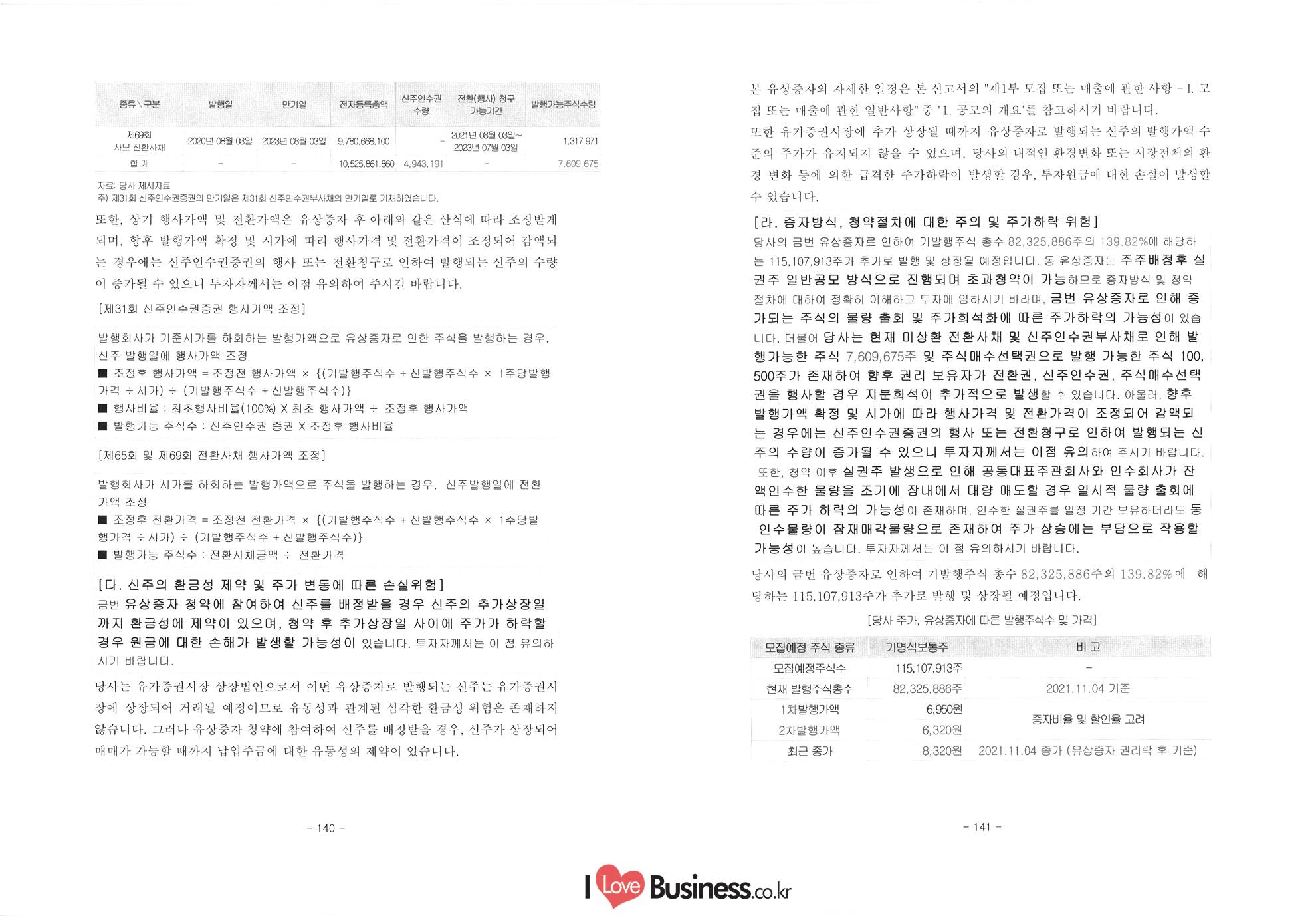 기명식 보통주 115,107,913주 모집 또는 매출총액 : 727,482,010,160원 (예정)