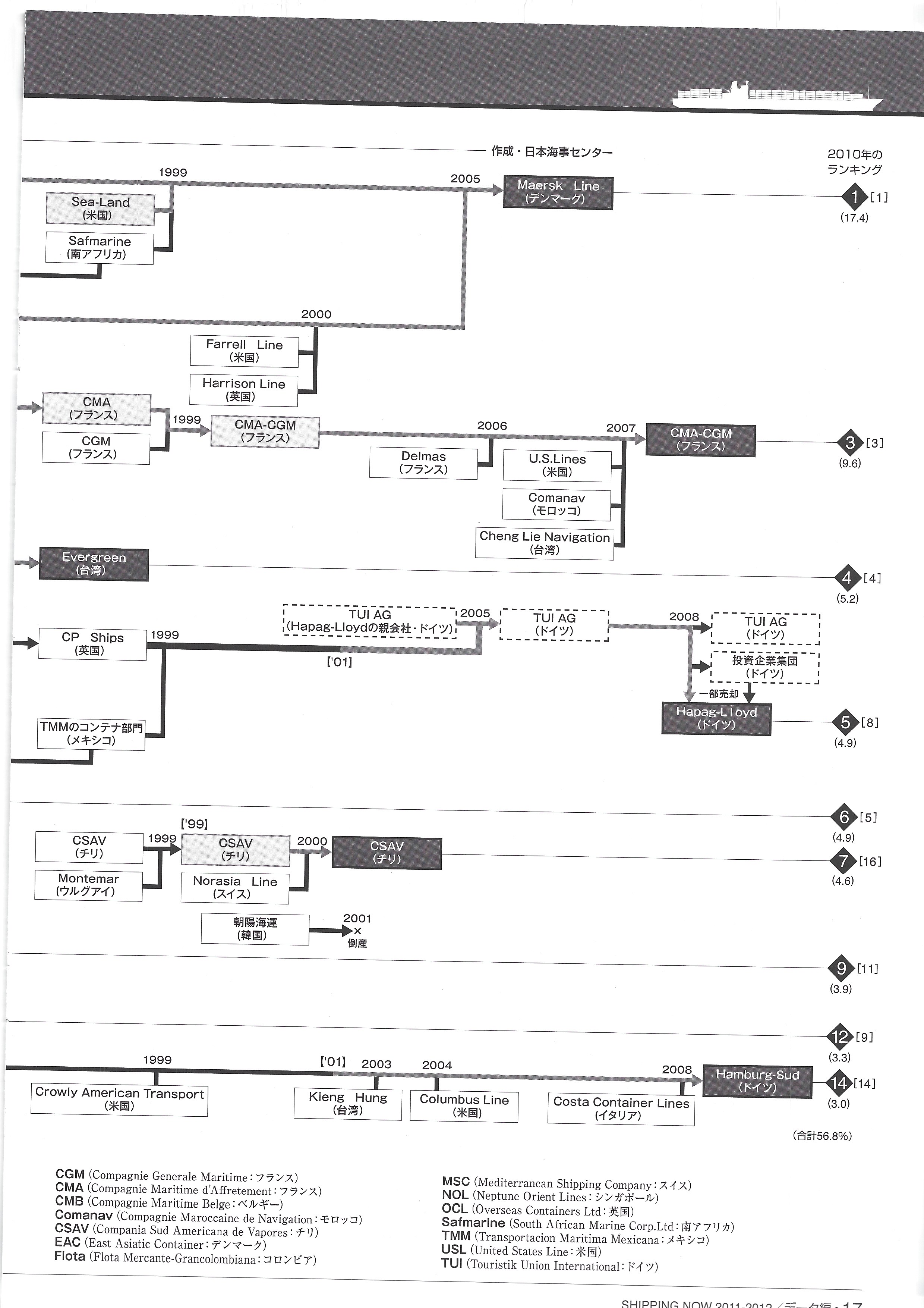 5.大手コンテナ船主の主なM&A等の動き(企業グループ別フローチャート) / 作成 日本海事センター······ 16-17 6. 我が国外航海運大手企業の再編の流れ/日本センター/出典 18-19