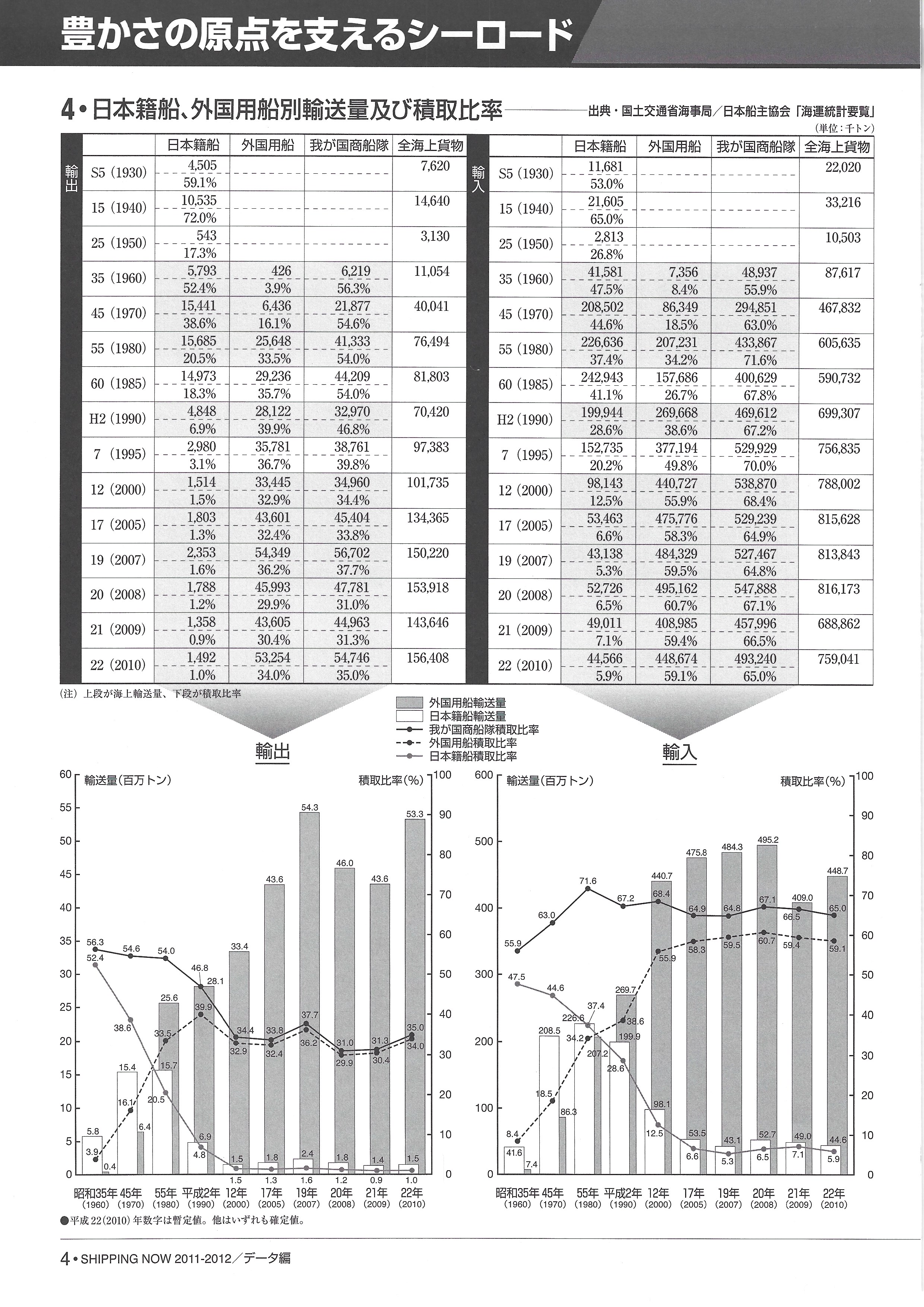 4. 日本語船、外国別輸送量及び精取比率/ 出典 国土交通省海事局/日本駐4