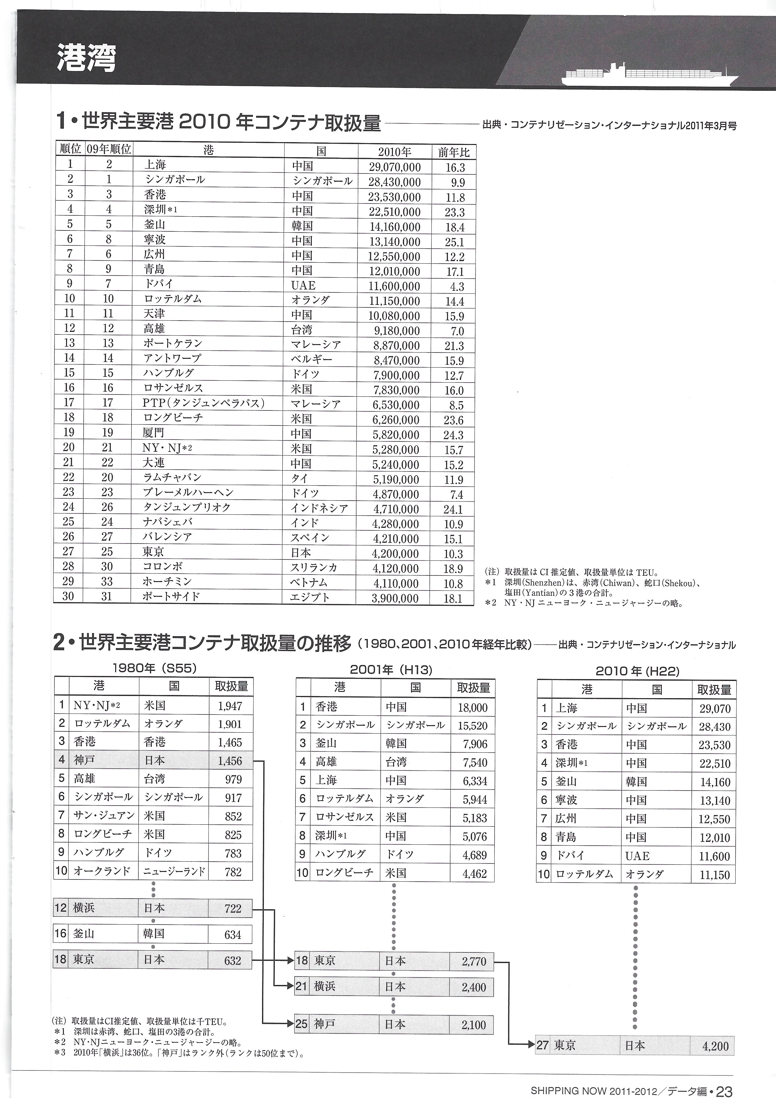 1. 世界主要2010年コンテナ取扱量/出典コンテナリゼーション・インターナショナル2011年3月号 ......23 2. 世界主要コンテナ取扱量の推移 (1980, 2001, 2010年経年比較) /出コンテナリゼーション・インターナショナル・・・・23