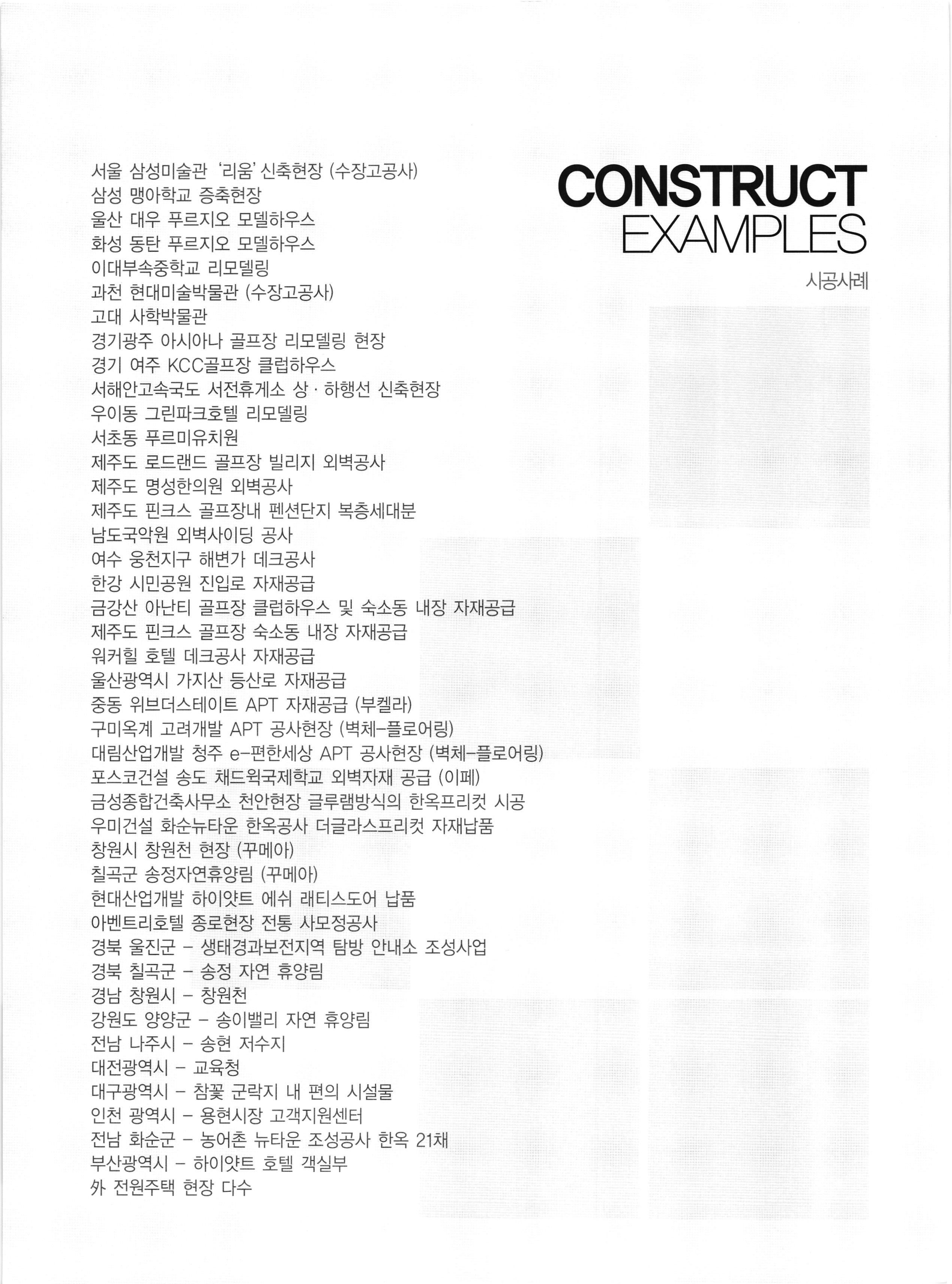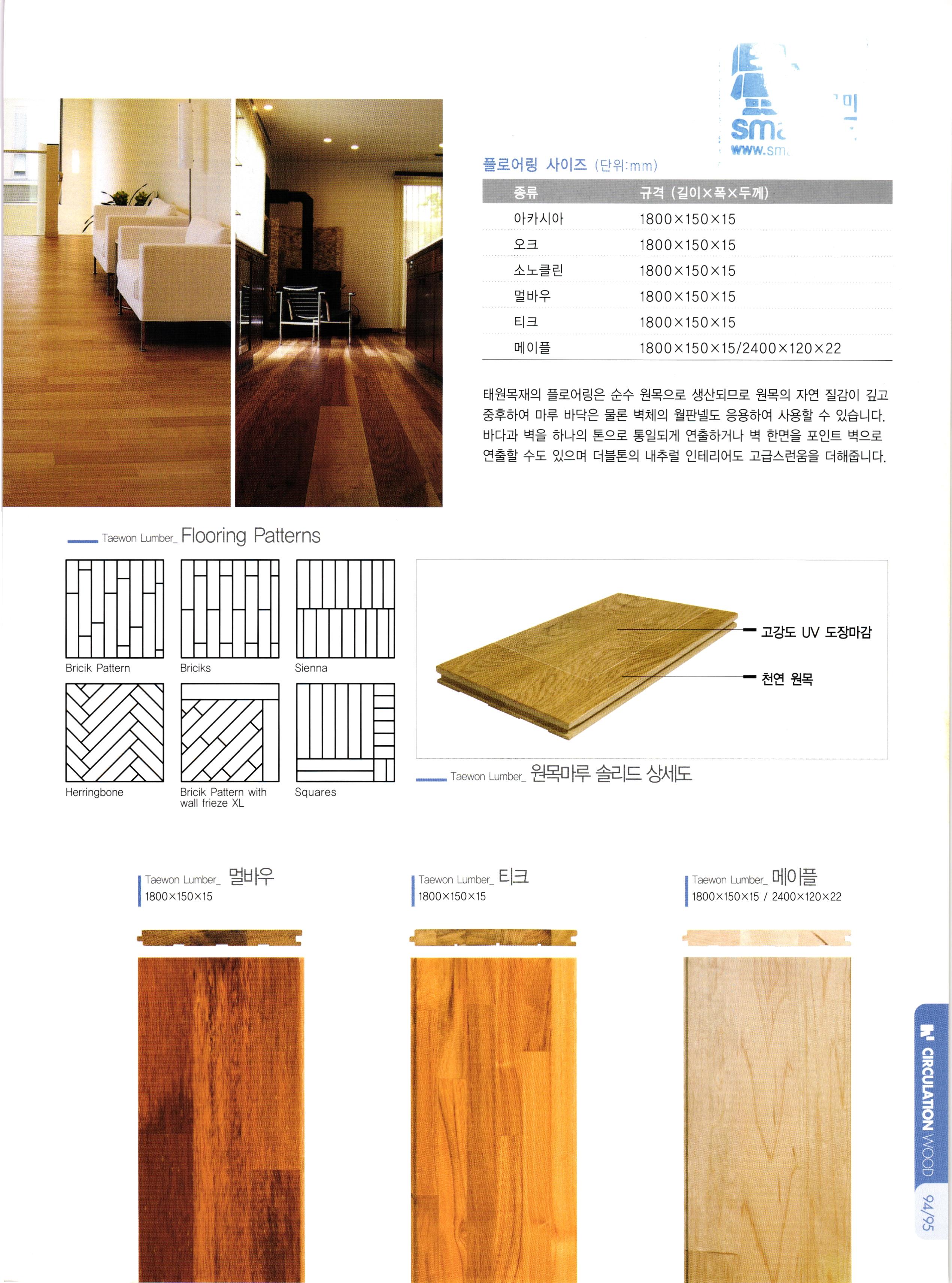 | Ipe Cumaru 꾸마루 Eucalyptus 유칼립투스 Rosemary 로즈마리 Basralocas 바스라로카스 Walnut Oak Old Glowth D/F Yellow Cedar 옐로우시다 Red Cedar 적삼목(스기) Hemlock Douglas 더그라스 Cherry Maple 오크 |