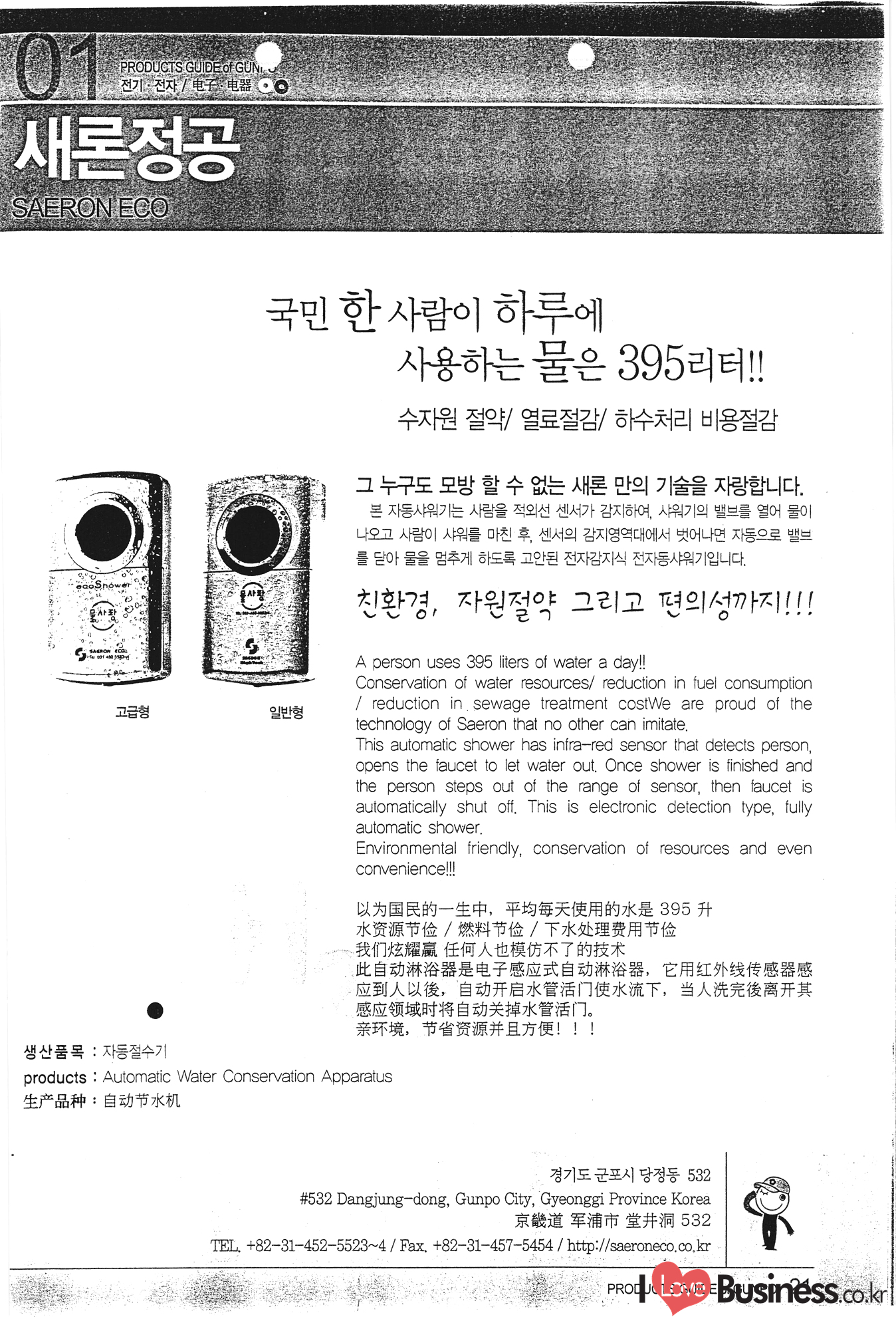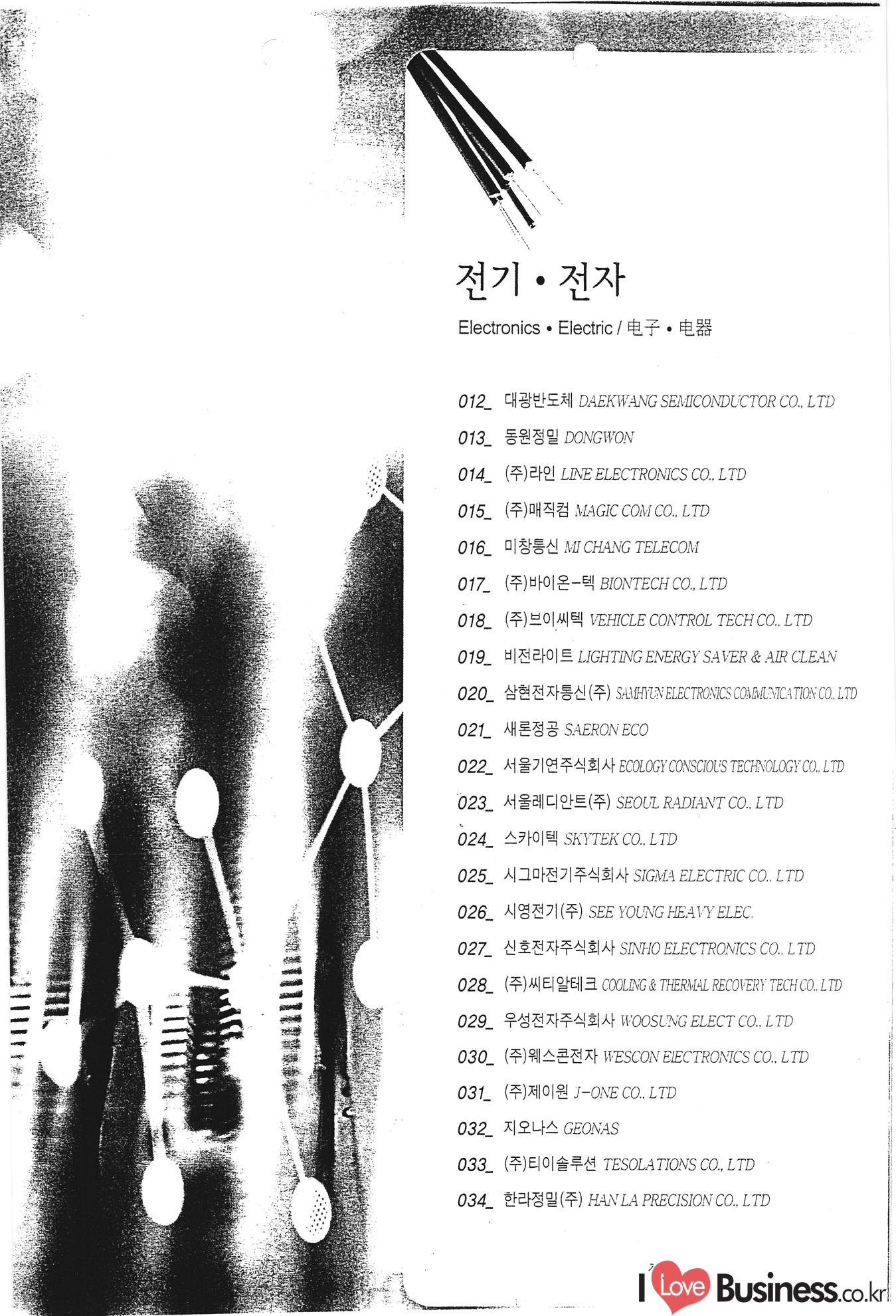 019 20E LIGHTING ENERGY SAVER & AIR CLEAN 020 (F) SAHYUN ELECTRONICS COMMUNICATION CO., LTD 021 새론정공 SAERON ECO 0227 ECOLOGY CONSCIOUS TECHNOLOGY CO., LTD 023 (7) SEOUL RADIANT CO., LTD 024 701 SKYTEK CO., LTD 0254 SIGMA ELECTRIC CO., LTD 026 () SEE YOUNG HEAVY ELEC. 027 ASINHO ELECTRONICS CO., LTD 028 (F)EE COOLING & THERMAL RECOVERY TECH CO.LTD 029 A WOOSUNG ELECT CO. LTD 030 (F) WESCON ELECTRONICS CO., LTD 031 (0 J-ONE CO., LTD 032 지오나스 GEONAS |