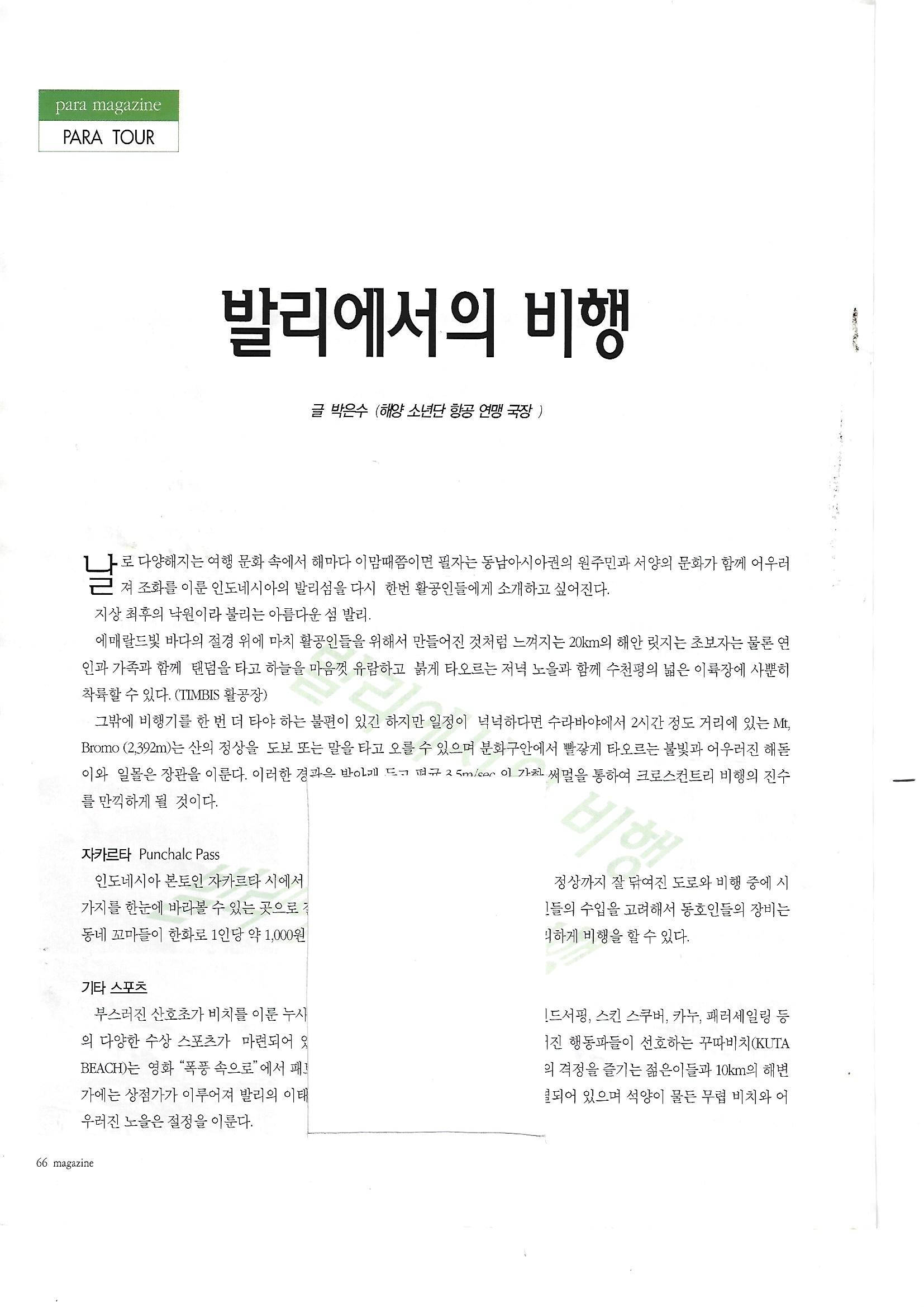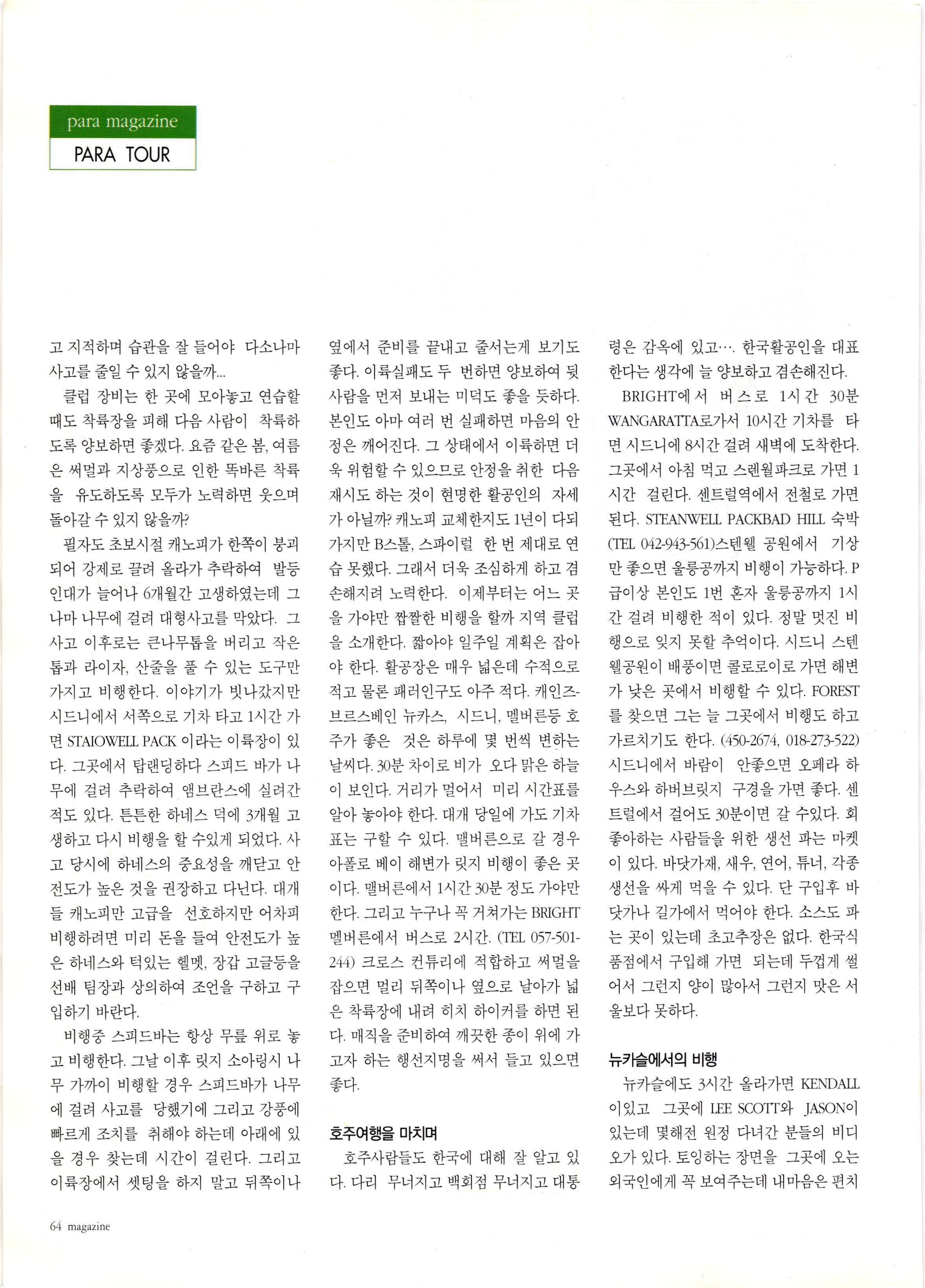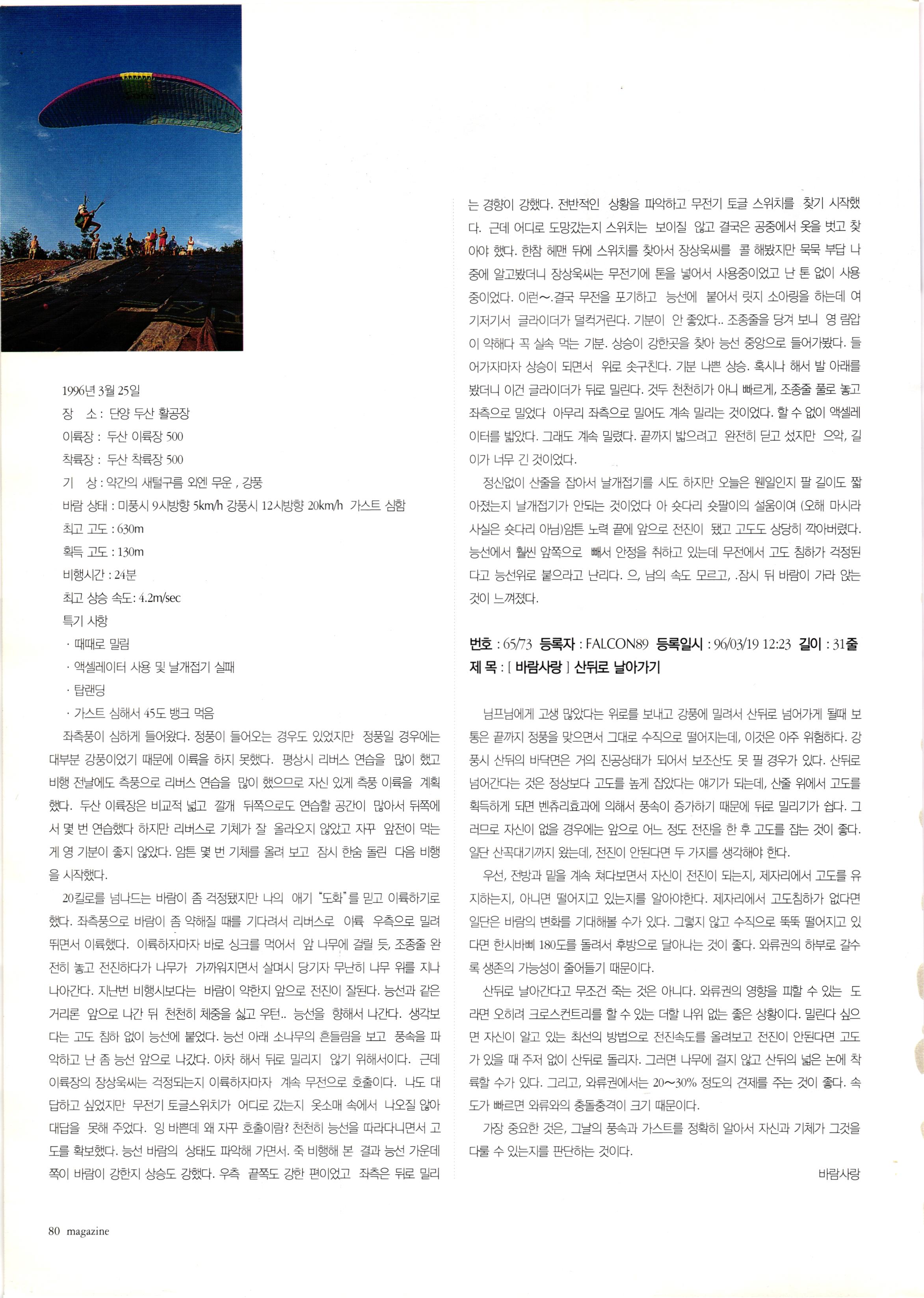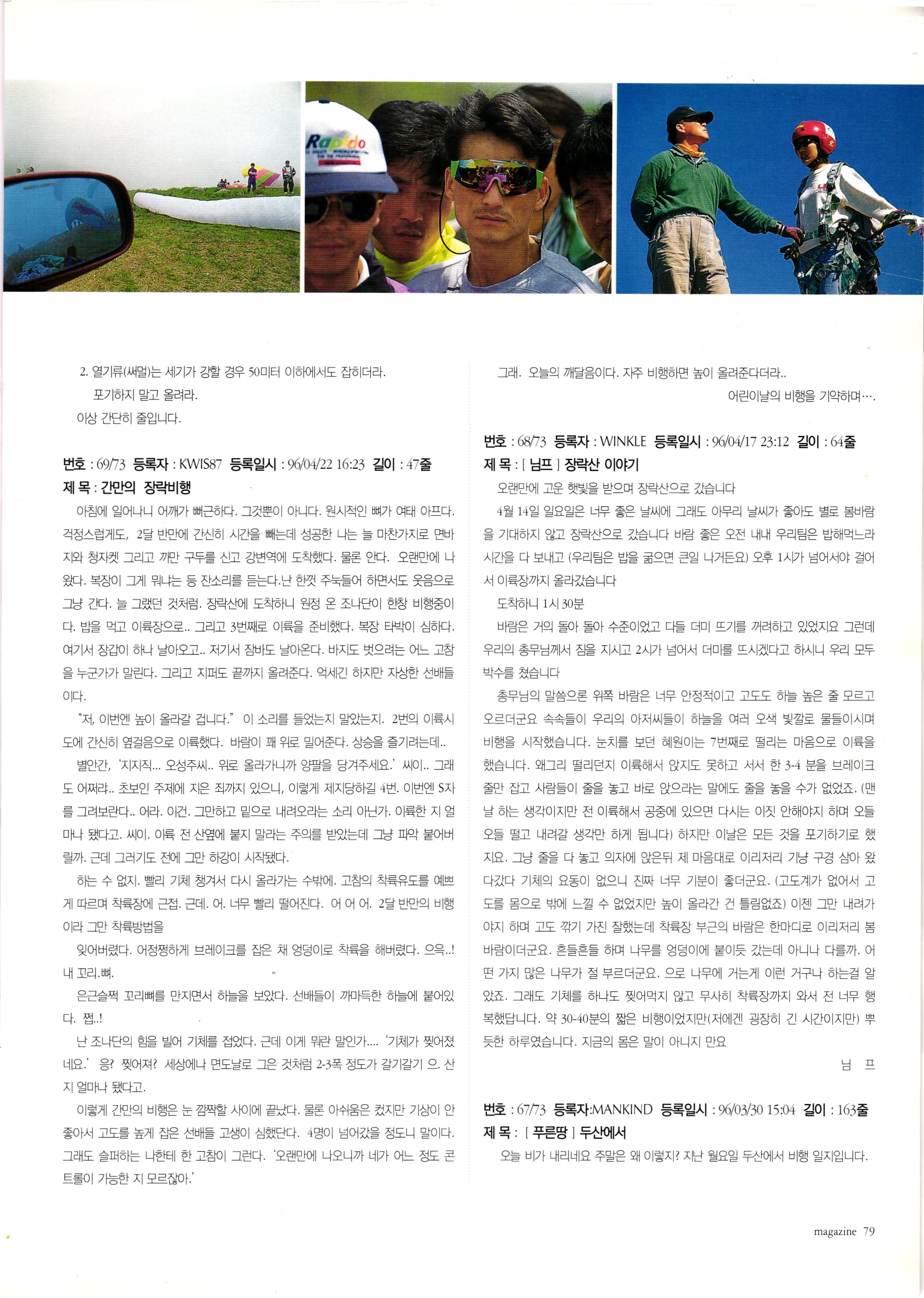그리고 패러글라이더 말고, 패러슛으로 비행하다가 (그때는 패러슛 2대가 기체의 전부였다.) 소나무 사이에 떨어지면서 40여분 기절해 있다가...글라이더 추스려서 착륙장으로 왔던 기억이 난다.