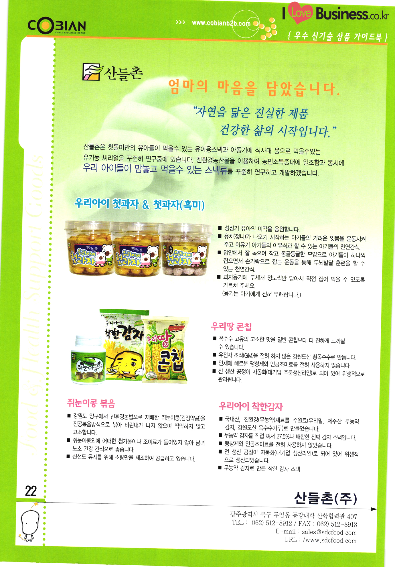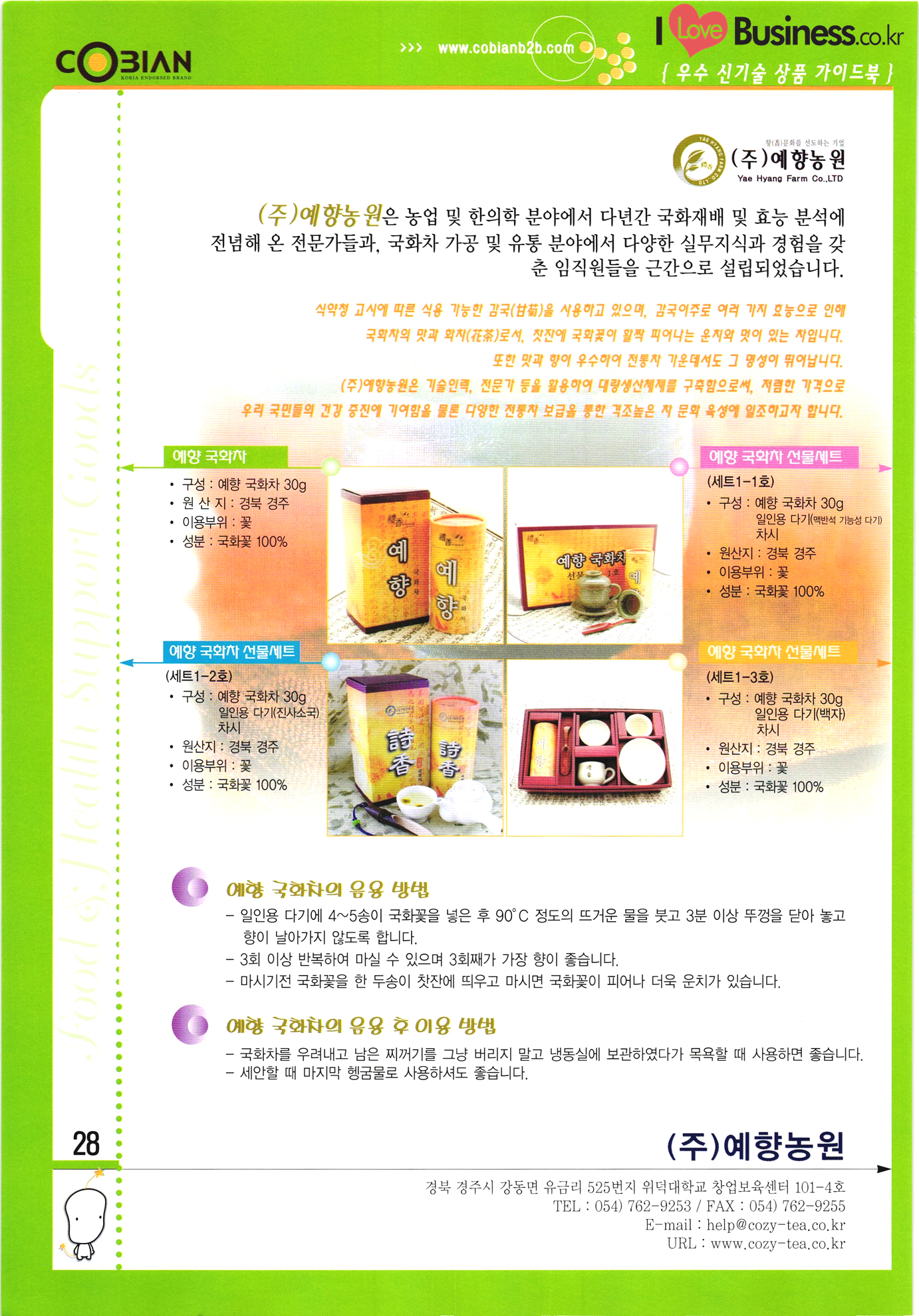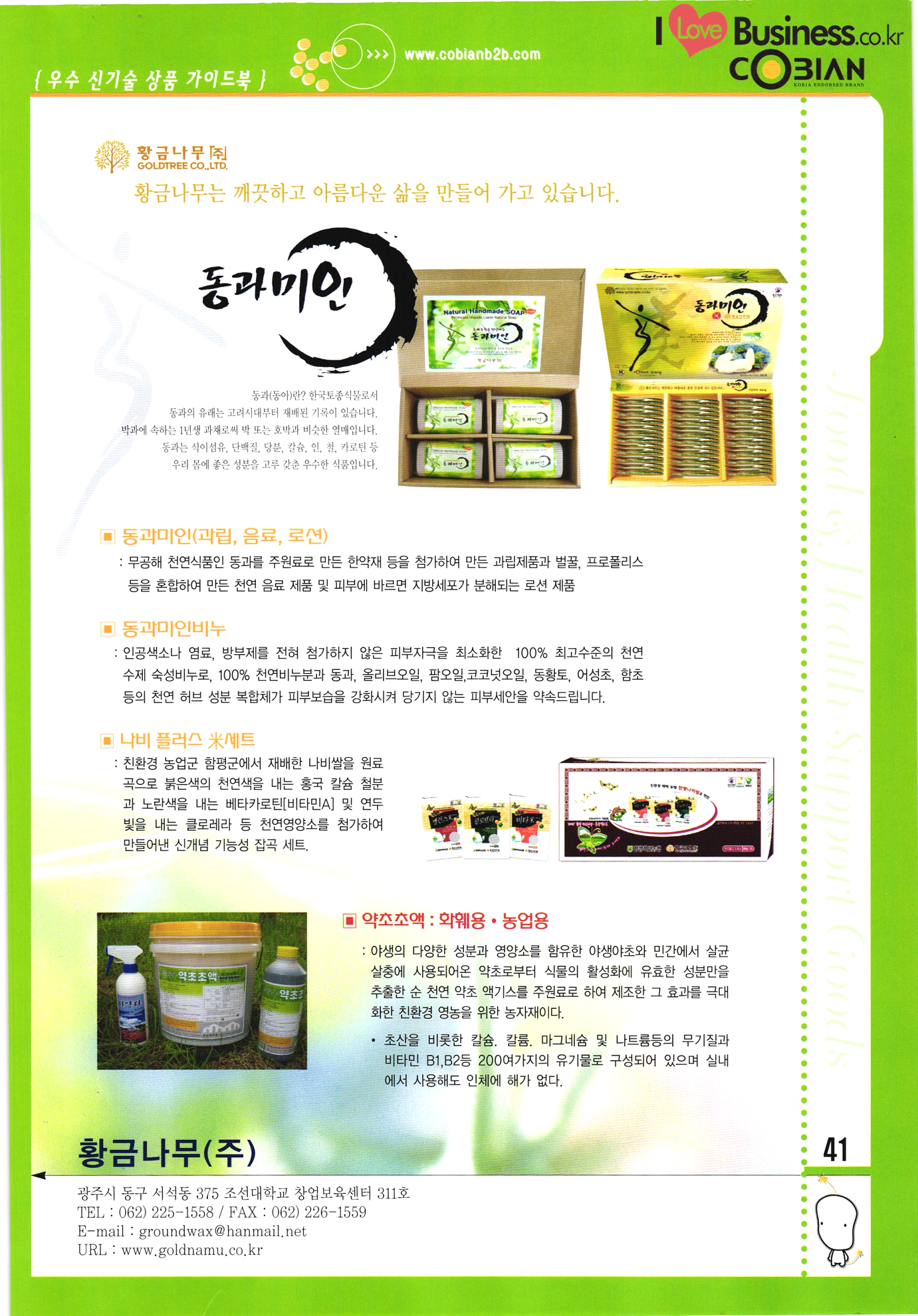 (주)유진종묘 - 유기농 전통육종법 재배기술, 웰빙청국장 자두사랑-자두와인, 자두잼, 자두비누 | (주)좋은씨앗 - | 쌈추 외 | ○ 진주식품 - 제주도 특산젓갈 | (주)태상인터내셔날 - ZEUS & City Farm (주)포젠 - | AVEAMR - 건강보조식품 | 푸드 사이언스 - 수복강령 | C (주)프로바이오닉 - 행복한 강아지 도거트 | ○ 프롬웰 - 프롬빈 청국장 외 | ○ (주)한경햄 - | 볼부르크 | ○ (주)한스바이오-홍국쌀 외 | ○ 황금농원(주)동과미인, 균사체지력 | O HDR(주) | 알칼로젠 알칼리환원수 관련제품 Love Business w.coblanb2b.com |