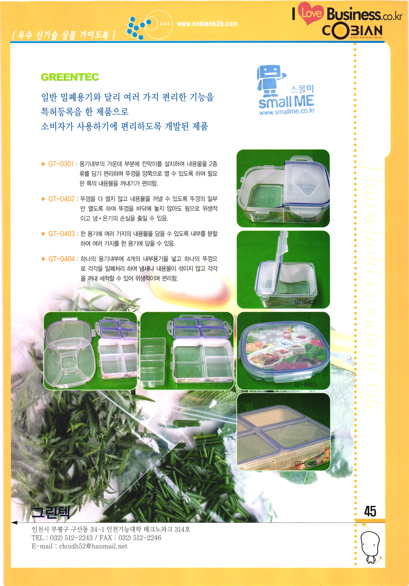 | 우수 신기술 상품 가이드북 : 1 KORIA ENDORSED BRAND 식음료 & 건강보조식품 가정 생활용품 섬유 · 의류 & 신발 의료 • 약품 & 바이오제품 공예 · 악세사리 & 완구 및 문구류 스포츠·레저 & 건강관련 제품 건축 • 환경 관련제품 전기·전자 & 기계 제품 컴퓨터 & 소프트웨어 |