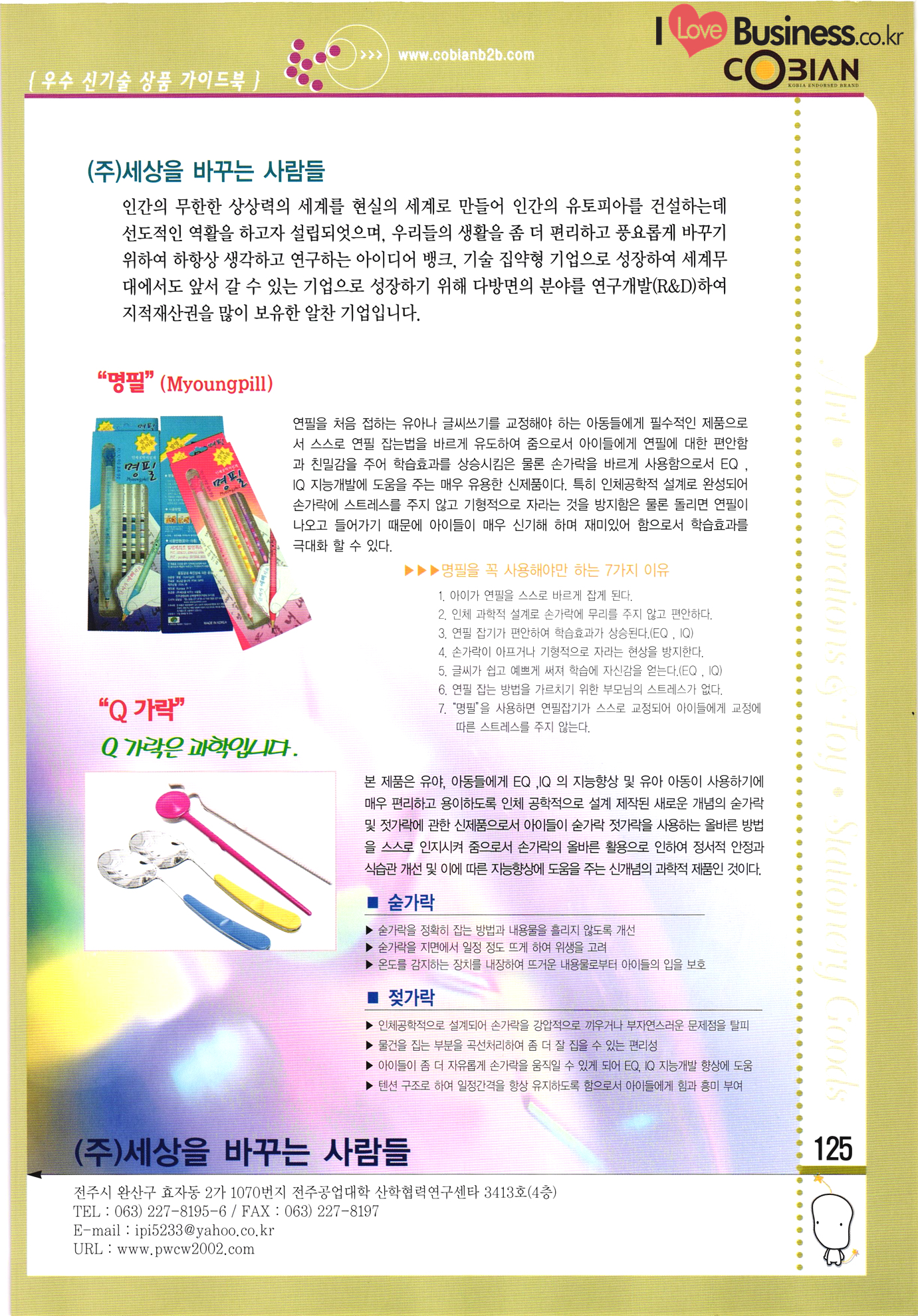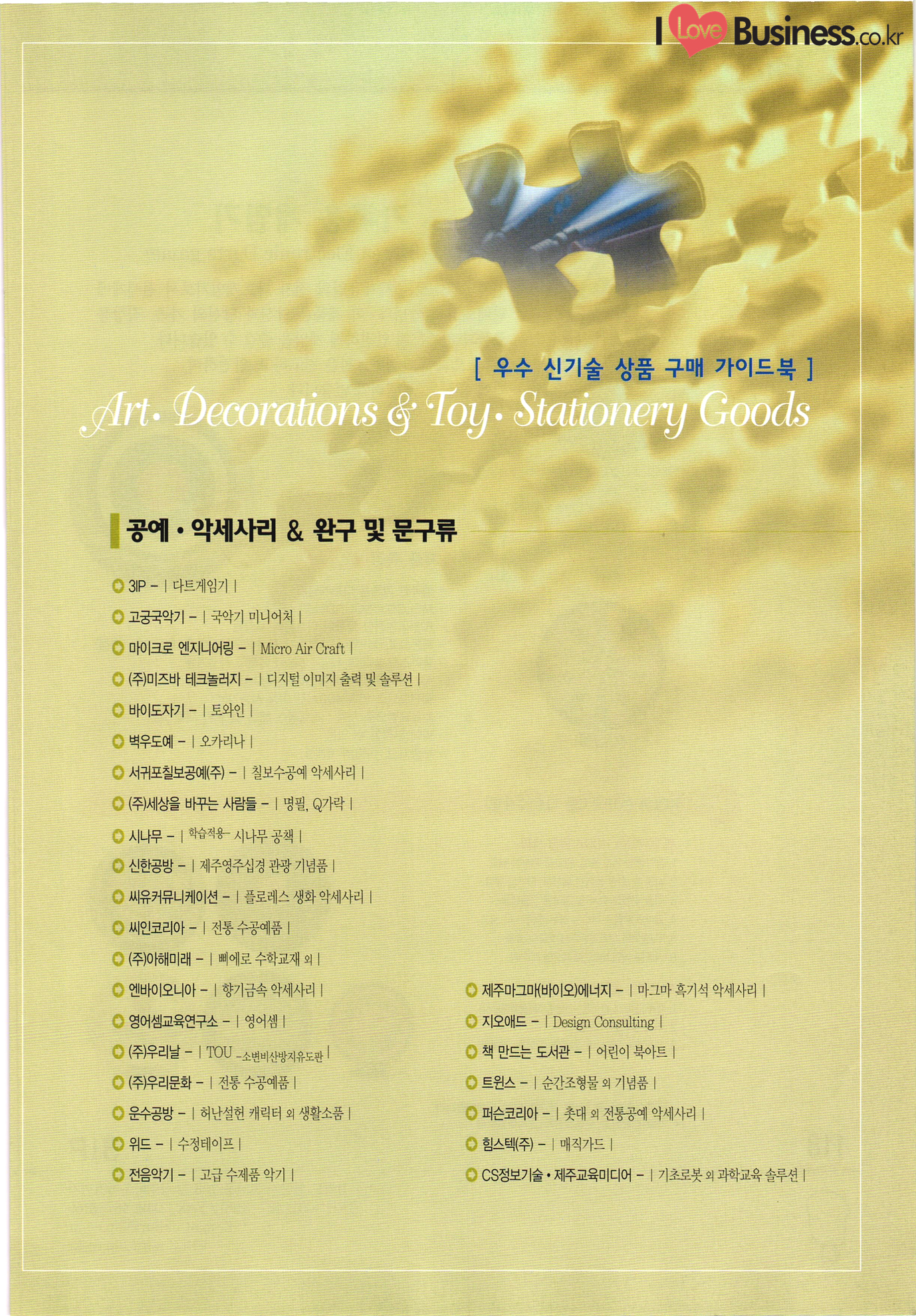 | 우수 신기술 상품 가이드북 : 1 KORIA ENDORSED BRAND 식음료 & 건강보조식품 가정 생활용품 섬유 · 의류 & 신발 의료 • 약품 & 바이오제품 공예 · 악세사리 & 완구 및 문구류 스포츠·레저 & 건강관련 제품 건축 • 환경 관련제품 전기·전자 & 기계 제품 컴퓨터 & 소프트웨어 |