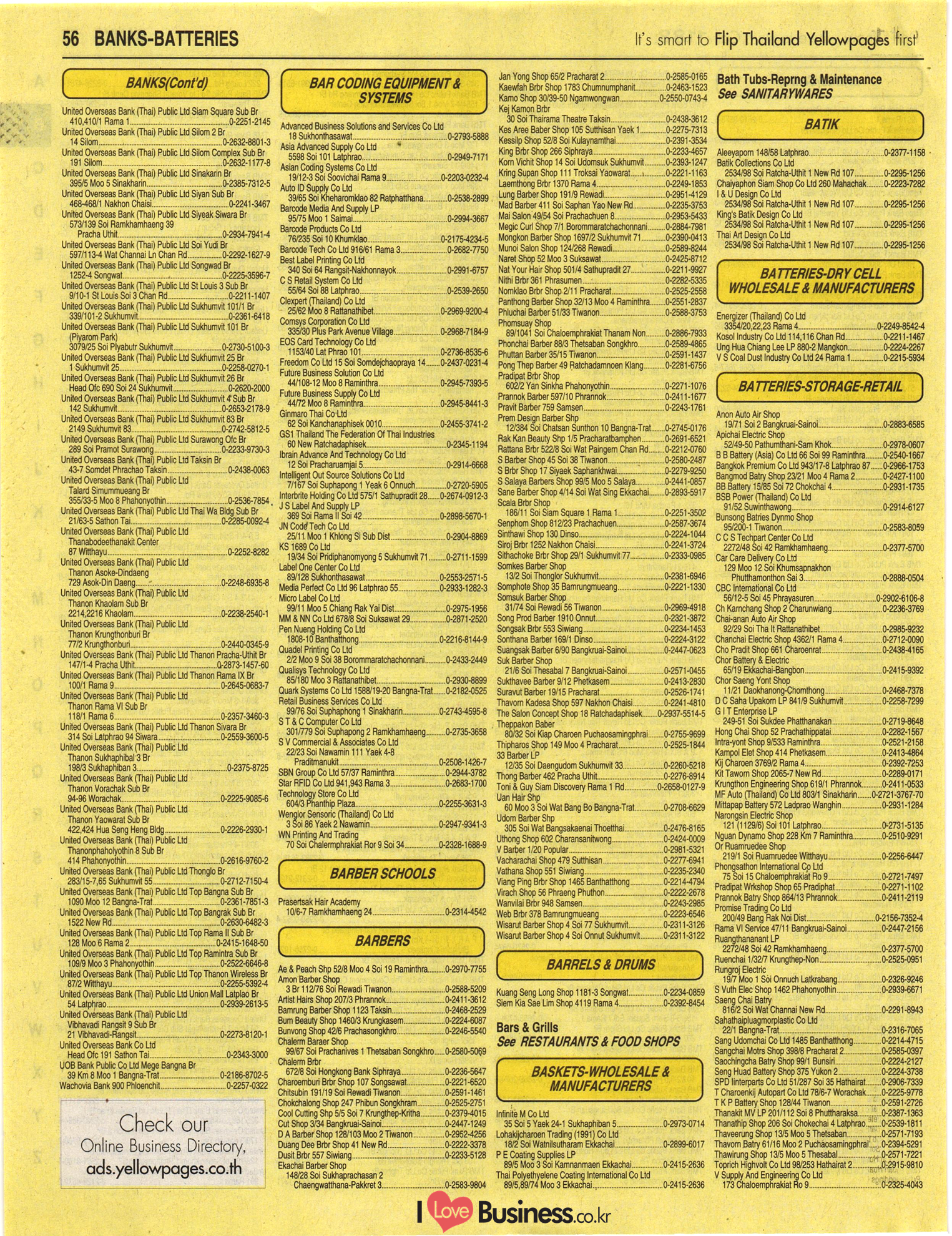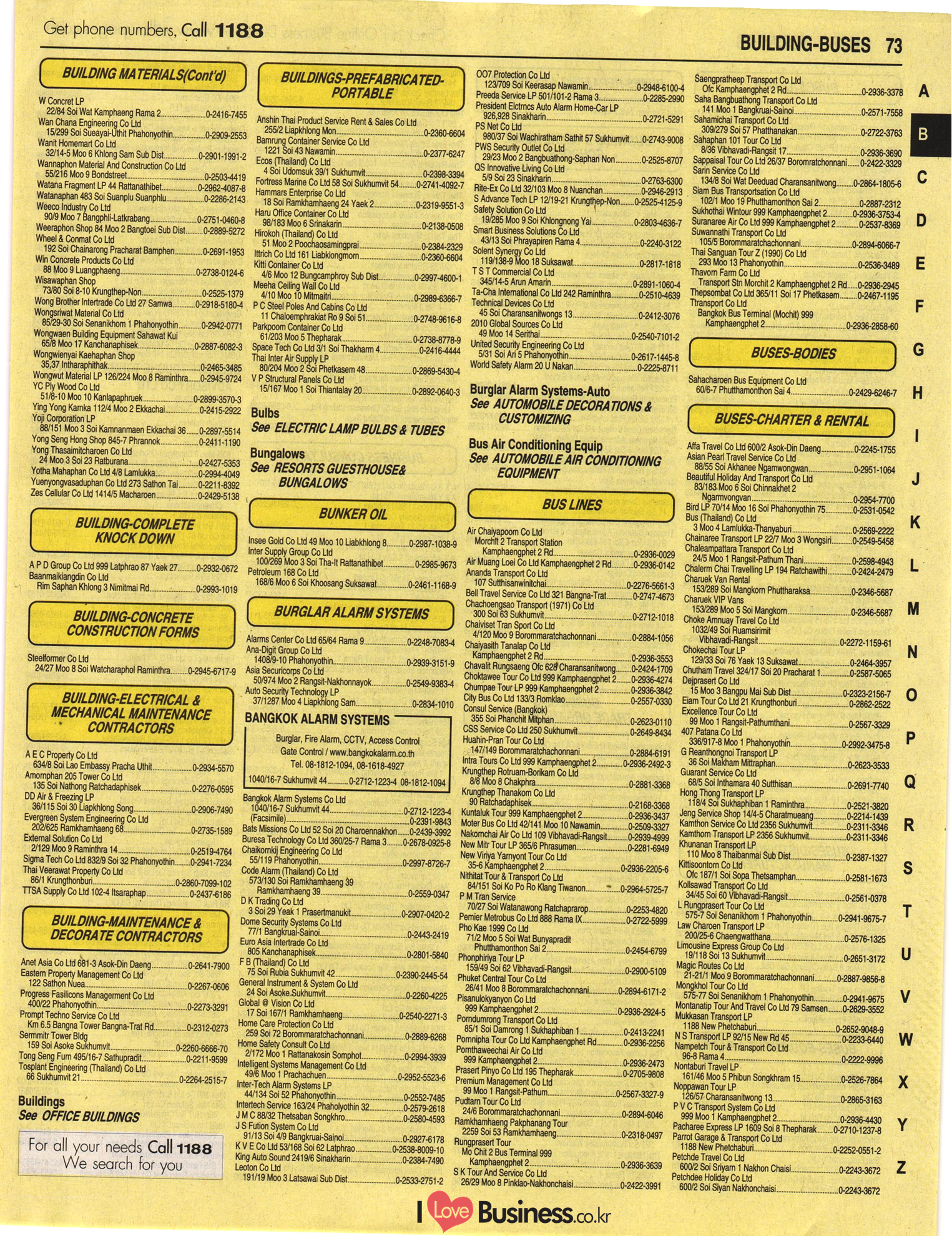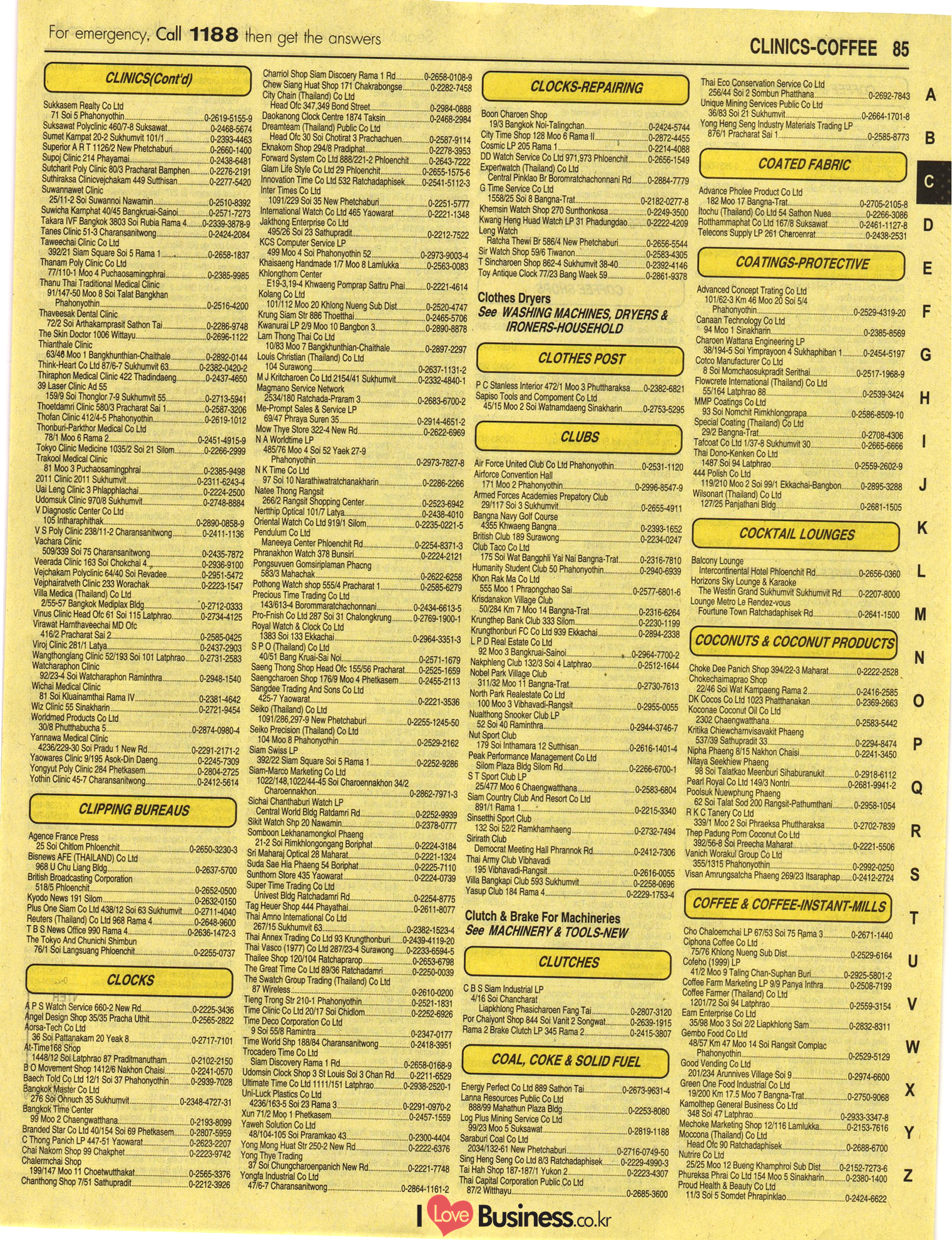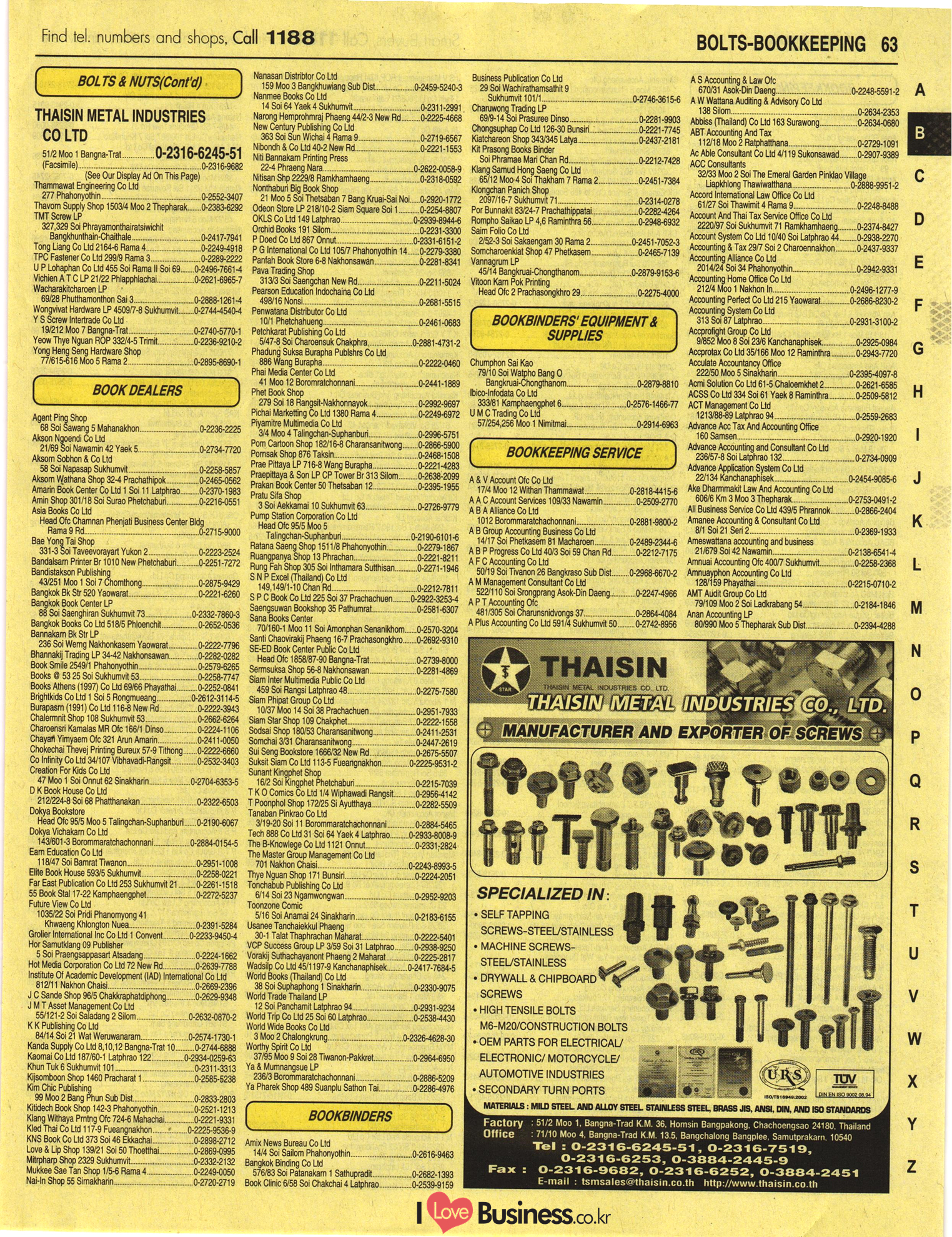 Emergency Number P. Al Message from the President P. A2 Contents P. A3 Police Stations P. A4 Fire Stations P. A5 Hospitals P. A6 Public Utilities P. A8 Telephone Assistance Services P. A9 Trade Related Agencies P. A10 Embassies & Consuls P. All Goverment & State Enterprise P. A12 Transportations P. A13 Express Way Map P. A14 Map of BTS, BRT, MRT, and Airport Link P. A15 Map of Thailand P. A16 Driving Distance Chart P. A17 Map of Bangkok P. A18 Online Products P. A20 Business Opportunity P. A23 Request form of adding information P. A24 Subject Index P. A26-A40 Using the Fast-Find Index P. A41 Fast-Find Index P. A42-A54 Classified Business Listing P. 1-327 หน้า สนเทศ |
