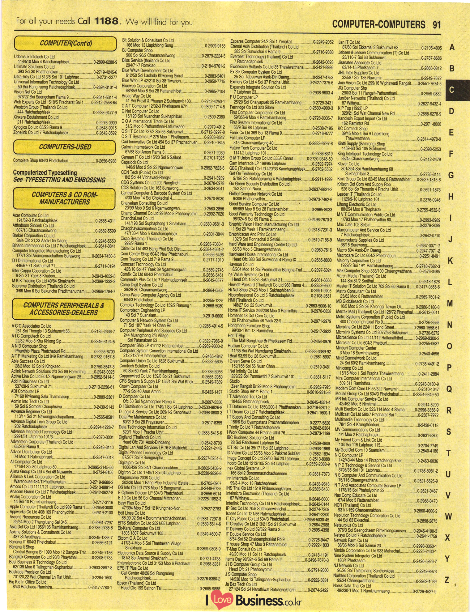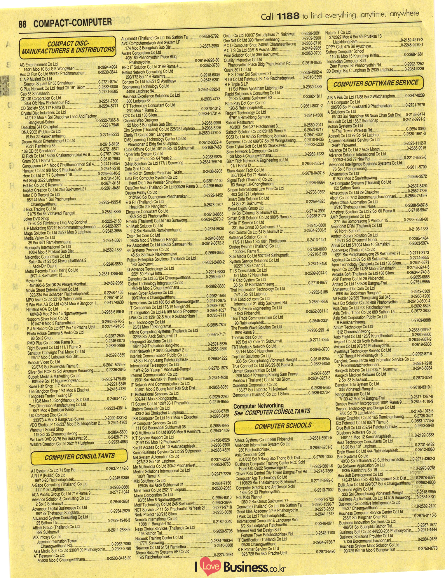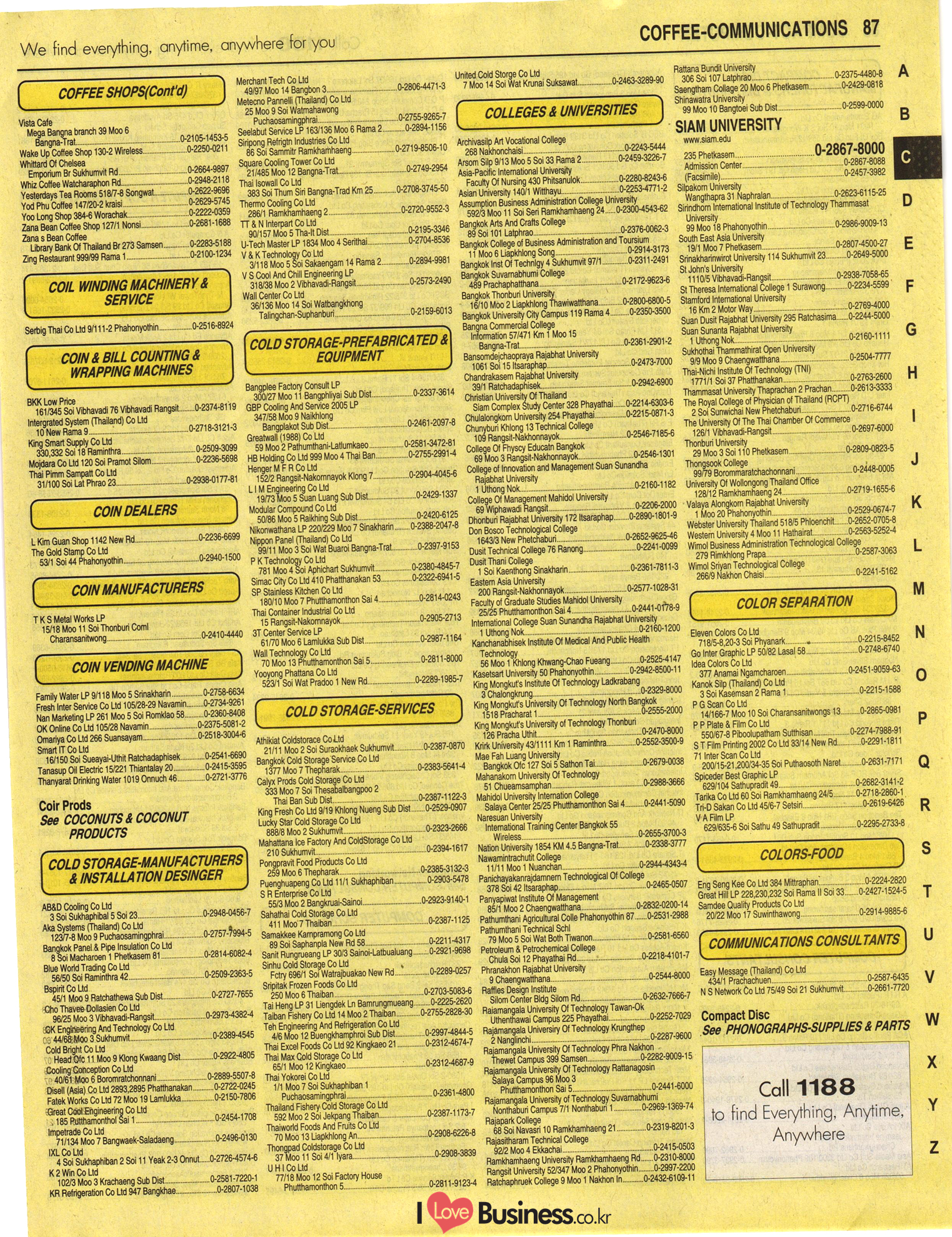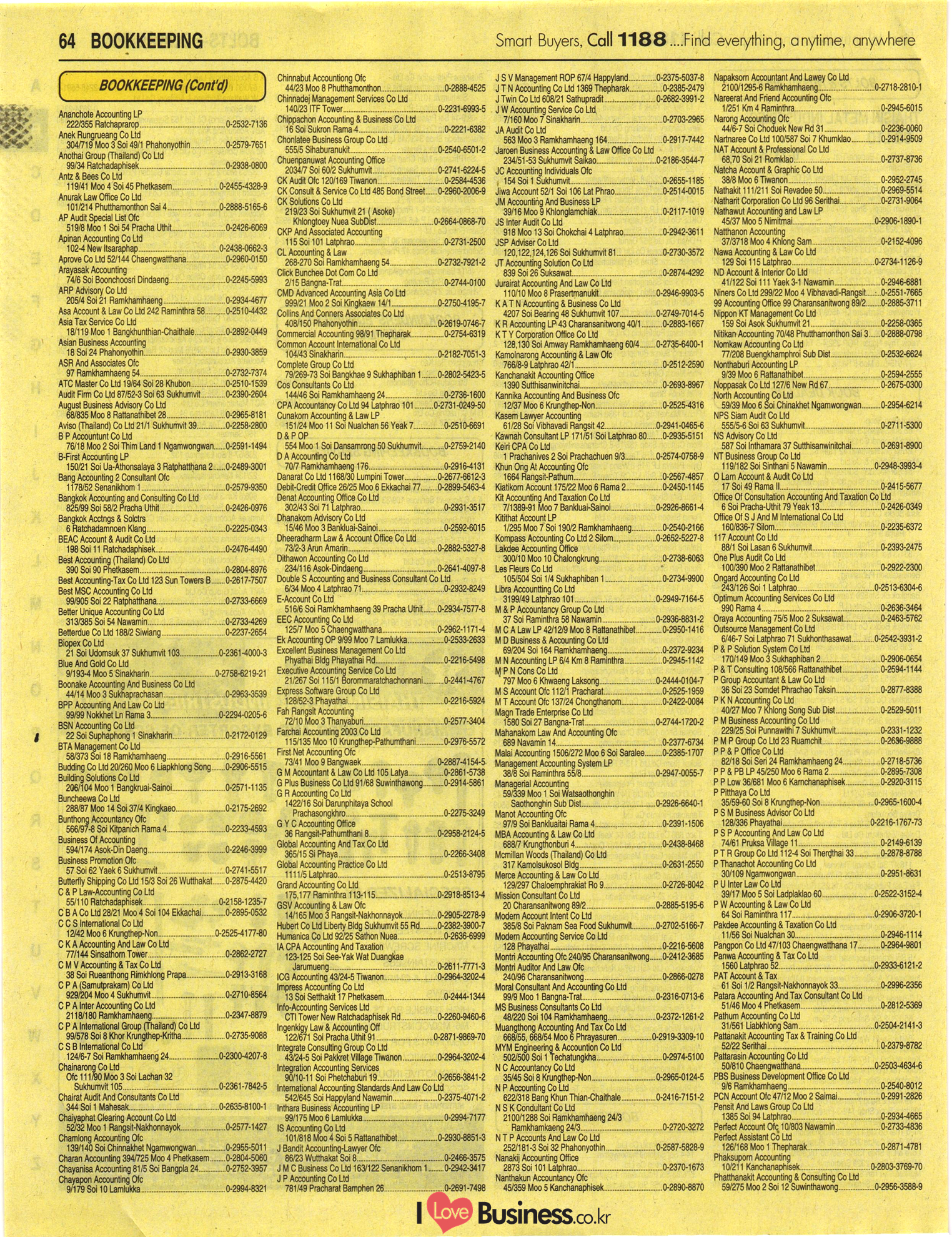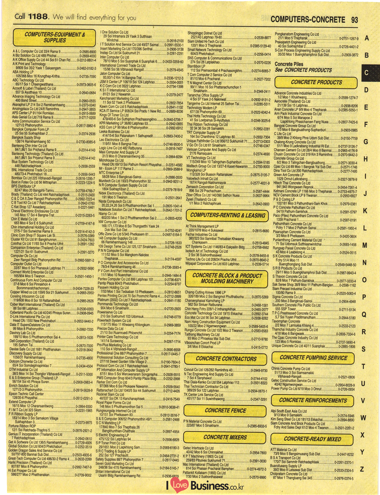 Emergency Number P. Al Message from the President P. A2 Contents P. A3 Police Stations P. A4 Fire Stations P. A5 Hospitals P. A6 Public Utilities P. A8 Telephone Assistance Services P. A9 Trade Related Agencies P. A10 Embassies & Consuls P. All Goverment & State Enterprise P. A12 Transportations P. A13 Express Way Map P. A14 Map of BTS, BRT, MRT, and Airport Link P. A15 Map of Thailand P. A16 Driving Distance Chart P. A17 Map of Bangkok P. A18 Online Products P. A20 Business Opportunity P. A23 Request form of adding information P. A24 Subject Index P. A26-A40 Using the Fast-Find Index P. A41 Fast-Find Index P. A42-A54 Classified Business Listing P. 1-327 หน้า สนเทศ |