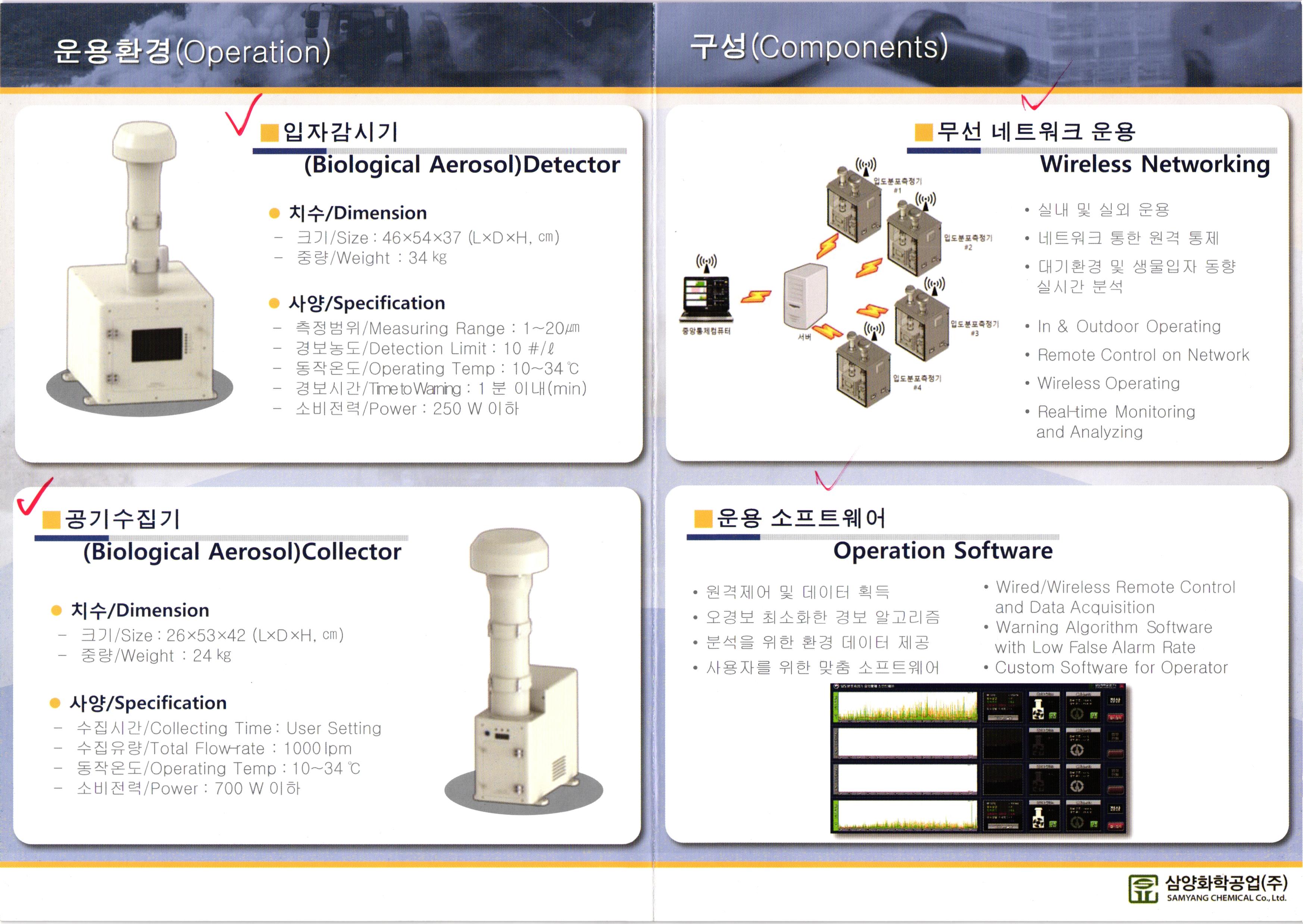 | 방위산업을 선도하는 기업 삼양화학공업(주) DEFENSE INDUSTRY AND TECHNOLOGY 40여년간 최첨단 생산시설과 축적된 기술을 바탕으로 방위산업을 선도하는 기업으로 도약하는 삼양화학 삼양화학공업(주)은 1972년 창립 이래 화생방 방호분야, 탄약분야 및 위장망 분야에서 한국군의 전력증강에 기여하여 왔습니다. 입도분포측정기 New Biological Aerosol Detection/Collection System 화생방 방호분야는 초기에 제독 및 해독분야 사업을 시작으로 개인 및 집단 보호장비를 개발하였고, 최근에는 미래 화생방 전장하에서 생존성을 증대시키고 전투력을 보전하기 위해 탐지 · 식별 · 경보체계 등으로 능력을 확대하고 있습니다. 탄약분야는 가시광선 · 적외선 조명탄, 다영역차장 연막탄 및 전자전 탄약을 개발하였고, 미래전장환경에 효과적으로 대응할 수 있는 한국군의 전자전 탄약 및 열압력탄 개발에 집중하고 있습니다. 위장망 분야는 가시광선 적외선 및 레이다로부터 동시에 차장이 가능한 다영역 차장 위장망을 개발·생산하고 있으며, 현재는 인원 및 장비용 기동위장체계와 비수하식 피아식별 장비 등을 개발하고 있습니다. | 삼양화학공업(주)은 적극적인 투자, 끊임없는 연구개발 노력, 그리고 인재중심의 경영으로 국내는 물론 해외에서도 경쟁력 있는 방산제품의 개발 및 생산으로 우리 군의 전력증강에 도움이 되겠으며, 인류의 보편적 가치인 평화와 행복을 지키는 일류기업으로 성장하기 위해 최선의 노력을 경주하고 있습니다. 입도분포측정기 10 m 대검찰청 본사 연락처 서울시 서초구 반대포로 27길 16, 8층 (서초동, 파크빌딩) TEL : 02-3488-5592 FAX : 02-521-3100 | 대법원 69 서초역 하나은행 우리은행 - 서초로얄라지 비상에유학원 강남 원 MYLINK S SAM YANG 1 Chemical Co., Ltd 분석기기연구소 연락처 430-040 경기도 안양시 만안구 안양로 593 TEL : 031-470~3810 | FAX : 031-473-5300 3 삼양화학공업(주) 조양빌딩 국민은행 http://www.samyangchem.com | SAMYANG CHEMICAL Co., Ltd. | DAR MAN I REE WOM EM ATA 운용환경 (Operation) 구성(Components) WAN 입자감시기 (Biological Aerosol)Detector ■ 무선 네트워크 운용 Wireless Networking 이도 정기 치수/Dimension - 크기/Size : 46×54×37 (LxD XH, ccm) - 중량/Weight : 34 kg 입도측정기 • 실내 및 실외 운용 | · 네트워크 통한 원격 통제 • 대기환경 및 생물입자 동향 실시간 분석 입도포측정기 중앙 통제 컴퓨터 ● 사양/Specification 측정범위/Measuring Range : 1~20m 경보농도/Detection Limit : 10 #2 - 동작온도/Operating Temp: 10~34°C - 경보시간 /Time to Waming : 1 분 이내(min) 소비전력/Power : 250 W 이하 있도정기 • In & Outdoor Operating • Remote Control on Network • Wireless Operating • Realtime Monitoring and Analyzing wowwew 공기수집기 (Biological Aerosol)Collector ■ 운용 소프트웨어 Operation Software 치수/Dimension - 크기/Size : 26×53×42 (LxD XH, ccm) - 중량/Weight : 24 kg · 원격제어 및 데이터 획득 · 오경보 최소화한 경보 알고리즘 | · 분석을 위한 환경 데이터 제공 • 사용자를 위한 맞춤 소프트웨어 • Wired/Wireless Remote Control and Data Acquisition • Warning Algorithm Software with Low False Alarm Rate • Custom Software for Operator 정상 ● 사양/Specification - 수집시간/Collecting Time: User Setting - 수집유량/Total Flowrate : 1000 Ipm - 동작온도/Operating Temp: 10~34°C - HIE 2/Power : 700 W Olot 정상 news 삼양화학공업(주) SAMYANG CHEMICAL Co., Ltd. |