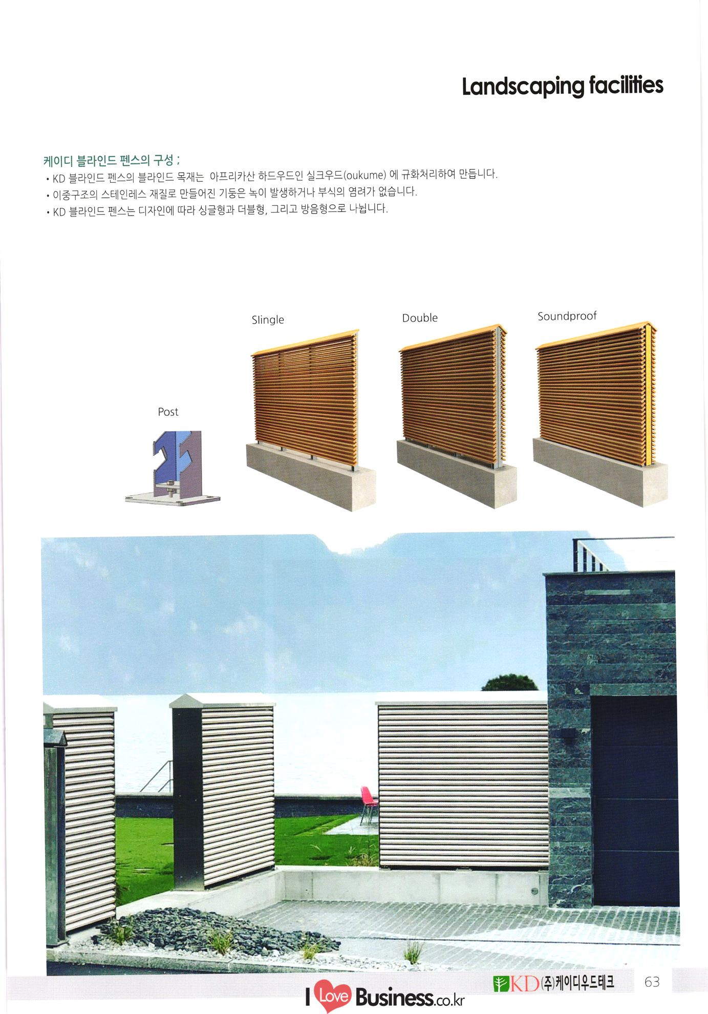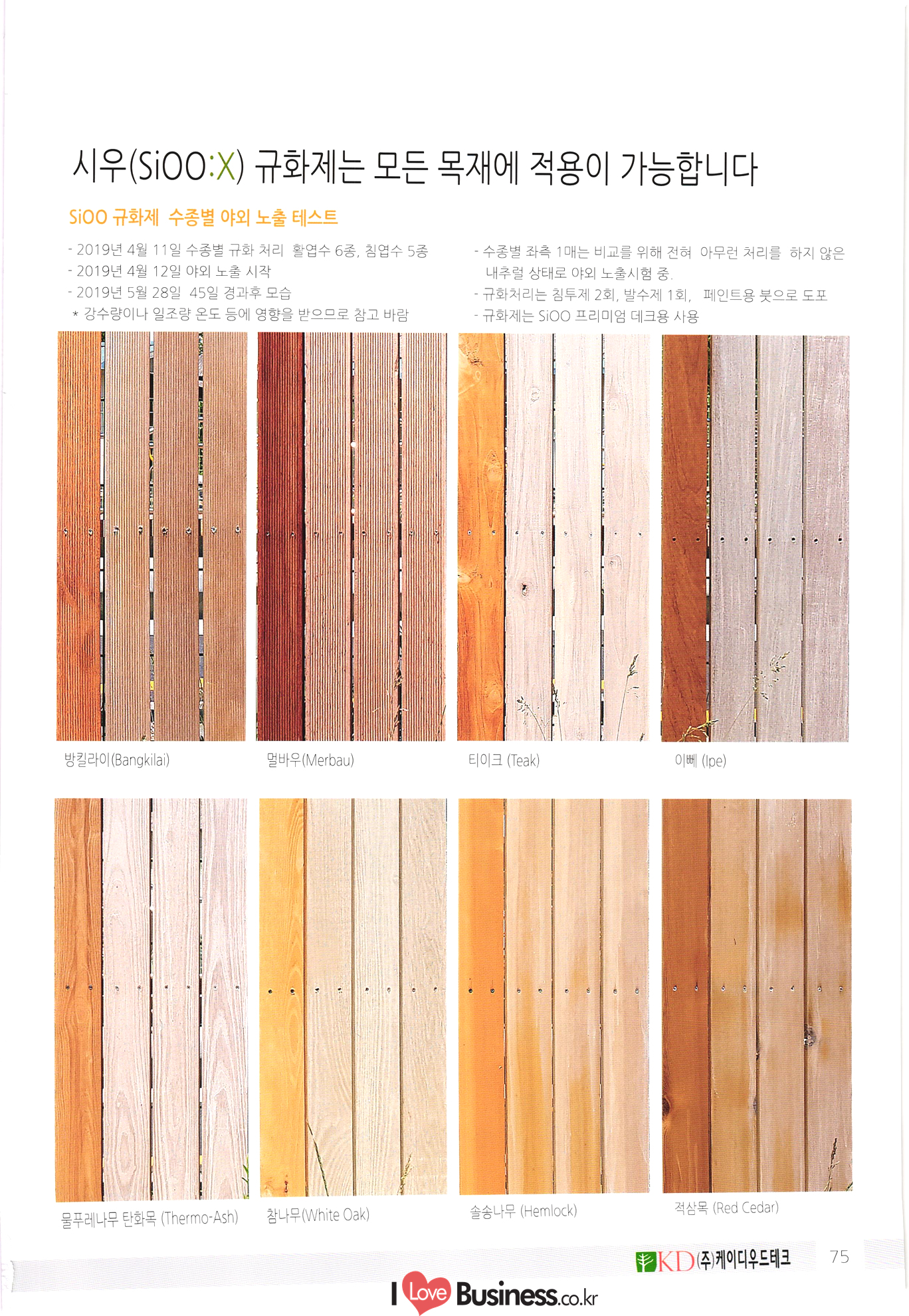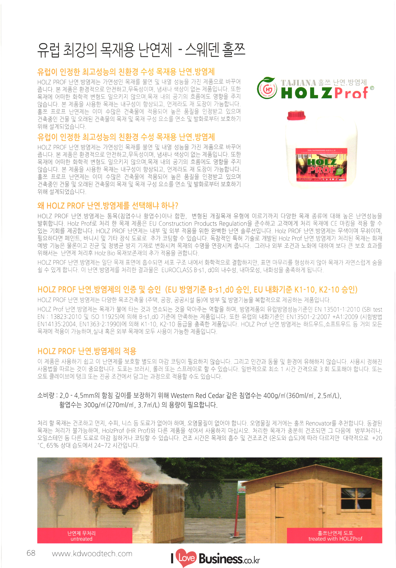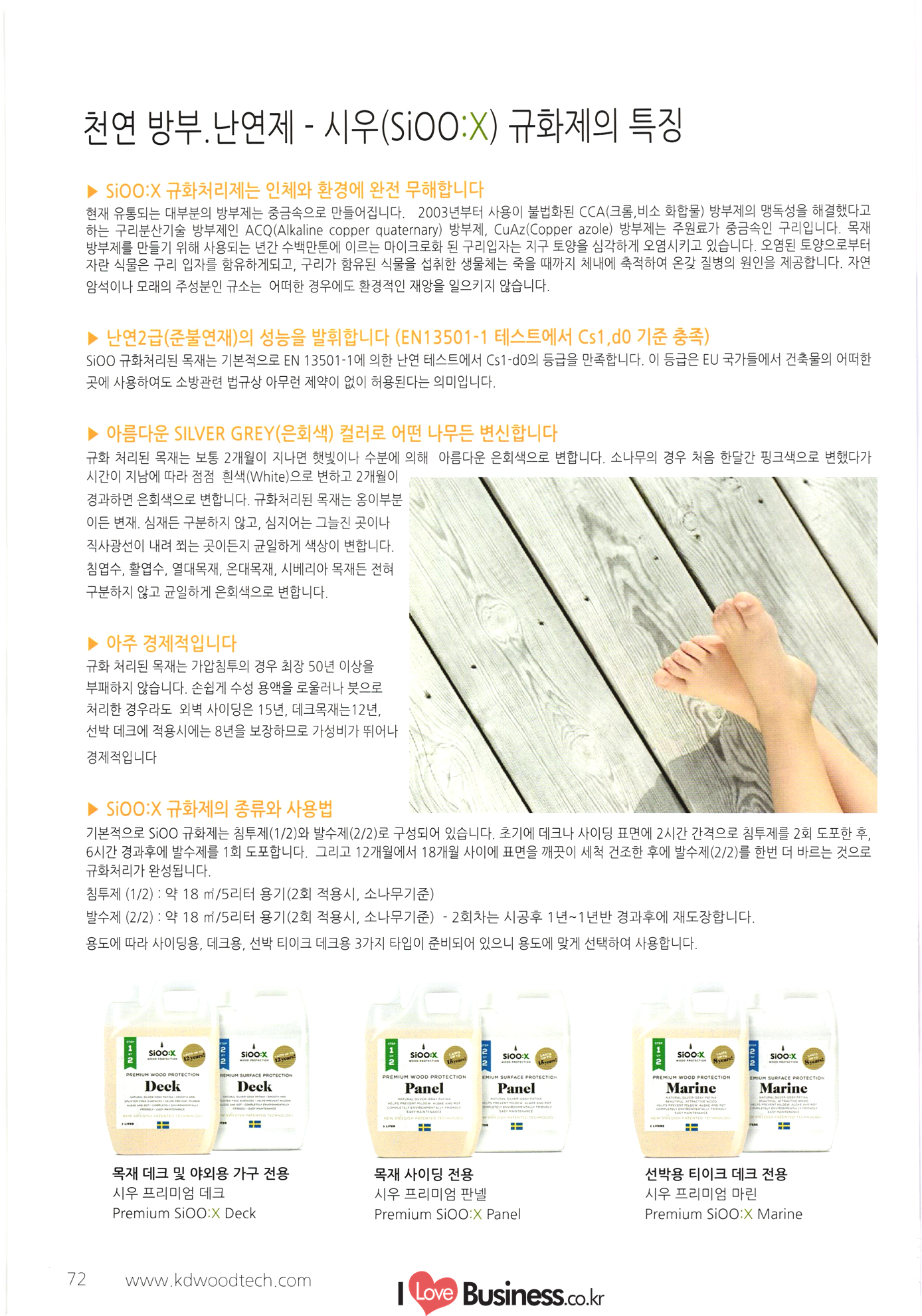 가압규화처리 개질목재 오르가노우드 P42 규화처리 개질목재 제품들 P44 오르가노우드 규화제 P46 KD 매직픽스 데크 시스템 P46 KD 골드우드 압축탄화목 데크 P50 밀보드 외부용 데크 52 KD 아트월 P56 KD상업용 마루재 죽향 사군자) P58 KD 카본우드 압축목재 플로어링 P59 충격흡수 마루공법 - 인소린 마루시스템 P59 조경시설물 해피움막 - 우드세움 P60 조경시설물 - 블라인드 펜스 P62 타지아나 원목 방화현관문 P64 홀쯔 난연제 홀쯔 프로프 P68 독일 로바 페인트 P69 SOO:X 규화제 P70 SiOOX 규화제 수종별 테스트 P74 |