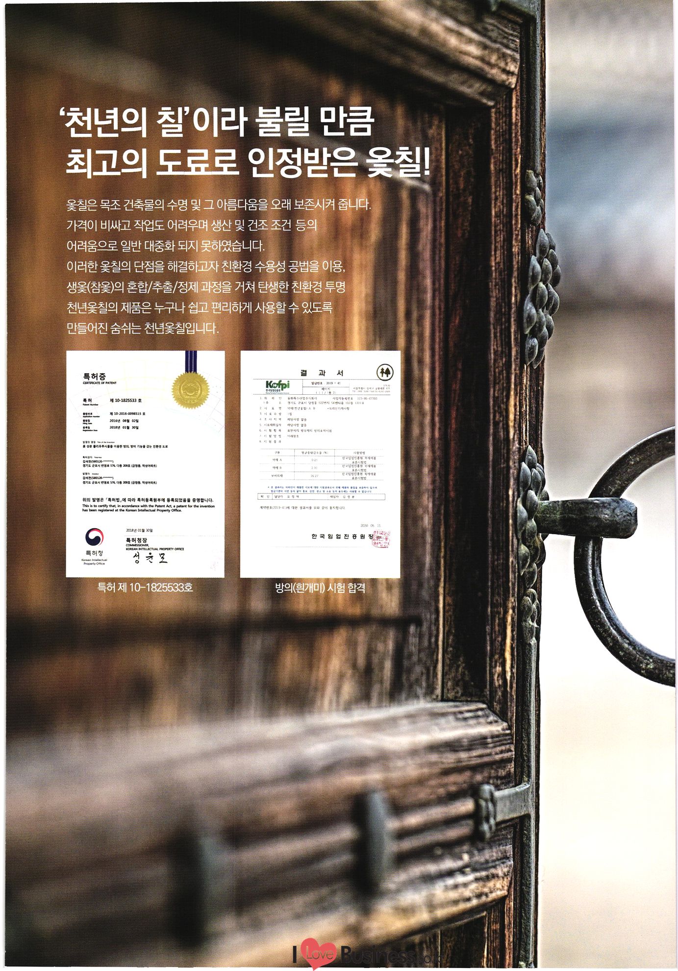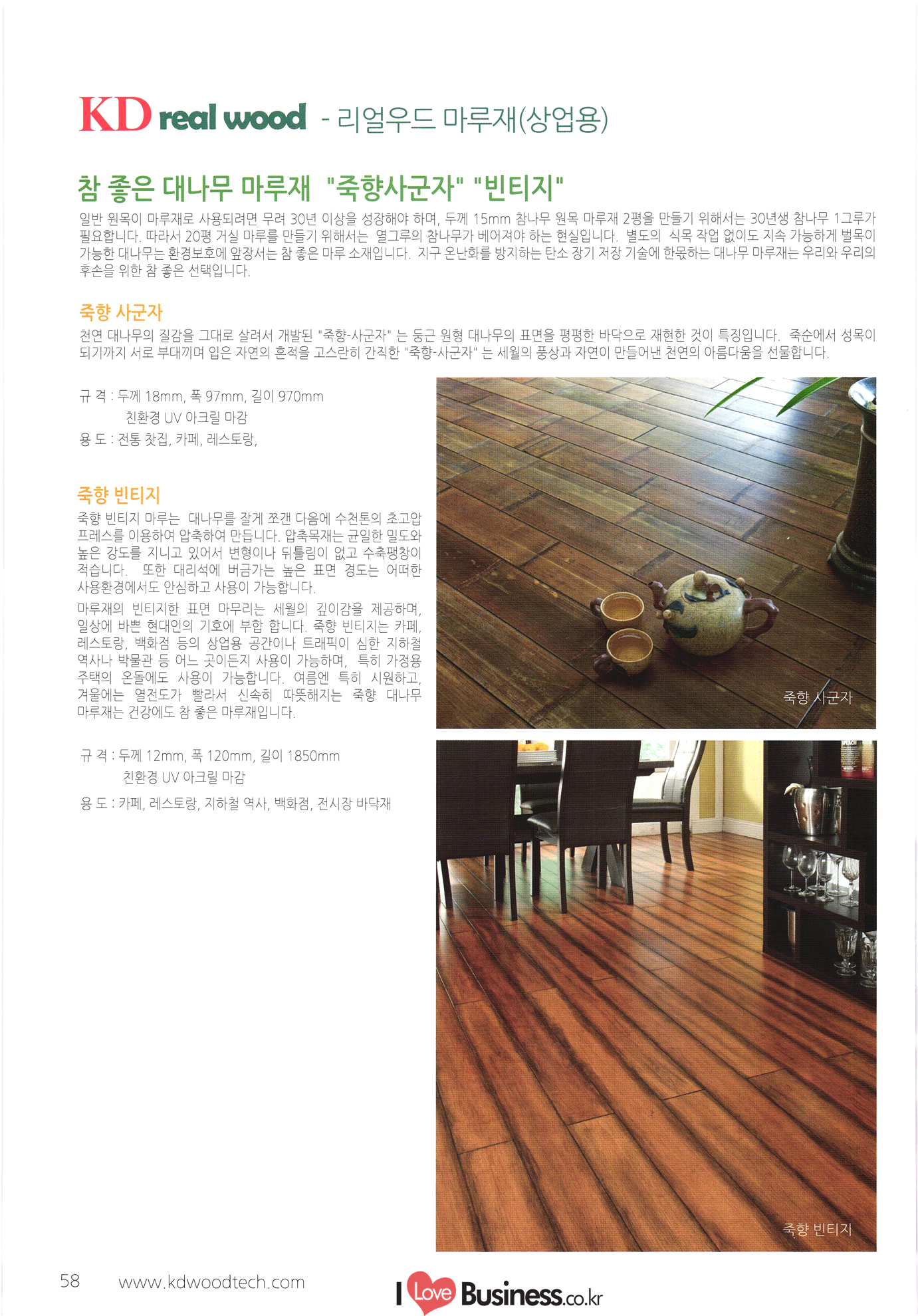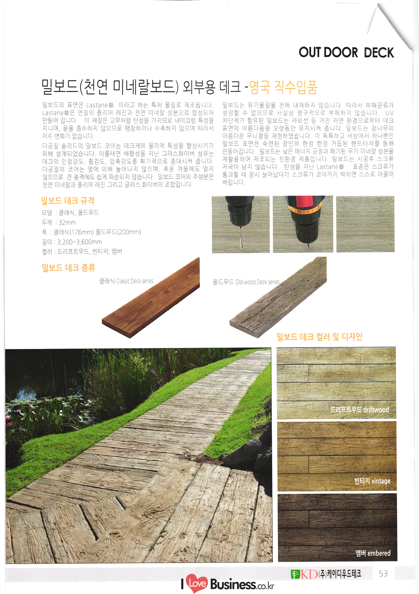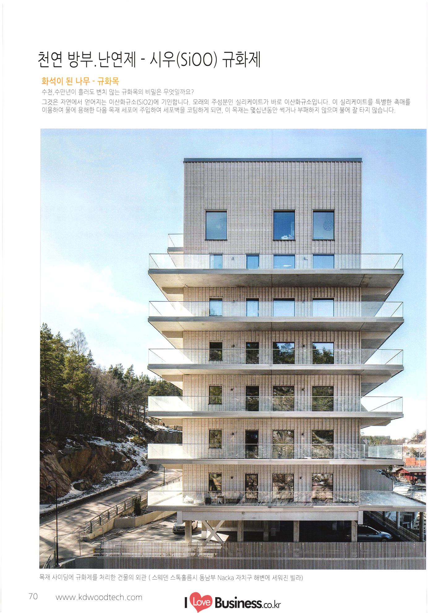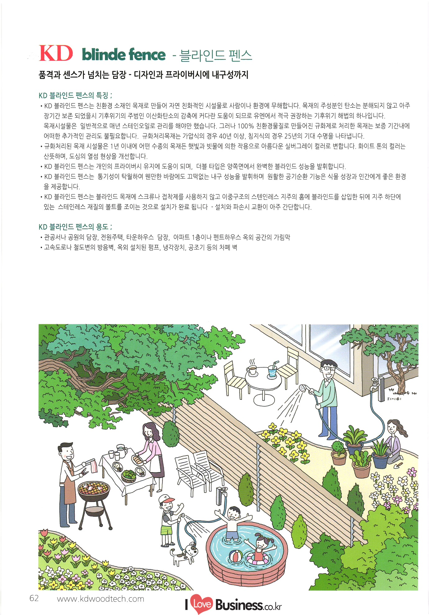 가압규화처리 개질목재 오르가노우드 P42 규화처리 개질목재 제품들 P44 오르가노우드 규화제 P46 KD 매직픽스 데크 시스템 P46 KD 골드우드 압축탄화목 데크 P50 밀보드 외부용 데크 52 KD 아트월 P56 KD상업용 마루재 죽향 사군자) P58 KD 카본우드 압축목재 플로어링 P59 충격흡수 마루공법 - 인소린 마루시스템 P59 조경시설물 해피움막 - 우드세움 P60 조경시설물 - 블라인드 펜스 P62 타지아나 원목 방화현관문 P64 홀쯔 난연제 홀쯔 프로프 P68 독일 로바 페인트 P69 SOO:X 규화제 P70 SiOOX 규화제 수종별 테스트 P74 |