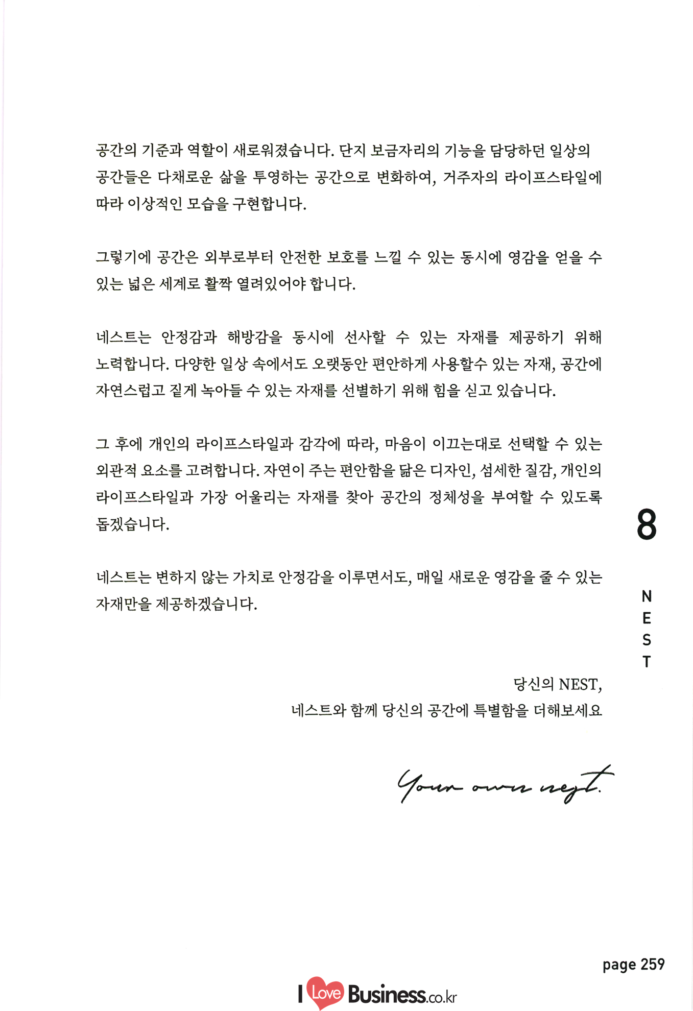 가압규화처리 개질목재 오르가노우드 P42 규화처리 개질목재 제품들 P44 오르가노우드 규화제 P46 KD 매직픽스 데크 시스템 P46 KD 골드우드 압축탄화목 데크 P50 밀보드 외부용 데크 52 KD 아트월 P56 KD상업용 마루재 죽향 사군자) P58 KD 카본우드 압축목재 플로어링 P59 충격흡수 마루공법 - 인소린 마루시스템 P59 조경시설물 해피움막 - 우드세움 P60 조경시설물 - 블라인드 펜스 P62 타지아나 원목 방화현관문 P64 홀쯔 난연제 홀쯔 프로프 P68 독일 로바 페인트 P69 SOO:X 규화제 P70 SiOOX 규화제 수종별 테스트 P74 |