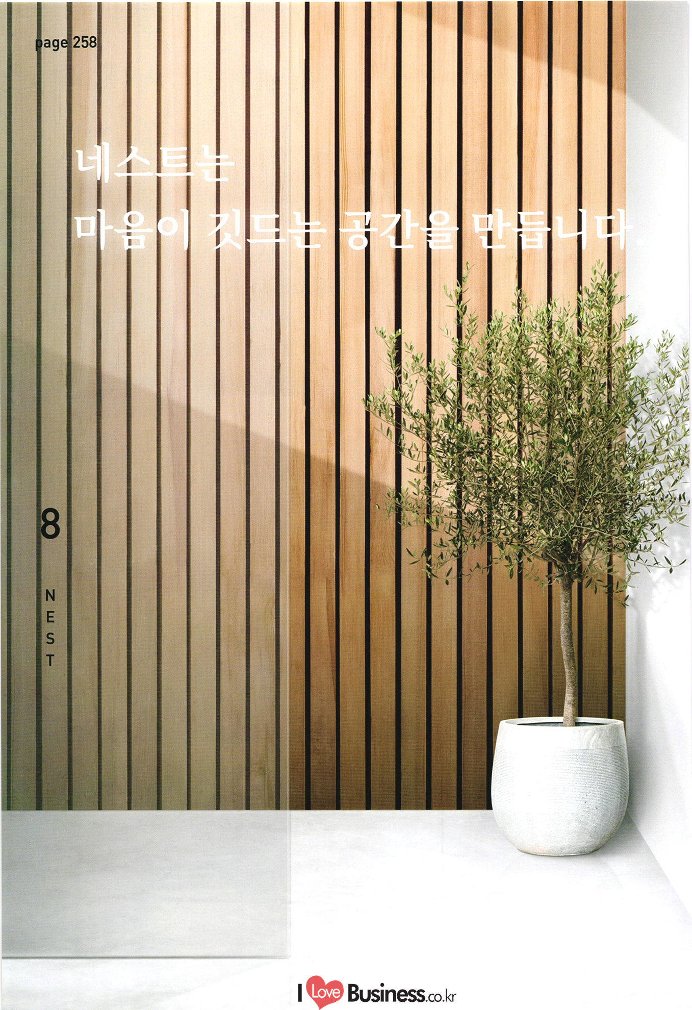 | KD 사운드메이트 소개 PO4 어쿠스틱 찬넬리브(방음벽) 시스템 P06 어쿠스틱 클릭루버 시스템 P08 어쿠스틱 보드패널 P12 어쿠스틱 디퓨저 & 디퓨징루버 P18 그랜드 컴비네이션 찬넬리브 시스템 P20 어쿠스틱 코너 베이스트랩 P21 탄화목이란? P22 케이디리브 탄화목 찬넬사이딩 P24 KD 프라임우드 소개 P28 KD 프라임우드 사이딩 P30 KD 프라임우드 루버 P32 KD 실크우드 루버 P36 KD 에버히노끼 루버 P38 KD 에버히노끼 조습보드 P39 규화처리 개질목재란? P40 |