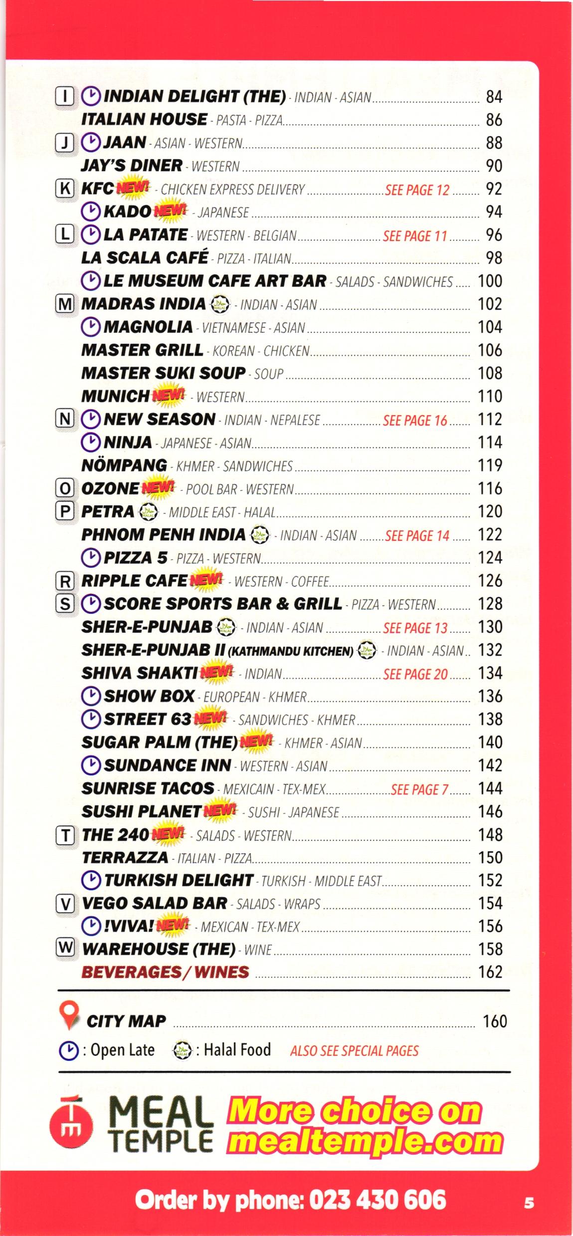 LA SCALA CAFÉ-PIZZA-ITALIAN..... LE MUSEUM CAFE ART BAR-SALADS M MADRAS INDIA INDIAN-ASIAN. MAGNOLIA VIETNAMESE ASIAN MASTER GRILL KOREAN-CHICKEN.. MASTER SUKI SOUP SOUP...... MUNICH NEW WESTERN.. N NEW SEASON-INDIAN-NEPALESE. NINJA-JAPANESE-ASIAN.. NÖMPANG-KHMER-SANDWICHES. O OZONE NEW POOL BAR-WESTERN.. P PETRA MIDDLE EAST-HALAL... PHNOM PENH INDIA INDIAN-ASIAN. PIZZA 5-PIZZA -WESTERN.. R RIPPLE CAFE NEW WESTERN - COFFEE.. SSCORE SPORTS BAR & GRILL-PIZZA-W SHER-E-PUNJAB-INDIAN-ASIAN SHER-E-PUNJAB II (KATHMANDU KITCHEN) SHIVA SHAKTI NEW INDIAN.. SHOW BOX-EUROPEAN-KHMER.. STREET 63 NEW SANDWICHES - KHMER.. SUGAR PALM (THE) NEW KHMER-ASIAN.. SUNDANCE INN-WESTERN-ASIAN.. STREET 63 E-SANDWICHES-KHMER.. SUGAR PALM (THE) W KHMER-ASIAN. SUNDANCE INN-WESTERN-ASIAN SUNRISE TACOS MEXICAIN-TEX-MEX.. SUSHI PLANET NEW SUSHI-JAPANESEㅡ T THE 240 NEW SALADS WESTERN.. TERRAZZA ITALIAN-PIZZA.. TURKISH DELIGHT-TURKISH-MIDDLE EAST.. VEGO SALAD BAR-SALADS -WRAPS. ⒸIVIVA! NEW MEXICAN-TEX-MEX.. W WAREHOUSE (THE)-WINE.. BEVERAGES/WINES : Halal Food ALSO SEE SPECIAL PAGES MEAL More choice on TEMPLE mealtemple.com |