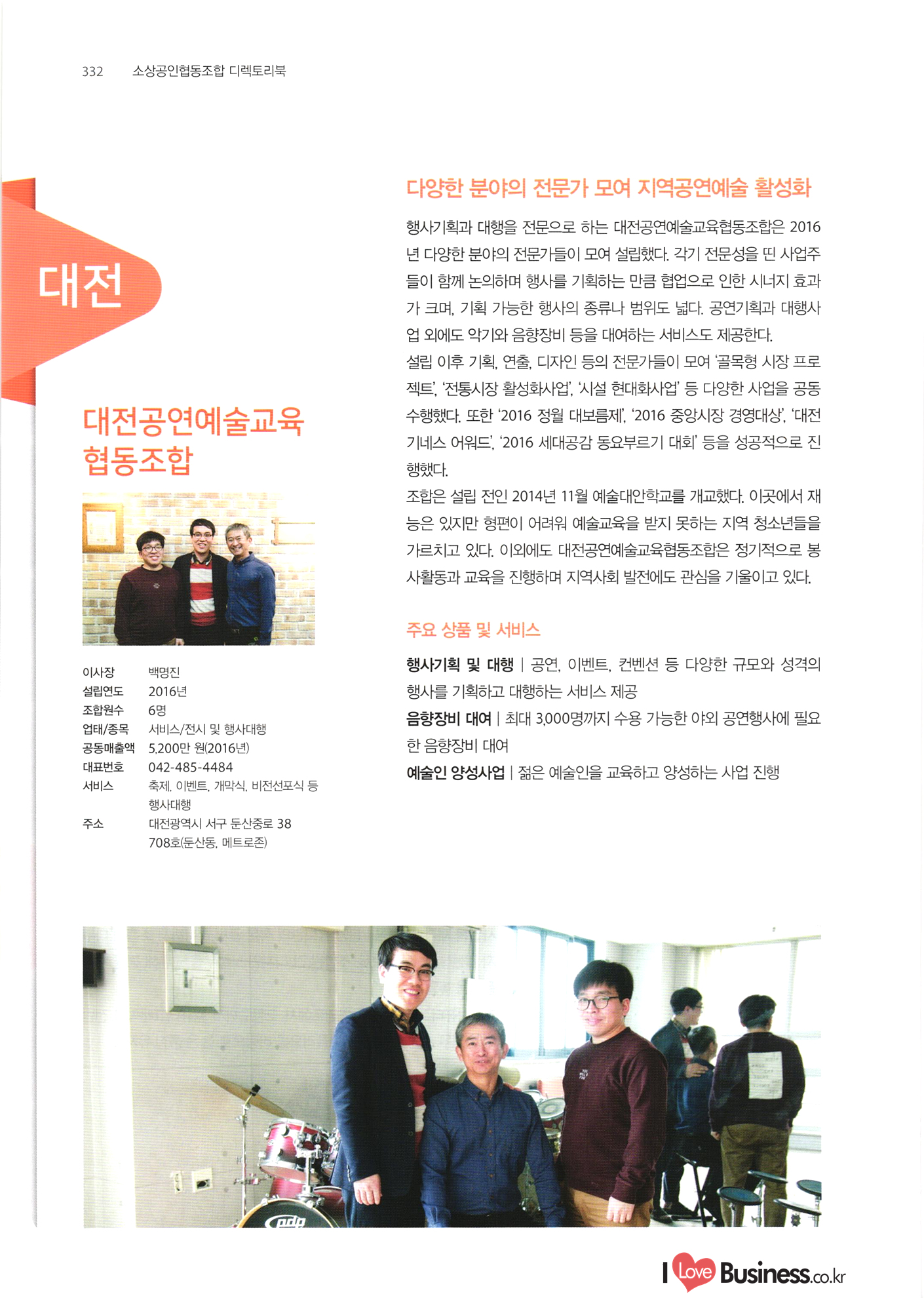 대전간판제작협동조합 대전계란물류협동조합 대전광고물협동조합 대전광역시나들가게협동조합 대전금형협동조합 대전카센타협동조합 대전화원협동조합 두드림협동조합 명랑시대외식청년창업협동조합 청담안경협동조합 충남대전인쇄포장협동조합 커스텀페인팅협동조합 케이티씨태권도아카데미협동조합 테크노자동차정비협동조합 협동조합좋은문화 건설기계사업자협동조합 누리광고협동조합 대전공연예술교육협동조합 대한유소년스포츠협동조합 전국골프존사업자협동조합