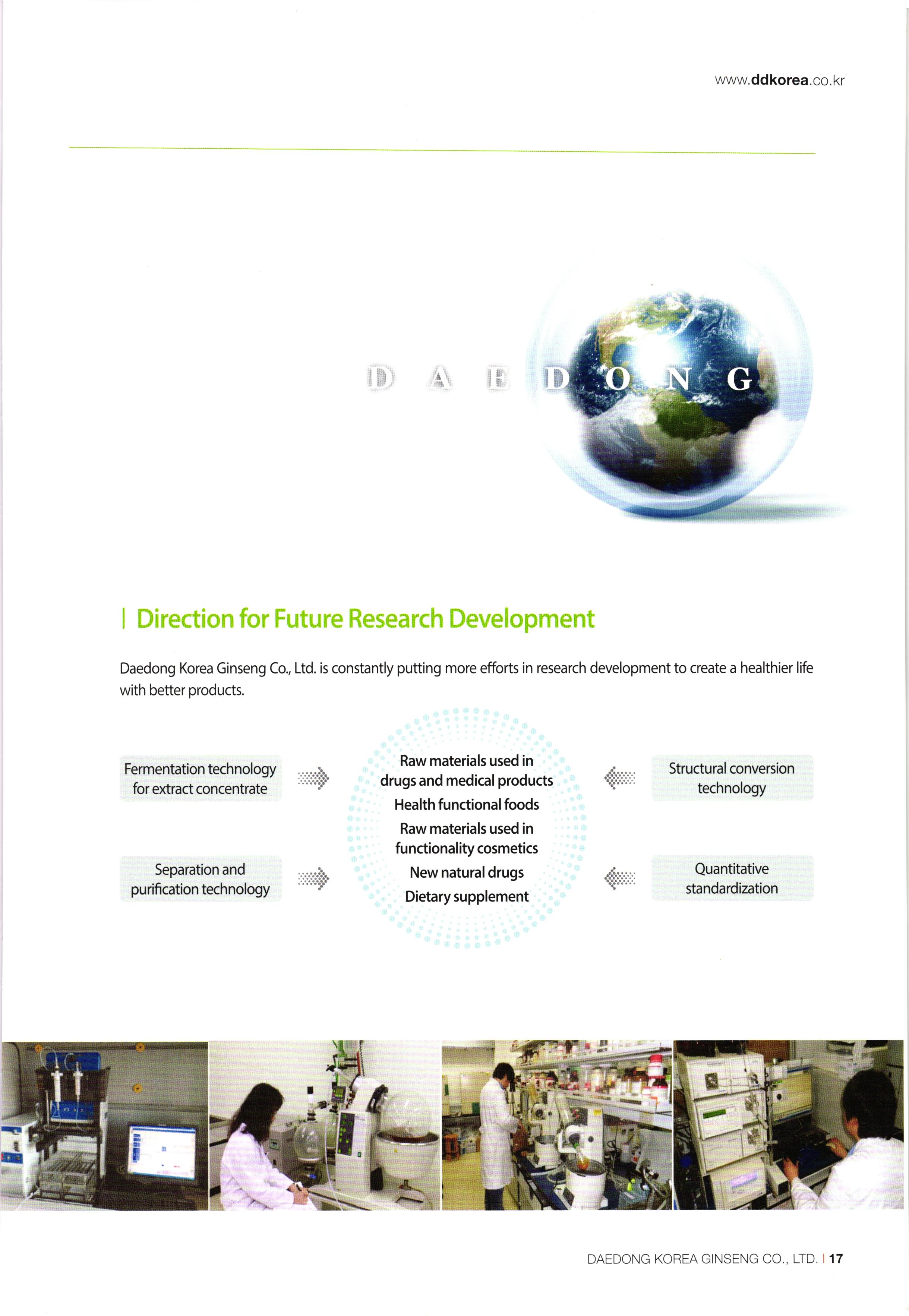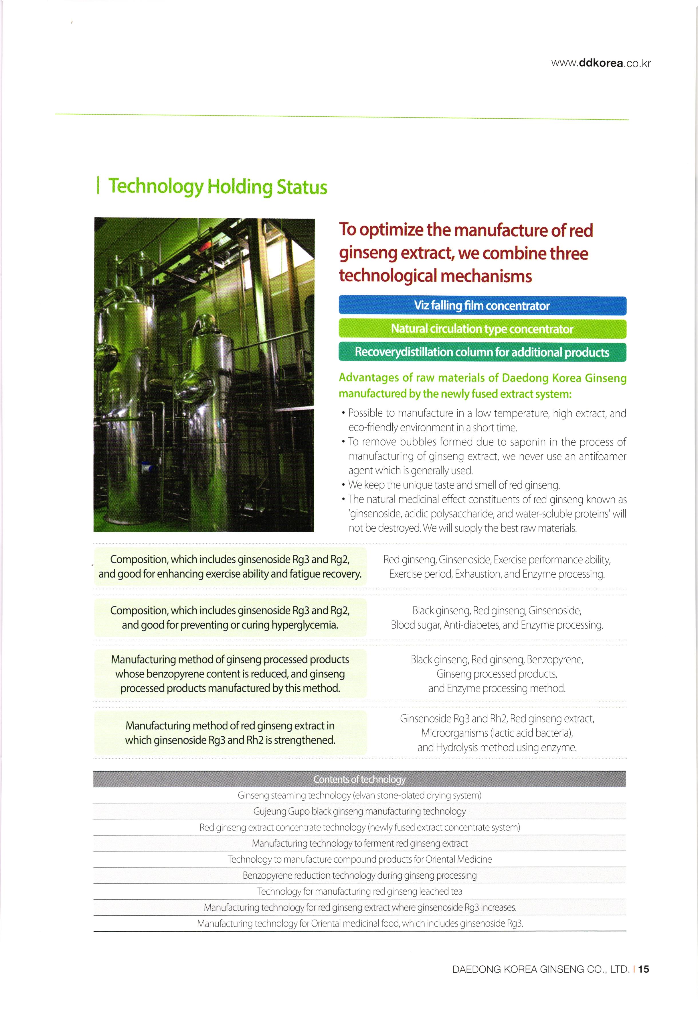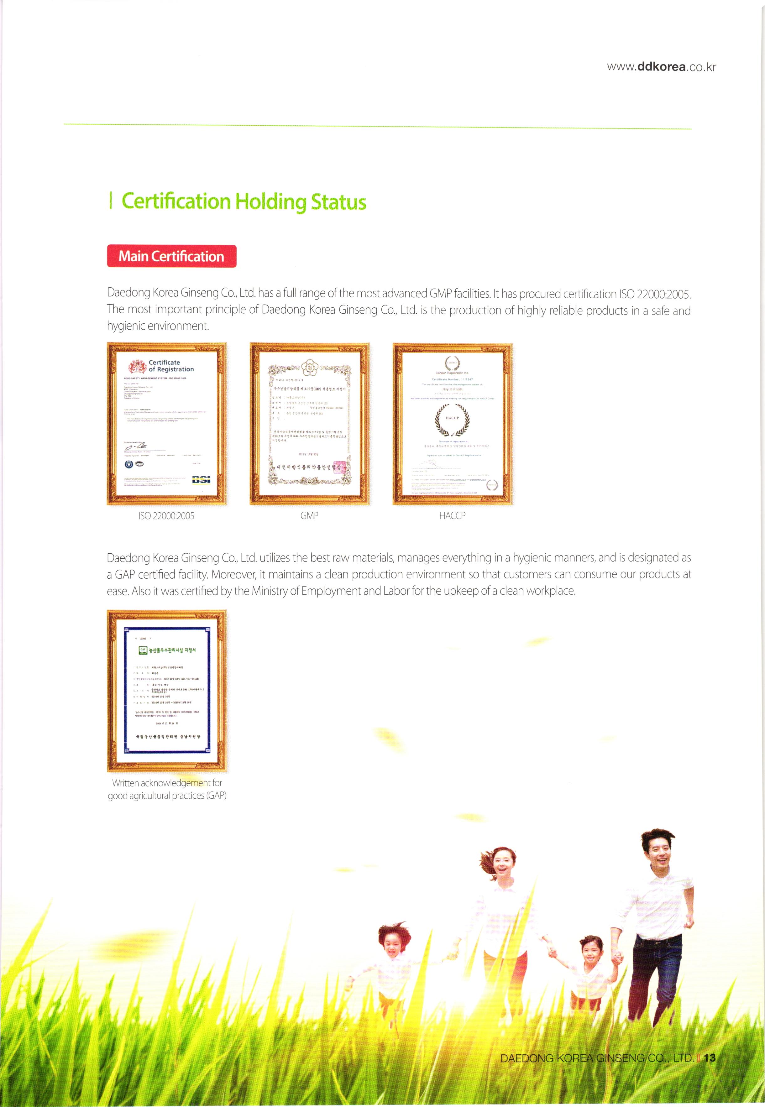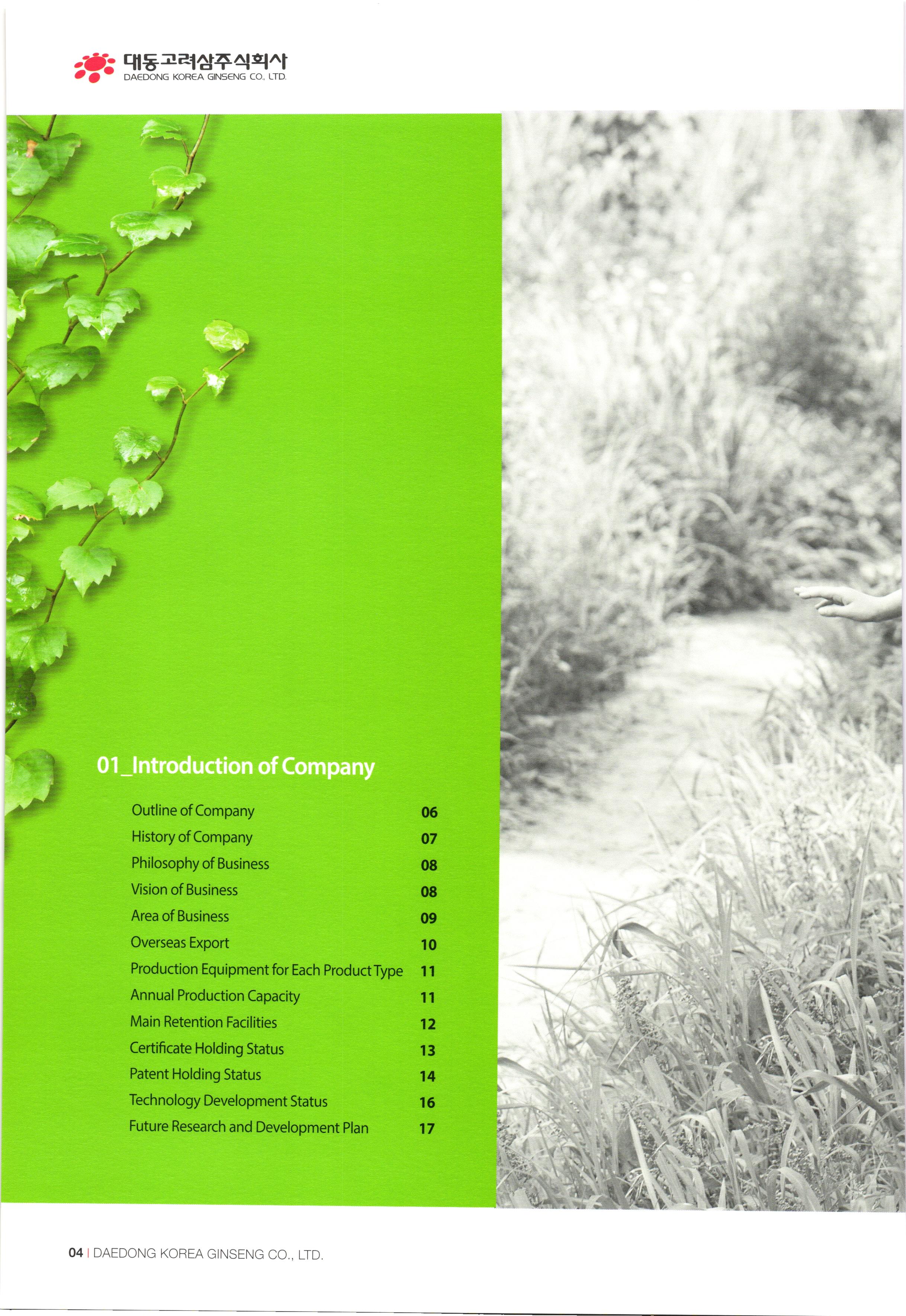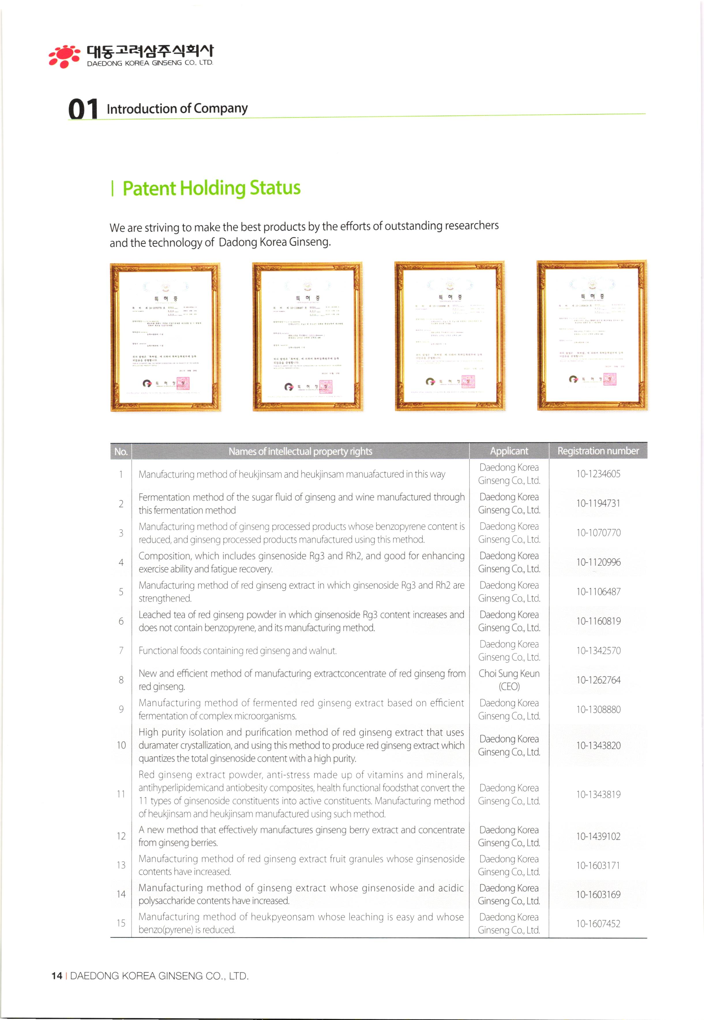 www.ddkorea.co.kr | History of Company 2002 Mar. Incorporation of Daedong Hongsam Co., Ltd. Dec. Completion of the factory of Daedong Hongsam Co., Ltd. 2010 2003 Mar. Change in business registration certificate (additional change in business status and items) Apr. Approval extension of company-affiliated research center Jul. G-mark quality certification recognized (3 products besides the eternally youthful and healthy, sliced honeyed red ginseng) Dec. Confirmation of SME for technological innovation (INNO-BIZ) 2011 2004) Feb. Corporate name changed to Daedong Korea Ginseng Co., Ltd. May Application for the registration of 15 trademark such as 'Bullo geon, 'Somi-geon, 'Chongmyeong-geon, and so on. Jun. Certification of Quality Management System (ISO 9001-2000) and Food Safety Management System (HACCP) Oct. Commencement of export to the USA and Hong Kong Nov. Selected as the recommended form for Corporation Korea Oriental Drug Association and the university-industry collaboration company of the Ginseng Industry Research Center in Chungang University. Aug. Participated in INDOPHARM, a pharmaceutical expo in Indonesia Nov. Participated in the Seoul International Food Exposition Dec. Participated in CPHL World Wide, a worldwide raw material and pharmaceutical expo Jan. Appointed as ginseng inspection company of Agricultural Products Quality Management Service (No. 13) Sep. Certification of Environment Management System, Registered as holder of trademark rights of Geumsan World Ginseng Expo Nov. Recognized by the US Food and Drugs Administration (FDA), Recognized by the Ministry of Labor as CLEAN workplace Feb. Commencement of Turkey exports Apr. Awarded Excellent Businessman Commendation by Geumsan-gun May G-mark quality certification recognized (5 products besides red ginseng extract) Sep. Participated in Geumsan World Ginseng Expo 2011 (official commercializer) Patent application no. 10-1070770 (processed products of ginseng with reduced benzopyrene content Nov. CLEAN workplace re-qualification (No. 20,653) Dec. Registration of tracking management of agricultural product records Patent application no. 10-1106487 (Red ginseng extract in which ginsenoside Rg3 and Rg2 is strengthened) Designated as business establishment that applies GMP, the manufacturing standard of excellent healthfunctional foods Construction of equipment and newly fused extract concentrator 2005 2012 00 00 00 00 2007 Jun. Chungnam branch office recommended quality and recognized agricultural specialty products Jul. Selected as appointed firm for promising SMEs in Chungnam Aug. Establishment of company-affiliated research center recognized Establishment of R&D Department recognized Oct. ecognized as venture business Nov. Acknowledgement of BSI ISO 22000:2005 Dec. Appointed as SME for technological innovation (INNO-BIZ) Dec. Awarded the grand prize at the Convention of International Businessmen in Geumsan-gun Jan. Registration of tracking management of agricultural product records Patent application no. 10-1106487 (Red ginseng extract in which ginsenoside Rg3 and Rg2 is strengthened) Feb. Patent registration no. 10-1120996 (composition, including ginsenoside Rg3 and Rh2, good for enhancing exercise ability and fatigue recovery) Mar. Re-qualification of venture business Entry of Han-areum Mart in the US Sep. Participated in Geumsan International Ginseng Trade Fair (Ginseng Festival) Dec. Participated in Busan BEXCO Geumsan Ginseng Special Fair 2008 2013 Jun. Chungnam branch office recommended quality and recognized ginseng specialty products (Daedong red ginseng powder) Jul. Quality certification by Geumsan-gun (26th Red Ginseng Rare Delicacy Gold), Geographic indication registration (red ginseng products) Sep. Use of Geumhong brand approved by Geumsan-gun (No. 08 001) Awarded 'Outstanding Businessman Trophy' at 15th Convention of International Businessmen in Chungnam Oct. Issue of certificate of venture business GAP (Excellent agricultural products management facilities) Feb. Participated in GULFOOD 2009, a food exhibition in Dubai Apr. Commencement of UAE exports May Participated in HOFEX2009, HK Food Expo Oct. Application of patent (10-2009-0095905) Oct. Brand registration (Ganyeori No. 40-0758332) Dec 2009 Participated in Organic and Natural Foods Expo in Dubai Sep. Entry of SMEs well-known products (Daejeon Station stores), Participated in K-food Fair, Hanoi. Oct. Participated in the 13th World Korean Business Convention (Kim Daejung Convention in Gwangju), Participated in Red Cross expo of joint government departments Nov. Ginseng Festival sponsored by Small and Medium Business Administration / Ginseng Association, Participated in Goryeo Ginseng World Tour Vietnam Expo Dec. Listed on Korea Exchange KONEX stock market 2014 2009 Feb. Restructured of Company organization May Launched five radio commercial (sponsorship) programs Sep. Recipient of Ministry of Industry, Trade and Energy Award (Department of SME Technology Fusion Commercialization) Dec. Award for achieving top exports of USD 1 million. 2015 May Completion of 2nd GMP factory Jul Increase of capital funds (KRW 2.8 billion) DAEDONG KOREA GINSENG CO., LTD. 107