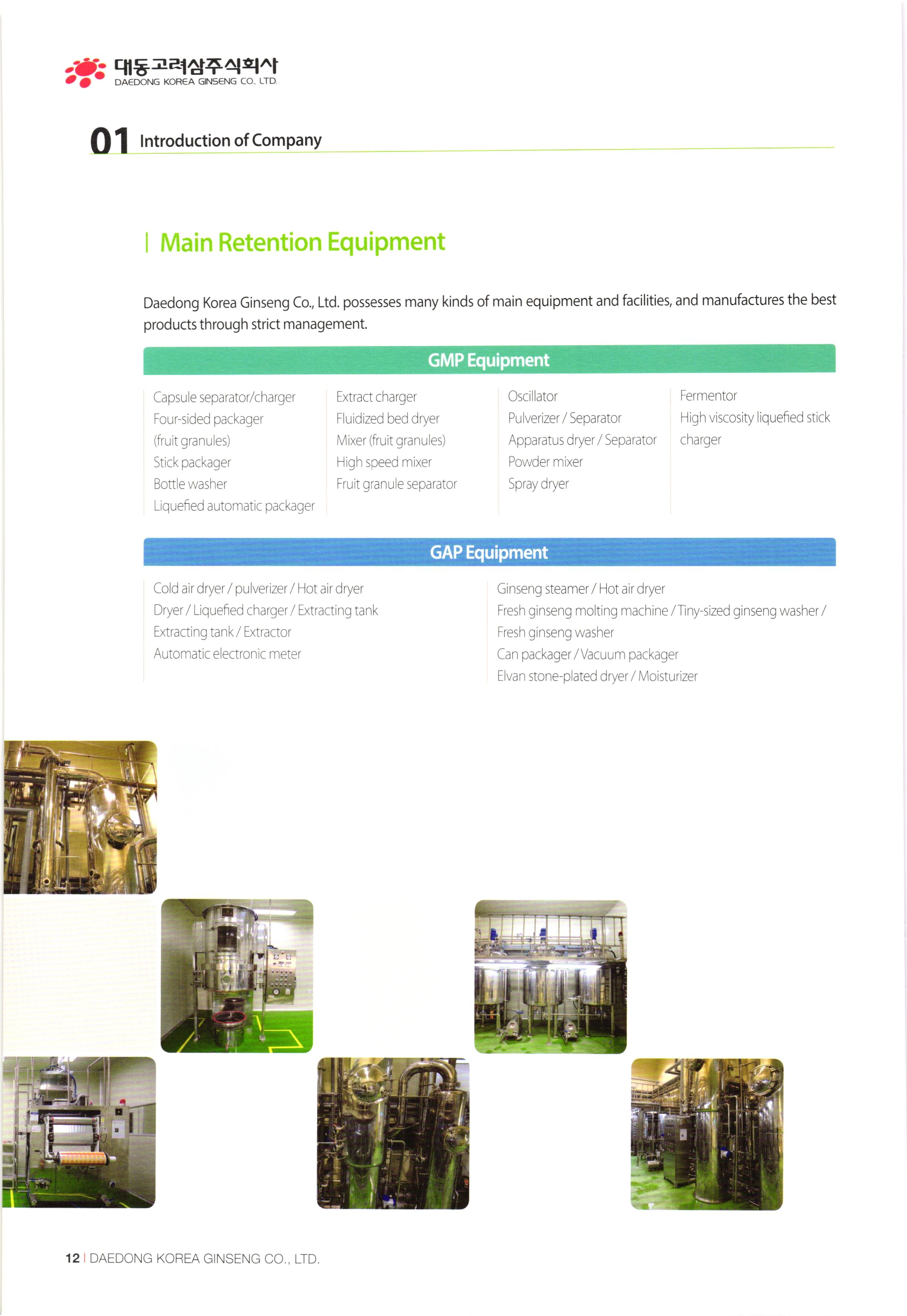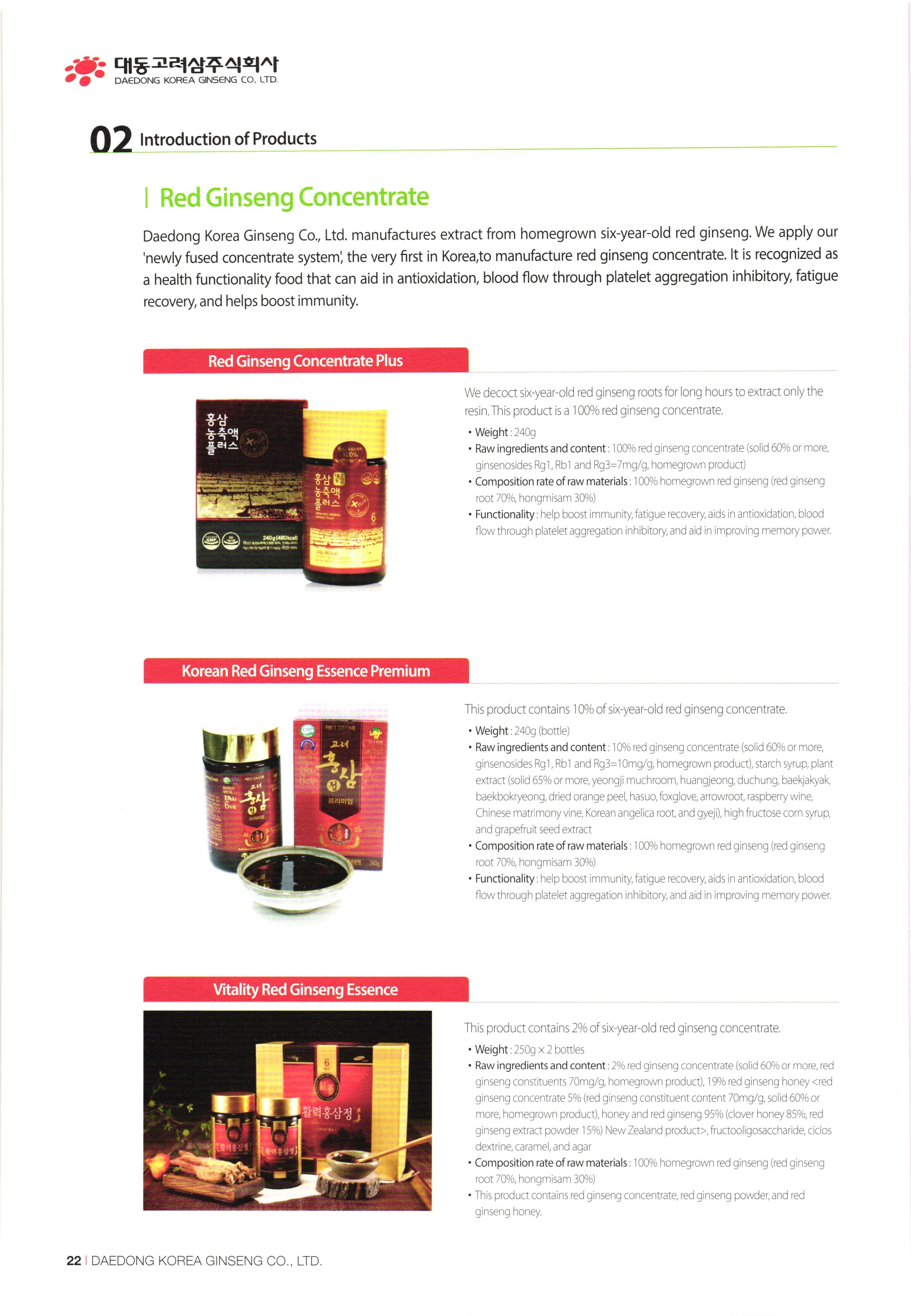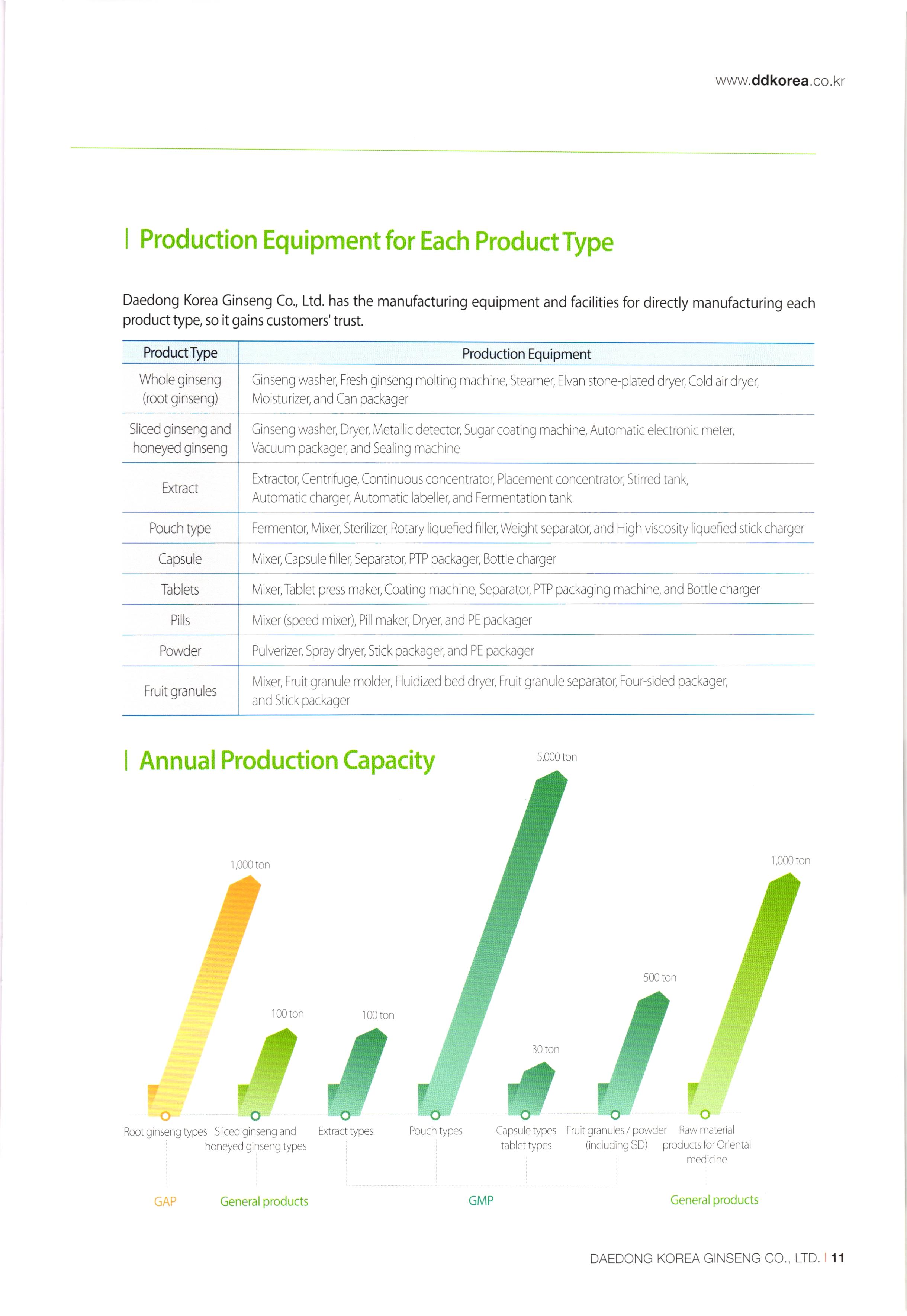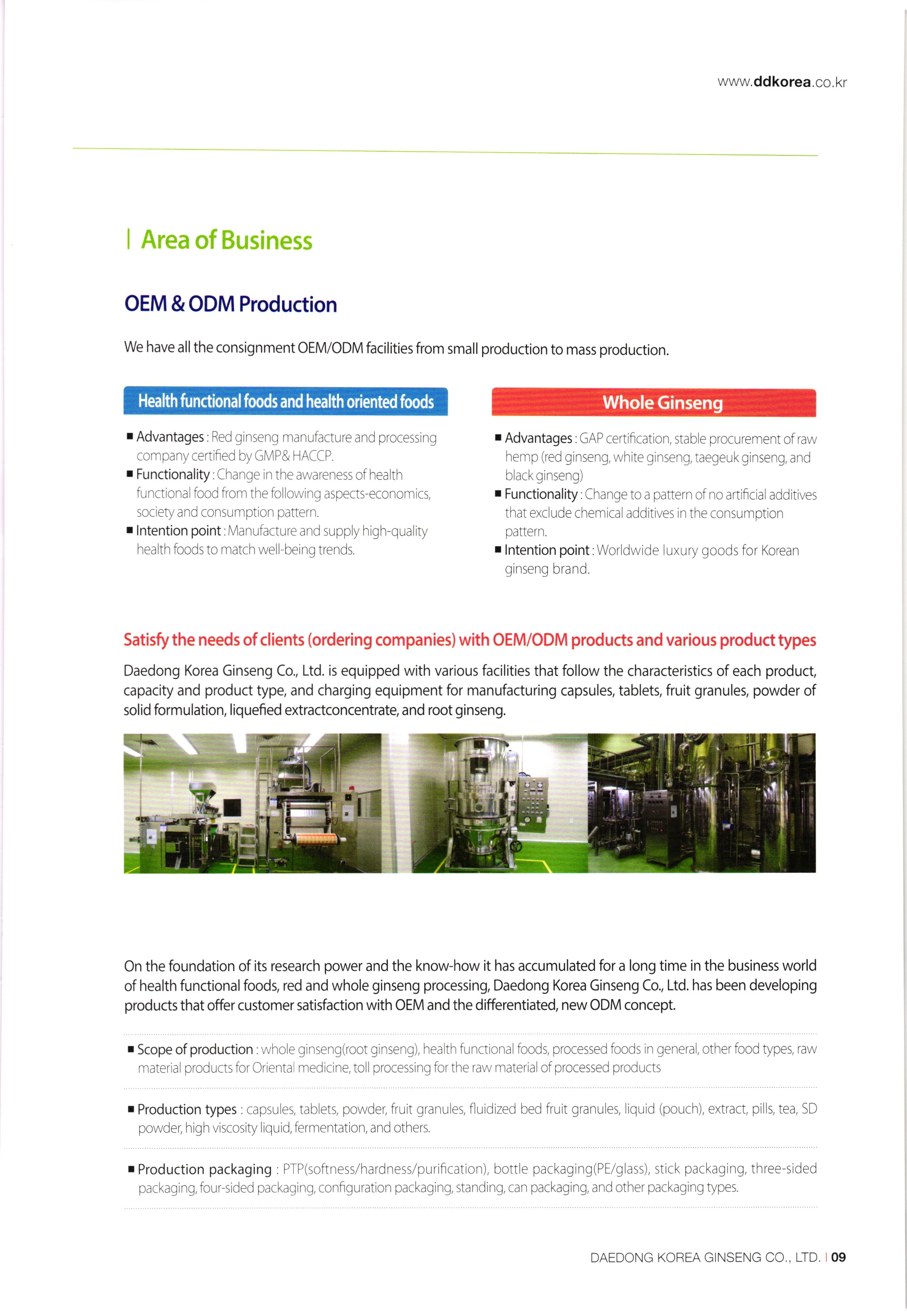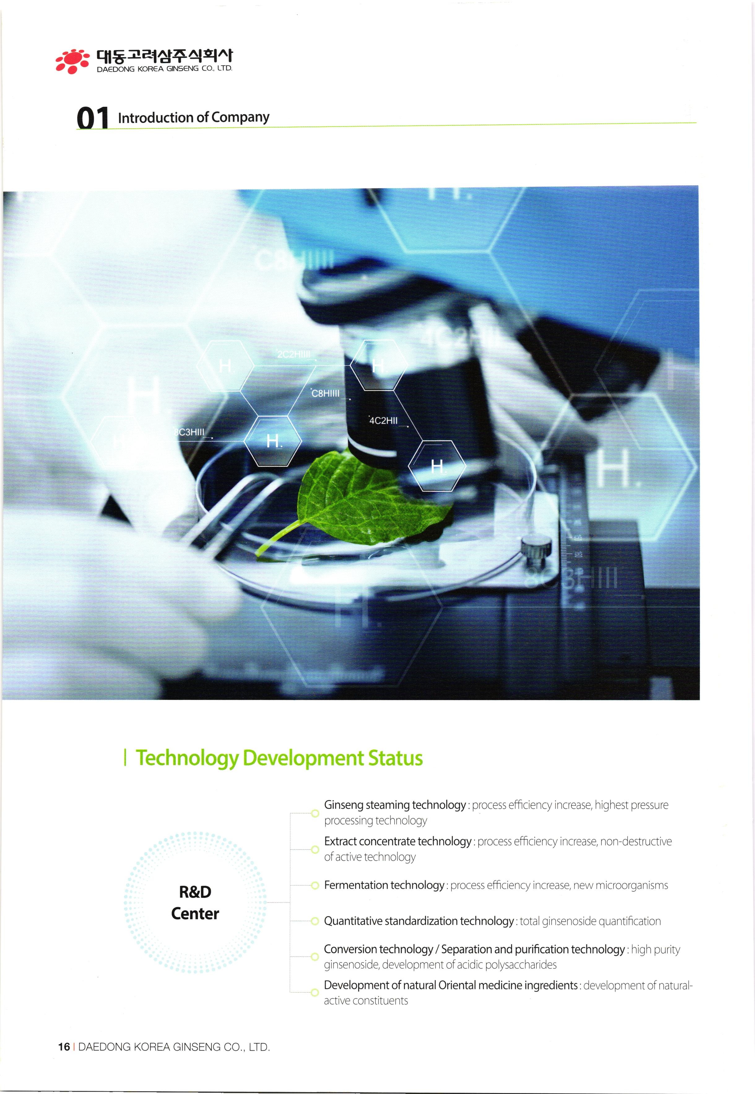 www.ddkorea.co.kr | History of Company 2002 Mar. Incorporation of Daedong Hongsam Co., Ltd. Dec. Completion of the factory of Daedong Hongsam Co., Ltd. 2010 2003 Mar. Change in business registration certificate (additional change in business status and items) Apr. Approval extension of company-affiliated research center Jul. G-mark quality certification recognized (3 products besides the eternally youthful and healthy, sliced honeyed red ginseng) Dec. Confirmation of SME for technological innovation (INNO-BIZ) 2011 2004) Feb. Corporate name changed to Daedong Korea Ginseng Co., Ltd. May Application for the registration of 15 trademark such as 'Bullo geon, 'Somi-geon, 'Chongmyeong-geon, and so on. Jun. Certification of Quality Management System (ISO 9001-2000) and Food Safety Management System (HACCP) Oct. Commencement of export to the USA and Hong Kong Nov. Selected as the recommended form for Corporation Korea Oriental Drug Association and the university-industry collaboration company of the Ginseng Industry Research Center in Chungang University. Aug. Participated in INDOPHARM, a pharmaceutical expo in Indonesia Nov. Participated in the Seoul International Food Exposition Dec. Participated in CPHL World Wide, a worldwide raw material and pharmaceutical expo Jan. Appointed as ginseng inspection company of Agricultural Products Quality Management Service (No. 13) Sep. Certification of Environment Management System, Registered as holder of trademark rights of Geumsan World Ginseng Expo Nov. Recognized by the US Food and Drugs Administration (FDA), Recognized by the Ministry of Labor as CLEAN workplace Feb. Commencement of Turkey exports Apr. Awarded Excellent Businessman Commendation by Geumsan-gun May G-mark quality certification recognized (5 products besides red ginseng extract) Sep. Participated in Geumsan World Ginseng Expo 2011 (official commercializer) Patent application no. 10-1070770 (processed products of ginseng with reduced benzopyrene content Nov. CLEAN workplace re-qualification (No. 20,653) Dec. Registration of tracking management of agricultural product records Patent application no. 10-1106487 (Red ginseng extract in which ginsenoside Rg3 and Rg2 is strengthened) Designated as business establishment that applies GMP, the manufacturing standard of excellent healthfunctional foods Construction of equipment and newly fused extract concentrator 2005 2012 00 00 00 00 2007 Jun. Chungnam branch office recommended quality and recognized agricultural specialty products Jul. Selected as appointed firm for promising SMEs in Chungnam Aug. Establishment of company-affiliated research center recognized Establishment of R&D Department recognized Oct. ecognized as venture business Nov. Acknowledgement of BSI ISO 22000:2005 Dec. Appointed as SME for technological innovation (INNO-BIZ) Dec. Awarded the grand prize at the Convention of International Businessmen in Geumsan-gun Jan. Registration of tracking management of agricultural product records Patent application no. 10-1106487 (Red ginseng extract in which ginsenoside Rg3 and Rg2 is strengthened) Feb. Patent registration no. 10-1120996 (composition, including ginsenoside Rg3 and Rh2, good for enhancing exercise ability and fatigue recovery) Mar. Re-qualification of venture business Entry of Han-areum Mart in the US Sep. Participated in Geumsan International Ginseng Trade Fair (Ginseng Festival) Dec. Participated in Busan BEXCO Geumsan Ginseng Special Fair 2008 2013 Jun. Chungnam branch office recommended quality and recognized ginseng specialty products (Daedong red ginseng powder) Jul. Quality certification by Geumsan-gun (26th Red Ginseng Rare Delicacy Gold), Geographic indication registration (red ginseng products) Sep. Use of Geumhong brand approved by Geumsan-gun (No. 08 001) Awarded 'Outstanding Businessman Trophy' at 15th Convention of International Businessmen in Chungnam Oct. Issue of certificate of venture business GAP (Excellent agricultural products management facilities) Feb. Participated in GULFOOD 2009, a food exhibition in Dubai Apr. Commencement of UAE exports May Participated in HOFEX2009, HK Food Expo Oct. Application of patent (10-2009-0095905) Oct. Brand registration (Ganyeori No. 40-0758332) Dec 2009 Participated in Organic and Natural Foods Expo in Dubai Sep. Entry of SMEs well-known products (Daejeon Station stores), Participated in K-food Fair, Hanoi. Oct. Participated in the 13th World Korean Business Convention (Kim Daejung Convention in Gwangju), Participated in Red Cross expo of joint government departments Nov. Ginseng Festival sponsored by Small and Medium Business Administration / Ginseng Association, Participated in Goryeo Ginseng World Tour Vietnam Expo Dec. Listed on Korea Exchange KONEX stock market 2014 2009 Feb. Restructured of Company organization May Launched five radio commercial (sponsorship) programs Sep. Recipient of Ministry of Industry, Trade and Energy Award (Department of SME Technology Fusion Commercialization) Dec. Award for achieving top exports of USD 1 million. 2015 May Completion of 2nd GMP factory Jul Increase of capital funds (KRW 2.8 billion) DAEDONG KOREA GINSENG CO., LTD. 107