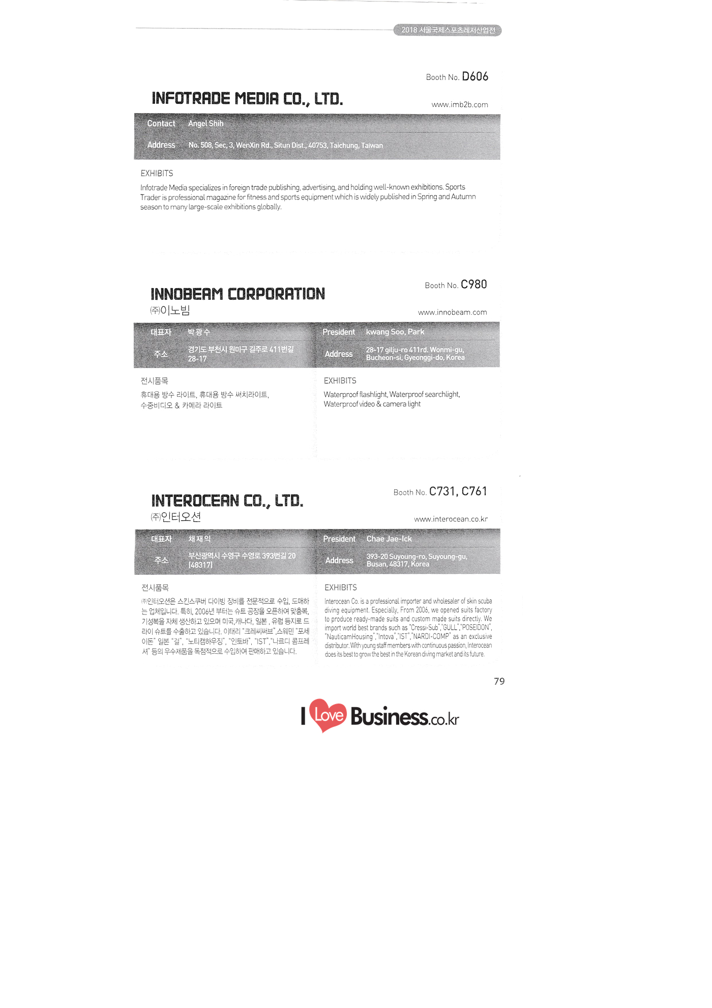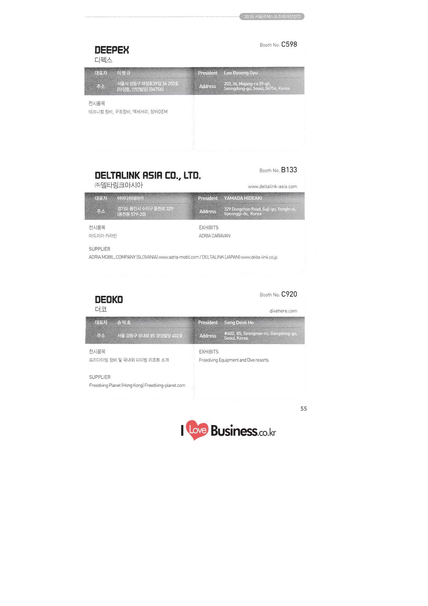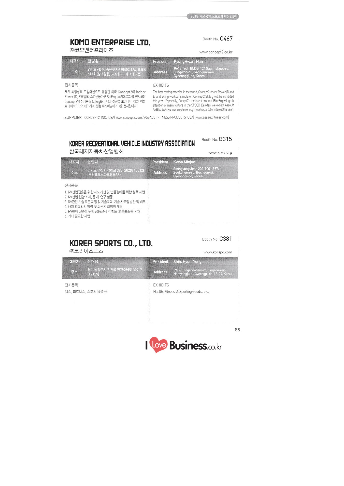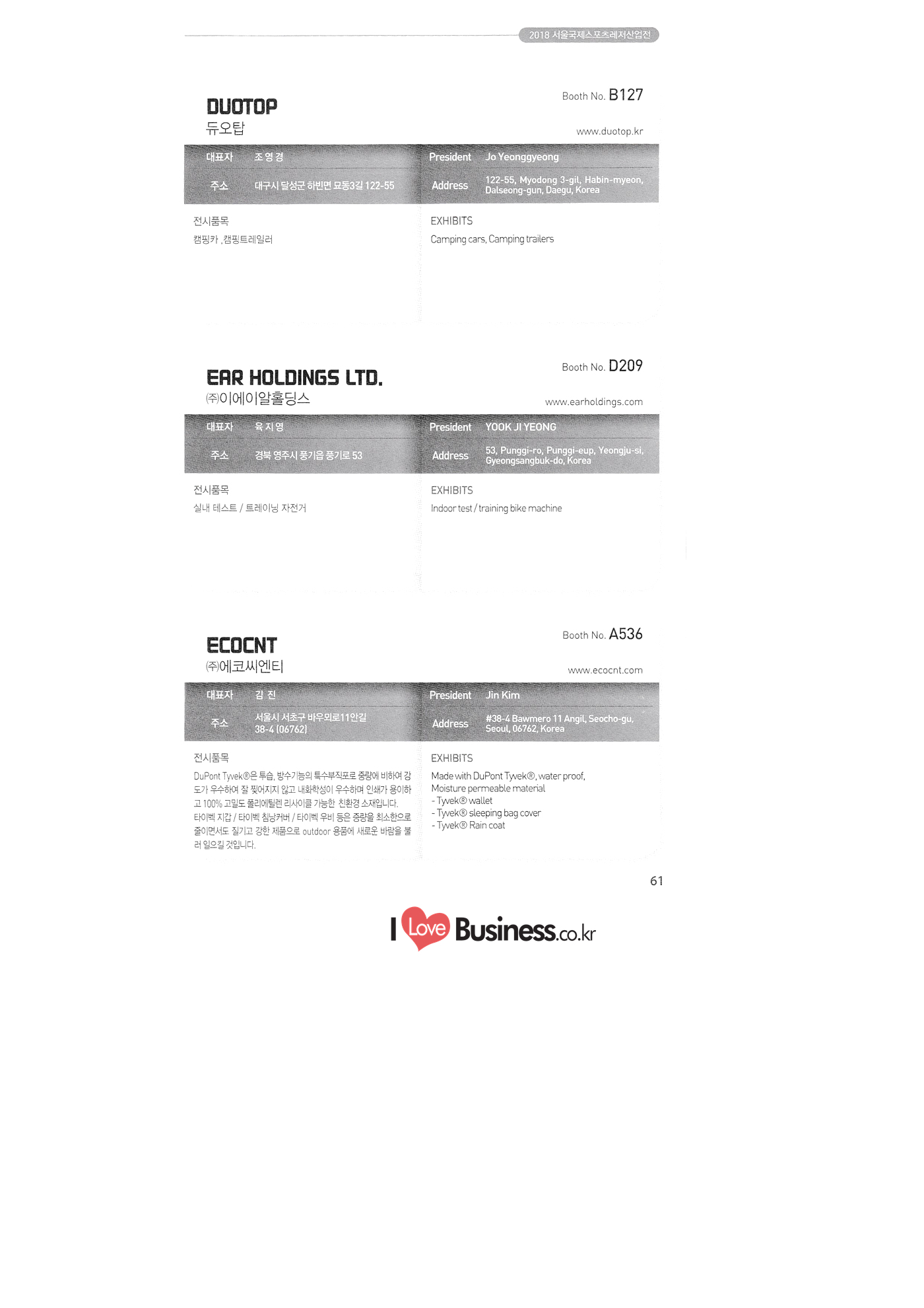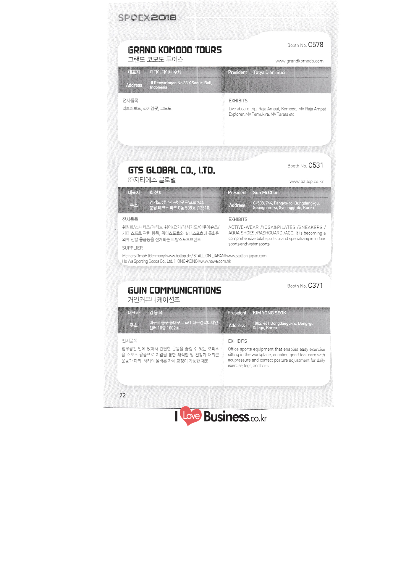 | SPOEX 2018 국문업체명 페이지 부스번호 영문업체명 HALLA A221 A231 A246 A101 CARSOUND IN CAMPING A102 MARINELAND, LTD. A111 TNCKOREA A202 - NANUX NETWORKS INC. A211 | HEALINGKOREA INC. SUNGWOO MOTORS A222. WHITE HOUSE KOREA A226 FAMILYCARAVAN W CARAVAN A241 STARCARAVAN A242 EUNHA MOBILE WOORICAMPING A250 1 HIGHEND CAMPINGCAR A302 1 URBAN VELO PROJECT A310 Z.T COMPANY A314 3SIXTY KOREA A316 1 GCT INTERNATIONAL CO., LTD. A323 1 CAMPERBOX, INC. A325 1 RECON HI-TECH BIKE COMPANY A327 1 KABUTO KOREA A345 ETRION CO., LTD. A402 WIAWIS(WIN&WIN CO., LTD. A409 VERTEXKOREA CO., LTD. A4.13 VKOOL SUNGLASSES A415 SANBADA SPORTS.CO.,LTD A417 CAMPING NADRI A419 D&F KOREA A420 1 RAON GLOBAL A426 1 YOONSUNG F&B CO., LTD. A436 TINNOVATION A442 | COOLRUNBIKE CO., LTD. A443 1 YB COMPANY A502 1 FINEALL CORPORATION 카사운드인캠핑 마린랜드(주) 티앤씨코리아 (주)나눅스네트웍스 (주)힐링코리아 (주성우모터스 (주)화이트하우스코리아 패밀리카라반 더블유카라반 스타카라반 은하모빌 우리캠핑 하이엔드캠핑카 어반벨로프로젝트 지티컴퍼니 쓰리식스티 코리아 주지씨티인터내셔날 (주캠퍼박스 리콘하이테크 주카부토코리아 (주)이트라이언 위아위스(윈엔윈(주) (주)버텍스코리아 브이쿨 선글라스 (주산바다스포츠 캠핑나들이 디앤에프 코리아 라온글로벌 (주윤성에프앤비 (주아이이노베이션 (주쿨런바이크 와이비컴퍼니 (주)대원포티스 18 '부스별 업체명 / Exhibitors by Booth No. | | A505 LYCLE 라이클 A506 1 DR.MAHN COFFEE INC. (주)닥터만커피 A509 KIPROTO (주)키프로토 A510 | KCM CO., LTD. ((주)케이씨엠 A514 | POWERTECTOR (주신일스포츠 (파워텍터 A517 1 OKINAWA CONVENTION & VISITORS BUREAU 오키나와 관광컨벤션뷰로 A518 WITHYOUBIKE CO., LTD. (주)위드유바이크 A521 SMARTGUY CO., LTD. (주)스마트가이 A522) DONGYANG NETWORKS 동양네트웍스 A526. SHINTS-NSR RIDING (주)신티에스-NSR RIDING | A536 1 ECOCNT (주)에코씨엔티 A536 1 DTI INTERNATION CO., LTD. (주)디티아이인터네셔널 A537 WITHUS&EARTH CO., LTD. (주)위드어스 A542 T&P NETWORK (주)티엔피네트워크 A601 IGUANA KOREA CO., LTD. (주)이구아나코리아 A602 PREMIER MOTORS 프리미어모터스 A609 1 MINELAB ELECTRONICS MINELAB ELECTRONICS A610 OLLE CAMP 올레캠프 A614 GARMIN KOREA LTD. 가민코리아 유한회사 A615 1 CAMPINGTIME 캠핑타임 A617 H-INTERNATIONAL 에이치인터네셔널 A619 ARX INC. ARX INC. A619 EMBASSY OF THE KINGDOM OF THE NETHERLANDS 주한 네덜란드 대사관 A620 1 CHALLENGEKOREA.CO (주챌린지코리아 A621 1 ROSSA SPORTS,.LTD 로사스포츠 A622 SEESUN CO.,LTD (주)시선 A626 SKYNURI (주)하늘누리(하늘누리항공) TANNUS (주타누스 A628 1 TOPEND CO., LTD. (주탑엔드 A633 | SPOHUB CO., LTD. (주스포허브 A634 RPACK.COM INC. (주알팩닷컴 A637 1 CUFIT INC. (주쿠핏 A639 THE BIKE 더바이크 A642 TIME E&C CO., LTD. (주)타임이엔씨 A643 MPOWERD KOREA A702 WOOSUNG I.B. CO., LTD. A714 SUPBOY A720 AIR-FORCE A724 CORINTO A726 COOL WARM A732 MAGMA HOLDS A733 VITATRADE A735 3IP HANGUNG CO., LTD. A736 | ONCO A738 | SOLAR PARTS KOREA A739 ACTIVELIFE A802 SAGAINTERNATIONAL A810 JUYOUNG A813 JETWAKE CO., LTD. A814 CERROTORRE CO., LTD. A902 AIR BOX CO., LTD. A905 MATRO CO., LTD. A910 MAN & MOUNTAIN A914 VOULEZ-VOUS A916 MED OUTDOOR CORPORATION A920 KUMKANG INDUSTRY A921 1 VULEVU TRADE CO., LTD. FUKUSHIMA PREFECTURE TOURISM & LOCAL PRODUCTS ASSOCIATION A923 AAEBON CO., LTD. A926 1 URSAFE A927 1 MICHELIN SPORTS CO. A928 1 ANGEL BOOMERANG 엠파워드 코리아 (주우성아이비 썹보이(서정상사) 에어포스 (주코린토 쿨웜 마그마홀드 비타트레이드 (주)한궁세계화연구소 온코 솔라파츠 코리아 (주)액티브라이프 사가인터내셔널 주영 (주제트웨이크 (주)쎄로또레 주에어박스 (주매트로 도서출판 사람과산 주불레부 (주메드아웃도어 금강산업 불레부통상 후쿠시마현관광물산교류협회 A922 (주)에반 유어세이프 미쉐린스포츠 천사부메랑 HALLB B101 B102 1 B120 BLUEBIRD ENTERPRISE, INC. CARAVANTAIL & WINNEBAGO VANRECH D&C CO., LTD. (주블루버드엔터프라이즈 카라반테일&위네바고 (주밴텍디엔씨 '부스별 업체명 / Exhibitors by Booth No. 부스번호 영문업체명 국문업체명 페이지 이 - B124 B125 B127 B133 B136 BUFFALO AUTOHOMES CARAVAN CLUB KOREA DUOTOP DELTALINK ASIA CO., LTD. | WOHNMOBIL ARIAMOBILE CORPORATION UNION RV 버팔로 오토홈스 카라반클럽코리아 듀오탑 (주)델타링크아시아 본모빌 캠핑카 (주)아리아모빌 유니온RV 에이스캠퍼 (주)에어밴 팀오토 주제일모빌 (주동일이앤시 (주코리아테크 한국레저자동차산업협회 B143 B202 B221 B240 B301 B314. ACECAMPER AIRVAN TEAMAUTO CHEILMOBILE DONG IL ENC CO., LTD. KOREATECH CO., LTD. KOREA RECREATIONAL VEHICLE INDUSTRY ASSOCIATION SC MEDIA CO., LTD. KTOTO WOHNWAGEN KOREA B315 B315 B316 B321 에스씨미디어(주) (주)케이토토 본바겐코리아 와이제이캠핑카 (주)써밋캠핑카라반 다온티앤티 B322 YJ RV B331 | SUMMIT C&C CO., LTD. B341 DAONTNT 고 스몰미 Small ME WWW.Smallme.co.kr SPOEX 2018 HALLC 하스피 주디랙스 (주렉스코 (주동아스포츠 (주)헬스원 태하메카트로닉스(주) CHOIBOKO 이-런휠 주)에이치엔) 엑스펀 펀키 거인커뮤니케이션즈 효일씨티에이 제이제이피 주루텍 주원소프트다임 세영정보통신(주) C151 | HOSPI C201 1 DRAX INC. C231 1 LEXCO CO., LTD. C271 DONG A SPORTS CO., LTD. C301 1 HEALTH-ONE CO., LTD. C331 TAEHA MECHATRONICS CO., LTD. C371 | CHOIBOKO C371 E-RUN WHEEL (H&E CO., LTD.) C371 1 EXFUN C371 1 FUNKEY C371 GUIN COMMUNICATIONS C3711 HYOILCTA C371 JJP C3711 LUU TECH CO., LTD. C371 ONESOFTDIGM. CO., LTD. C371 0 SEYOUNG INFORMATION & TELECOMMUNICATION CO., LTD. C371 SHOW INDOORSPORTS C371 202B