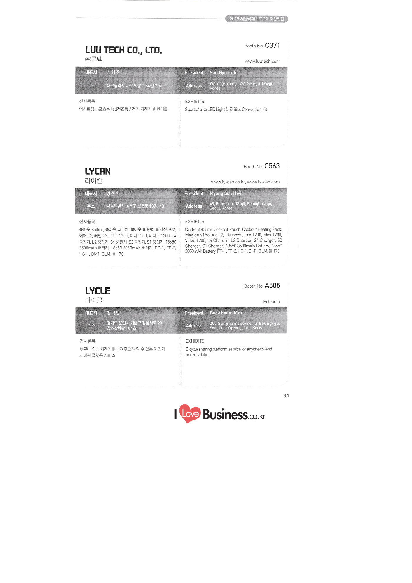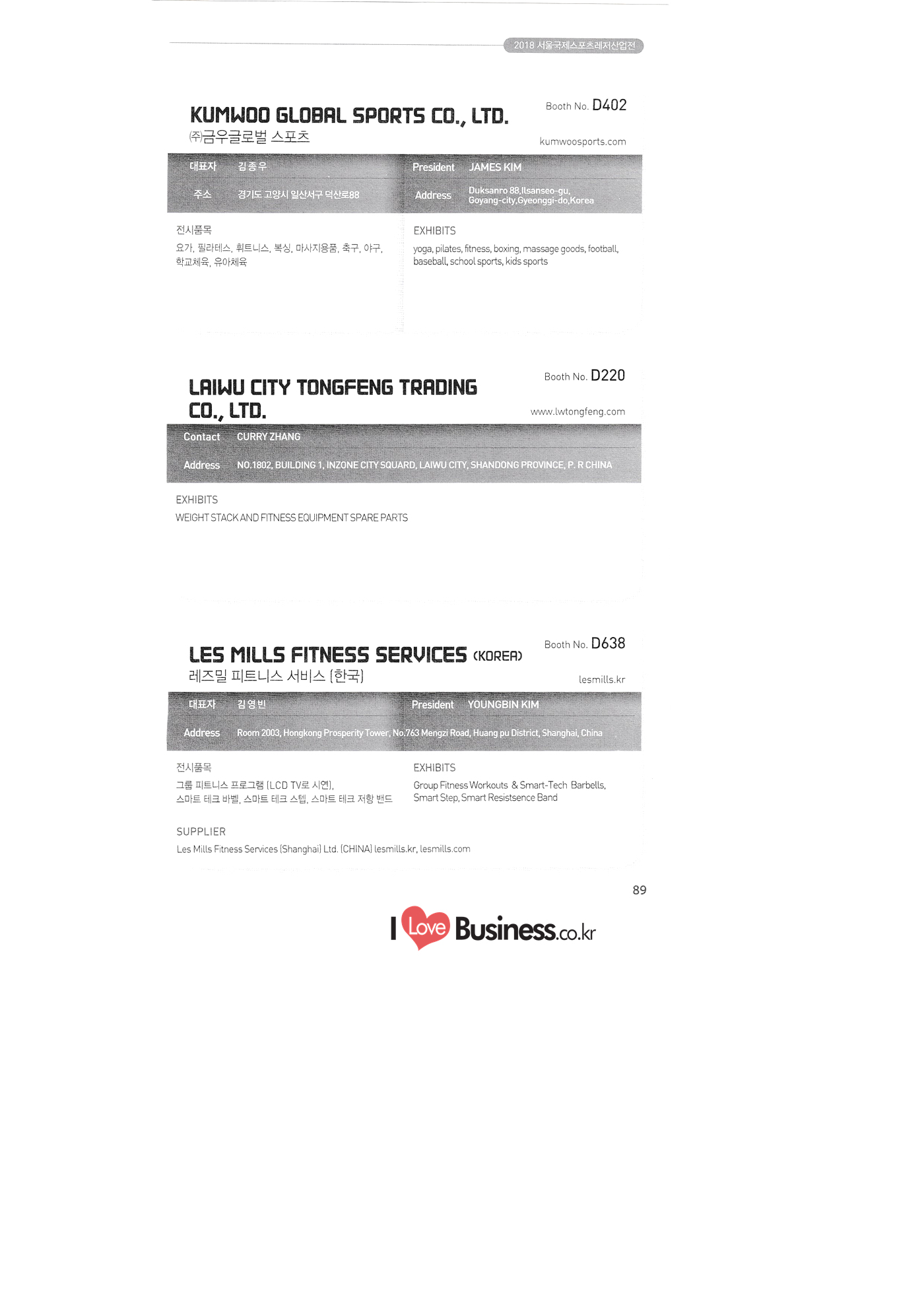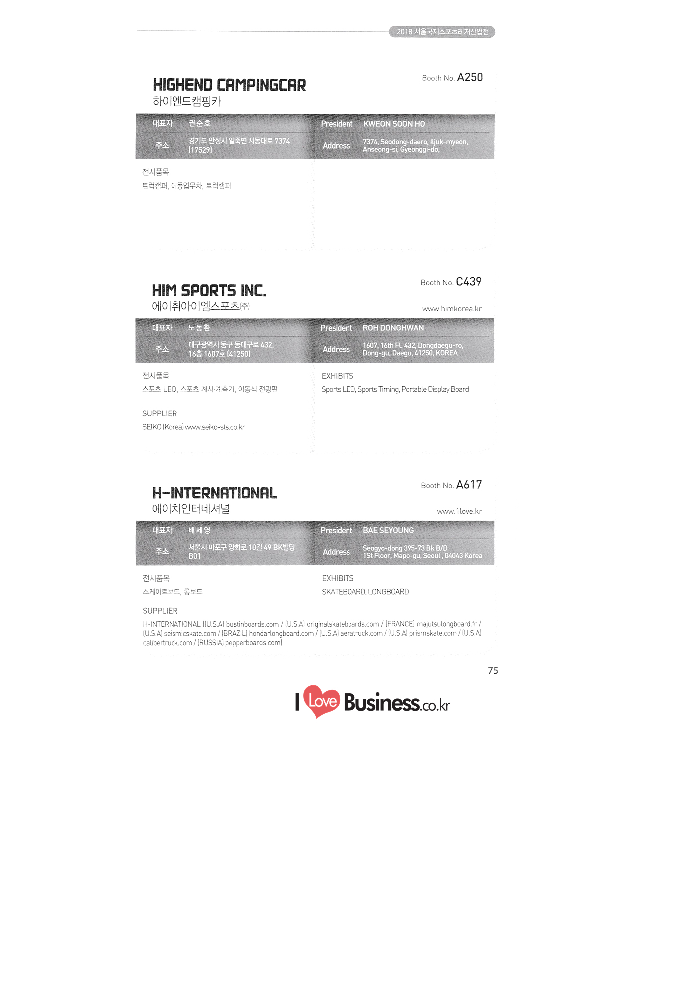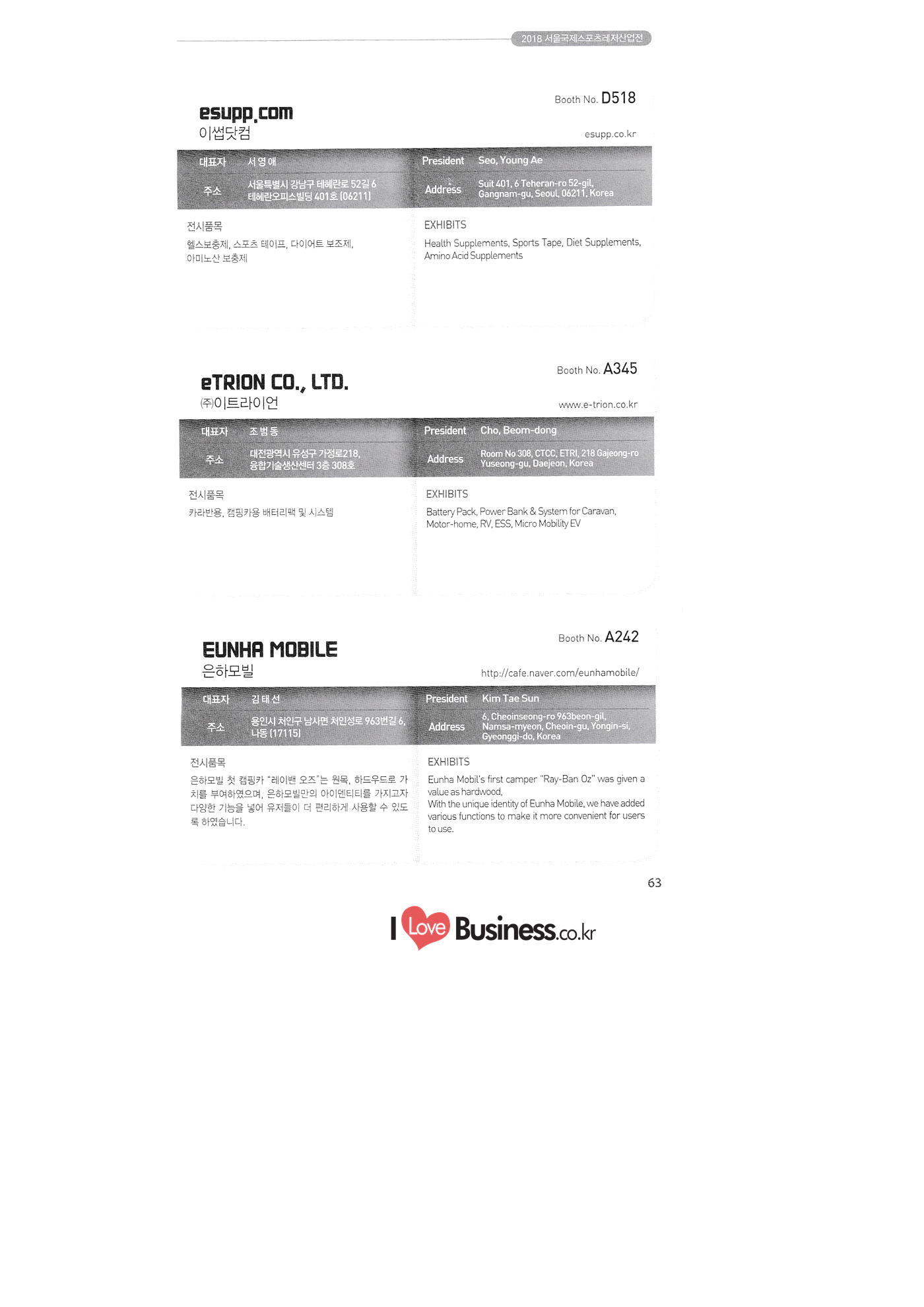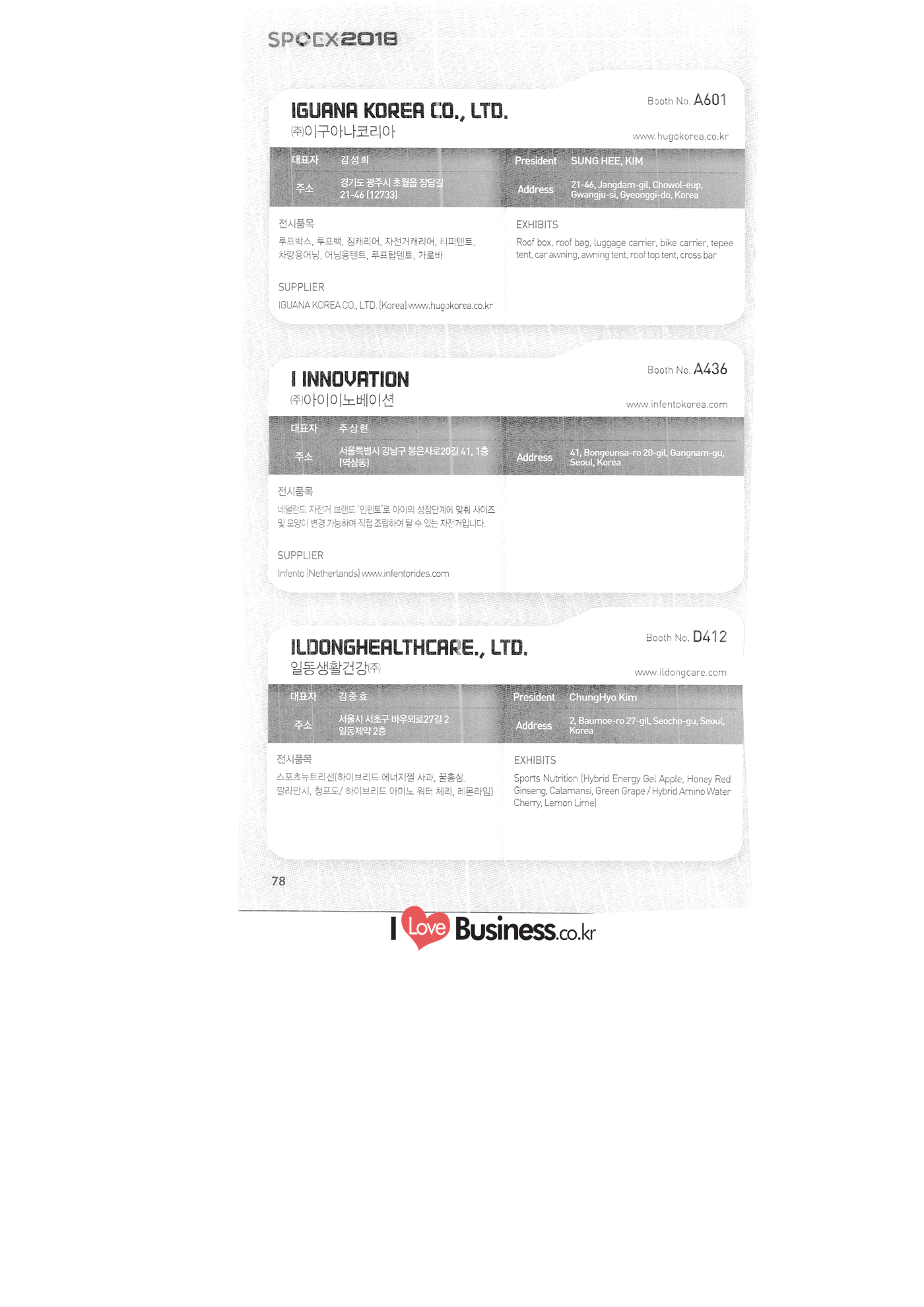 | SPOEX 2018 국문업체명 페이지 부스번호 영문업체명 HALLA A221 A231 A246 A101 CARSOUND IN CAMPING A102 MARINELAND, LTD. A111 TNCKOREA A202 - NANUX NETWORKS INC. A211 | HEALINGKOREA INC. SUNGWOO MOTORS A222. WHITE HOUSE KOREA A226 FAMILYCARAVAN W CARAVAN A241 STARCARAVAN A242 EUNHA MOBILE WOORICAMPING A250 1 HIGHEND CAMPINGCAR A302 1 URBAN VELO PROJECT A310 Z.T COMPANY A314 3SIXTY KOREA A316 1 GCT INTERNATIONAL CO., LTD. A323 1 CAMPERBOX, INC. A325 1 RECON HI-TECH BIKE COMPANY A327 1 KABUTO KOREA A345 ETRION CO., LTD. A402 WIAWIS(WIN&WIN CO., LTD. A409 VERTEXKOREA CO., LTD. A4.13 VKOOL SUNGLASSES A415 SANBADA SPORTS.CO.,LTD A417 CAMPING NADRI A419 D&F KOREA A420 1 RAON GLOBAL A426 1 YOONSUNG F&B CO., LTD. A436 TINNOVATION A442 | COOLRUNBIKE CO., LTD. A443 1 YB COMPANY A502 1 FINEALL CORPORATION 카사운드인캠핑 마린랜드(주) 티앤씨코리아 (주)나눅스네트웍스 (주)힐링코리아 (주성우모터스 (주)화이트하우스코리아 패밀리카라반 더블유카라반 스타카라반 은하모빌 우리캠핑 하이엔드캠핑카 어반벨로프로젝트 지티컴퍼니 쓰리식스티 코리아 주지씨티인터내셔날 (주캠퍼박스 리콘하이테크 주카부토코리아 (주)이트라이언 위아위스(윈엔윈(주) (주)버텍스코리아 브이쿨 선글라스 (주산바다스포츠 캠핑나들이 디앤에프 코리아 라온글로벌 (주윤성에프앤비 (주아이이노베이션 (주쿨런바이크 와이비컴퍼니 (주)대원포티스 18 '부스별 업체명 / Exhibitors by Booth No. | | A505 LYCLE 라이클 A506 1 DR.MAHN COFFEE INC. (주)닥터만커피 A509 KIPROTO (주)키프로토 A510 | KCM CO., LTD. ((주)케이씨엠 A514 | POWERTECTOR (주신일스포츠 (파워텍터 A517 1 OKINAWA CONVENTION & VISITORS BUREAU 오키나와 관광컨벤션뷰로 A518 WITHYOUBIKE CO., LTD. (주)위드유바이크 A521 SMARTGUY CO., LTD. (주)스마트가이 A522) DONGYANG NETWORKS 동양네트웍스 A526. SHINTS-NSR RIDING (주)신티에스-NSR RIDING | A536 1 ECOCNT (주)에코씨엔티 A536 1 DTI INTERNATION CO., LTD. (주)디티아이인터네셔널 A537 WITHUS&EARTH CO., LTD. (주)위드어스 A542 T&P NETWORK (주)티엔피네트워크 A601 IGUANA KOREA CO., LTD. (주)이구아나코리아 A602 PREMIER MOTORS 프리미어모터스 A609 1 MINELAB ELECTRONICS MINELAB ELECTRONICS A610 OLLE CAMP 올레캠프 A614 GARMIN KOREA LTD. 가민코리아 유한회사 A615 1 CAMPINGTIME 캠핑타임 A617 H-INTERNATIONAL 에이치인터네셔널 A619 ARX INC. ARX INC. A619 EMBASSY OF THE KINGDOM OF THE NETHERLANDS 주한 네덜란드 대사관 A620 1 CHALLENGEKOREA.CO (주챌린지코리아 A621 1 ROSSA SPORTS,.LTD 로사스포츠 A622 SEESUN CO.,LTD (주)시선 A626 SKYNURI (주)하늘누리(하늘누리항공) TANNUS (주타누스 A628 1 TOPEND CO., LTD. (주탑엔드 A633 | SPOHUB CO., LTD. (주스포허브 A634 RPACK.COM INC. (주알팩닷컴 A637 1 CUFIT INC. (주쿠핏 A639 THE BIKE 더바이크 A642 TIME E&C CO., LTD. (주)타임이엔씨 A643 MPOWERD KOREA A702 WOOSUNG I.B. CO., LTD. A714 SUPBOY A720 AIR-FORCE A724 CORINTO A726 COOL WARM A732 MAGMA HOLDS A733 VITATRADE A735 3IP HANGUNG CO., LTD. A736 | ONCO A738 | SOLAR PARTS KOREA A739 ACTIVELIFE A802 SAGAINTERNATIONAL A810 JUYOUNG A813 JETWAKE CO., LTD. A814 CERROTORRE CO., LTD. A902 AIR BOX CO., LTD. A905 MATRO CO., LTD. A910 MAN & MOUNTAIN A914 VOULEZ-VOUS A916 MED OUTDOOR CORPORATION A920 KUMKANG INDUSTRY A921 1 VULEVU TRADE CO., LTD. FUKUSHIMA PREFECTURE TOURISM & LOCAL PRODUCTS ASSOCIATION A923 AAEBON CO., LTD. A926 1 URSAFE A927 1 MICHELIN SPORTS CO. A928 1 ANGEL BOOMERANG 엠파워드 코리아 (주우성아이비 썹보이(서정상사) 에어포스 (주코린토 쿨웜 마그마홀드 비타트레이드 (주)한궁세계화연구소 온코 솔라파츠 코리아 (주)액티브라이프 사가인터내셔널 주영 (주제트웨이크 (주)쎄로또레 주에어박스 (주매트로 도서출판 사람과산 주불레부 (주메드아웃도어 금강산업 불레부통상 후쿠시마현관광물산교류협회 A922 (주)에반 유어세이프 미쉐린스포츠 천사부메랑 HALLB B101 B102 1 B120 BLUEBIRD ENTERPRISE, INC. CARAVANTAIL & WINNEBAGO VANRECH D&C CO., LTD. (주블루버드엔터프라이즈 카라반테일&위네바고 (주밴텍디엔씨 '부스별 업체명 / Exhibitors by Booth No. 부스번호 영문업체명 국문업체명 페이지 이 - B124 B125 B127 B133 B136 BUFFALO AUTOHOMES CARAVAN CLUB KOREA DUOTOP DELTALINK ASIA CO., LTD. | WOHNMOBIL ARIAMOBILE CORPORATION UNION RV 버팔로 오토홈스 카라반클럽코리아 듀오탑 (주)델타링크아시아 본모빌 캠핑카 (주)아리아모빌 유니온RV 에이스캠퍼 (주)에어밴 팀오토 주제일모빌 (주동일이앤시 (주코리아테크 한국레저자동차산업협회 B143 B202 B221 B240 B301 B314. ACECAMPER AIRVAN TEAMAUTO CHEILMOBILE DONG IL ENC CO., LTD. KOREATECH CO., LTD. KOREA RECREATIONAL VEHICLE INDUSTRY ASSOCIATION SC MEDIA CO., LTD. KTOTO WOHNWAGEN KOREA B315 B315 B316 B321 에스씨미디어(주) (주)케이토토 본바겐코리아 와이제이캠핑카 (주)써밋캠핑카라반 다온티앤티 B322 YJ RV B331 | SUMMIT C&C CO., LTD. B341 DAONTNT 고 스몰미 Small ME WWW.Smallme.co.kr SPOEX 2018 HALLC 하스피 주디랙스 (주렉스코 (주동아스포츠 (주)헬스원 태하메카트로닉스(주) CHOIBOKO 이-런휠 주)에이치엔) 엑스펀 펀키 거인커뮤니케이션즈 효일씨티에이 제이제이피 주루텍 주원소프트다임 세영정보통신(주) C151 | HOSPI C201 1 DRAX INC. C231 1 LEXCO CO., LTD. C271 DONG A SPORTS CO., LTD. C301 1 HEALTH-ONE CO., LTD. C331 TAEHA MECHATRONICS CO., LTD. C371 | CHOIBOKO C371 E-RUN WHEEL (H&E CO., LTD.) C371 1 EXFUN C371 1 FUNKEY C371 GUIN COMMUNICATIONS C3711 HYOILCTA C371 JJP C3711 LUU TECH CO., LTD. C371 ONESOFTDIGM. CO., LTD. C371 0 SEYOUNG INFORMATION & TELECOMMUNICATION CO., LTD. C371 SHOW INDOORSPORTS C371 202B
