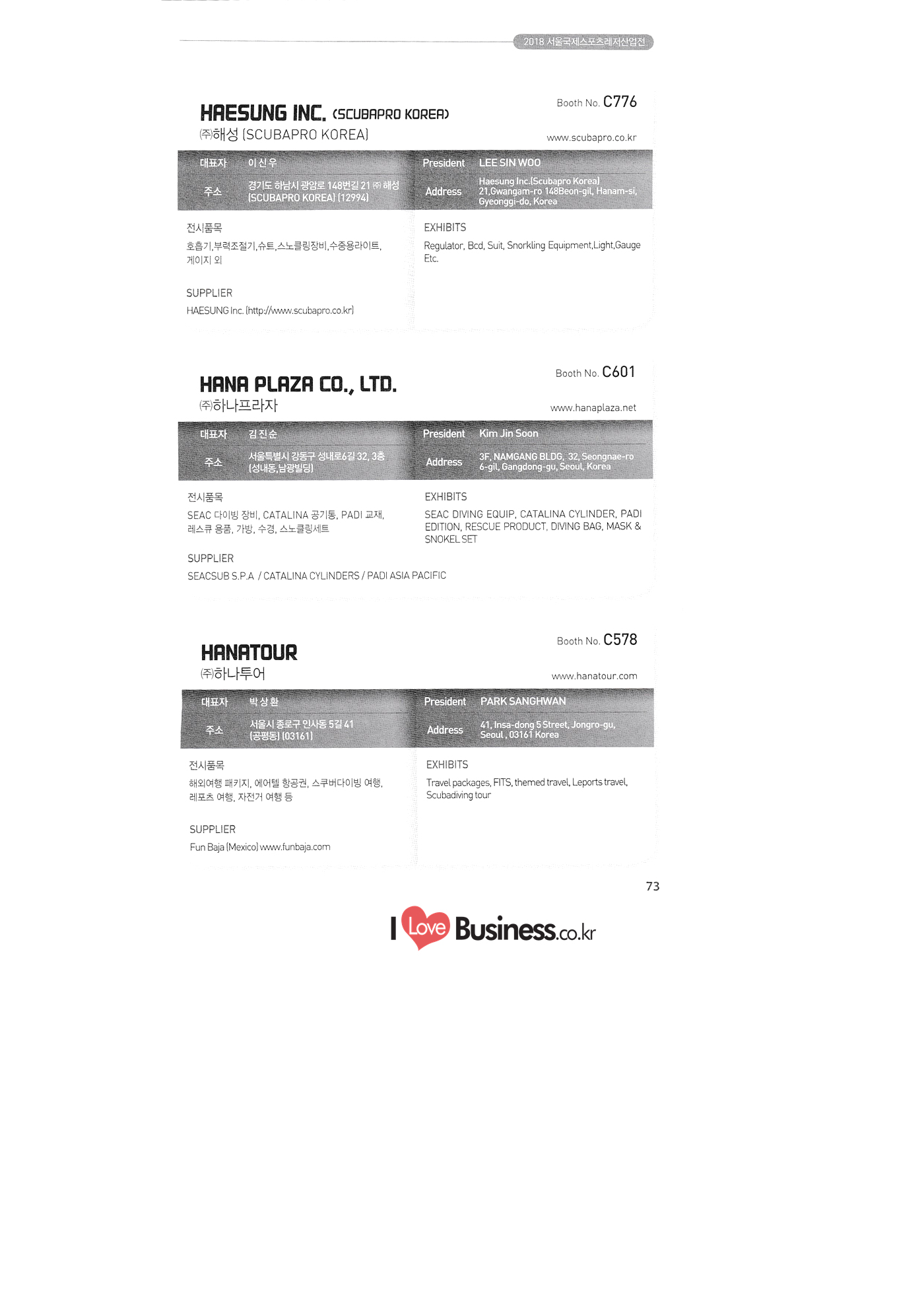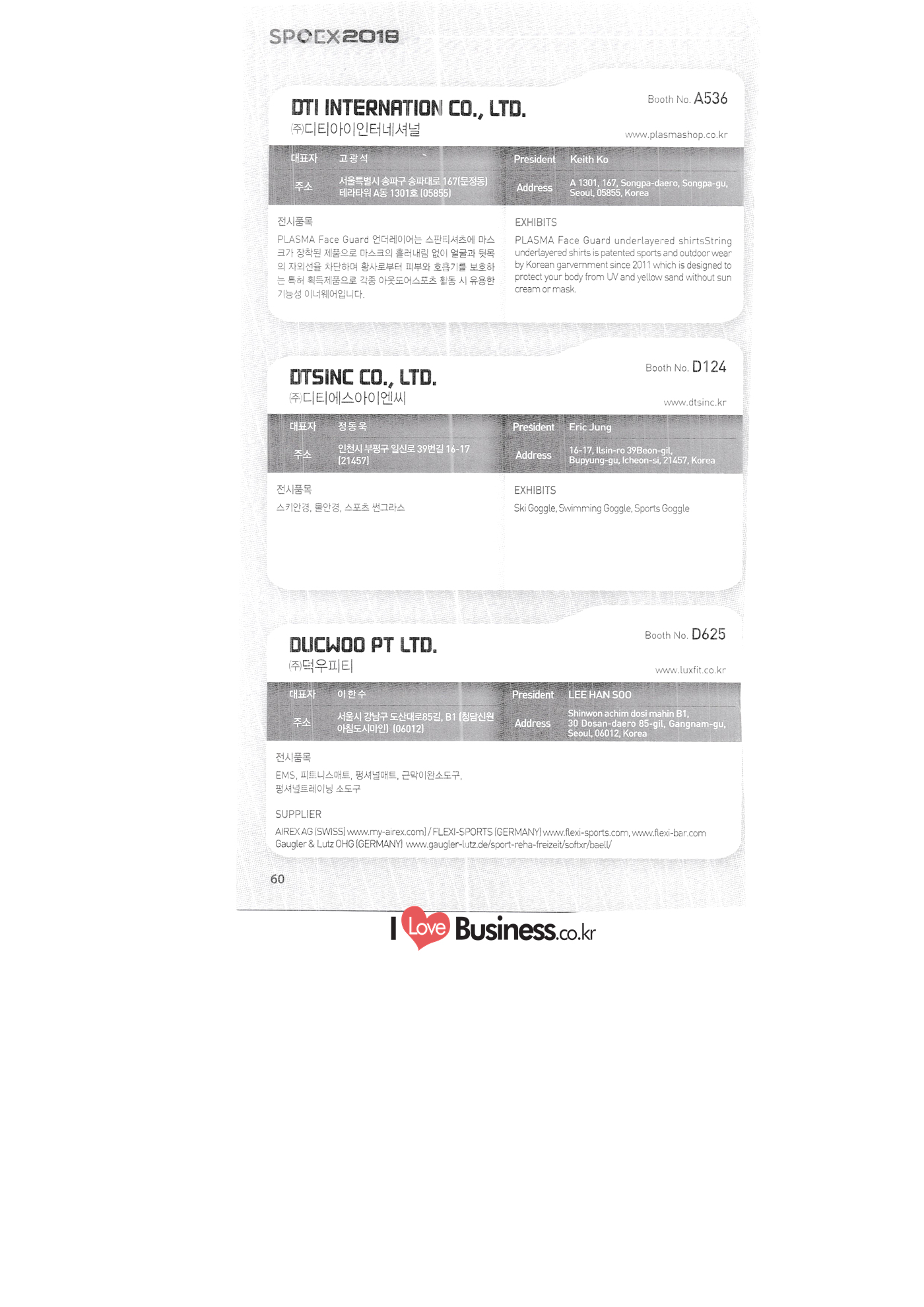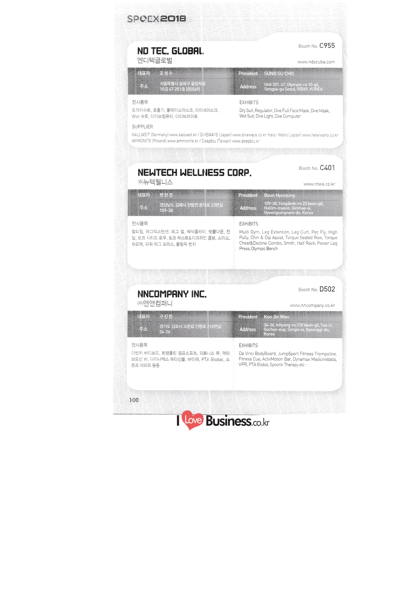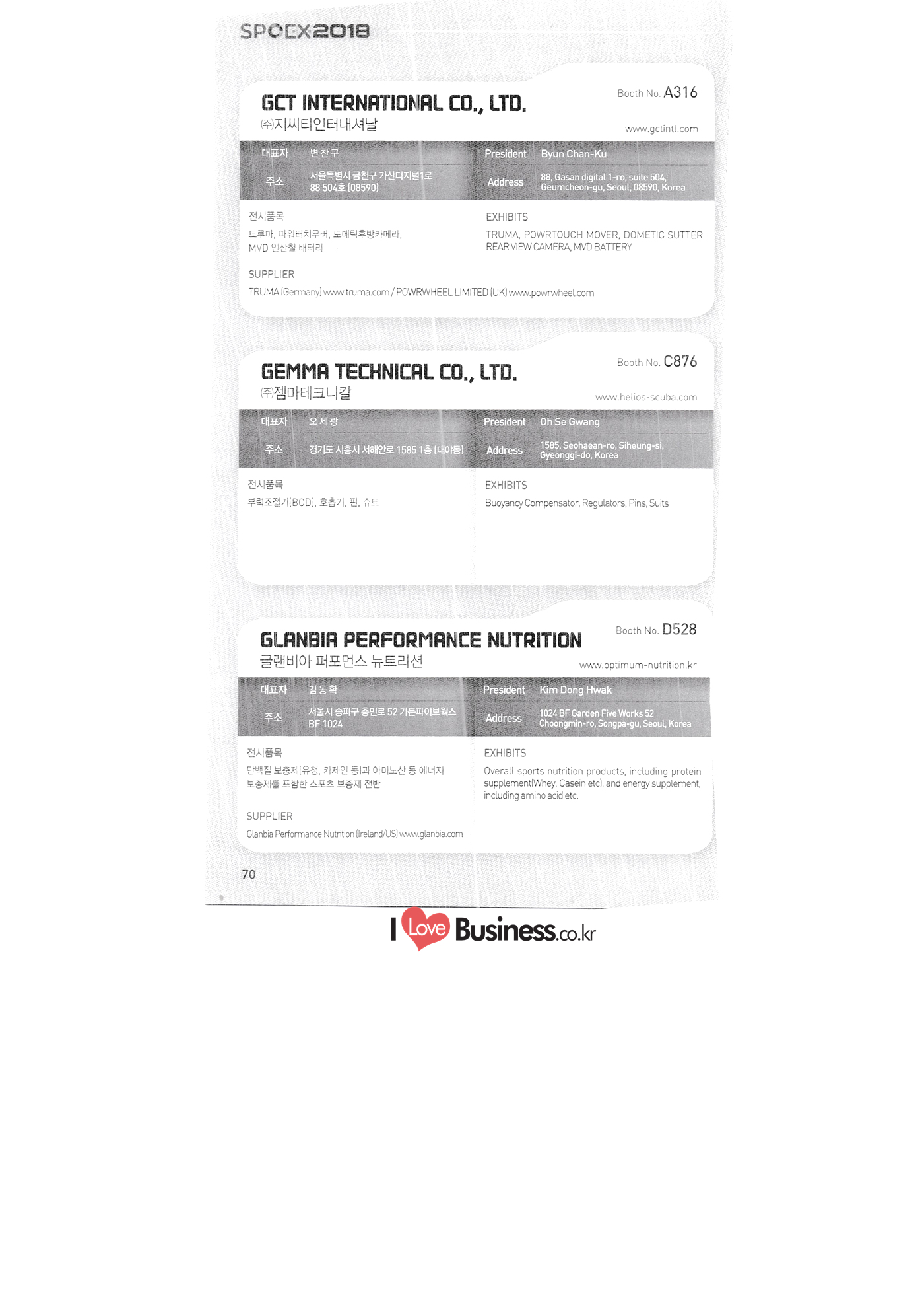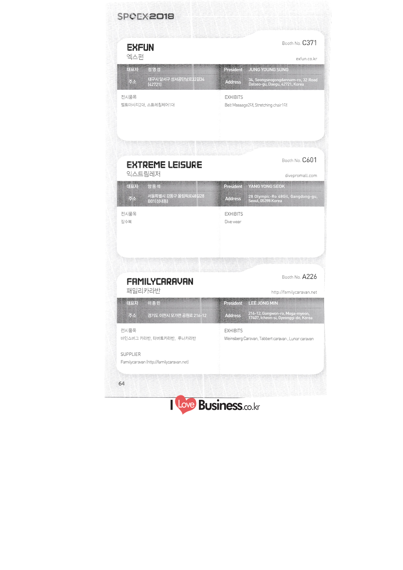| SPOEX 2018 국문업체명 페이지 부스번호 영문업체명 HALLA A221 A231 A246 A101 CARSOUND IN CAMPING A102 MARINELAND, LTD. A111 TNCKOREA A202 - NANUX NETWORKS INC. A211 | HEALINGKOREA INC. SUNGWOO MOTORS A222. WHITE HOUSE KOREA A226 FAMILYCARAVAN W CARAVAN A241 STARCARAVAN A242 EUNHA MOBILE WOORICAMPING A250 1 HIGHEND CAMPINGCAR A302 1 URBAN VELO PROJECT A310 Z.T COMPANY A314 3SIXTY KOREA A316 1 GCT INTERNATIONAL CO., LTD. A323 1 CAMPERBOX, INC. A325 1 RECON HI-TECH BIKE COMPANY A327 1 KABUTO KOREA A345 ETRION CO., LTD. A402 WIAWIS(WIN&WIN CO., LTD. A409 VERTEXKOREA CO., LTD. A4.13 VKOOL SUNGLASSES A415 SANBADA SPORTS.CO.,LTD A417 CAMPING NADRI A419 D&F KOREA A420 1 RAON GLOBAL A426 1 YOONSUNG F&B CO., LTD. A436 TINNOVATION A442 | COOLRUNBIKE CO., LTD. A443 1 YB COMPANY A502 1 FINEALL CORPORATION 카사운드인캠핑 마린랜드(주) 티앤씨코리아 (주)나눅스네트웍스 (주)힐링코리아 (주성우모터스 (주)화이트하우스코리아 패밀리카라반 더블유카라반 스타카라반 은하모빌 우리캠핑 하이엔드캠핑카 어반벨로프로젝트 지티컴퍼니 쓰리식스티 코리아 주지씨티인터내셔날 (주캠퍼박스 리콘하이테크 주카부토코리아 (주)이트라이언 위아위스(윈엔윈(주) (주)버텍스코리아 브이쿨 선글라스 (주산바다스포츠 캠핑나들이 디앤에프 코리아 라온글로벌 (주윤성에프앤비 (주아이이노베이션 (주쿨런바이크 와이비컴퍼니 (주)대원포티스 18 '부스별 업체명 / Exhibitors by Booth No. | | A505 LYCLE 라이클 A506 1 DR.MAHN COFFEE INC. (주)닥터만커피 A509 KIPROTO (주)키프로토 A510 | KCM CO., LTD. ((주)케이씨엠 A514 | POWERTECTOR (주신일스포츠 (파워텍터 A517 1 OKINAWA CONVENTION & VISITORS BUREAU 오키나와 관광컨벤션뷰로 A518 WITHYOUBIKE CO., LTD. (주)위드유바이크 A521 SMARTGUY CO., LTD. (주)스마트가이 A522) DONGYANG NETWORKS 동양네트웍스 A526. SHINTS-NSR RIDING (주)신티에스-NSR RIDING | A536 1 ECOCNT (주)에코씨엔티 A536 1 DTI INTERNATION CO., LTD. (주)디티아이인터네셔널 A537 WITHUS&EARTH CO., LTD. (주)위드어스 A542 T&P NETWORK (주)티엔피네트워크 A601 IGUANA KOREA CO., LTD. (주)이구아나코리아 A602 PREMIER MOTORS 프리미어모터스 A609 1 MINELAB ELECTRONICS MINELAB ELECTRONICS A610 OLLE CAMP 올레캠프 A614 GARMIN KOREA LTD. 가민코리아 유한회사 A615 1 CAMPINGTIME 캠핑타임 A617 H-INTERNATIONAL 에이치인터네셔널 A619 ARX INC. ARX INC. A619 EMBASSY OF THE KINGDOM OF THE NETHERLANDS 주한 네덜란드 대사관 A620 1 CHALLENGEKOREA.CO (주챌린지코리아 A621 1 ROSSA SPORTS,.LTD 로사스포츠 A622 SEESUN CO.,LTD (주)시선 A626 SKYNURI (주)하늘누리(하늘누리항공) TANNUS (주타누스 A628 1 TOPEND CO., LTD. (주탑엔드 A633 | SPOHUB CO., LTD. (주스포허브 A634 RPACK.COM INC. (주알팩닷컴 A637 1 CUFIT INC. (주쿠핏 A639 THE BIKE 더바이크 A642 TIME E&C CO., LTD. (주)타임이엔씨 A643 MPOWERD KOREA A702 WOOSUNG I.B. CO., LTD. A714 SUPBOY A720 AIR-FORCE A724 CORINTO A726 COOL WARM A732 MAGMA HOLDS A733 VITATRADE A735 3IP HANGUNG CO., LTD. A736 | ONCO A738 | SOLAR PARTS KOREA A739 ACTIVELIFE A802 SAGAINTERNATIONAL A810 JUYOUNG A813 JETWAKE CO., LTD. A814 CERROTORRE CO., LTD. A902 AIR BOX CO., LTD. A905 MATRO CO., LTD. A910 MAN & MOUNTAIN A914 VOULEZ-VOUS A916 MED OUTDOOR CORPORATION A920 KUMKANG INDUSTRY A921 1 VULEVU TRADE CO., LTD. FUKUSHIMA PREFECTURE TOURISM & LOCAL PRODUCTS ASSOCIATION A923 AAEBON CO., LTD. A926 1 URSAFE A927 1 MICHELIN SPORTS CO. A928 1 ANGEL BOOMERANG 엠파워드 코리아 (주우성아이비 썹보이(서정상사) 에어포스 (주코린토 쿨웜 마그마홀드 비타트레이드 (주)한궁세계화연구소 온코 솔라파츠 코리아 (주)액티브라이프 사가인터내셔널 주영 (주제트웨이크 (주)쎄로또레 주에어박스 (주매트로 도서출판 사람과산 주불레부 (주메드아웃도어 금강산업 불레부통상 후쿠시마현관광물산교류협회 A922 (주)에반 유어세이프 미쉐린스포츠 천사부메랑 HALLB B101 B102 1 B120 BLUEBIRD ENTERPRISE, INC. CARAVANTAIL & WINNEBAGO VANRECH D&C CO., LTD. (주블루버드엔터프라이즈 카라반테일&위네바고 (주밴텍디엔씨 '부스별 업체명 / Exhibitors by Booth No. 부스번호 영문업체명 국문업체명 페이지 이 - B124 B125 B127 B133 B136 BUFFALO AUTOHOMES CARAVAN CLUB KOREA DUOTOP DELTALINK ASIA CO., LTD. | WOHNMOBIL ARIAMOBILE CORPORATION UNION RV 버팔로 오토홈스 카라반클럽코리아 듀오탑 (주)델타링크아시아 본모빌 캠핑카 (주)아리아모빌 유니온RV 에이스캠퍼 (주)에어밴 팀오토 주제일모빌 (주동일이앤시 (주코리아테크 한국레저자동차산업협회 B143 B202 B221 B240 B301 B314. ACECAMPER AIRVAN TEAMAUTO CHEILMOBILE DONG IL ENC CO., LTD. KOREATECH CO., LTD. KOREA RECREATIONAL VEHICLE INDUSTRY ASSOCIATION SC MEDIA CO., LTD. KTOTO WOHNWAGEN KOREA B315 B315 B316 B321 에스씨미디어(주) (주)케이토토 본바겐코리아 와이제이캠핑카 (주)써밋캠핑카라반 다온티앤티 B322 YJ RV B331 | SUMMIT C&C CO., LTD. B341 DAONTNT 고 스몰미 Small ME WWW.Smallme.co.kr SPOEX 2018 HALLC 하스피 주디랙스 (주렉스코 (주동아스포츠 (주)헬스원 태하메카트로닉스(주) CHOIBOKO 이-런휠 주)에이치엔) 엑스펀 펀키 거인커뮤니케이션즈 효일씨티에이 제이제이피 주루텍 주원소프트다임 세영정보통신(주) C151 | HOSPI C201 1 DRAX INC. C231 1 LEXCO CO., LTD. C271 DONG A SPORTS CO., LTD. C301 1 HEALTH-ONE CO., LTD. C331 TAEHA MECHATRONICS CO., LTD. C371 | CHOIBOKO C371 E-RUN WHEEL (H&E CO., LTD.) C371 1 EXFUN C371 1 FUNKEY C371 GUIN COMMUNICATIONS C3711 HYOILCTA C371 JJP C3711 LUU TECH CO., LTD. C371 ONESOFTDIGM. CO., LTD. C371 0 SEYOUNG INFORMATION & TELECOMMUNICATION CO., LTD. C371 SHOW INDOORSPORTS C371 202B