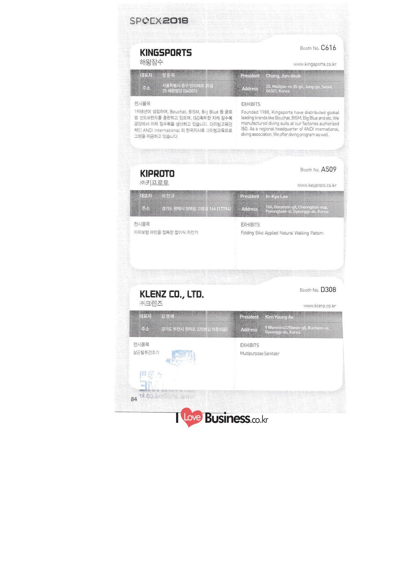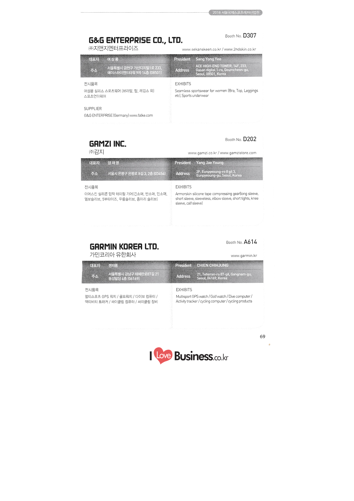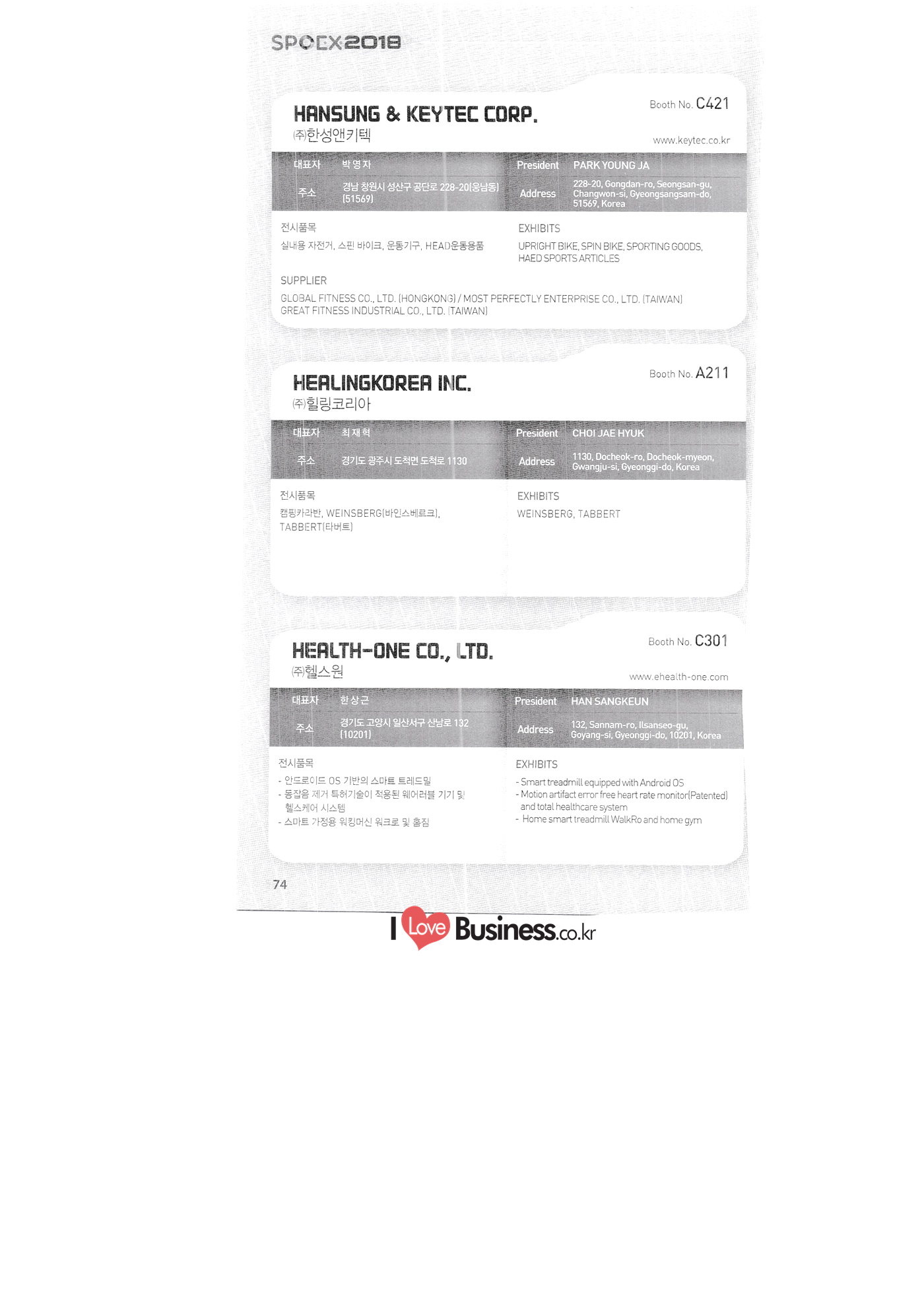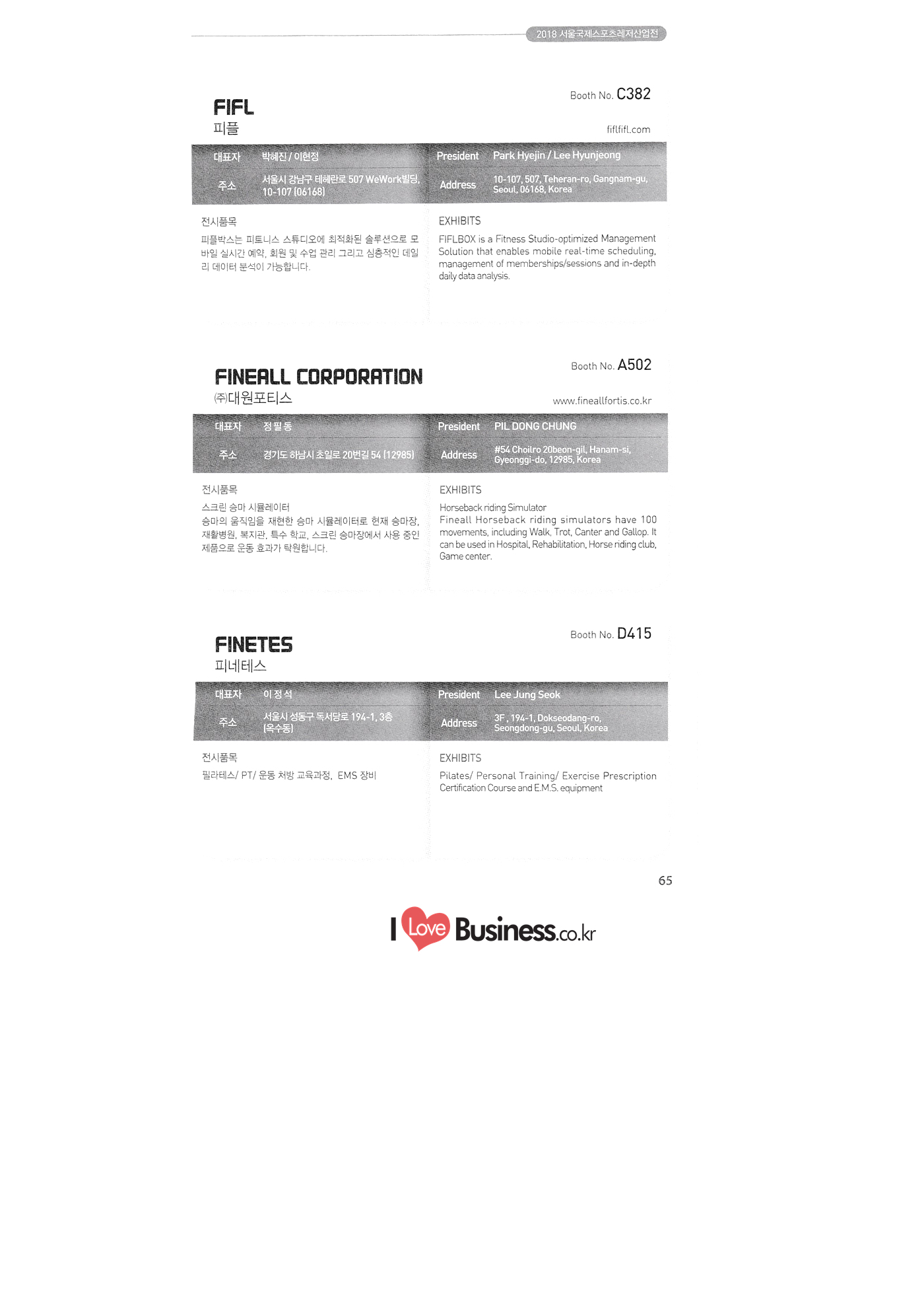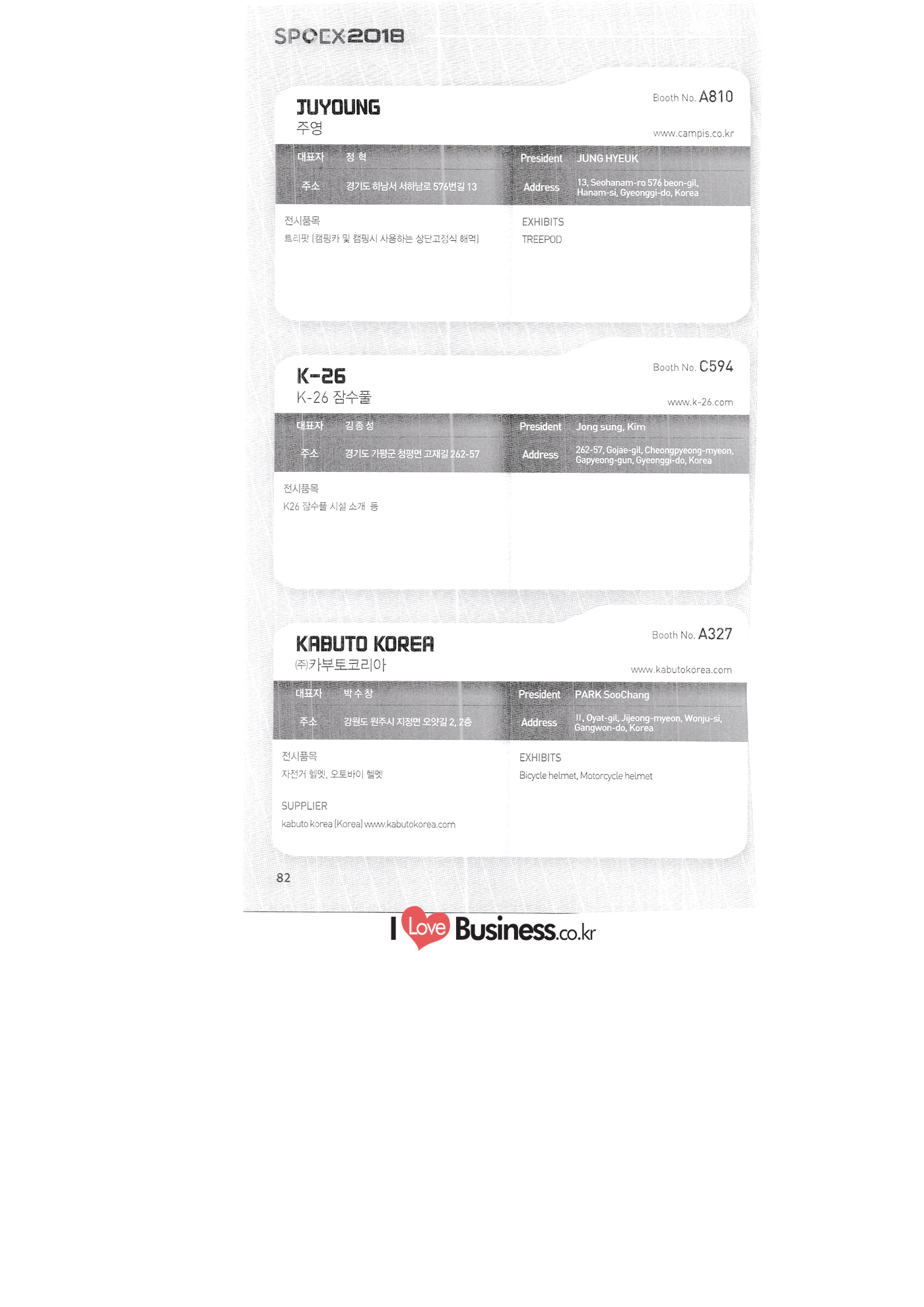 | SPOEX 2018 국문업체명 페이지 부스번호 영문업체명 HALLA A221 A231 A246 A101 CARSOUND IN CAMPING A102 MARINELAND, LTD. A111 TNCKOREA A202 - NANUX NETWORKS INC. A211 | HEALINGKOREA INC. SUNGWOO MOTORS A222. WHITE HOUSE KOREA A226 FAMILYCARAVAN W CARAVAN A241 STARCARAVAN A242 EUNHA MOBILE WOORICAMPING A250 1 HIGHEND CAMPINGCAR A302 1 URBAN VELO PROJECT A310 Z.T COMPANY A314 3SIXTY KOREA A316 1 GCT INTERNATIONAL CO., LTD. A323 1 CAMPERBOX, INC. A325 1 RECON HI-TECH BIKE COMPANY A327 1 KABUTO KOREA A345 ETRION CO., LTD. A402 WIAWIS(WIN&WIN CO., LTD. A409 VERTEXKOREA CO., LTD. A4.13 VKOOL SUNGLASSES A415 SANBADA SPORTS.CO.,LTD A417 CAMPING NADRI A419 D&F KOREA A420 1 RAON GLOBAL A426 1 YOONSUNG F&B CO., LTD. A436 TINNOVATION A442 | COOLRUNBIKE CO., LTD. A443 1 YB COMPANY A502 1 FINEALL CORPORATION 카사운드인캠핑 마린랜드(주) 티앤씨코리아 (주)나눅스네트웍스 (주)힐링코리아 (주성우모터스 (주)화이트하우스코리아 패밀리카라반 더블유카라반 스타카라반 은하모빌 우리캠핑 하이엔드캠핑카 어반벨로프로젝트 지티컴퍼니 쓰리식스티 코리아 주지씨티인터내셔날 (주캠퍼박스 리콘하이테크 주카부토코리아 (주)이트라이언 위아위스(윈엔윈(주) (주)버텍스코리아 브이쿨 선글라스 (주산바다스포츠 캠핑나들이 디앤에프 코리아 라온글로벌 (주윤성에프앤비 (주아이이노베이션 (주쿨런바이크 와이비컴퍼니 (주)대원포티스 18 '부스별 업체명 / Exhibitors by Booth No. | | A505 LYCLE 라이클 A506 1 DR.MAHN COFFEE INC. (주)닥터만커피 A509 KIPROTO (주)키프로토 A510 | KCM CO., LTD. ((주)케이씨엠 A514 | POWERTECTOR (주신일스포츠 (파워텍터 A517 1 OKINAWA CONVENTION & VISITORS BUREAU 오키나와 관광컨벤션뷰로 A518 WITHYOUBIKE CO., LTD. (주)위드유바이크 A521 SMARTGUY CO., LTD. (주)스마트가이 A522) DONGYANG NETWORKS 동양네트웍스 A526. SHINTS-NSR RIDING (주)신티에스-NSR RIDING | A536 1 ECOCNT (주)에코씨엔티 A536 1 DTI INTERNATION CO., LTD. (주)디티아이인터네셔널 A537 WITHUS&EARTH CO., LTD. (주)위드어스 A542 T&P NETWORK (주)티엔피네트워크 A601 IGUANA KOREA CO., LTD. (주)이구아나코리아 A602 PREMIER MOTORS 프리미어모터스 A609 1 MINELAB ELECTRONICS MINELAB ELECTRONICS A610 OLLE CAMP 올레캠프 A614 GARMIN KOREA LTD. 가민코리아 유한회사 A615 1 CAMPINGTIME 캠핑타임 A617 H-INTERNATIONAL 에이치인터네셔널 A619 ARX INC. ARX INC. A619 EMBASSY OF THE KINGDOM OF THE NETHERLANDS 주한 네덜란드 대사관 A620 1 CHALLENGEKOREA.CO (주챌린지코리아 A621 1 ROSSA SPORTS,.LTD 로사스포츠 A622 SEESUN CO.,LTD (주)시선 A626 SKYNURI (주)하늘누리(하늘누리항공) TANNUS (주타누스 A628 1 TOPEND CO., LTD. (주탑엔드 A633 | SPOHUB CO., LTD. (주스포허브 A634 RPACK.COM INC. (주알팩닷컴 A637 1 CUFIT INC. (주쿠핏 A639 THE BIKE 더바이크 A642 TIME E&C CO., LTD. (주)타임이엔씨 A643 MPOWERD KOREA A702 WOOSUNG I.B. CO., LTD. A714 SUPBOY A720 AIR-FORCE A724 CORINTO A726 COOL WARM A732 MAGMA HOLDS A733 VITATRADE A735 3IP HANGUNG CO., LTD. A736 | ONCO A738 | SOLAR PARTS KOREA A739 ACTIVELIFE A802 SAGAINTERNATIONAL A810 JUYOUNG A813 JETWAKE CO., LTD. A814 CERROTORRE CO., LTD. A902 AIR BOX CO., LTD. A905 MATRO CO., LTD. A910 MAN & MOUNTAIN A914 VOULEZ-VOUS A916 MED OUTDOOR CORPORATION A920 KUMKANG INDUSTRY A921 1 VULEVU TRADE CO., LTD. FUKUSHIMA PREFECTURE TOURISM & LOCAL PRODUCTS ASSOCIATION A923 AAEBON CO., LTD. A926 1 URSAFE A927 1 MICHELIN SPORTS CO. A928 1 ANGEL BOOMERANG 엠파워드 코리아 (주우성아이비 썹보이(서정상사) 에어포스 (주코린토 쿨웜 마그마홀드 비타트레이드 (주)한궁세계화연구소 온코 솔라파츠 코리아 (주)액티브라이프 사가인터내셔널 주영 (주제트웨이크 (주)쎄로또레 주에어박스 (주매트로 도서출판 사람과산 주불레부 (주메드아웃도어 금강산업 불레부통상 후쿠시마현관광물산교류협회 A922 (주)에반 유어세이프 미쉐린스포츠 천사부메랑 HALLB B101 B102 1 B120 BLUEBIRD ENTERPRISE, INC. CARAVANTAIL & WINNEBAGO VANRECH D&C CO., LTD. (주블루버드엔터프라이즈 카라반테일&위네바고 (주밴텍디엔씨 '부스별 업체명 / Exhibitors by Booth No. 부스번호 영문업체명 국문업체명 페이지 이 - B124 B125 B127 B133 B136 BUFFALO AUTOHOMES CARAVAN CLUB KOREA DUOTOP DELTALINK ASIA CO., LTD. | WOHNMOBIL ARIAMOBILE CORPORATION UNION RV 버팔로 오토홈스 카라반클럽코리아 듀오탑 (주)델타링크아시아 본모빌 캠핑카 (주)아리아모빌 유니온RV 에이스캠퍼 (주)에어밴 팀오토 주제일모빌 (주동일이앤시 (주코리아테크 한국레저자동차산업협회 B143 B202 B221 B240 B301 B314. ACECAMPER AIRVAN TEAMAUTO CHEILMOBILE DONG IL ENC CO., LTD. KOREATECH CO., LTD. KOREA RECREATIONAL VEHICLE INDUSTRY ASSOCIATION SC MEDIA CO., LTD. KTOTO WOHNWAGEN KOREA B315 B315 B316 B321 에스씨미디어(주) (주)케이토토 본바겐코리아 와이제이캠핑카 (주)써밋캠핑카라반 다온티앤티 B322 YJ RV B331 | SUMMIT C&C CO., LTD. B341 DAONTNT 고 스몰미 Small ME WWW.Smallme.co.kr SPOEX 2018 HALLC 하스피 주디랙스 (주렉스코 (주동아스포츠 (주)헬스원 태하메카트로닉스(주) CHOIBOKO 이-런휠 주)에이치엔) 엑스펀 펀키 거인커뮤니케이션즈 효일씨티에이 제이제이피 주루텍 주원소프트다임 세영정보통신(주) C151 | HOSPI C201 1 DRAX INC. C231 1 LEXCO CO., LTD. C271 DONG A SPORTS CO., LTD. C301 1 HEALTH-ONE CO., LTD. C331 TAEHA MECHATRONICS CO., LTD. C371 | CHOIBOKO C371 E-RUN WHEEL (H&E CO., LTD.) C371 1 EXFUN C371 1 FUNKEY C371 GUIN COMMUNICATIONS C3711 HYOILCTA C371 JJP C3711 LUU TECH CO., LTD. C371 ONESOFTDIGM. CO., LTD. C371 0 SEYOUNG INFORMATION & TELECOMMUNICATION CO., LTD. C371 SHOW INDOORSPORTS C371 202B