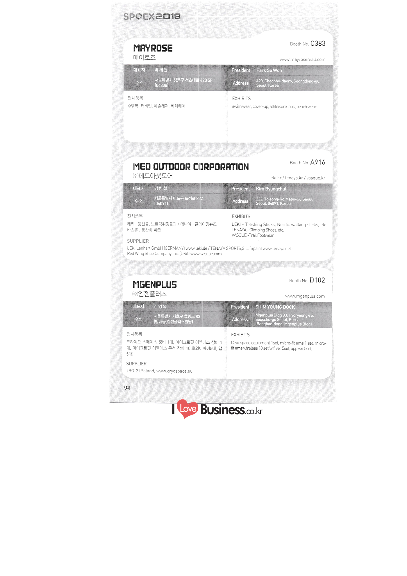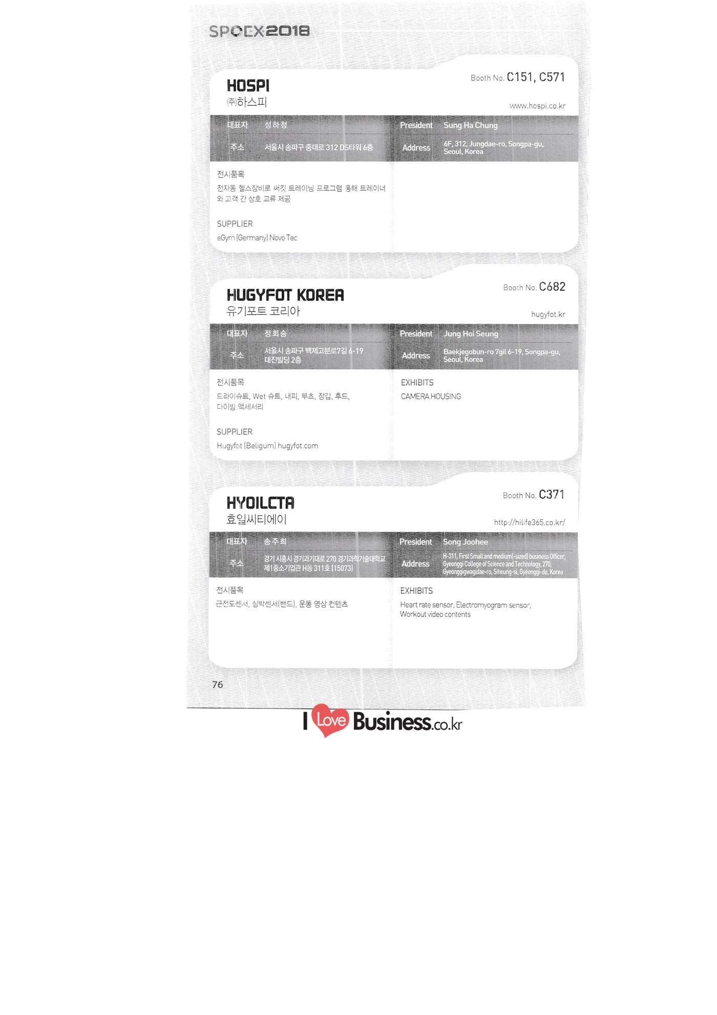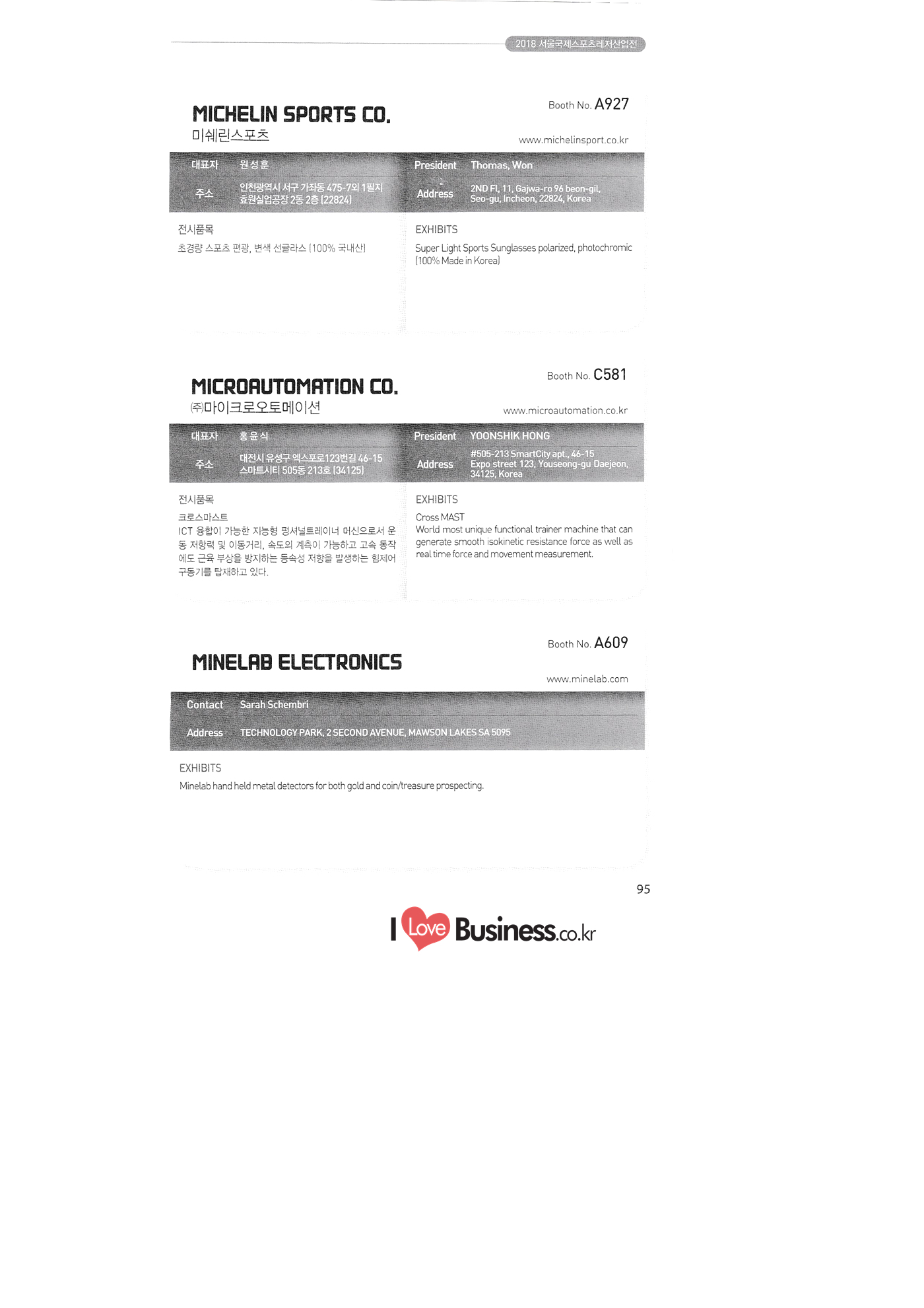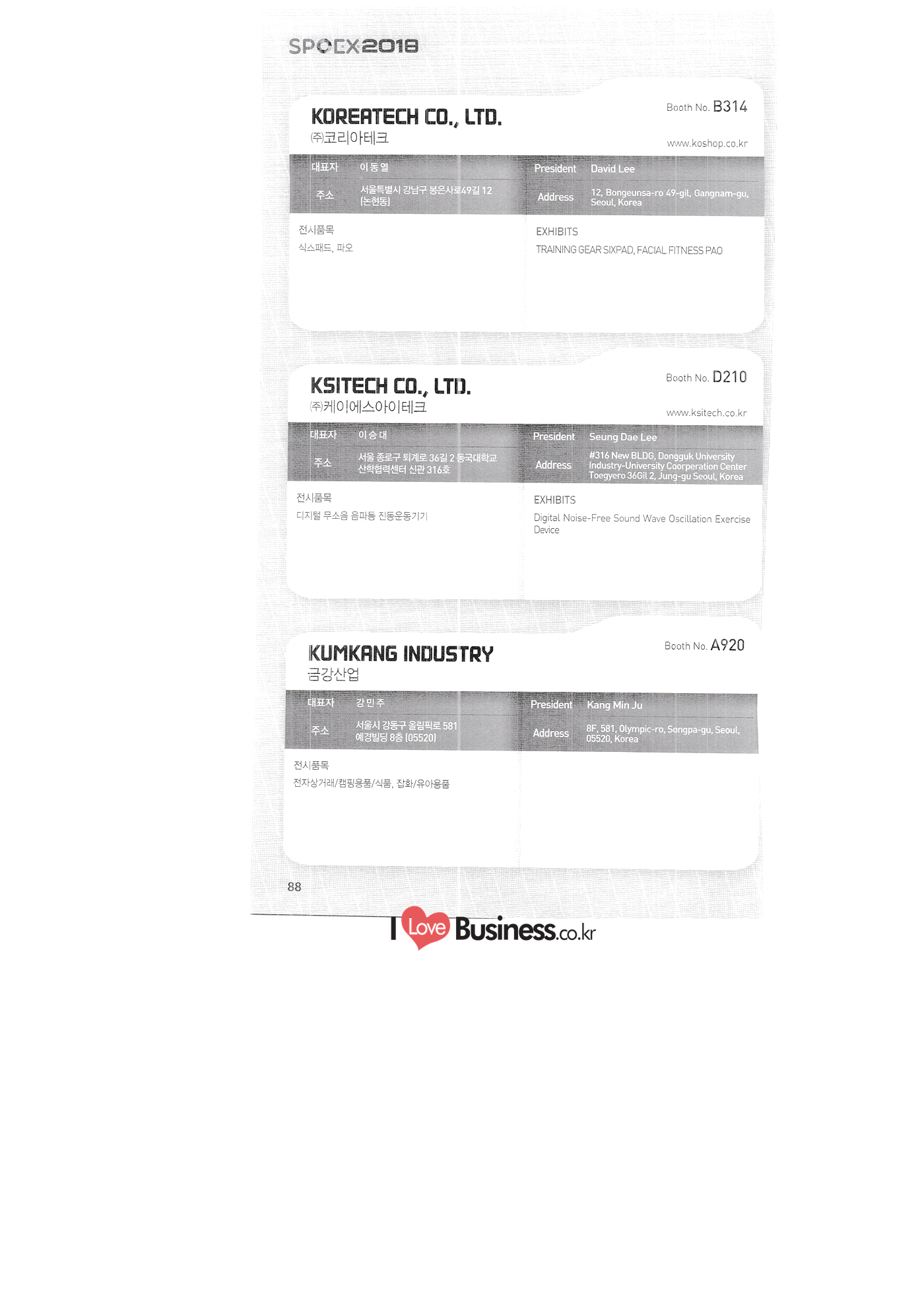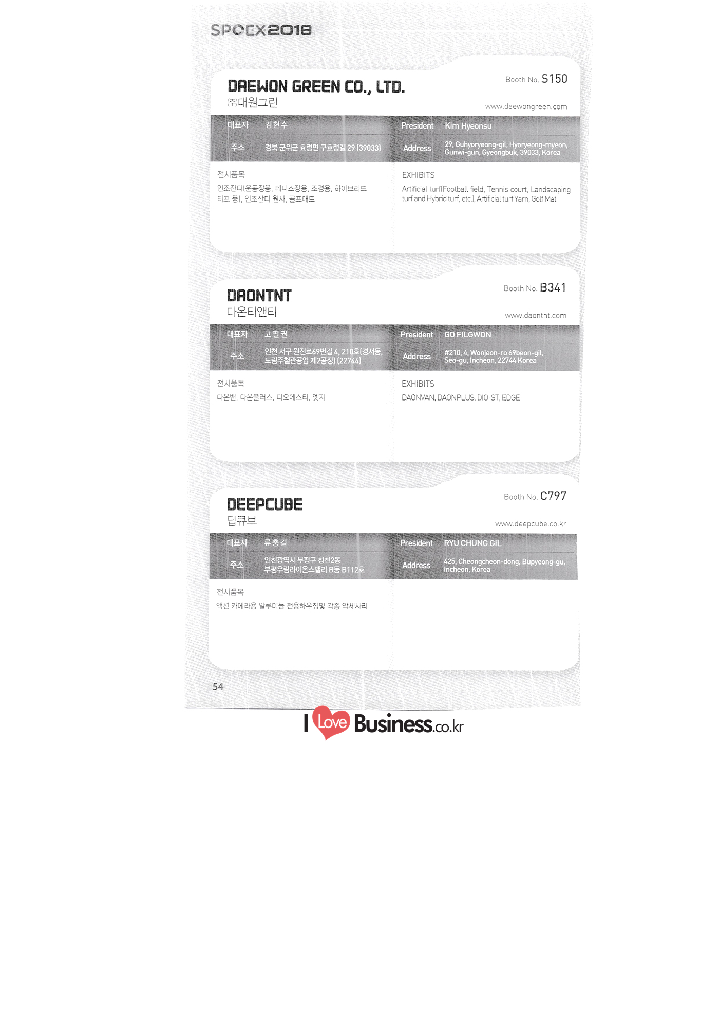 | SPOEX 2018 국문업체명 페이지 부스번호 영문업체명 HALLA A221 A231 A246 A101 CARSOUND IN CAMPING A102 MARINELAND, LTD. A111 TNCKOREA A202 - NANUX NETWORKS INC. A211 | HEALINGKOREA INC. SUNGWOO MOTORS A222. WHITE HOUSE KOREA A226 FAMILYCARAVAN W CARAVAN A241 STARCARAVAN A242 EUNHA MOBILE WOORICAMPING A250 1 HIGHEND CAMPINGCAR A302 1 URBAN VELO PROJECT A310 Z.T COMPANY A314 3SIXTY KOREA A316 1 GCT INTERNATIONAL CO., LTD. A323 1 CAMPERBOX, INC. A325 1 RECON HI-TECH BIKE COMPANY A327 1 KABUTO KOREA A345 ETRION CO., LTD. A402 WIAWIS(WIN&WIN CO., LTD. A409 VERTEXKOREA CO., LTD. A4.13 VKOOL SUNGLASSES A415 SANBADA SPORTS.CO.,LTD A417 CAMPING NADRI A419 D&F KOREA A420 1 RAON GLOBAL A426 1 YOONSUNG F&B CO., LTD. A436 TINNOVATION A442 | COOLRUNBIKE CO., LTD. A443 1 YB COMPANY A502 1 FINEALL CORPORATION 카사운드인캠핑 마린랜드(주) 티앤씨코리아 (주)나눅스네트웍스 (주)힐링코리아 (주성우모터스 (주)화이트하우스코리아 패밀리카라반 더블유카라반 스타카라반 은하모빌 우리캠핑 하이엔드캠핑카 어반벨로프로젝트 지티컴퍼니 쓰리식스티 코리아 주지씨티인터내셔날 (주캠퍼박스 리콘하이테크 주카부토코리아 (주)이트라이언 위아위스(윈엔윈(주) (주)버텍스코리아 브이쿨 선글라스 (주산바다스포츠 캠핑나들이 디앤에프 코리아 라온글로벌 (주윤성에프앤비 (주아이이노베이션 (주쿨런바이크 와이비컴퍼니 (주)대원포티스 18 '부스별 업체명 / Exhibitors by Booth No. | | A505 LYCLE 라이클 A506 1 DR.MAHN COFFEE INC. (주)닥터만커피 A509 KIPROTO (주)키프로토 A510 | KCM CO., LTD. ((주)케이씨엠 A514 | POWERTECTOR (주신일스포츠 (파워텍터 A517 1 OKINAWA CONVENTION & VISITORS BUREAU 오키나와 관광컨벤션뷰로 A518 WITHYOUBIKE CO., LTD. (주)위드유바이크 A521 SMARTGUY CO., LTD. (주)스마트가이 A522) DONGYANG NETWORKS 동양네트웍스 A526. SHINTS-NSR RIDING (주)신티에스-NSR RIDING | A536 1 ECOCNT (주)에코씨엔티 A536 1 DTI INTERNATION CO., LTD. (주)디티아이인터네셔널 A537 WITHUS&EARTH CO., LTD. (주)위드어스 A542 T&P NETWORK (주)티엔피네트워크 A601 IGUANA KOREA CO., LTD. (주)이구아나코리아 A602 PREMIER MOTORS 프리미어모터스 A609 1 MINELAB ELECTRONICS MINELAB ELECTRONICS A610 OLLE CAMP 올레캠프 A614 GARMIN KOREA LTD. 가민코리아 유한회사 A615 1 CAMPINGTIME 캠핑타임 A617 H-INTERNATIONAL 에이치인터네셔널 A619 ARX INC. ARX INC. A619 EMBASSY OF THE KINGDOM OF THE NETHERLANDS 주한 네덜란드 대사관 A620 1 CHALLENGEKOREA.CO (주챌린지코리아 A621 1 ROSSA SPORTS,.LTD 로사스포츠 A622 SEESUN CO.,LTD (주)시선 A626 SKYNURI (주)하늘누리(하늘누리항공) TANNUS (주타누스 A628 1 TOPEND CO., LTD. (주탑엔드 A633 | SPOHUB CO., LTD. (주스포허브 A634 RPACK.COM INC. (주알팩닷컴 A637 1 CUFIT INC. (주쿠핏 A639 THE BIKE 더바이크 A642 TIME E&C CO., LTD. (주)타임이엔씨 A643 MPOWERD KOREA A702 WOOSUNG I.B. CO., LTD. A714 SUPBOY A720 AIR-FORCE A724 CORINTO A726 COOL WARM A732 MAGMA HOLDS A733 VITATRADE A735 3IP HANGUNG CO., LTD. A736 | ONCO A738 | SOLAR PARTS KOREA A739 ACTIVELIFE A802 SAGAINTERNATIONAL A810 JUYOUNG A813 JETWAKE CO., LTD. A814 CERROTORRE CO., LTD. A902 AIR BOX CO., LTD. A905 MATRO CO., LTD. A910 MAN & MOUNTAIN A914 VOULEZ-VOUS A916 MED OUTDOOR CORPORATION A920 KUMKANG INDUSTRY A921 1 VULEVU TRADE CO., LTD. FUKUSHIMA PREFECTURE TOURISM & LOCAL PRODUCTS ASSOCIATION A923 AAEBON CO., LTD. A926 1 URSAFE A927 1 MICHELIN SPORTS CO. A928 1 ANGEL BOOMERANG 엠파워드 코리아 (주우성아이비 썹보이(서정상사) 에어포스 (주코린토 쿨웜 마그마홀드 비타트레이드 (주)한궁세계화연구소 온코 솔라파츠 코리아 (주)액티브라이프 사가인터내셔널 주영 (주제트웨이크 (주)쎄로또레 주에어박스 (주매트로 도서출판 사람과산 주불레부 (주메드아웃도어 금강산업 불레부통상 후쿠시마현관광물산교류협회 A922 (주)에반 유어세이프 미쉐린스포츠 천사부메랑 HALLB B101 B102 1 B120 BLUEBIRD ENTERPRISE, INC. CARAVANTAIL & WINNEBAGO VANRECH D&C CO., LTD. (주블루버드엔터프라이즈 카라반테일&위네바고 (주밴텍디엔씨 '부스별 업체명 / Exhibitors by Booth No. 부스번호 영문업체명 국문업체명 페이지 이 - B124 B125 B127 B133 B136 BUFFALO AUTOHOMES CARAVAN CLUB KOREA DUOTOP DELTALINK ASIA CO., LTD. | WOHNMOBIL ARIAMOBILE CORPORATION UNION RV 버팔로 오토홈스 카라반클럽코리아 듀오탑 (주)델타링크아시아 본모빌 캠핑카 (주)아리아모빌 유니온RV 에이스캠퍼 (주)에어밴 팀오토 주제일모빌 (주동일이앤시 (주코리아테크 한국레저자동차산업협회 B143 B202 B221 B240 B301 B314. ACECAMPER AIRVAN TEAMAUTO CHEILMOBILE DONG IL ENC CO., LTD. KOREATECH CO., LTD. KOREA RECREATIONAL VEHICLE INDUSTRY ASSOCIATION SC MEDIA CO., LTD. KTOTO WOHNWAGEN KOREA B315 B315 B316 B321 에스씨미디어(주) (주)케이토토 본바겐코리아 와이제이캠핑카 (주)써밋캠핑카라반 다온티앤티 B322 YJ RV B331 | SUMMIT C&C CO., LTD. B341 DAONTNT 고 스몰미 Small ME WWW.Smallme.co.kr SPOEX 2018 HALLC 하스피 주디랙스 (주렉스코 (주동아스포츠 (주)헬스원 태하메카트로닉스(주) CHOIBOKO 이-런휠 주)에이치엔) 엑스펀 펀키 거인커뮤니케이션즈 효일씨티에이 제이제이피 주루텍 주원소프트다임 세영정보통신(주) C151 | HOSPI C201 1 DRAX INC. C231 1 LEXCO CO., LTD. C271 DONG A SPORTS CO., LTD. C301 1 HEALTH-ONE CO., LTD. C331 TAEHA MECHATRONICS CO., LTD. C371 | CHOIBOKO C371 E-RUN WHEEL (H&E CO., LTD.) C371 1 EXFUN C371 1 FUNKEY C371 GUIN COMMUNICATIONS C3711 HYOILCTA C371 JJP C3711 LUU TECH CO., LTD. C371 ONESOFTDIGM. CO., LTD. C371 0 SEYOUNG INFORMATION & TELECOMMUNICATION CO., LTD. C371 SHOW INDOORSPORTS C371 202B