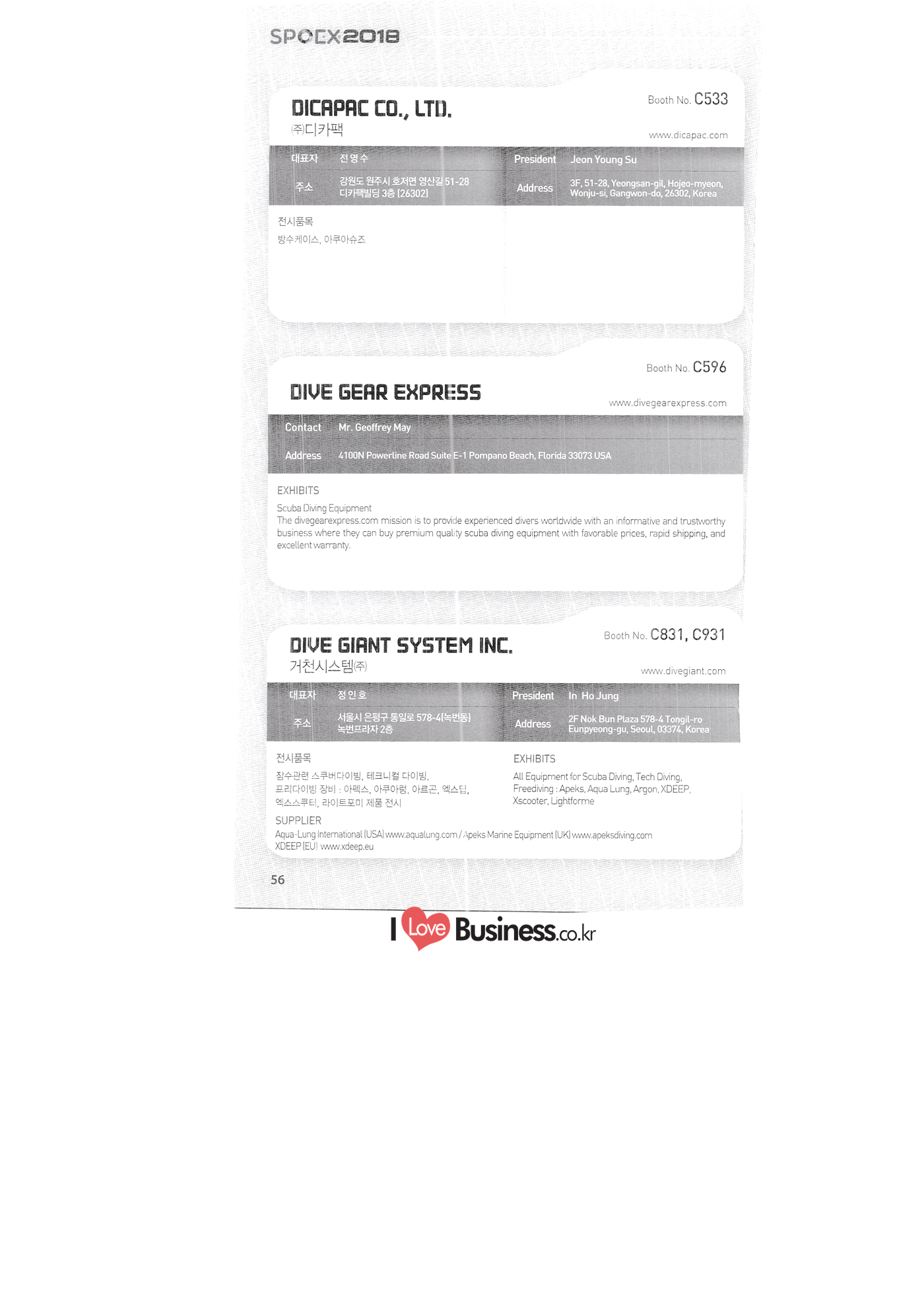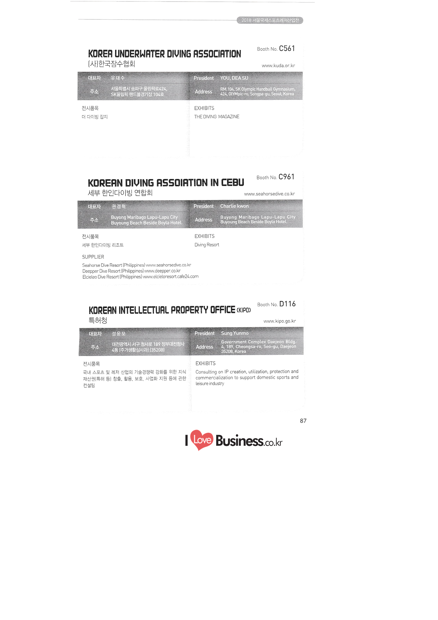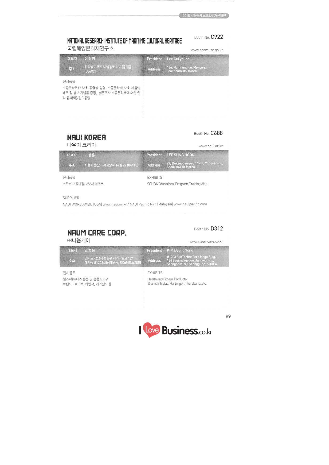C631 OCEAN CHALLENGER COMPANY (O.C.C) C631 | | WOOJUNGSA CO., LTD. C646 SSIKOREA C676 MARES KOREA C682 1 FOURTHELEMENT KOREA C682 HUGYFOT KOREA PONGDANG.COM C688 NAUI KOREA C695 DONGJIN ENGINEERING TRITON HI-TECH C697 1 UW MAGAZINE C701 PADI ASIA PACIFIC-AQUASCUBA C7011 PADI ASIA PACIFIC-BARAMSORI C701 1 PADI ASIA PACIFIC-DIVE TREE C701 1 PADI ASIA PACIFIC-DOLPINO DIVER'S C701 PADI ASIA PACIFIC-GO DIVING C701 1 PADI ASIA PACIFIC-GOPRODIVE C701 PADI ASIA PACIFIC-HAEJEO 2 MANLI C701 PADI ASIA PACIFIC-JAMSIL SCUBA SCHOOL C701 PADI ASIA PACIFIC-JOY DIVE C701 PADI ASIA PACIFIC-K-26 C701 PADI ASIA PACIFIC-LEAD MARINE C701 PADI ASIA PACIFIC-MARINE PARK C701 PADI ASIA PACIFIC-MDI C701 PADI ASIA PACIFIC-NBDIVERS C701 PADI ASIA PACIFIC-NEMOVIVA PADI ASIA PACIFIC-OCEANPLAYER DIVE C701 PADI ASIA PACIFIC-OCEANTREE C701 PADI ASIA PACIFIC-PARANBADA DIVECENTER 오션챌린져 [오씨씨) (주우정사 에스에스아이코리아 마레스코리아 포스엘리먼트 코리아 유기포트 코리아 퐁당닷컴 나우이 코리아 동진종합기계 트라이톤 하이텍 수중세계 138 패디 아시아 퍼시픽-아쿠아스쿠바 103 패디 아시아 퍼시픽-바람소리 104 패디 아시아 퍼시픽 -다이브트리 104 패디 아시아 퍼시픽 돌피노다이버스 104 패디 아시아 퍼시픽 고 다이빙 105 패디 아시아 퍼시픽 고프로다이브 105 패디 아시아 퍼시픽 해저2만리 105 패디 아시아 퍼시픽 -잠실스쿠버스쿨 106 패디 아시아 퍼시픽 조이다이브 106 패디 아시아 퍼시픽-K-26 잠수풀 106 패디 아시아 퍼시픽-리드마린 107 패디 아시아퍼시픽 마린파크 107 패디 아시아 퍼시픽- 엠디아이 107 패디 아시아 퍼시픽 엔비다이버스 108 패디 아시아 퍼시픽 니모만세 108 패디 아시아 퍼시픽 오션플레이어 108 패디 아시아 퍼시픽-오션트리 109 패디 아시아 퍼시픽 | 109 - 파아란바다 PADI 다이브센타 패디 아시아 퍼시픽 109 -프로다이버스사이판 패디 아시아 퍼시픽 레드씨다이브팀 110 패디 아시아 퍼시픽 - 스쿠버블 다이브센터 | 부스별 업체명 / Exhibitors by Booth No. PADI ASIA PACIFIC-SEA SKY JEJU PADI ASIA PACIFIC-SKULDIVE&RESORT C701 PADI ASIA PACIFIC-YEGRINA SEOUL C731 1 INTEROCEAN CO., LTD. C761 INTEROCEAN CO., LTD. C776 1 HAESUNG INC. (SCUBAPRO KOREA) C786 JJWORKS SNSI KOREA SURFLO C797 DEEPCUBE C798 SCUBA DIVER IDEA-ASIA C801 1 SDI.TDI.ERDI C831 | DIVE GIANT SYSTEM INC. C846 TECKO. CO., LTD. C861 NASEKOREA SUWON CITY UNDERWATER SWIMMING ASSOCIATION C876 GEMMA TECHNICAL CO., LTD. C799 패디 아시아 퍼시픽 110 - 제주바다하늘 다이브센터 패디 아시아 퍼시픽 -스컬다이브&리조트 패디 아시아 퍼시픽-예그리나 서울 111 주인터오션 (주)인터오션 (7)āHAH (SCUBAPRO KOREA) 73 (주)제이제이웍스 국제잠수안전협회 서플로 딥큐브 격월간 스쿠바다이버 국제잠수교육자협회 아시아 본부 77 에스디아이티디아이이알디아이 121 거천시스템주) (주테코 네이스코리아 수원시 수중핀수영협회 (주)젬마테크니칼 유더블유티 아쿠아즈 유티디 코리아 (주)서브원 해저여행 (주)하이파 텍포유 스쿠버텍 더코 국립해양문화재연구소 C886 UWT C889 | AQUAZ CO.. C897 UTD KOREA C898 | SUBONE CO., LTD. C899 1 UNDERSEA TRAVEL C900 | HYPER INC. C901 11 TEK4U C916 1 SCUBATEC C920 DEOKO C922 NATIONAL RESEARCH INSTITUTE OF MARITIME CULTURAL HERITAGE C926 1 AQUATEK C931 1 DIVE GIANT SYSTEM INC. C934 | OCEANTAG C941 MSLCOMPRESSOR CO., LTD. C946 DIVE TRAVEL 아쿠아텍 거천시스템주 오션테그 (주)엠에스엘 콤프레서 다이브트래블 SPOCX2018 MOM 부스번호 영문업체명 C951 STAR SCUBA(S.E.1) C955 ND TEC. GLOBAL C961 KOREAN DIVING ASSOIATION IN CEBU C964 FREEDIVING STORE C966 ANJ COMPANY (AQUAMAN STORE) C976 | | A&G TECH CO., LTD. C977 DIVEMEMORY CORP. C977 GOOD DIVER C977 SEASAFARICRUISES WHYDIVE C980 INNOBEAM CORPORATION C981 | SCUBA ACADEMY C986 KOREA UNDERWATER ASSOCIATION CHAXTON KOREA C997 | FINISHLINE C998 AQUAMARINE 스타스쿠바(S.E.I] 엔디텍글로벌 세부 한인다이빙 연합회 프리다이빙 스토어 에이앤제이컴퍼니 (아쿠아맨 스토어) 38 (주)에이앤지테크 (주)다이브메모리 굿 다이버 씨사파리 리브어보드 와이다이브 (주이노 스쿠버아카데미 (사)대한수중 · 핀수영협회 첵스톤 코리아 주피니쉬라인 아쿠아마린 MGENPLUS (주)엠젠플러스 KOREAN INTELLECTUAL PROPERTY OFFICE (KIPO) 특허청 KOREA SPORTS SAFETY FOUNDATION (재스포츠안전재단 PUTTIST INC. ()퍼티스트 DTSINC CO., LTD. (주)디티에스아이엔씨 COMART SYSTEM CO., LTD. (주)컴아트시스템 GAMZI INC. 추감지 DR.REIZ 닥터레이즈 EAR HOLDINGS LTD. (주)이에이알홀딩스 KSITECH CO., LTD. (주)케이에스아이테크 NASARA 나사라 AJOOFOCUS CO., LTD. 아주포커스(주) AUZEN GLOBAL INC. 아우진글로벌 GN INTERNATIONAL 지엔 인터내셔널 LAIWU CITY TONGFENG TRADING CO., LTD. PHINETWORKS (주)파이네트웍스 REXY CO., LTD. (주)렉시 TEGOR KOREA 태거코리아 부스별 업체명 / Exhibitors by Booth No. COON 국문업체명 페이지 D312 D302 | BKM (주)비케이엠 D303 CHINA SPORT SHOW 차이나 스포츠 쇼 D304 SANWIN ENTERPRISES D307 | G&G ENTERPRISE CO., LTD. (주)지앤지엔터프라이즈 D308 KLENZ CO., LTD. (주)크렌즈 D311 | SNS CO., LTD. (주)에스앤에스 | NAUM CARE CORP. (주)나음케어 D313 REDBALANCE (FINE M.) 레드밸런스(파인엠) D319 1 SEODONG MEDICAL CO 서동메디칼 D321 SCANDIC INTERNATIONAL 스칸딕인터내셔널 D322 1 TS SPORTS LTD. 티에스 스포츠(주) D325 GOODGN CO., LTD. (주굿지앤 D327 PARK61 파크식스원 D328 FITTEC, CO. LTD 피트테크(주) D331 ANHUI SINOTRON SPORTS TECHNOLOGY CO., LTD. D333 1 BEIJING DA NI SPORTS EQUIPMENT CO., LTD. D350 ANSWER CO., LTD. (주앤서 D350 APPNORI INC. (주앱노리 D350 1 ASIA 
