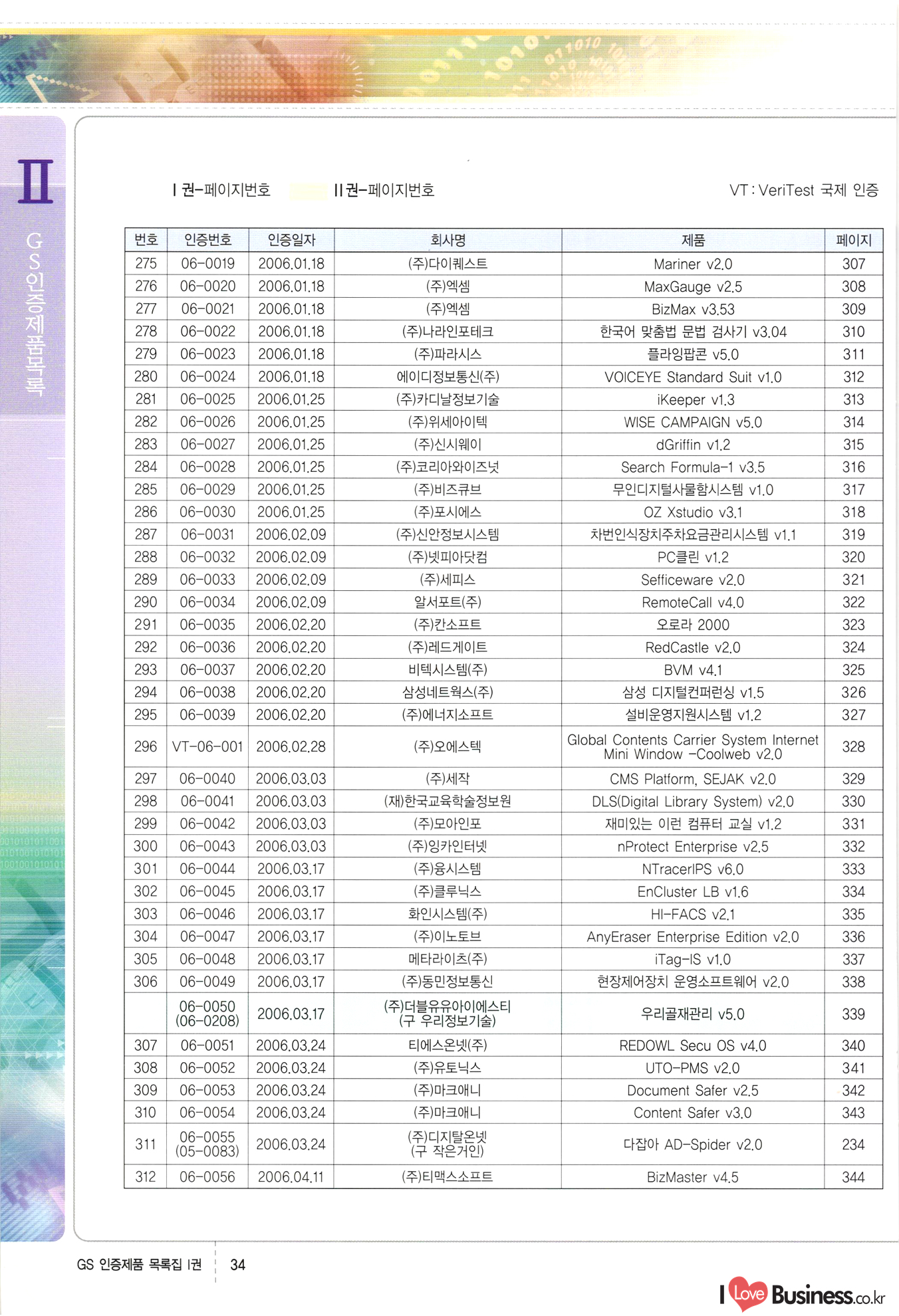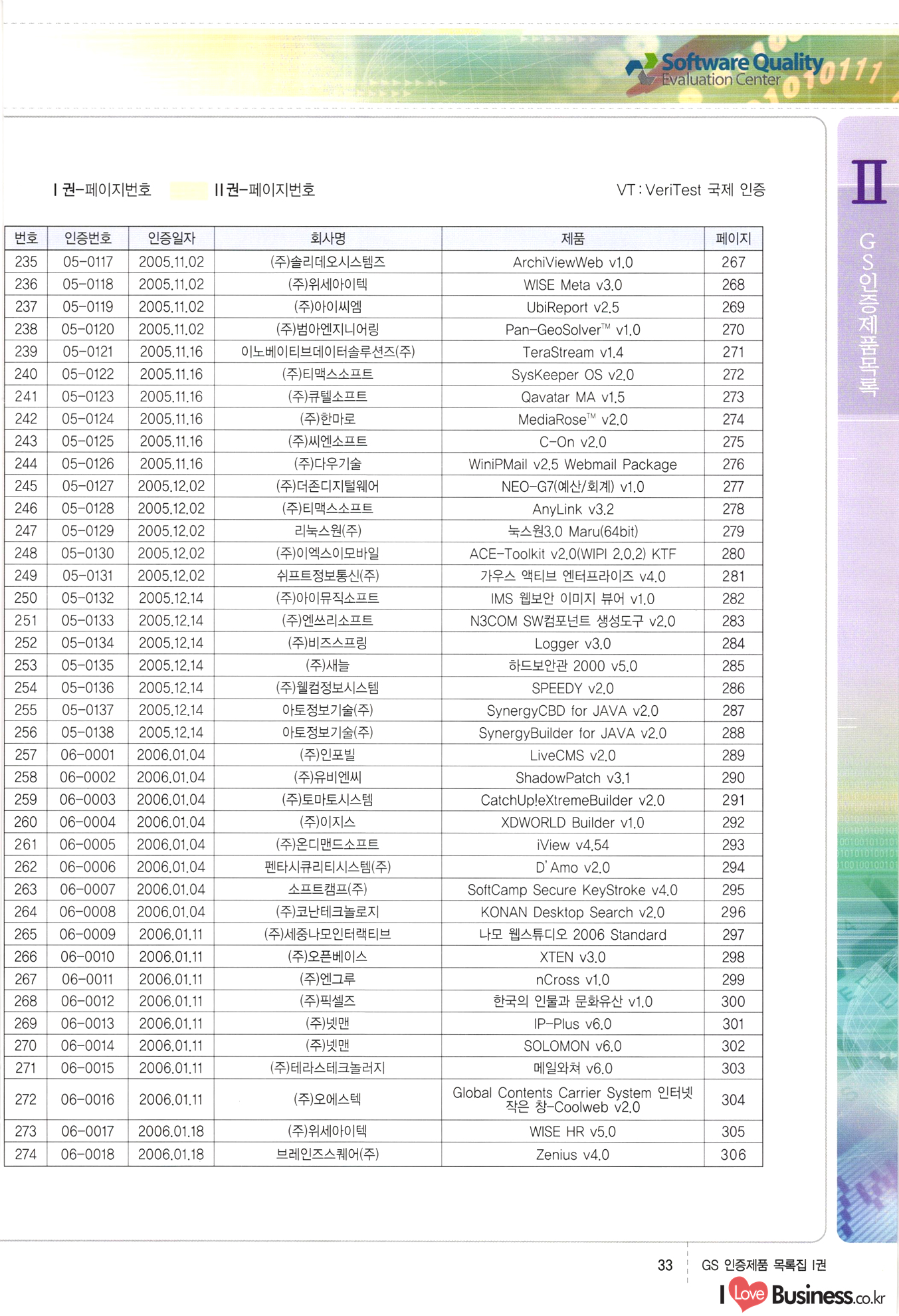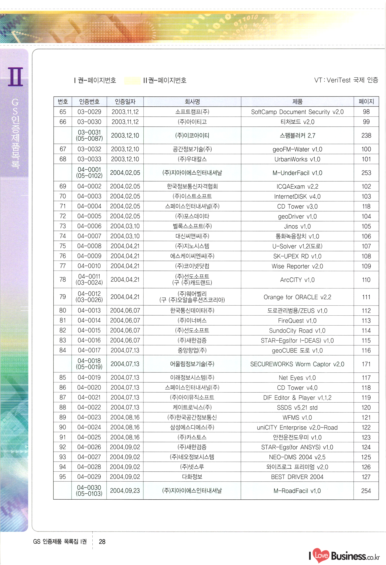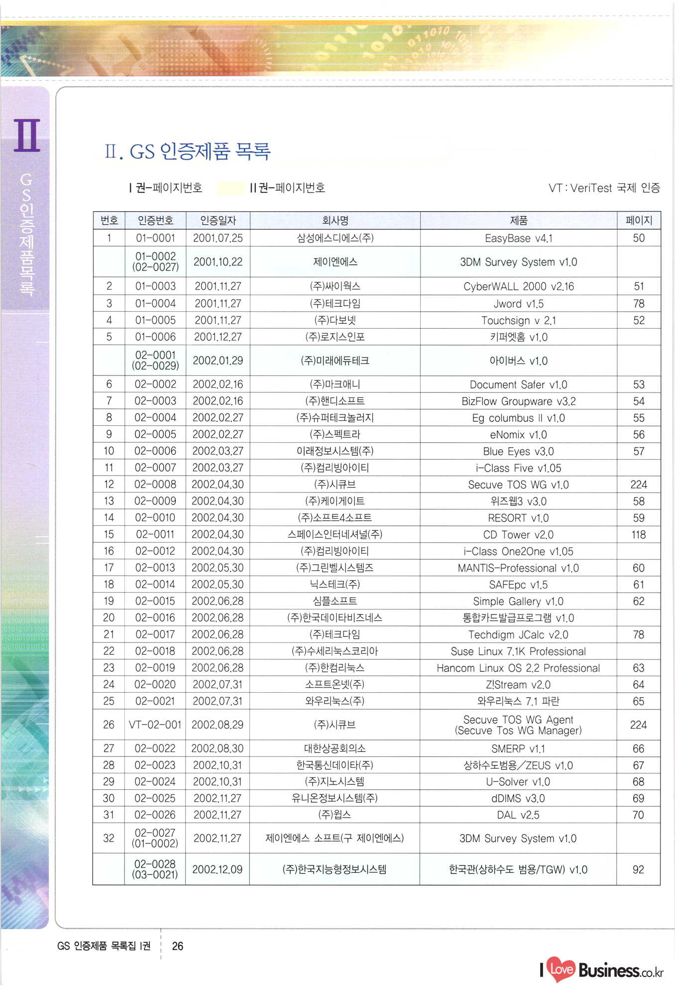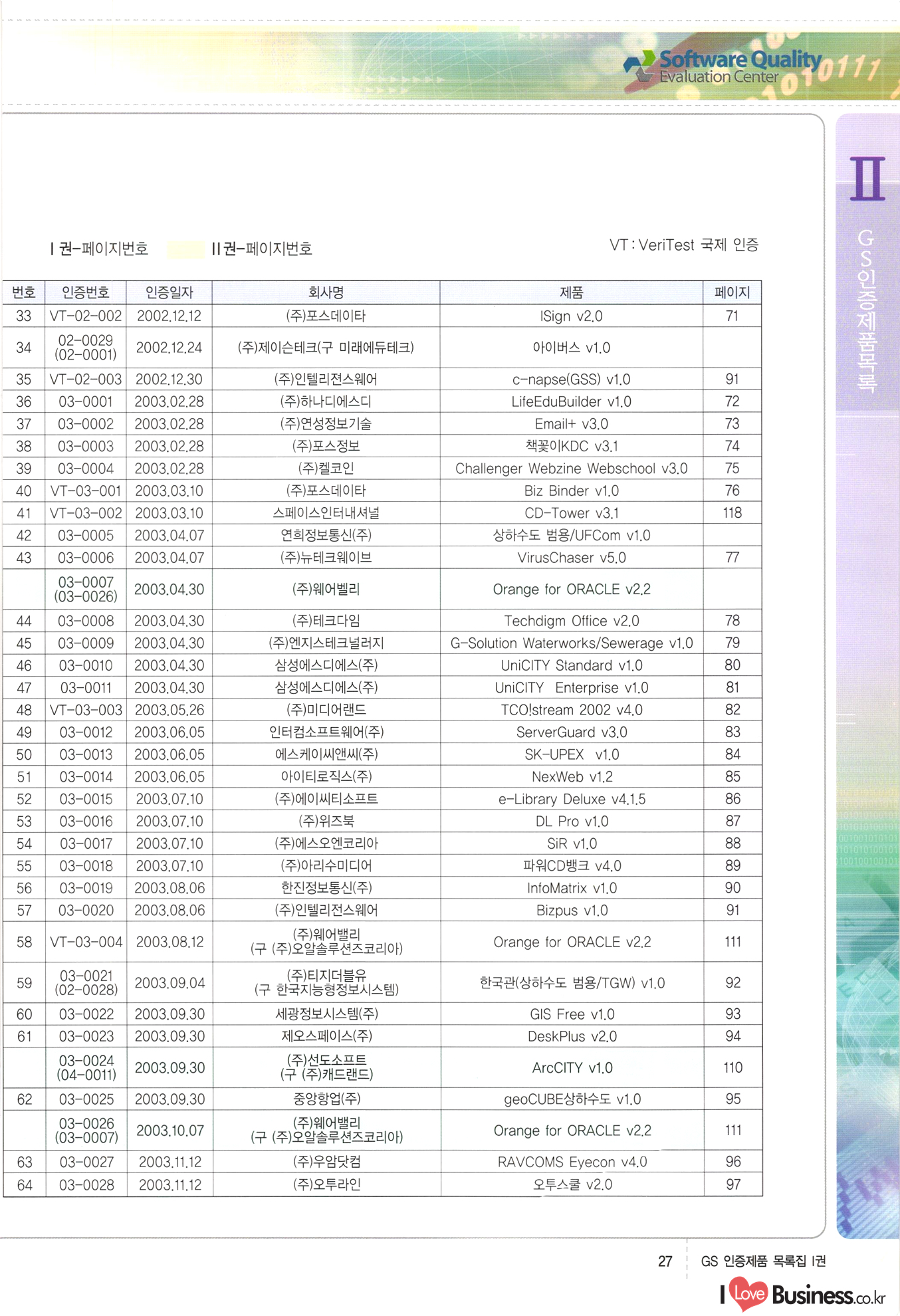 | III. GS 인증제품 목록 | 권-페이지번호 | 권-페이지번호 VT : VeriTest 국제 인증 GS인증제품목록 회사명 삼성에스디에스(주) 제품. EasyBase v4.1 페이지 50 1 제이엔에스 3DM Survey System v1.0 2 | 51 1 (주)싸이웍스 (주)테크다임 (주)다보넷 (주)로지스인포 CyberWALL 2000 v2.16 Jword v1.5 Touchsign v 2.1 키퍼엣홈 v1.0 78 52 (주)미래에듀테크 아이버스 v1.0 53 54 55 56 57 번호 | 인증번호 | 인증일자 01-0001 | 2001.07.25 101-0002 2001.10.22 (02-0027) | 01-0003 | 2001.11.27 | 01-0004 | 2001.11.27 | 01-0005 2001.11.27 5 | 01-0006 | 2001.12.27 02-0001 (02-0029) 2002.01.29 16 | | 02-0002 1 | 2002.02.16 | 02-0003 | 2002.02.16 02-0004 2002.02.27 9 | 02-0005 | 2002.02.27 110 | | 02-0006 | 2002.03.27 11 | || 02-0007 | 2002.03.27 | 02-0008 | 2002.04.30 | 02-0009 | 2002.04.30 | 02-0010 | 2002.04.30 15. | 02-0011 | 2002.04.30 16 102-0012 | 2002.04.30 | 17 | 02-0013 | 2002.05.30 | 18 | 02-0014 | 2002.05.30 | 02-0015 2002.06.28 | 20 | 02-0016 | 2002.06.28 02-0017 1 2002.06.28 | 02-0018 1 | 2002.06.28 23 | 02-0019 | 2002.06.28 24 02-0020 | 2002.07.31 25 | 02-0021 | 2002.07.31 224 58 14 59 118 (주)마크애니 (주)핸디소프트 (주)슈퍼테크놀러지 (주)스펙트라 이래정보시스템(주) (주)컴리빙아이티 | (주)시큐브 (주)케이게이트 (주)소프트4소프트 스페이스인터네셔널(주) (주)컴리빙아이티 (주)그린벨시스템즈 닉스테크(주) 심플소프트 (주)한국데이타비즈네스 (주)테크다임 (주)수세리눅스코리아 (주)한컴리눅스 소프트온넷(주) 와우리눅스(주) 60 61 Document Safer v1.0 | BizFlow Groupware v3.21 | Eg columbus || v1.0 | | eNomix v1.0 Blue Eyes v3.0 i-Class Five v1.05 Secuve TOS WG v1.0 위즈웹3 v3.0 RESORT v1.01 CD Tower v2.0 i-Class One2one v1.05 MANTIS-Professional v1.0 | | SAFEpc v1.5 Simple Gallery v1.00 통합카드발급프로그램 v1.0 Techdigm JCalc v2.0 Suse Linux 7.1K Professional Hancom Linux OS 2.2 Professional | Z!Stream v2.0 와우리눅스 7.1 파란 Secuve TOS WG Agent (Secuve Tos WG Manager) | SMERP v1.1 상하수도범용/ZEUS v1.0 U-Solver v1.0 dDIMS v3.0 DAL v2.5 101010101 1000 101003010101 190 1001010101 21 78. 122 | UL 63 64 65 26 | VT-02-001 | 2002.08.29 (주)시큐브 224 27 1 66 67 | 28 29 130 | 02-0022 | 2002.08.30 | 02-0023 | 2002.10.31 | 02-0024 | 2002.10.31 | 02-0025 | 2002.11.27 | 02-0026 | 2002.11.27 02-0027 (01-0002) 2002.11.27 | 02-0028 (03-0021) 2002.12.09 | 대한상공회의소 한국통신데이타(주) (주)지노시스템 유니온정보시스템(주) (주) 스 68 69 | 70 311 제이엔에스 소프트(구 제이엔에스) 3DM Survey System v1.0 (주)한국지능형정보시스템 한국관(상하수도 범용/TGW) v1.00 92 GS 인증제품 목록집 1권 | 26 I Love Business.co.kr Software Quality, 111 Evaluation Center | 권-페이지번호 II권페이지번호 VT : VeriTest 국제 인증 페이지 회사명 (주)포스데이타 제품 | iSign v2.0 | GS인증제품목록 171 | 34 | 02-0029 (주)제이슨테크(구 미래에듀테크) 아이버스 v1.0 91 72 73. 74 (주)인텔리젼스웨어 (주)하나디에스디 (주)연성정보기술 (주)포스정보 (주)켈코인 (주)포스데이타 스페이스인터내셔널 연희정보통신(주) (주)뉴테크웨이브 c-napse(GSS) v1.0 Life EduBuilder v1.0 | Email+ v3.0 1 책꽃이KDC v3.1 Challenger Webzine Webschool v3.0 1 Biz Binder v1.0 CD-Tower v3.1 상하수도 범용/UFCom v1.0 | | VirusChaser v5.0 | 175 76 118. (주)웨어벨리 Orange for ORACLE v2.2 | 번호 | 인증번호 | 인증일자 | 33 |VT-02-0022002.12.12 | | 2002.12.24 (02-0001) 35 | VT-02-003 | 2002.12.30 | 36 | 03-0001 | 2003.02.28 37. 03-0002 | 2003.02.28 | 38 | 03-0003 | 2003.02.28 | 39 | 03-0004 | 2003.02.28 40 | VT-03-001 | 2003.03.10 41 | VT-03-002) 2003.03.10 1 42 | 03-0005 | 2003.04.07 43 | 03-0006 | 2003.04.07 03-0007 2003.04.30 (03-0026) | 03-0008 | 2003.04.30 45 | 03-0009 | 2003.04.30 | 03-0010 | 2003.04.30 | 47 | 03-0011 | 2003.04.30 | 48 VT-03-003 2003.05.26 49 | 03-0012 | 2003.06.05 | 50 | 03-0013 | 2003.06.05 | 51 | 03-0014 | 2003.06.05 | 52 | 03-0015 | 2003.07.10 | 53 | 03-0016 | 2003.07.10 | 54 | 03-0017 | 2003.07.10 | | 55 | 03-0018 | 2003.07.10 | 56 | 03-0019 | 2003.08.06 57 | | 03-0020 | 2003.08.06 44 1 18 46 80 81 82 83 | (주)테크다임 (주)엔지스테크널러지 삼성에스디에스(주) 삼성에스디에스(주) (주)미디어랜드 인터컴소프트웨어(주) 에스케이씨앤씨(주) 아이티로직스(주) (주)에이씨티소프트 (주)위즈북 (주)에스오엔코리아 (주)아리수미디어 한진정보통신(주) (주)인텔리전스웨어 (주)웨어밸리 (구 (주)오알솔루션즈코리아) Techdigm Office v2.0 | G-Solution Waterworks/Sewerage v1.0 | | 79 UniCITY Standard v1.0 UniCITY Enterprise v1.0 TCO!stream 2002 v4.0 | ServerGuard v3.0 | SK-UPEX v1.0 84 NexWeb v1.2 e-Library Deluxe v4.1.5 86 DL Pro v1.0 SiR v1.01 파워CD뱅크 v4.0 89 InfoMatrix v1.00 190 Bizpus v1.0 91 85 87 88 10010010101.03 1101010100101 1100100100107 58 |VT-03-004 2003.08.12 Orange for ORACLE v2.2 | 111 59 (주)티지더블유 (구 한국지능형정보시스템) 한국관(상하수도 범용/TGW) v1.0 92 93 GIS Free v1.0 DeskPlus v2.0 1 | 94 ArcCITY v1.0 110 03-0021 (02-0028) | 2003.09.04 | 60 | 03-0022 | 2003.09.30 03-0023 | 2003.09.30 03-0024 (04-0011) | 2003.09.30 | 03-0025 | 2003.09.30 03-0026 (03-0007) | 2003.10.07 63 | 03-0027 | 2003.11.12 64 | 03-0028 | 2003.11.12 622 세광정보시스템(주) 제오스페이스(주) (주)선도소프트 (구 (주)캐드랜드) 중앙항업(주) (주)웨어밸리 (구 (주)오알솔루션즈코리아) (주)우암닷컴 (주)오투라인 geoCUBE상하수도 v1.0 95 Orange for ORACLE V2.2 111 96 RAVCOMS Eyecon v4.0 오투스쿨 v2.01 97 GS 인증제품 목록집 1권 I Love Business.co.kr | 권-페이지번호 | 권 - 페이지번호 VT : VeriTest 국제 인증 번호 페이지 회사명 소프트캠프