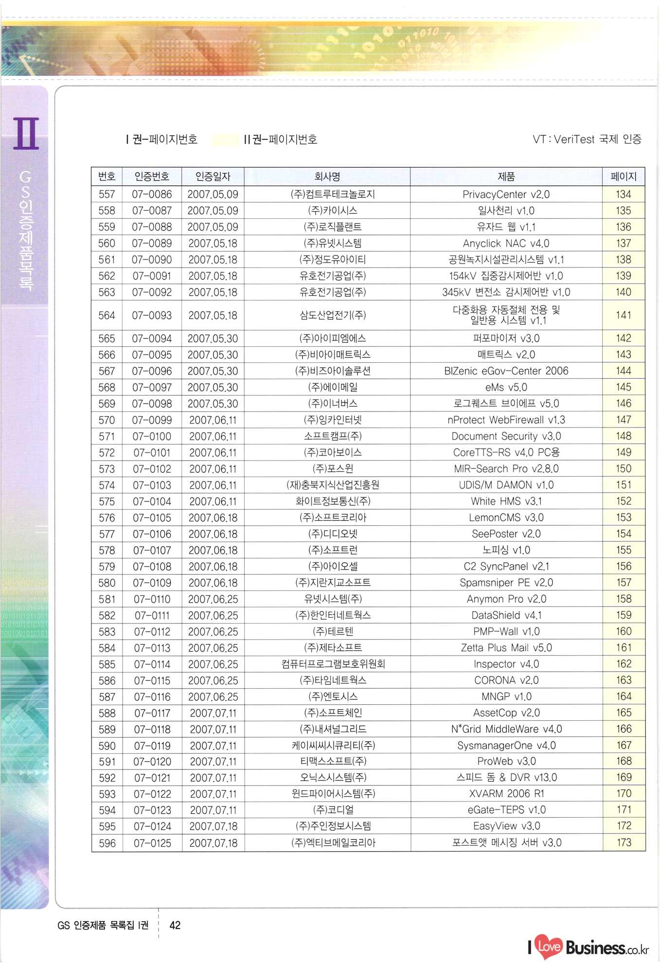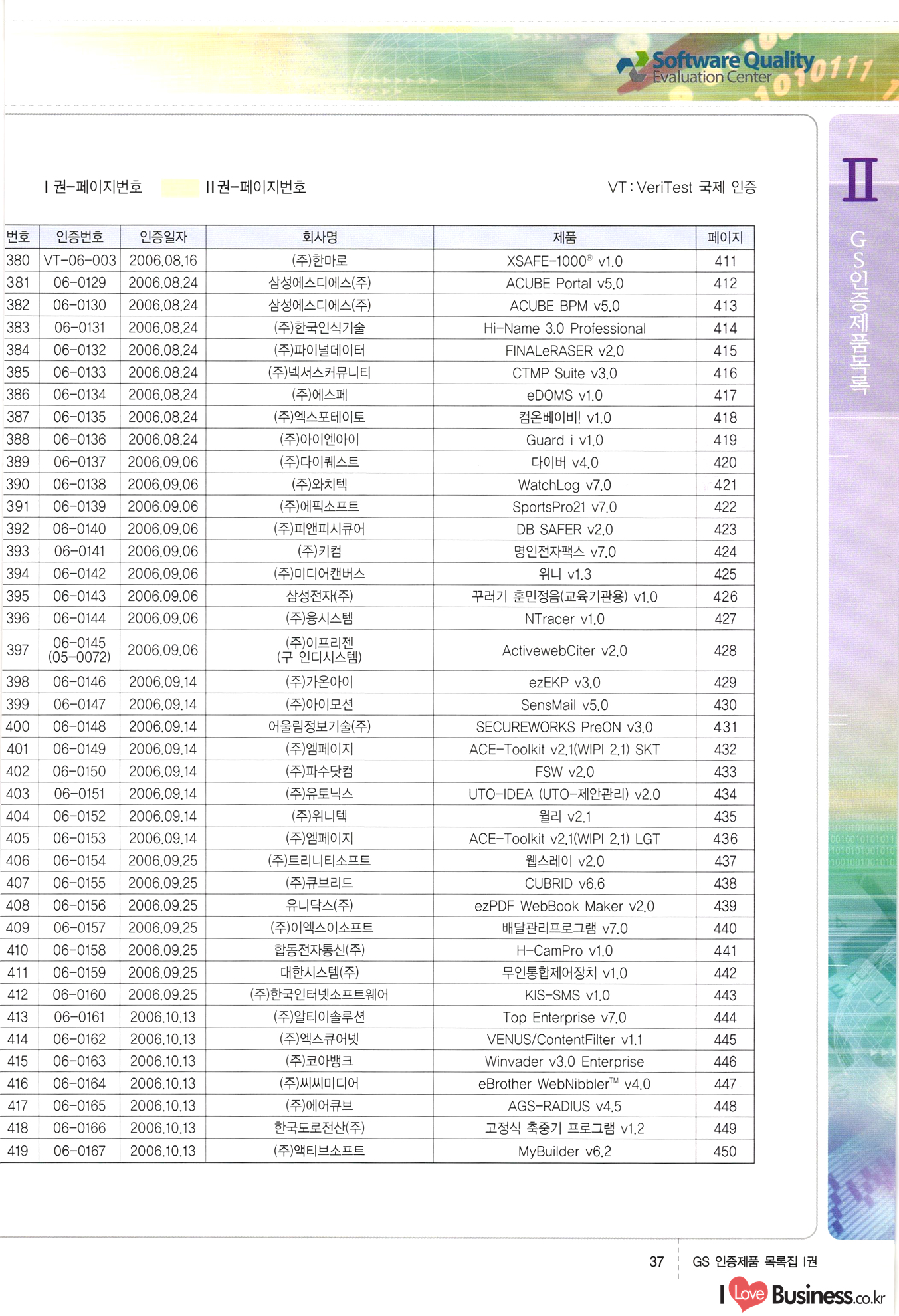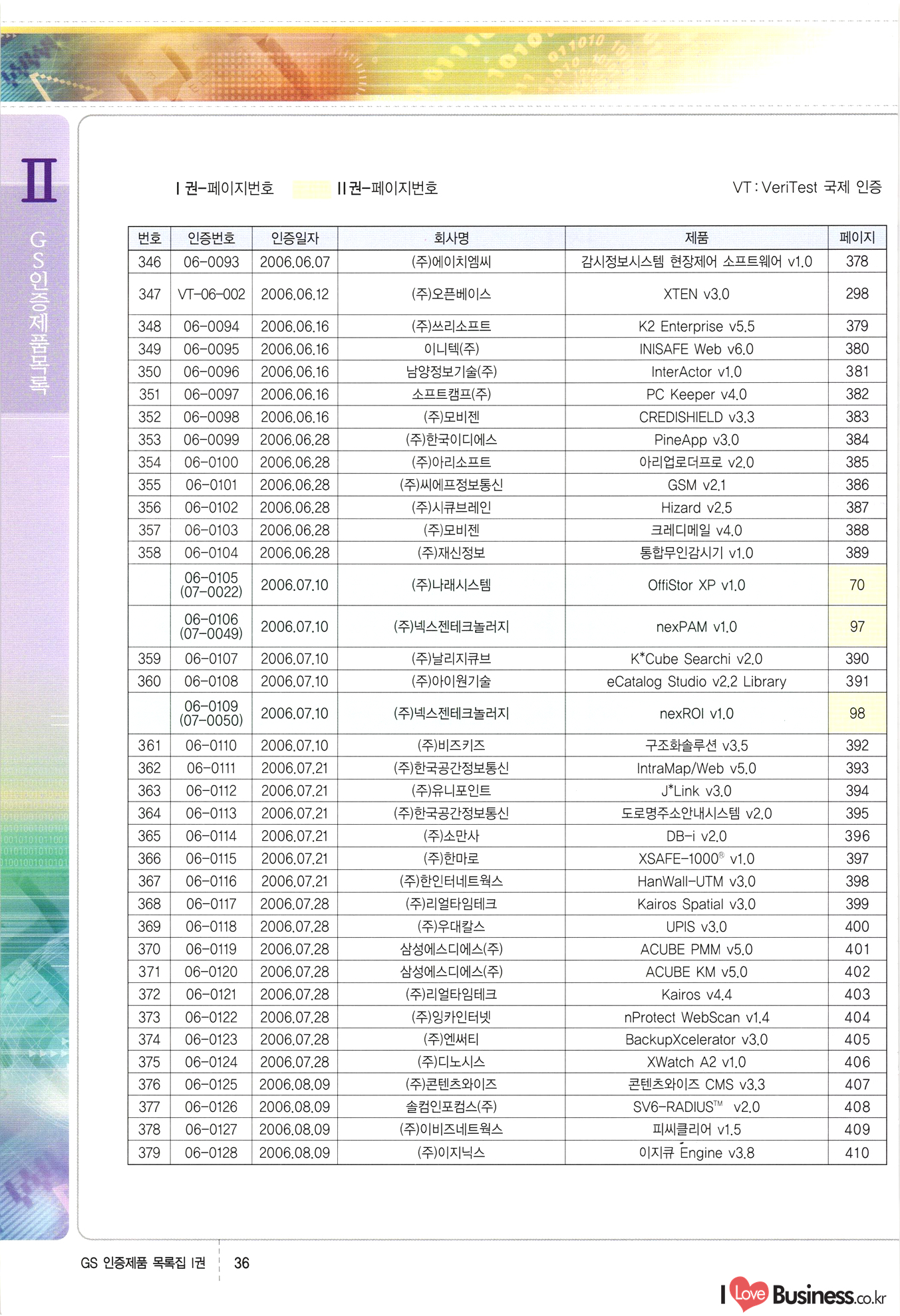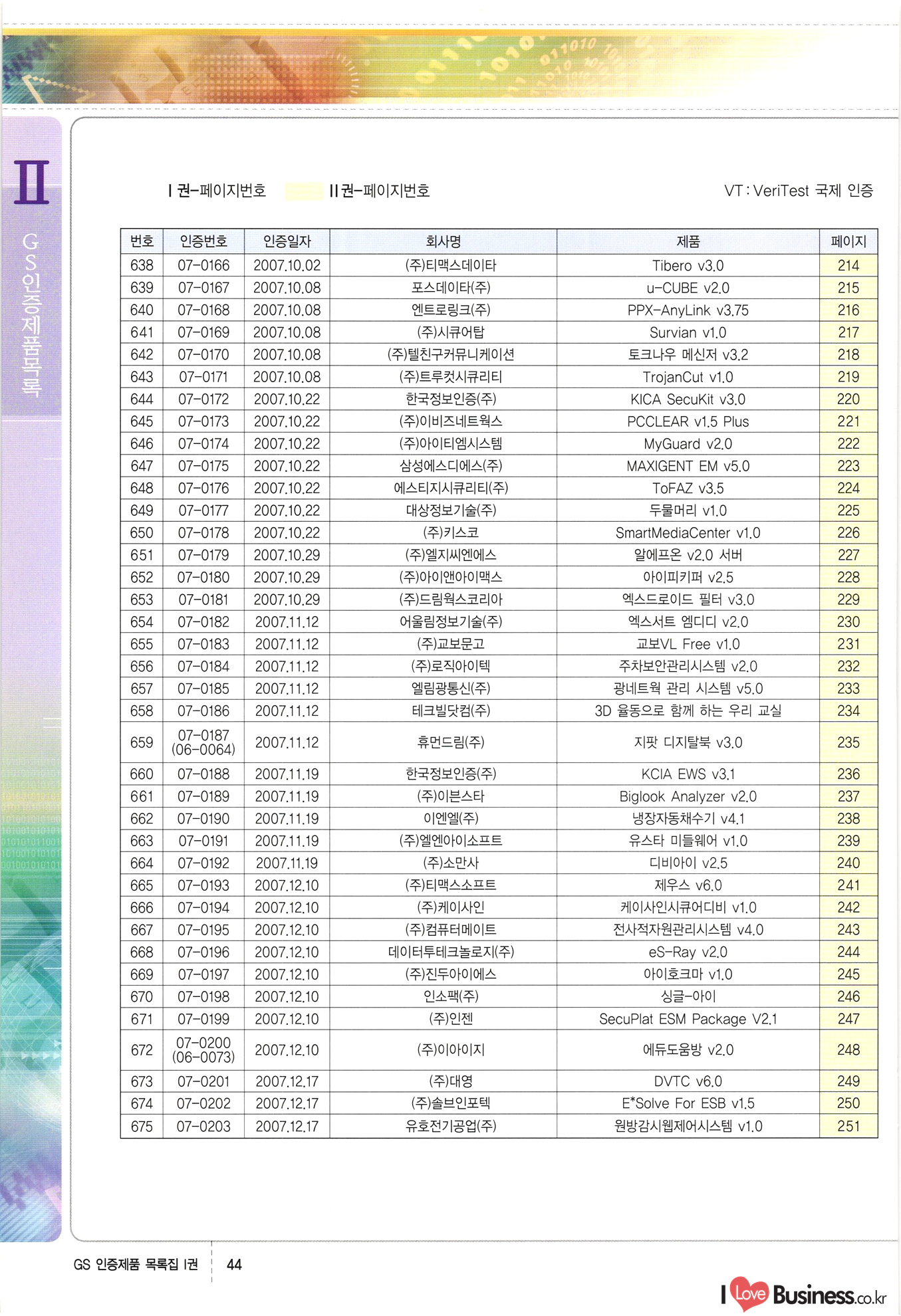 | III. GS 인증제품 목록 | 권-페이지번호 | 권-페이지번호 VT : VeriTest 국제 인증 GS인증제품목록 회사명 삼성에스디에스(주) 제품. EasyBase v4.1 페이지 50 1 제이엔에스 3DM Survey System v1.0 2 | 51 1 (주)싸이웍스 (주)테크다임 (주)다보넷 (주)로지스인포 CyberWALL 2000 v2.16 Jword v1.5 Touchsign v 2.1 키퍼엣홈 v1.0 78 52 (주)미래에듀테크 아이버스 v1.0 53 54 55 56 57 번호 | 인증번호 | 인증일자 01-0001 | 2001.07.25 101-0002 2001.10.22 (02-0027) | 01-0003 | 2001.11.27 | 01-0004 | 2001.11.27 | 01-0005 2001.11.27 5 | 01-0006 | 2001.12.27 02-0001 (02-0029) 2002.01.29 16 | | 02-0002 1 | 2002.02.16 | 02-0003 | 2002.02.16 02-0004 2002.02.27 9 | 02-0005 | 2002.02.27 110 | | 02-0006 | 2002.03.27 11 | || 02-0007 | 2002.03.27 | 02-0008 | 2002.04.30 | 02-0009 | 2002.04.30 | 02-0010 | 2002.04.30 15. | 02-0011 | 2002.04.30 16 102-0012 | 2002.04.30 | 17 | 02-0013 | 2002.05.30 | 18 | 02-0014 | 2002.05.30 | 02-0015 2002.06.28 | 20 | 02-0016 | 2002.06.28 02-0017 1 2002.06.28 | 02-0018 1 | 2002.06.28 23 | 02-0019 | 2002.06.28 24 02-0020 | 2002.07.31 25 | 02-0021 | 2002.07.31 224 58 14 59 118 (주)마크애니 (주)핸디소프트 (주)슈퍼테크놀러지 (주)스펙트라 이래정보시스템(주) (주)컴리빙아이티 | (주)시큐브 (주)케이게이트 (주)소프트4소프트 스페이스인터네셔널(주) (주)컴리빙아이티 (주)그린벨시스템즈 닉스테크(주) 심플소프트 (주)한국데이타비즈네스 (주)테크다임 (주)수세리눅스코리아 (주)한컴리눅스 소프트온넷(주) 와우리눅스(주) 60 61 Document Safer v1.0 | BizFlow Groupware v3.21 | Eg columbus || v1.0 | | eNomix v1.0 Blue Eyes v3.0 i-Class Five v1.05 Secuve TOS WG v1.0 위즈웹3 v3.0 RESORT v1.01 CD Tower v2.0 i-Class One2one v1.05 MANTIS-Professional v1.0 | | SAFEpc v1.5 Simple Gallery v1.00 통합카드발급프로그램 v1.0 Techdigm JCalc v2.0 Suse Linux 7.1K Professional Hancom Linux OS 2.2 Professional | Z!Stream v2.0 와우리눅스 7.1 파란 Secuve TOS WG Agent (Secuve Tos WG Manager) | SMERP v1.1 상하수도범용/ZEUS v1.0 U-Solver v1.0 dDIMS v3.0 DAL v2.5 101010101 1000 101003010101 190 1001010101 21 78. 122 | UL 63 64 65 26 | VT-02-001 | 2002.08.29 (주)시큐브 224 27 1 66 67 | 28 29 130 | 02-0022 | 2002.08.30 | 02-0023 | 2002.10.31 | 02-0024 | 2002.10.31 | 02-0025 | 2002.11.27 | 02-0026 | 2002.11.27 02-0027 (01-0002) 2002.11.27 | 02-0028 (03-0021) 2002.12.09 | 대한상공회의소 한국통신데이타(주) (주)지노시스템 유니온정보시스템(주) (주) 스 68 69 | 70 311 제이엔에스 소프트(구 제이엔에스) 3DM Survey System v1.0 (주)한국지능형정보시스템 한국관(상하수도 범용/TGW) v1.00 92 GS 인증제품 목록집 1권 | 26 I Love Business.co.kr Software Quality, 111 Evaluation Center | 권-페이지번호 II권페이지번호 VT : VeriTest 국제 인증 페이지 회사명 (주)포스데이타 제품 | iSign v2.0 | GS인증제품목록 171 | 34 | 02-0029 (주)제이슨테크(구 미래에듀테크) 아이버스 v1.0 91 72 73. 74 (주)인텔리젼스웨어 (주)하나디에스디 (주)연성정보기술 (주)포스정보 (주)켈코인 (주)포스데이타 스페이스인터내셔널 연희정보통신(주) (주)뉴테크웨이브 c-napse(GSS) v1.0 Life EduBuilder v1.0 | Email+ v3.0 1 책꽃이KDC v3.1 Challenger Webzine Webschool v3.0 1 Biz Binder v1.0 CD-Tower v3.1 상하수도 범용/UFCom v1.0 | | VirusChaser v5.0 | 175 76 118. (주)웨어벨리 Orange for ORACLE v2.2 | 번호 | 인증번호 | 인증일자 | 33 |VT-02-0022002.12.12 | | 2002.12.24 (02-0001) 35 | VT-02-003 | 2002.12.30 | 36 | 03-0001 | 2003.02.28 37. 03-0002 | 2003.02.28 | 38 | 03-0003 | 2003.02.28 | 39 | 03-0004 | 2003.02.28 40 | VT-03-001 | 2003.03.10 41 | VT-03-002) 2003.03.10 1 42 | 03-0005 | 2003.04.07 43 | 03-0006 | 2003.04.07 03-0007 2003.04.30 (03-0026) | 03-0008 | 2003.04.30 45 | 03-0009 | 2003.04.30 | 03-0010 | 2003.04.30 | 47 | 03-0011 | 2003.04.30 | 48 VT-03-003 2003.05.26 49 | 03-0012 | 2003.06.05 | 50 | 03-0013 | 2003.06.05 | 51 | 03-0014 | 2003.06.05 | 52 | 03-0015 | 2003.07.10 | 53 | 03-0016 | 2003.07.10 | 54 | 03-0017 | 2003.07.10 | | 55 | 03-0018 | 2003.07.10 | 56 | 03-0019 | 2003.08.06 57 | | 03-0020 | 2003.08.06 44 1 18 46 80 81 82 83 | (주)테크다임 (주)엔지스테크널러지 삼성에스디에스(주) 삼성에스디에스(주) (주)미디어랜드 인터컴소프트웨어(주) 에스케이씨앤씨(주) 아이티로직스(주) (주)에이씨티소프트 (주)위즈북 (주)에스오엔코리아 (주)아리수미디어 한진정보통신(주) (주)인텔리전스웨어 (주)웨어밸리 (구 (주)오알솔루션즈코리아) Techdigm Office v2.0 | G-Solution Waterworks/Sewerage v1.0 | | 79 UniCITY Standard v1.0 UniCITY Enterprise v1.0 TCO!stream 2002 v4.0 | ServerGuard v3.0 | SK-UPEX v1.0 84 NexWeb v1.2 e-Library Deluxe v4.1.5 86 DL Pro v1.0 SiR v1.01 파워CD뱅크 v4.0 89 InfoMatrix v1.00 190 Bizpus v1.0 91 85 87 88 10010010101.03 1101010100101 1100100100107 58 |VT-03-004 2003.08.12 Orange for ORACLE v2.2 | 111 59 (주)티지더블유 (구 한국지능형정보시스템) 한국관(상하수도 범용/TGW) v1.0 92 93 GIS Free v1.0 DeskPlus v2.0 1 | 94 ArcCITY v1.0 110 03-0021 (02-0028) | 2003.09.04 | 60 | 03-0022 | 2003.09.30 03-0023 | 2003.09.30 03-0024 (04-0011) | 2003.09.30 | 03-0025 | 2003.09.30 03-0026 (03-0007) | 2003.10.07 63 | 03-0027 | 2003.11.12 64 | 03-0028 | 2003.11.12 622 세광정보시스템(주) 제오스페이스(주) (주)선도소프트 (구 (주)캐드랜드) 중앙항업(주) (주)웨어밸리 (구 (주)오알솔루션즈코리아) (주)우암닷컴 (주)오투라인 geoCUBE상하수도 v1.0 95 Orange for ORACLE V2.2 111 96 RAVCOMS Eyecon v4.0 오투스쿨 v2.01 97 GS 인증제품 목록집 1권 I Love Business.co.kr | 권-페이지번호 | 권 - 페이지번호 VT : VeriTest 국제 인증 번호 페이지 회사명 소프트캠프