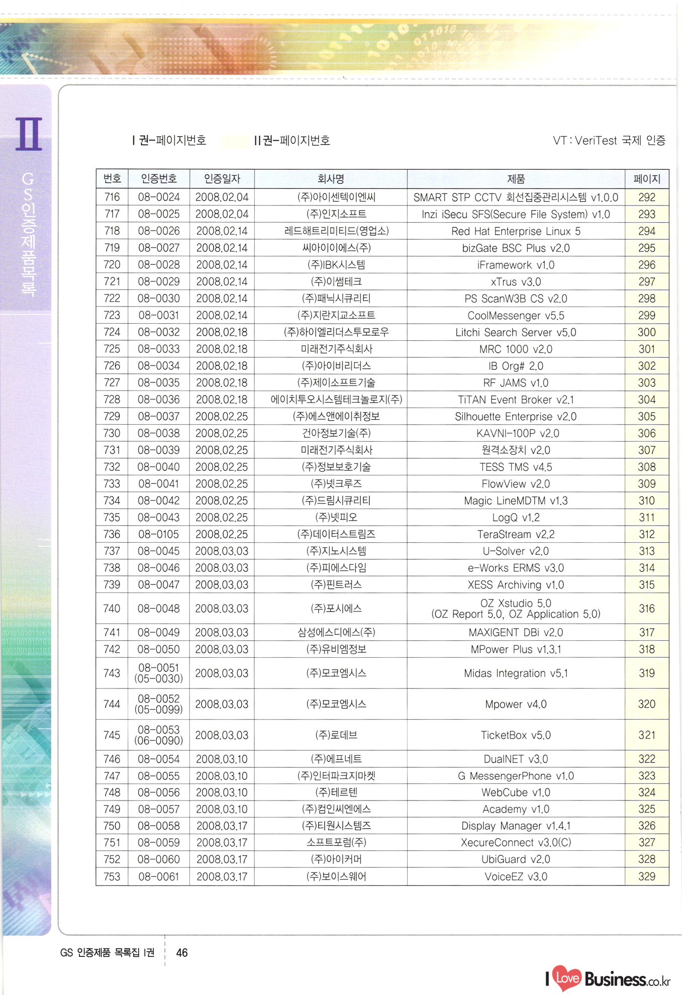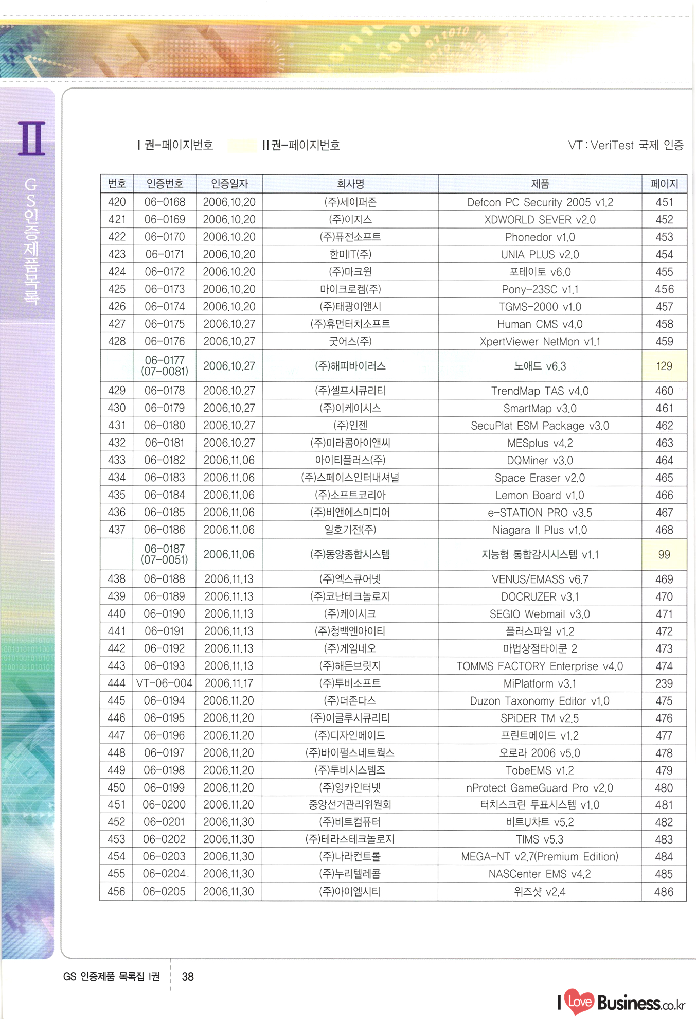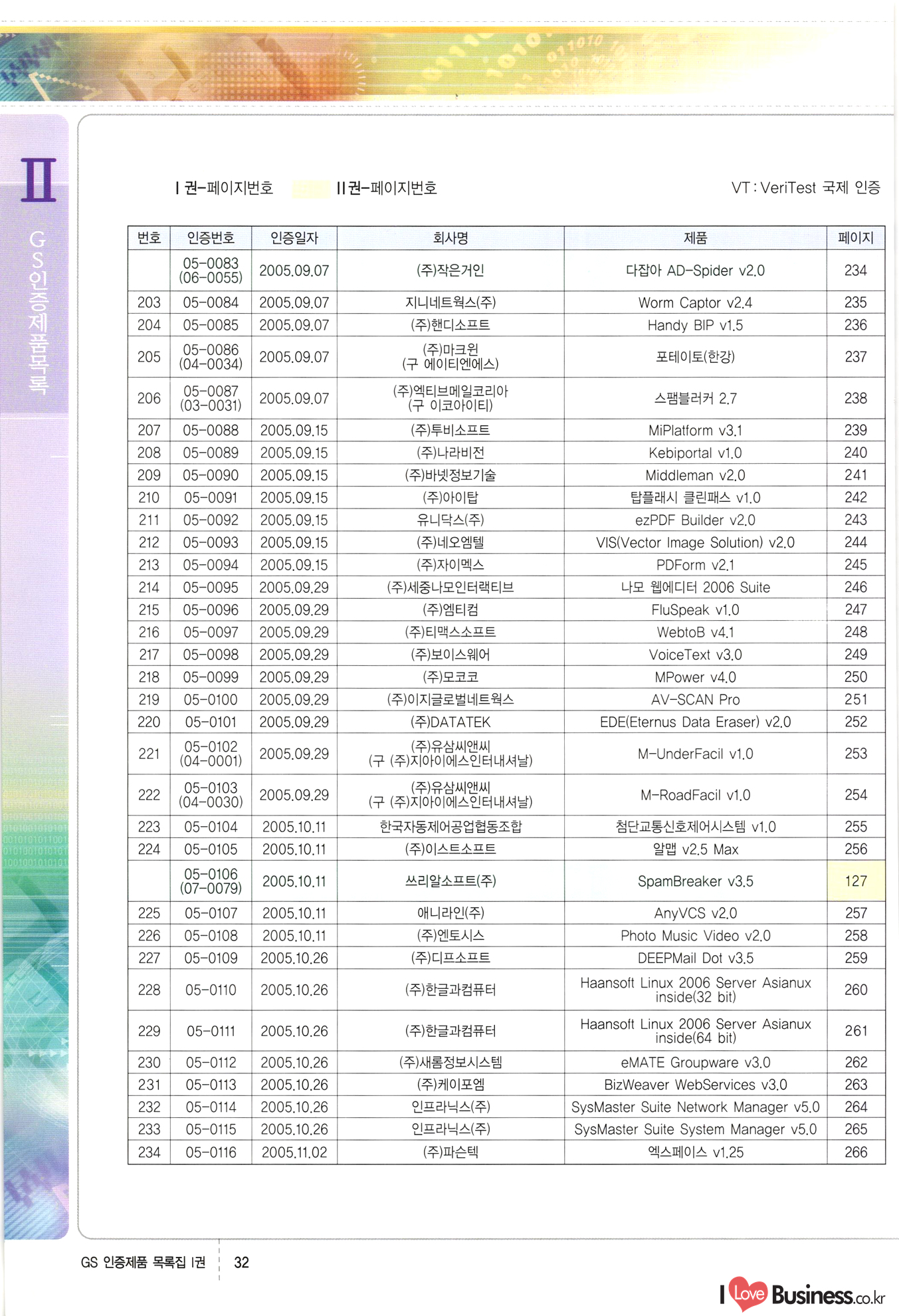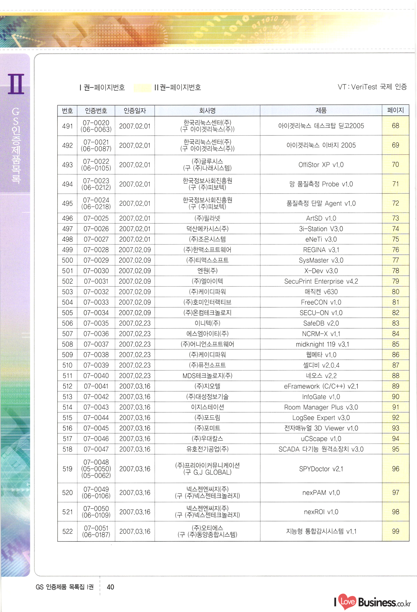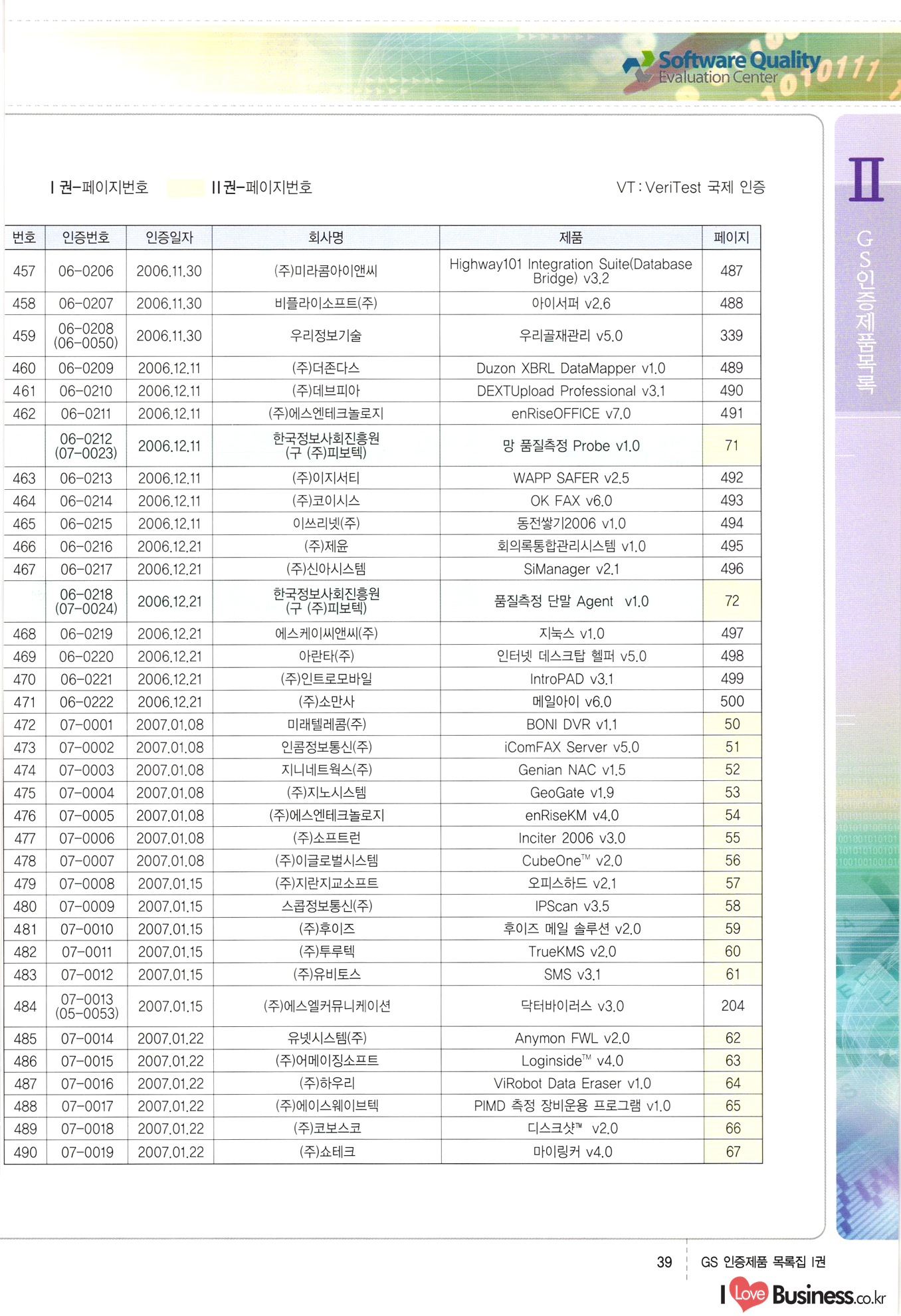 | III. GS 인증제품 목록 | 권-페이지번호 | 권-페이지번호 VT : VeriTest 국제 인증 GS인증제품목록 회사명 삼성에스디에스(주) 제품. EasyBase v4.1 페이지 50 1 제이엔에스 3DM Survey System v1.0 2 | 51 1 (주)싸이웍스 (주)테크다임 (주)다보넷 (주)로지스인포 CyberWALL 2000 v2.16 Jword v1.5 Touchsign v 2.1 키퍼엣홈 v1.0 78 52 (주)미래에듀테크 아이버스 v1.0 53 54 55 56 57 번호 | 인증번호 | 인증일자 01-0001 | 2001.07.25 101-0002 2001.10.22 (02-0027) | 01-0003 | 2001.11.27 | 01-0004 | 2001.11.27 | 01-0005 2001.11.27 5 | 01-0006 | 2001.12.27 02-0001 (02-0029) 2002.01.29 16 | | 02-0002 1 | 2002.02.16 | 02-0003 | 2002.02.16 02-0004 2002.02.27 9 | 02-0005 | 2002.02.27 110 | | 02-0006 | 2002.03.27 11 | || 02-0007 | 2002.03.27 | 02-0008 | 2002.04.30 | 02-0009 | 2002.04.30 | 02-0010 | 2002.04.30 15. | 02-0011 | 2002.04.30 16 102-0012 | 2002.04.30 | 17 | 02-0013 | 2002.05.30 | 18 | 02-0014 | 2002.05.30 | 02-0015 2002.06.28 | 20 | 02-0016 | 2002.06.28 02-0017 1 2002.06.28 | 02-0018 1 | 2002.06.28 23 | 02-0019 | 2002.06.28 24 02-0020 | 2002.07.31 25 | 02-0021 | 2002.07.31 224 58 14 59 118 (주)마크애니 (주)핸디소프트 (주)슈퍼테크놀러지 (주)스펙트라 이래정보시스템(주) (주)컴리빙아이티 | (주)시큐브 (주)케이게이트 (주)소프트4소프트 스페이스인터네셔널(주) (주)컴리빙아이티 (주)그린벨시스템즈 닉스테크(주) 심플소프트 (주)한국데이타비즈네스 (주)테크다임 (주)수세리눅스코리아 (주)한컴리눅스 소프트온넷(주) 와우리눅스(주) 60 61 Document Safer v1.0 | BizFlow Groupware v3.21 | Eg columbus || v1.0 | | eNomix v1.0 Blue Eyes v3.0 i-Class Five v1.05 Secuve TOS WG v1.0 위즈웹3 v3.0 RESORT v1.01 CD Tower v2.0 i-Class One2one v1.05 MANTIS-Professional v1.0 | | SAFEpc v1.5 Simple Gallery v1.00 통합카드발급프로그램 v1.0 Techdigm JCalc v2.0 Suse Linux 7.1K Professional Hancom Linux OS 2.2 Professional | Z!Stream v2.0 와우리눅스 7.1 파란 Secuve TOS WG Agent (Secuve Tos WG Manager) | SMERP v1.1 상하수도범용/ZEUS v1.0 U-Solver v1.0 dDIMS v3.0 DAL v2.5 101010101 1000 101003010101 190 1001010101 21 78. 122 | UL 63 64 65 26 | VT-02-001 | 2002.08.29 (주)시큐브 224 27 1 66 67 | 28 29 130 | 02-0022 | 2002.08.30 | 02-0023 | 2002.10.31 | 02-0024 | 2002.10.31 | 02-0025 | 2002.11.27 | 02-0026 | 2002.11.27 02-0027 (01-0002) 2002.11.27 | 02-0028 (03-0021) 2002.12.09 | 대한상공회의소 한국통신데이타(주) (주)지노시스템 유니온정보시스템(주) (주) 스 68 69 | 70 311 제이엔에스 소프트(구 제이엔에스) 3DM Survey System v1.0 (주)한국지능형정보시스템 한국관(상하수도 범용/TGW) v1.00 92 GS 인증제품 목록집 1권 | 26 I Love Business.co.kr Software Quality, 111 Evaluation Center | 권-페이지번호 II권페이지번호 VT : VeriTest 국제 인증 페이지 회사명 (주)포스데이타 제품 | iSign v2.0 | GS인증제품목록 171 | 34 | 02-0029 (주)제이슨테크(구 미래에듀테크) 아이버스 v1.0 91 72 73. 74 (주)인텔리젼스웨어 (주)하나디에스디 (주)연성정보기술 (주)포스정보 (주)켈코인 (주)포스데이타 스페이스인터내셔널 연희정보통신(주) (주)뉴테크웨이브 c-napse(GSS) v1.0 Life EduBuilder v1.0 | Email+ v3.0 1 책꽃이KDC v3.1 Challenger Webzine Webschool v3.0 1 Biz Binder v1.0 CD-Tower v3.1 상하수도 범용/UFCom v1.0 | | VirusChaser v5.0 | 175 76 118. (주)웨어벨리 Orange for ORACLE v2.2 | 번호 | 인증번호 | 인증일자 | 33 |VT-02-0022002.12.12 | | 2002.12.24 (02-0001) 35 | VT-02-003 | 2002.12.30 | 36 | 03-0001 | 2003.02.28 37. 03-0002 | 2003.02.28 | 38 | 03-0003 | 2003.02.28 | 39 | 03-0004 | 2003.02.28 40 | VT-03-001 | 2003.03.10 41 | VT-03-002) 2003.03.10 1 42 | 03-0005 | 2003.04.07 43 | 03-0006 | 2003.04.07 03-0007 2003.04.30 (03-0026) | 03-0008 | 2003.04.30 45 | 03-0009 | 2003.04.30 | 03-0010 | 2003.04.30 | 47 | 03-0011 | 2003.04.30 | 48 VT-03-003 2003.05.26 49 | 03-0012 | 2003.06.05 | 50 | 03-0013 | 2003.06.05 | 51 | 03-0014 | 2003.06.05 | 52 | 03-0015 | 2003.07.10 | 53 | 03-0016 | 2003.07.10 | 54 | 03-0017 | 2003.07.10 | | 55 | 03-0018 | 2003.07.10 | 56 | 03-0019 | 2003.08.06 57 | | 03-0020 | 2003.08.06 44 1 18 46 80 81 82 83 | (주)테크다임 (주)엔지스테크널러지 삼성에스디에스(주) 삼성에스디에스(주) (주)미디어랜드 인터컴소프트웨어(주) 에스케이씨앤씨(주) 아이티로직스(주) (주)에이씨티소프트 (주)위즈북 (주)에스오엔코리아 (주)아리수미디어 한진정보통신(주) (주)인텔리전스웨어 (주)웨어밸리 (구 (주)오알솔루션즈코리아) Techdigm Office v2.0 | G-Solution Waterworks/Sewerage v1.0 | | 79 UniCITY Standard v1.0 UniCITY Enterprise v1.0 TCO!stream 2002 v4.0 | ServerGuard v3.0 | SK-UPEX v1.0 84 NexWeb v1.2 e-Library Deluxe v4.1.5 86 DL Pro v1.0 SiR v1.01 파워CD뱅크 v4.0 89 InfoMatrix v1.00 190 Bizpus v1.0 91 85 87 88 10010010101.03 1101010100101 1100100100107 58 |VT-03-004 2003.08.12 Orange for ORACLE v2.2 | 111 59 (주)티지더블유 (구 한국지능형정보시스템) 한국관(상하수도 범용/TGW) v1.0 92 93 GIS Free v1.0 DeskPlus v2.0 1 | 94 ArcCITY v1.0 110 03-0021 (02-0028) | 2003.09.04 | 60 | 03-0022 | 2003.09.30 03-0023 | 2003.09.30 03-0024 (04-0011) | 2003.09.30 | 03-0025 | 2003.09.30 03-0026 (03-0007) | 2003.10.07 63 | 03-0027 | 2003.11.12 64 | 03-0028 | 2003.11.12 622 세광정보시스템(주) 제오스페이스(주) (주)선도소프트 (구 (주)캐드랜드) 중앙항업(주) (주)웨어밸리 (구 (주)오알솔루션즈코리아) (주)우암닷컴 (주)오투라인 geoCUBE상하수도 v1.0 95 Orange for ORACLE V2.2 111 96 RAVCOMS Eyecon v4.0 오투스쿨 v2.01 97 GS 인증제품 목록집 1권 I Love Business.co.kr | 권-페이지번호 | 권 - 페이지번호 VT : VeriTest 국제 인증 번호 페이지 회사명 소프트캠프