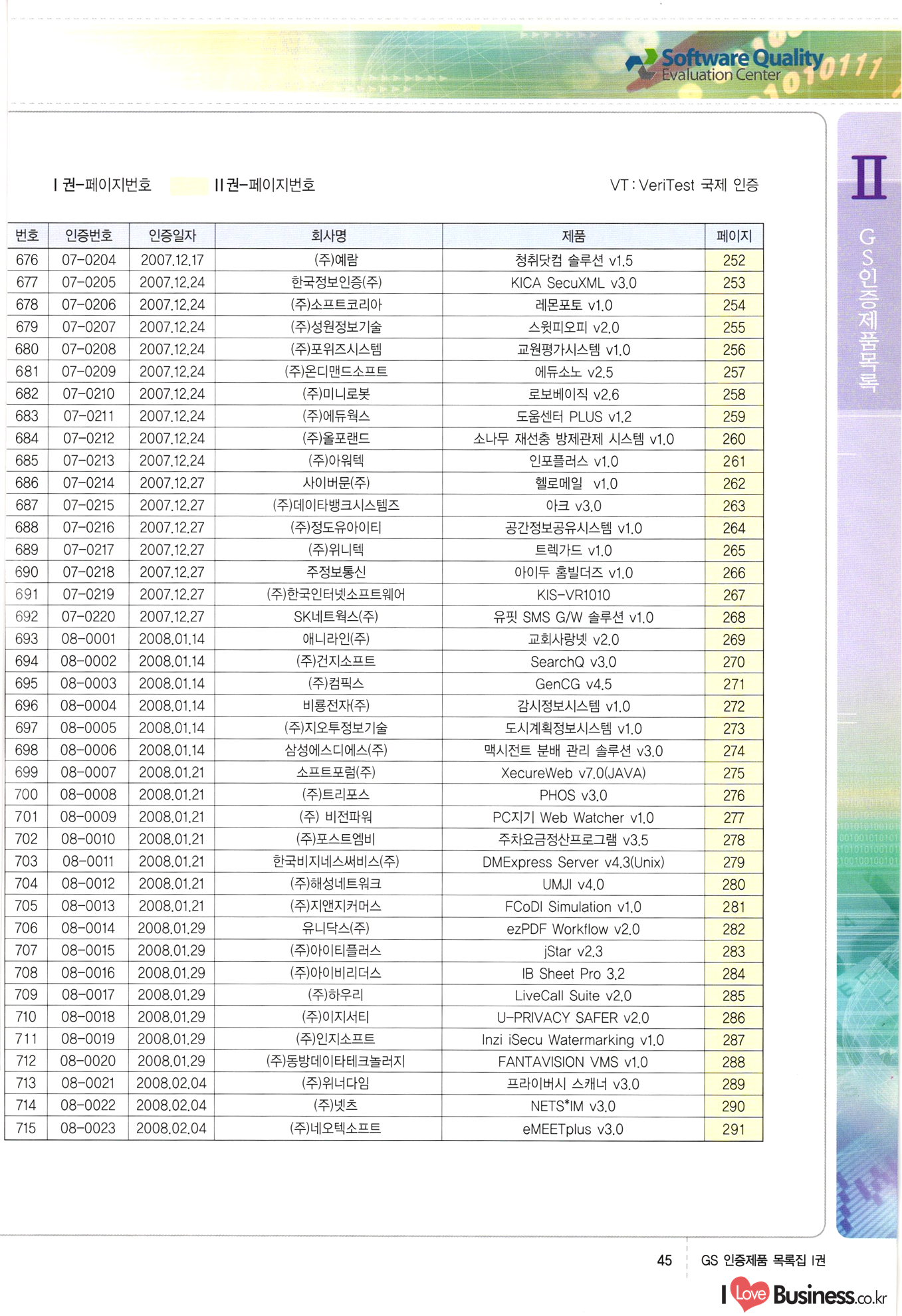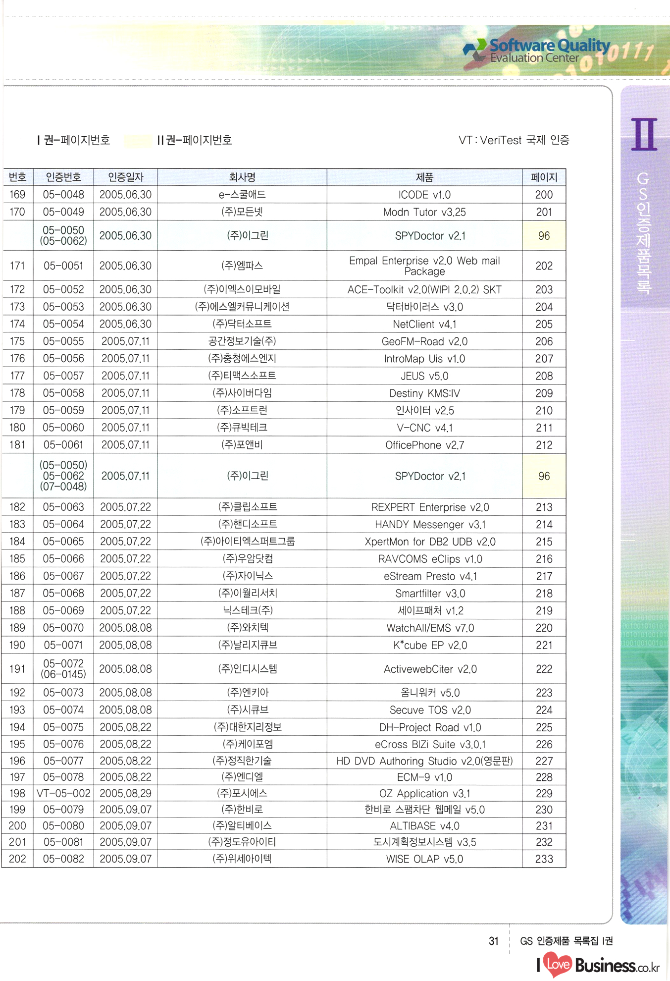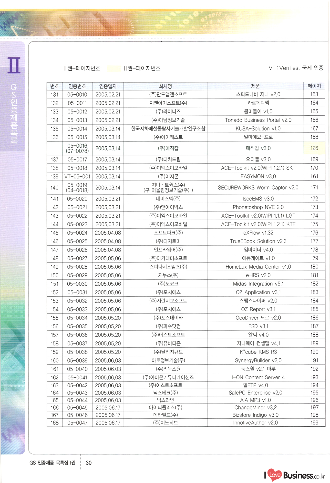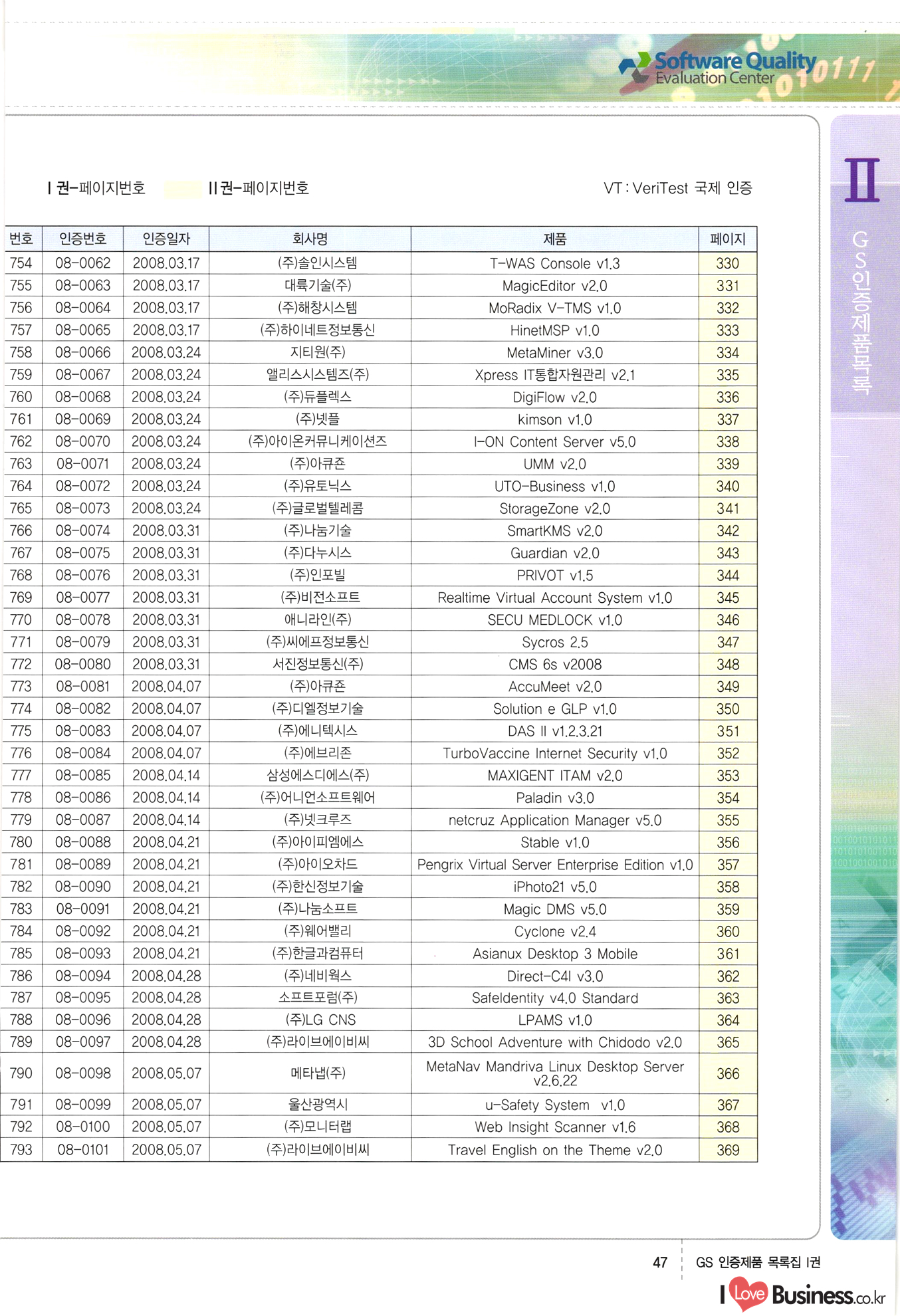 | III. GS 인증제품 목록 | 권-페이지번호 | 권-페이지번호 VT : VeriTest 국제 인증 GS인증제품목록 회사명 삼성에스디에스(주) 제품. EasyBase v4.1 페이지 50 1 제이엔에스 3DM Survey System v1.0 2 | 51 1 (주)싸이웍스 (주)테크다임 (주)다보넷 (주)로지스인포 CyberWALL 2000 v2.16 Jword v1.5 Touchsign v 2.1 키퍼엣홈 v1.0 78 52 (주)미래에듀테크 아이버스 v1.0 53 54 55 56 57 번호 | 인증번호 | 인증일자 01-0001 | 2001.07.25 101-0002 2001.10.22 (02-0027) | 01-0003 | 2001.11.27 | 01-0004 | 2001.11.27 | 01-0005 2001.11.27 5 | 01-0006 | 2001.12.27 02-0001 (02-0029) 2002.01.29 16 | | 02-0002 1 | 2002.02.16 | 02-0003 | 2002.02.16 02-0004 2002.02.27 9 | 02-0005 | 2002.02.27 110 | | 02-0006 | 2002.03.27 11 | || 02-0007 | 2002.03.27 | 02-0008 | 2002.04.30 | 02-0009 | 2002.04.30 | 02-0010 | 2002.04.30 15. | 02-0011 | 2002.04.30 16 102-0012 | 2002.04.30 | 17 | 02-0013 | 2002.05.30 | 18 | 02-0014 | 2002.05.30 | 02-0015 2002.06.28 | 20 | 02-0016 | 2002.06.28 02-0017 1 2002.06.28 | 02-0018 1 | 2002.06.28 23 | 02-0019 | 2002.06.28 24 02-0020 | 2002.07.31 25 | 02-0021 | 2002.07.31 224 58 14 59 118 (주)마크애니 (주)핸디소프트 (주)슈퍼테크놀러지 (주)스펙트라 이래정보시스템(주) (주)컴리빙아이티 | (주)시큐브 (주)케이게이트 (주)소프트4소프트 스페이스인터네셔널(주) (주)컴리빙아이티 (주)그린벨시스템즈 닉스테크(주) 심플소프트 (주)한국데이타비즈네스 (주)테크다임 (주)수세리눅스코리아 (주)한컴리눅스 소프트온넷(주) 와우리눅스(주) 60 61 Document Safer v1.0 | BizFlow Groupware v3.21 | Eg columbus || v1.0 | | eNomix v1.0 Blue Eyes v3.0 i-Class Five v1.05 Secuve TOS WG v1.0 위즈웹3 v3.0 RESORT v1.01 CD Tower v2.0 i-Class One2one v1.05 MANTIS-Professional v1.0 | | SAFEpc v1.5 Simple Gallery v1.00 통합카드발급프로그램 v1.0 Techdigm JCalc v2.0 Suse Linux 7.1K Professional Hancom Linux OS 2.2 Professional | Z!Stream v2.0 와우리눅스 7.1 파란 Secuve TOS WG Agent (Secuve Tos WG Manager) | SMERP v1.1 상하수도범용/ZEUS v1.0 U-Solver v1.0 dDIMS v3.0 DAL v2.5 101010101 1000 101003010101 190 1001010101 21 78. 122 | UL 63 64 65 26 | VT-02-001 | 2002.08.29 (주)시큐브 224 27 1 66 67 | 28 29 130 | 02-0022 | 2002.08.30 | 02-0023 | 2002.10.31 | 02-0024 | 2002.10.31 | 02-0025 | 2002.11.27 | 02-0026 | 2002.11.27 02-0027 (01-0002) 2002.11.27 | 02-0028 (03-0021) 2002.12.09 | 대한상공회의소 한국통신데이타(주) (주)지노시스템 유니온정보시스템(주) (주) 스 68 69 | 70 311 제이엔에스 소프트(구 제이엔에스) 3DM Survey System v1.0 (주)한국지능형정보시스템 한국관(상하수도 범용/TGW) v1.00 92 GS 인증제품 목록집 1권 | 26 I Love Business.co.kr Software Quality, 111 Evaluation Center | 권-페이지번호 II권페이지번호 VT : VeriTest 국제 인증 페이지 회사명 (주)포스데이타 제품 | iSign v2.0 | GS인증제품목록 171 | 34 | 02-0029 (주)제이슨테크(구 미래에듀테크) 아이버스 v1.0 91 72 73. 74 (주)인텔리젼스웨어 (주)하나디에스디 (주)연성정보기술 (주)포스정보 (주)켈코인 (주)포스데이타 스페이스인터내셔널 연희정보통신(주) (주)뉴테크웨이브 c-napse(GSS) v1.0 Life EduBuilder v1.0 | Email+ v3.0 1 책꽃이KDC v3.1 Challenger Webzine Webschool v3.0 1 Biz Binder v1.0 CD-Tower v3.1 상하수도 범용/UFCom v1.0 | | VirusChaser v5.0 | 175 76 118. (주)웨어벨리 Orange for ORACLE v2.2 | 번호 | 인증번호 | 인증일자 | 33 |VT-02-0022002.12.12 | | 2002.12.24 (02-0001) 35 | VT-02-003 | 2002.12.30 | 36 | 03-0001 | 2003.02.28 37. 03-0002 | 2003.02.28 | 38 | 03-0003 | 2003.02.28 | 39 | 03-0004 | 2003.02.28 40 | VT-03-001 | 2003.03.10 41 | VT-03-002) 2003.03.10 1 42 | 03-0005 | 2003.04.07 43 | 03-0006 | 2003.04.07 03-0007 2003.04.30 (03-0026) | 03-0008 | 2003.04.30 45 | 03-0009 | 2003.04.30 | 03-0010 | 2003.04.30 | 47 | 03-0011 | 2003.04.30 | 48 VT-03-003 2003.05.26 49 | 03-0012 | 2003.06.05 | 50 | 03-0013 | 2003.06.05 | 51 | 03-0014 | 2003.06.05 | 52 | 03-0015 | 2003.07.10 | 53 | 03-0016 | 2003.07.10 | 54 | 03-0017 | 2003.07.10 | | 55 | 03-0018 | 2003.07.10 | 56 | 03-0019 | 2003.08.06 57 | | 03-0020 | 2003.08.06 44 1 18 46 80 81 82 83 | (주)테크다임 (주)엔지스테크널러지 삼성에스디에스(주) 삼성에스디에스(주) (주)미디어랜드 인터컴소프트웨어(주) 에스케이씨앤씨(주) 아이티로직스(주) (주)에이씨티소프트 (주)위즈북 (주)에스오엔코리아 (주)아리수미디어 한진정보통신(주) (주)인텔리전스웨어 (주)웨어밸리 (구 (주)오알솔루션즈코리아) Techdigm Office v2.0 | G-Solution Waterworks/Sewerage v1.0 | | 79 UniCITY Standard v1.0 UniCITY Enterprise v1.0 TCO!stream 2002 v4.0 | ServerGuard v3.0 | SK-UPEX v1.0 84 NexWeb v1.2 e-Library Deluxe v4.1.5 86 DL Pro v1.0 SiR v1.01 파워CD뱅크 v4.0 89 InfoMatrix v1.00 190 Bizpus v1.0 91 85 87 88 10010010101.03 1101010100101 1100100100107 58 |VT-03-004 2003.08.12 Orange for ORACLE v2.2 | 111 59 (주)티지더블유 (구 한국지능형정보시스템) 한국관(상하수도 범용/TGW) v1.0 92 93 GIS Free v1.0 DeskPlus v2.0 1 | 94 ArcCITY v1.0 110 03-0021 (02-0028) | 2003.09.04 | 60 | 03-0022 | 2003.09.30 03-0023 | 2003.09.30 03-0024 (04-0011) | 2003.09.30 | 03-0025 | 2003.09.30 03-0026 (03-0007) | 2003.10.07 63 | 03-0027 | 2003.11.12 64 | 03-0028 | 2003.11.12 622 세광정보시스템(주) 제오스페이스(주) (주)선도소프트 (구 (주)캐드랜드) 중앙항업(주) (주)웨어밸리 (구 (주)오알솔루션즈코리아) (주)우암닷컴 (주)오투라인 geoCUBE상하수도 v1.0 95 Orange for ORACLE V2.2 111 96 RAVCOMS Eyecon v4.0 오투스쿨 v2.01 97 GS 인증제품 목록집 1권 I Love Business.co.kr | 권-페이지번호 | 권 - 페이지번호 VT : VeriTest 국제 인증 번호 페이지 회사명 소프트캠프
