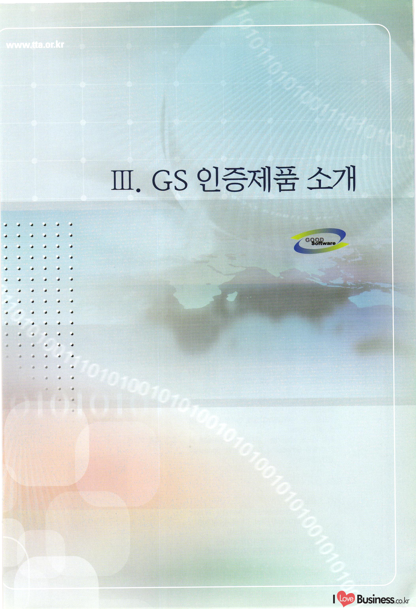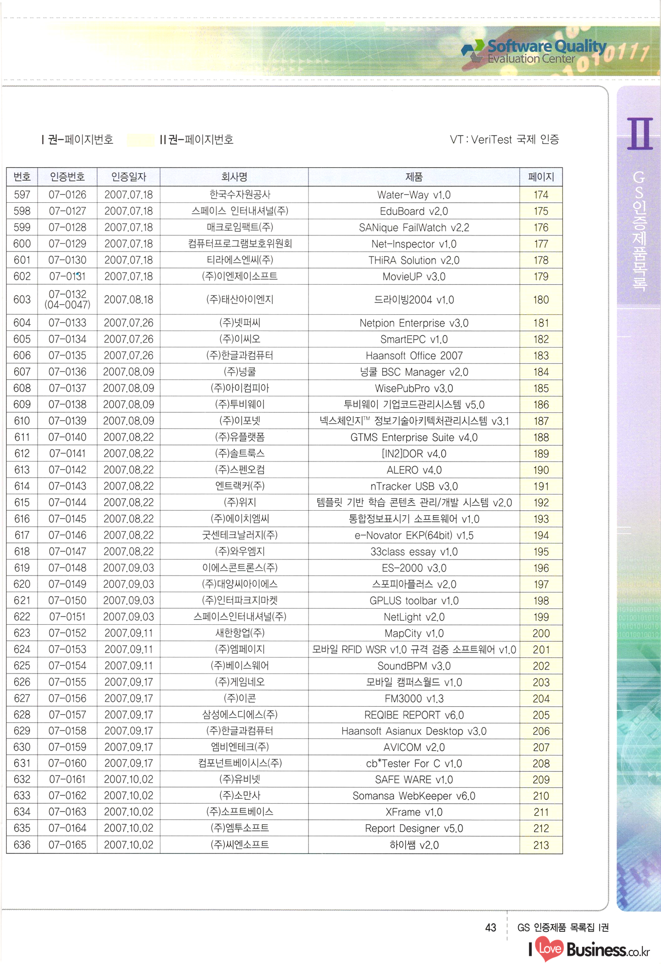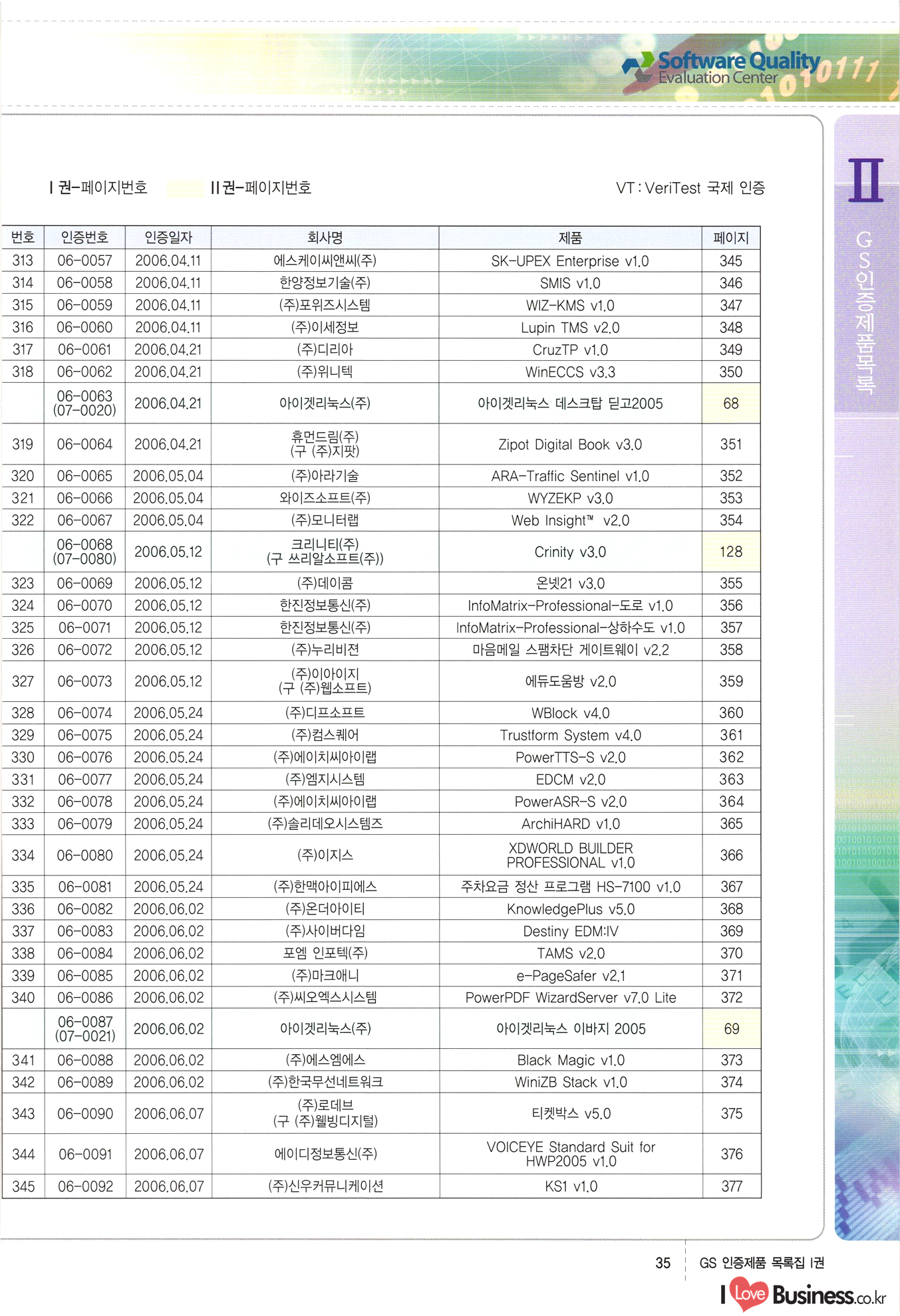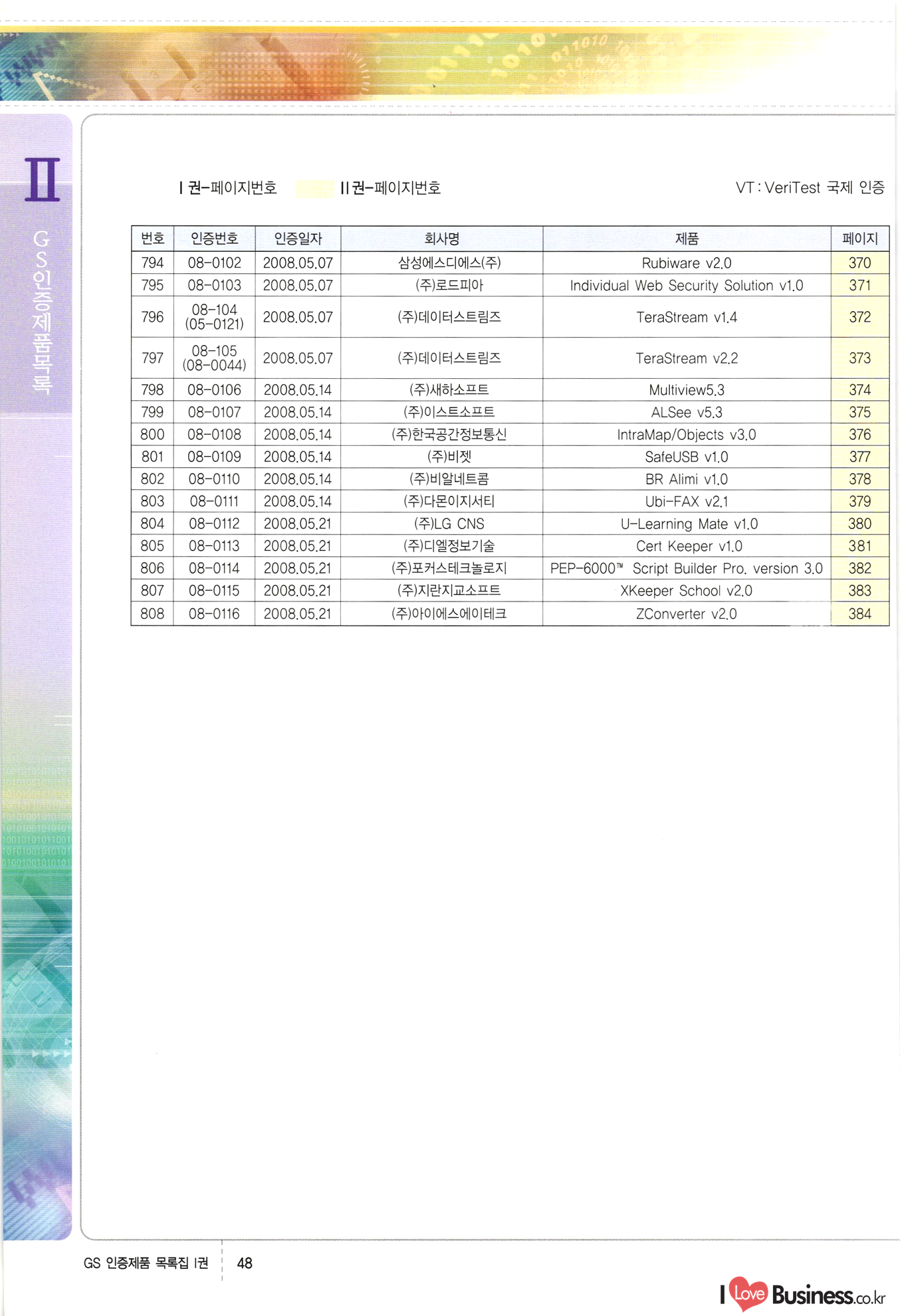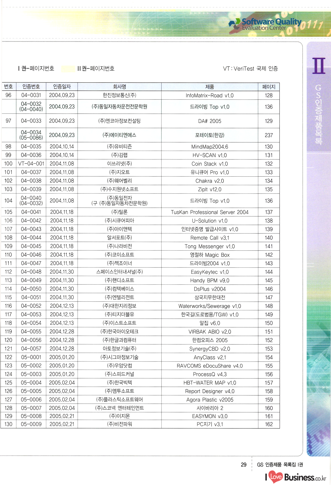 | III. GS 인증제품 목록 | 권-페이지번호 | 권-페이지번호 VT : VeriTest 국제 인증 GS인증제품목록 회사명 삼성에스디에스(주) 제품. EasyBase v4.1 페이지 50 1 제이엔에스 3DM Survey System v1.0 2 | 51 1 (주)싸이웍스 (주)테크다임 (주)다보넷 (주)로지스인포 CyberWALL 2000 v2.16 Jword v1.5 Touchsign v 2.1 키퍼엣홈 v1.0 78 52 (주)미래에듀테크 아이버스 v1.0 53 54 55 56 57 번호 | 인증번호 | 인증일자 01-0001 | 2001.07.25 101-0002 2001.10.22 (02-0027) | 01-0003 | 2001.11.27 | 01-0004 | 2001.11.27 | 01-0005 2001.11.27 5 | 01-0006 | 2001.12.27 02-0001 (02-0029) 2002.01.29 16 | | 02-0002 1 | 2002.02.16 | 02-0003 | 2002.02.16 02-0004 2002.02.27 9 | 02-0005 | 2002.02.27 110 | | 02-0006 | 2002.03.27 11 | || 02-0007 | 2002.03.27 | 02-0008 | 2002.04.30 | 02-0009 | 2002.04.30 | 02-0010 | 2002.04.30 15. | 02-0011 | 2002.04.30 16 102-0012 | 2002.04.30 | 17 | 02-0013 | 2002.05.30 | 18 | 02-0014 | 2002.05.30 | 02-0015 2002.06.28 | 20 | 02-0016 | 2002.06.28 02-0017 1 2002.06.28 | 02-0018 1 | 2002.06.28 23 | 02-0019 | 2002.06.28 24 02-0020 | 2002.07.31 25 | 02-0021 | 2002.07.31 224 58 14 59 118 (주)마크애니 (주)핸디소프트 (주)슈퍼테크놀러지 (주)스펙트라 이래정보시스템(주) (주)컴리빙아이티 | (주)시큐브 (주)케이게이트 (주)소프트4소프트 스페이스인터네셔널(주) (주)컴리빙아이티 (주)그린벨시스템즈 닉스테크(주) 심플소프트 (주)한국데이타비즈네스 (주)테크다임 (주)수세리눅스코리아 (주)한컴리눅스 소프트온넷(주) 와우리눅스(주) 60 61 Document Safer v1.0 | BizFlow Groupware v3.21 | Eg columbus || v1.0 | | eNomix v1.0 Blue Eyes v3.0 i-Class Five v1.05 Secuve TOS WG v1.0 위즈웹3 v3.0 RESORT v1.01 CD Tower v2.0 i-Class One2one v1.05 MANTIS-Professional v1.0 | | SAFEpc v1.5 Simple Gallery v1.00 통합카드발급프로그램 v1.0 Techdigm JCalc v2.0 Suse Linux 7.1K Professional Hancom Linux OS 2.2 Professional | Z!Stream v2.0 와우리눅스 7.1 파란 Secuve TOS WG Agent (Secuve Tos WG Manager) | SMERP v1.1 상하수도범용/ZEUS v1.0 U-Solver v1.0 dDIMS v3.0 DAL v2.5 101010101 1000 101003010101 190 1001010101 21 78. 122 | UL 63 64 65 26 | VT-02-001 | 2002.08.29 (주)시큐브 224 27 1 66 67 | 28 29 130 | 02-0022 | 2002.08.30 | 02-0023 | 2002.10.31 | 02-0024 | 2002.10.31 | 02-0025 | 2002.11.27 | 02-0026 | 2002.11.27 02-0027 (01-0002) 2002.11.27 | 02-0028 (03-0021) 2002.12.09 | 대한상공회의소 한국통신데이타(주) (주)지노시스템 유니온정보시스템(주) (주) 스 68 69 | 70 311 제이엔에스 소프트(구 제이엔에스) 3DM Survey System v1.0 (주)한국지능형정보시스템 한국관(상하수도 범용/TGW) v1.00 92 GS 인증제품 목록집 1권 | 26 I Love Business.co.kr Software Quality, 111 Evaluation Center | 권-페이지번호 II권페이지번호 VT : VeriTest 국제 인증 페이지 회사명 (주)포스데이타 제품 | iSign v2.0 | GS인증제품목록 171 | 34 | 02-0029 (주)제이슨테크(구 미래에듀테크) 아이버스 v1.0 91 72 73. 74 (주)인텔리젼스웨어 (주)하나디에스디 (주)연성정보기술 (주)포스정보 (주)켈코인 (주)포스데이타 스페이스인터내셔널 연희정보통신(주) (주)뉴테크웨이브 c-napse(GSS) v1.0 Life EduBuilder v1.0 | Email+ v3.0 1 책꽃이KDC v3.1 Challenger Webzine Webschool v3.0 1 Biz Binder v1.0 CD-Tower v3.1 상하수도 범용/UFCom v1.0 | | VirusChaser v5.0 | 175 76 118. (주)웨어벨리 Orange for ORACLE v2.2 | 번호 | 인증번호 | 인증일자 | 33 |VT-02-0022002.12.12 | | 2002.12.24 (02-0001) 35 | VT-02-003 | 2002.12.30 | 36 | 03-0001 | 2003.02.28 37. 03-0002 | 2003.02.28 | 38 | 03-0003 | 2003.02.28 | 39 | 03-0004 | 2003.02.28 40 | VT-03-001 | 2003.03.10 41 | VT-03-002) 2003.03.10 1 42 | 03-0005 | 2003.04.07 43 | 03-0006 | 2003.04.07 03-0007 2003.04.30 (03-0026) | 03-0008 | 2003.04.30 45 | 03-0009 | 2003.04.30 | 03-0010 | 2003.04.30 | 47 | 03-0011 | 2003.04.30 | 48 VT-03-003 2003.05.26 49 | 03-0012 | 2003.06.05 | 50 | 03-0013 | 2003.06.05 | 51 | 03-0014 | 2003.06.05 | 52 | 03-0015 | 2003.07.10 | 53 | 03-0016 | 2003.07.10 | 54 | 03-0017 | 2003.07.10 | | 55 | 03-0018 | 2003.07.10 | 56 | 03-0019 | 2003.08.06 57 | | 03-0020 | 2003.08.06 44 1 18 46 80 81 82 83 | (주)테크다임 (주)엔지스테크널러지 삼성에스디에스(주) 삼성에스디에스(주) (주)미디어랜드 인터컴소프트웨어(주) 에스케이씨앤씨(주) 아이티로직스(주) (주)에이씨티소프트 (주)위즈북 (주)에스오엔코리아 (주)아리수미디어 한진정보통신(주) (주)인텔리전스웨어 (주)웨어밸리 (구 (주)오알솔루션즈코리아) Techdigm Office v2.0 | G-Solution Waterworks/Sewerage v1.0 | | 79 UniCITY Standard v1.0 UniCITY Enterprise v1.0 TCO!stream 2002 v4.0 | ServerGuard v3.0 | SK-UPEX v1.0 84 NexWeb v1.2 e-Library Deluxe v4.1.5 86 DL Pro v1.0 SiR v1.01 파워CD뱅크 v4.0 89 InfoMatrix v1.00 190 Bizpus v1.0 91 85 87 88 10010010101.03 1101010100101 1100100100107 58 |VT-03-004 2003.08.12 Orange for ORACLE v2.2 | 111 59 (주)티지더블유 (구 한국지능형정보시스템) 한국관(상하수도 범용/TGW) v1.0 92 93 GIS Free v1.0 DeskPlus v2.0 1 | 94 ArcCITY v1.0 110 03-0021 (02-0028) | 2003.09.04 | 60 | 03-0022 | 2003.09.30 03-0023 | 2003.09.30 03-0024 (04-0011) | 2003.09.30 | 03-0025 | 2003.09.30 03-0026 (03-0007) | 2003.10.07 63 | 03-0027 | 2003.11.12 64 | 03-0028 | 2003.11.12 622 세광정보시스템(주) 제오스페이스(주) (주)선도소프트 (구 (주)캐드랜드) 중앙항업(주) (주)웨어밸리 (구 (주)오알솔루션즈코리아) (주)우암닷컴 (주)오투라인 geoCUBE상하수도 v1.0 95 Orange for ORACLE V2.2 111 96 RAVCOMS Eyecon v4.0 오투스쿨 v2.01 97 GS 인증제품 목록집 1권 I Love Business.co.kr | 권-페이지번호 | 권 - 페이지번호 VT : VeriTest 국제 인증 번호 페이지 회사명 소프트캠프