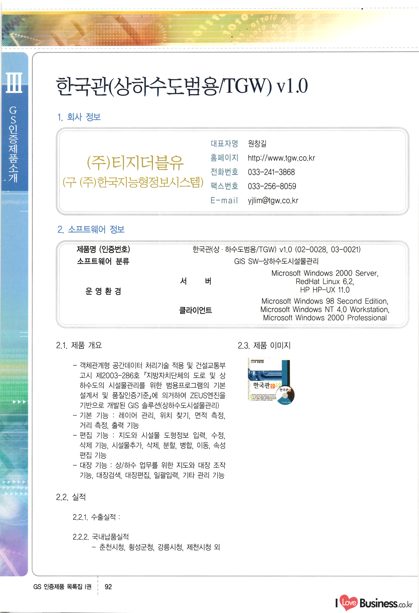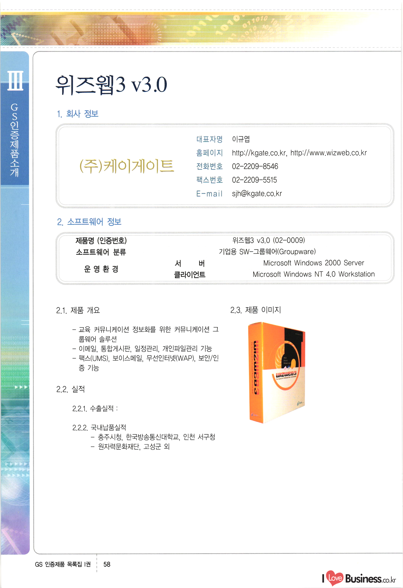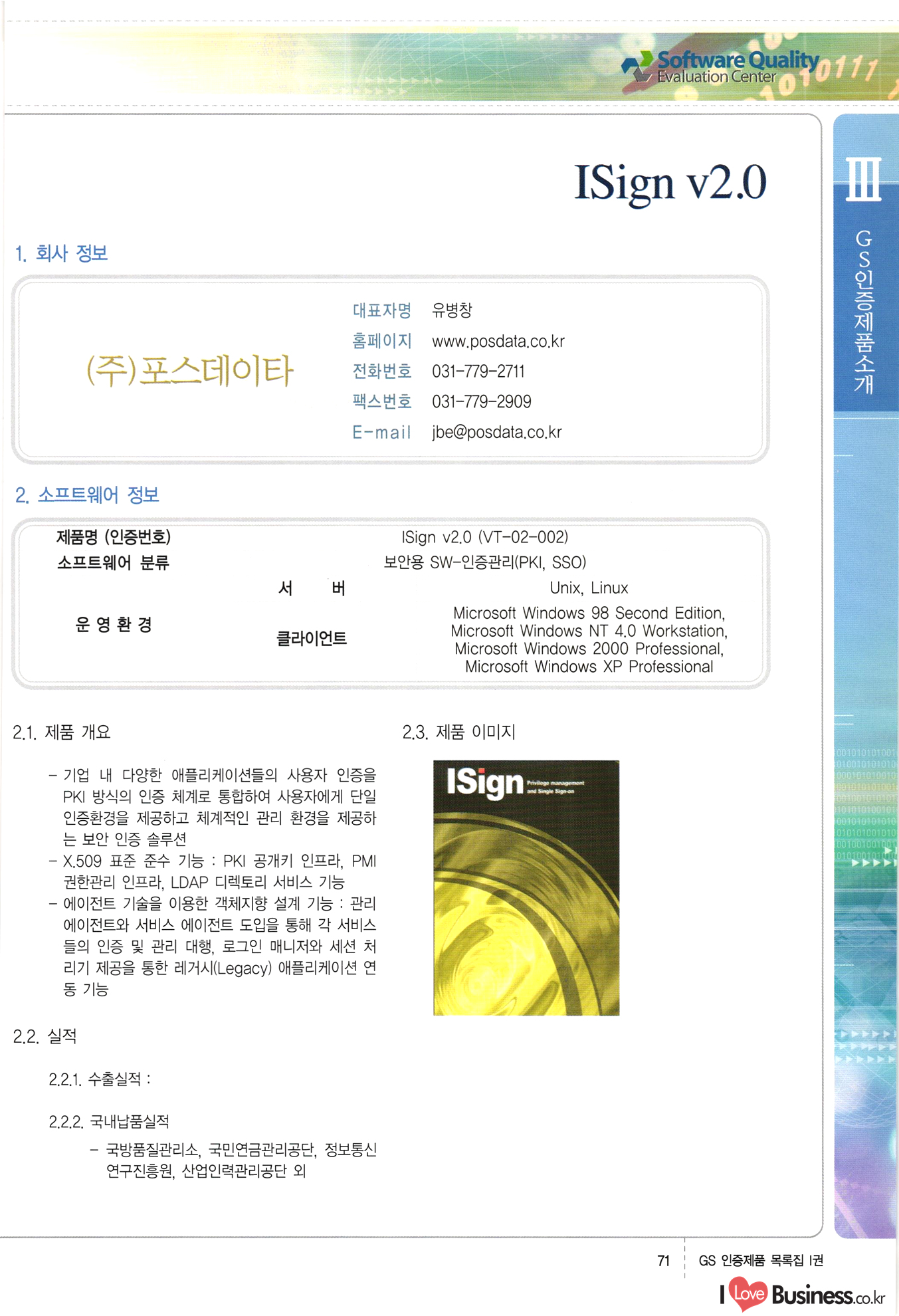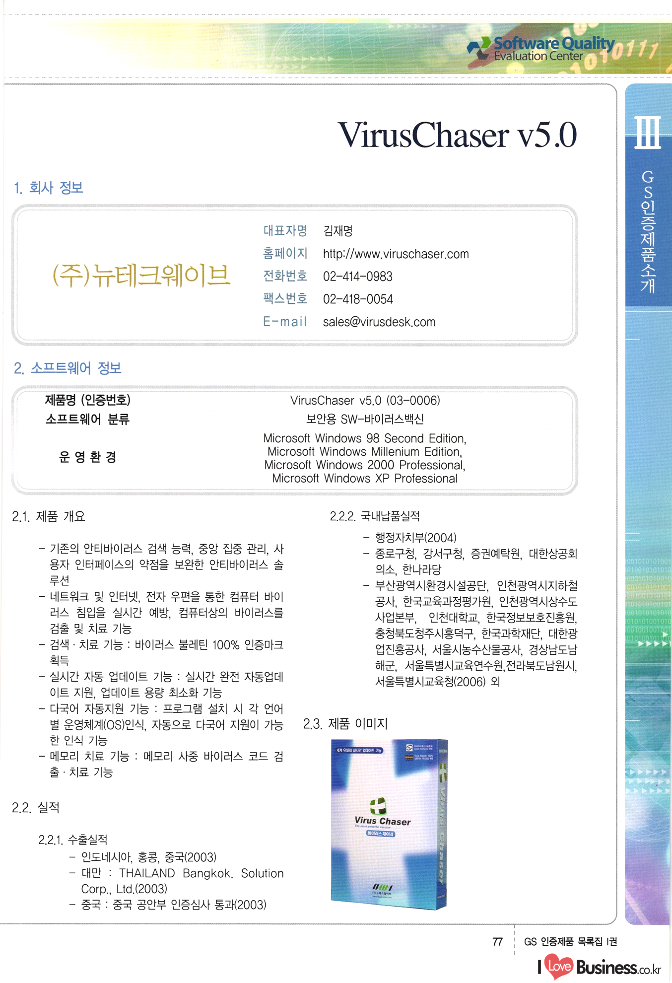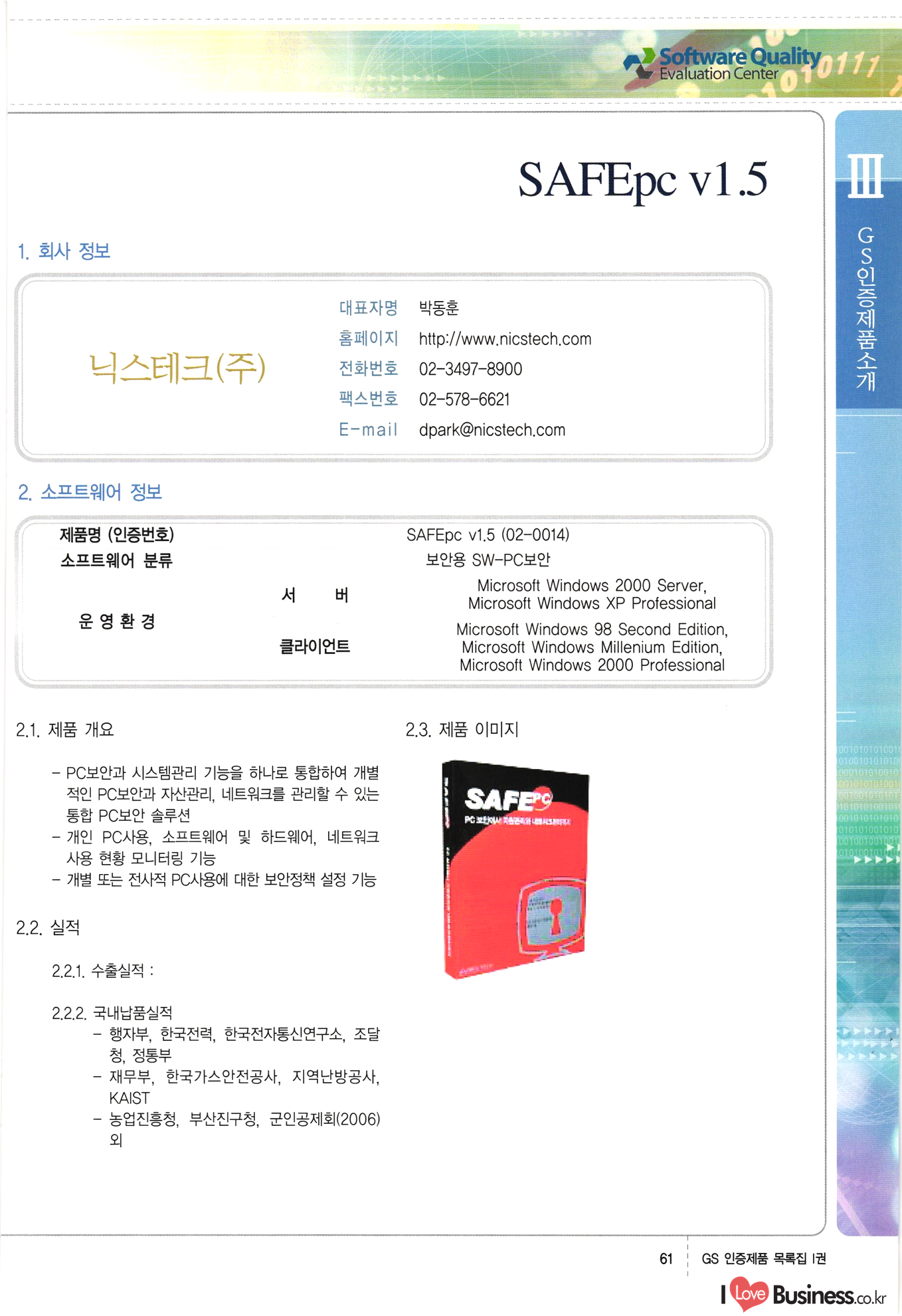 | III. GS 인증제품 목록 | 권-페이지번호 | 권-페이지번호 VT : VeriTest 국제 인증 GS인증제품목록 회사명 삼성에스디에스(주) 제품. EasyBase v4.1 페이지 50 1 제이엔에스 3DM Survey System v1.0 2 | 51 1 (주)싸이웍스 (주)테크다임 (주)다보넷 (주)로지스인포 CyberWALL 2000 v2.16 Jword v1.5 Touchsign v 2.1 키퍼엣홈 v1.0 78 52 (주)미래에듀테크 아이버스 v1.0 53 54 55 56 57 번호 | 인증번호 | 인증일자 01-0001 | 2001.07.25 101-0002 2001.10.22 (02-0027) | 01-0003 | 2001.11.27 | 01-0004 | 2001.11.27 | 01-0005 2001.11.27 5 | 01-0006 | 2001.12.27 02-0001 (02-0029) 2002.01.29 16 | | 02-0002 1 | 2002.02.16 | 02-0003 | 2002.02.16 02-0004 2002.02.27 9 | 02-0005 | 2002.02.27 110 | | 02-0006 | 2002.03.27 11 | || 02-0007 | 2002.03.27 | 02-0008 | 2002.04.30 | 02-0009 | 2002.04.30 | 02-0010 | 2002.04.30 15. | 02-0011 | 2002.04.30 16 102-0012 | 2002.04.30 | 17 | 02-0013 | 2002.05.30 | 18 | 02-0014 | 2002.05.30 | 02-0015 2002.06.28 | 20 | 02-0016 | 2002.06.28 02-0017 1 2002.06.28 | 02-0018 1 | 2002.06.28 23 | 02-0019 | 2002.06.28 24 02-0020 | 2002.07.31 25 | 02-0021 | 2002.07.31 224 58 14 59 118 (주)마크애니 (주)핸디소프트 (주)슈퍼테크놀러지 (주)스펙트라 이래정보시스템(주) (주)컴리빙아이티 | (주)시큐브 (주)케이게이트 (주)소프트4소프트 스페이스인터네셔널(주) (주)컴리빙아이티 (주)그린벨시스템즈 닉스테크(주) 심플소프트 (주)한국데이타비즈네스 (주)테크다임 (주)수세리눅스코리아 (주)한컴리눅스 소프트온넷(주) 와우리눅스(주) 60 61 Document Safer v1.0 | BizFlow Groupware v3.21 | Eg columbus || v1.0 | | eNomix v1.0 Blue Eyes v3.0 i-Class Five v1.05 Secuve TOS WG v1.0 위즈웹3 v3.0 RESORT v1.01 CD Tower v2.0 i-Class One2one v1.05 MANTIS-Professional v1.0 | | SAFEpc v1.5 Simple Gallery v1.00 통합카드발급프로그램 v1.0 Techdigm JCalc v2.0 Suse Linux 7.1K Professional Hancom Linux OS 2.2 Professional | Z!Stream v2.0 와우리눅스 7.1 파란 Secuve TOS WG Agent (Secuve Tos WG Manager) | SMERP v1.1 상하수도범용/ZEUS v1.0 U-Solver v1.0 dDIMS v3.0 DAL v2.5 101010101 1000 101003010101 190 1001010101 21 78. 122 | UL 63 64 65 26 | VT-02-001 | 2002.08.29 (주)시큐브 224 27 1 66 67 | 28 29 130 | 02-0022 | 2002.08.30 | 02-0023 | 2002.10.31 | 02-0024 | 2002.10.31 | 02-0025 | 2002.11.27 | 02-0026 | 2002.11.27 02-0027 (01-0002) 2002.11.27 | 02-0028 (03-0021) 2002.12.09 | 대한상공회의소 한국통신데이타(주) (주)지노시스템 유니온정보시스템(주) (주) 스 68 69 | 70 311 제이엔에스 소프트(구 제이엔에스) 3DM Survey System v1.0 (주)한국지능형정보시스템 한국관(상하수도 범용/TGW) v1.00 92 GS 인증제품 목록집 1권 | 26 I Love Business.co.kr Software Quality, 111 Evaluation Center | 권-페이지번호 II권페이지번호 VT : VeriTest 국제 인증 페이지 회사명 (주)포스데이타 제품 | iSign v2.0 | GS인증제품목록 171 | 34 | 02-0029 (주)제이슨테크(구 미래에듀테크) 아이버스 v1.0 91 72 73. 74 (주)인텔리젼스웨어 (주)하나디에스디 (주)연성정보기술 (주)포스정보 (주)켈코인 (주)포스데이타 스페이스인터내셔널 연희정보통신(주) (주)뉴테크웨이브 c-napse(GSS) v1.0 Life EduBuilder v1.0 | Email+ v3.0 1 책꽃이KDC v3.1 Challenger Webzine Webschool v3.0 1 Biz Binder v1.0 CD-Tower v3.1 상하수도 범용/UFCom v1.0 | | VirusChaser v5.0 | 175 76 118. (주)웨어벨리 Orange for ORACLE v2.2 | 번호 | 인증번호 | 인증일자 | 33 |VT-02-0022002.12.12 | | 2002.12.24 (02-0001) 35 | VT-02-003 | 2002.12.30 | 36 | 03-0001 | 2003.02.28 37. 03-0002 | 2003.02.28 | 38 | 03-0003 | 2003.02.28 | 39 | 03-0004 | 2003.02.28 40 | VT-03-001 | 2003.03.10 41 | VT-03-002) 2003.03.10 1 42 | 03-0005 | 2003.04.07 43 | 03-0006 | 2003.04.07 03-0007 2003.04.30 (03-0026) | 03-0008 | 2003.04.30 45 | 03-0009 | 2003.04.30 | 03-0010 | 2003.04.30 | 47 | 03-0011 | 2003.04.30 | 48 VT-03-003 2003.05.26 49 | 03-0012 | 2003.06.05 | 50 | 03-0013 | 2003.06.05 | 51 | 03-0014 | 2003.06.05 | 52 | 03-0015 | 2003.07.10 | 53 | 03-0016 | 2003.07.10 | 54 | 03-0017 | 2003.07.10 | | 55 | 03-0018 | 2003.07.10 | 56 | 03-0019 | 2003.08.06 57 | | 03-0020 | 2003.08.06 44 1 18 46 80 81 82 83 | (주)테크다임 (주)엔지스테크널러지 삼성에스디에스(주) 삼성에스디에스(주) (주)미디어랜드 인터컴소프트웨어(주) 에스케이씨앤씨(주) 아이티로직스(주) (주)에이씨티소프트 (주)위즈북 (주)에스오엔코리아 (주)아리수미디어 한진정보통신(주) (주)인텔리전스웨어 (주)웨어밸리 (구 (주)오알솔루션즈코리아) Techdigm Office v2.0 | G-Solution Waterworks/Sewerage v1.0 | | 79 UniCITY Standard v1.0 UniCITY Enterprise v1.0 TCO!stream 2002 v4.0 | ServerGuard v3.0 | SK-UPEX v1.0 84 NexWeb v1.2 e-Library Deluxe v4.1.5 86 DL Pro v1.0 SiR v1.01 파워CD뱅크 v4.0 89 InfoMatrix v1.00 190 Bizpus v1.0 91 85 87 88 10010010101.03 1101010100101 1100100100107 58 |VT-03-004 2003.08.12 Orange for ORACLE v2.2 | 111 59 (주)티지더블유 (구 한국지능형정보시스템) 한국관(상하수도 범용/TGW) v1.0 92 93 GIS Free v1.0 DeskPlus v2.0 1 | 94 ArcCITY v1.0 110 03-0021 (02-0028) | 2003.09.04 | 60 | 03-0022 | 2003.09.30 03-0023 | 2003.09.30 03-0024 (04-0011) | 2003.09.30 | 03-0025 | 2003.09.30 03-0026 (03-0007) | 2003.10.07 63 | 03-0027 | 2003.11.12 64 | 03-0028 | 2003.11.12 622 세광정보시스템(주) 제오스페이스(주) (주)선도소프트 (구 (주)캐드랜드) 중앙항업(주) (주)웨어밸리 (구 (주)오알솔루션즈코리아) (주)우암닷컴 (주)오투라인 geoCUBE상하수도 v1.0 95 Orange for ORACLE V2.2 111 96 RAVCOMS Eyecon v4.0 오투스쿨 v2.01 97 GS 인증제품 목록집 1권 I Love Business.co.kr | 권-페이지번호 | 권 - 페이지번호 VT : VeriTest 국제 인증 번호 페이지 회사명 소프트캠프