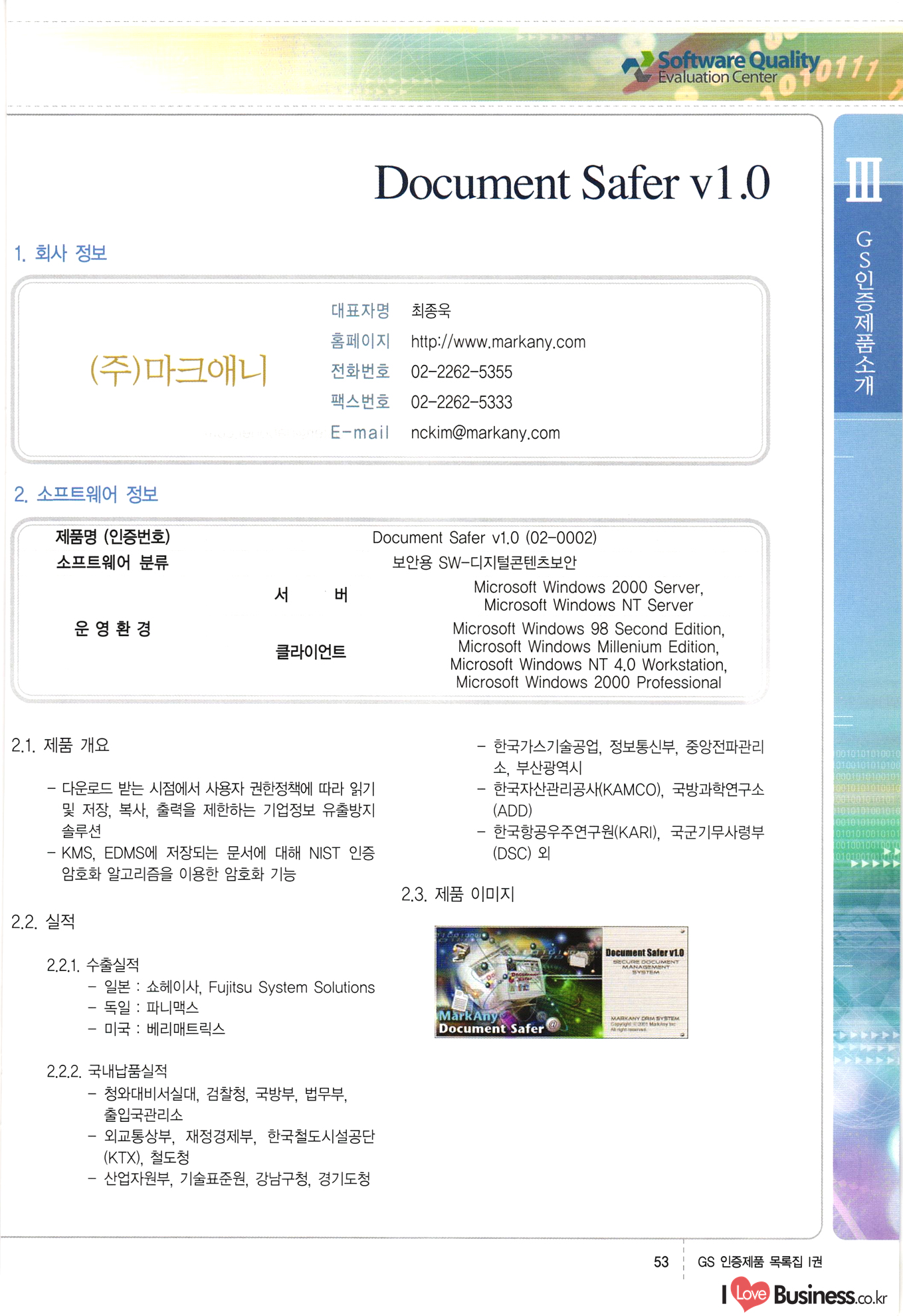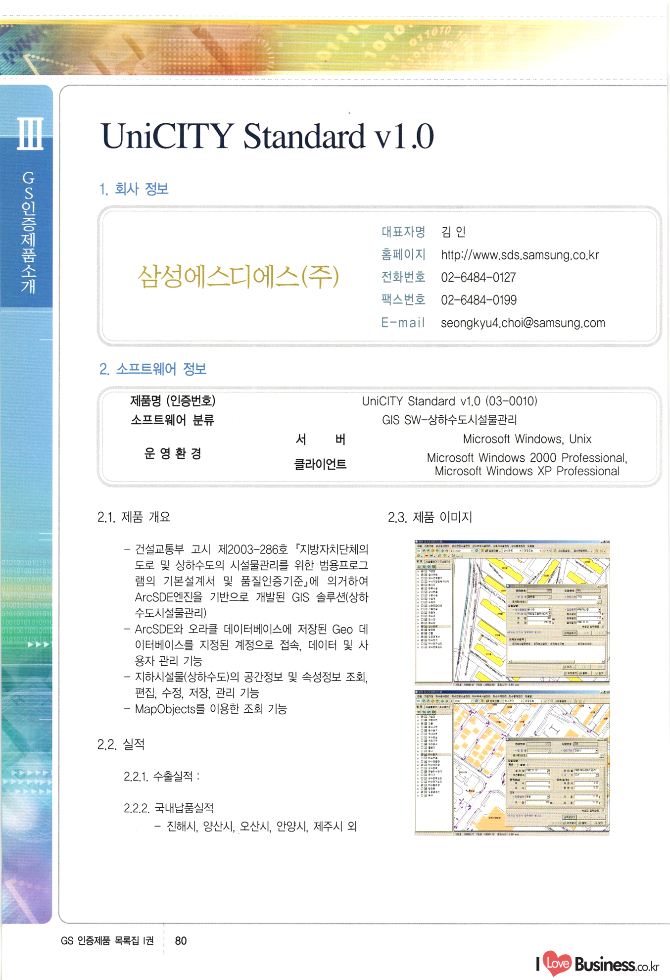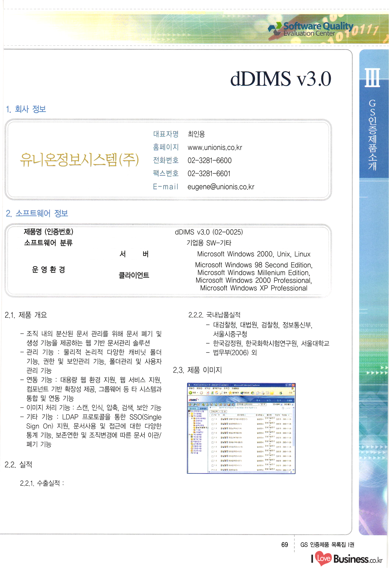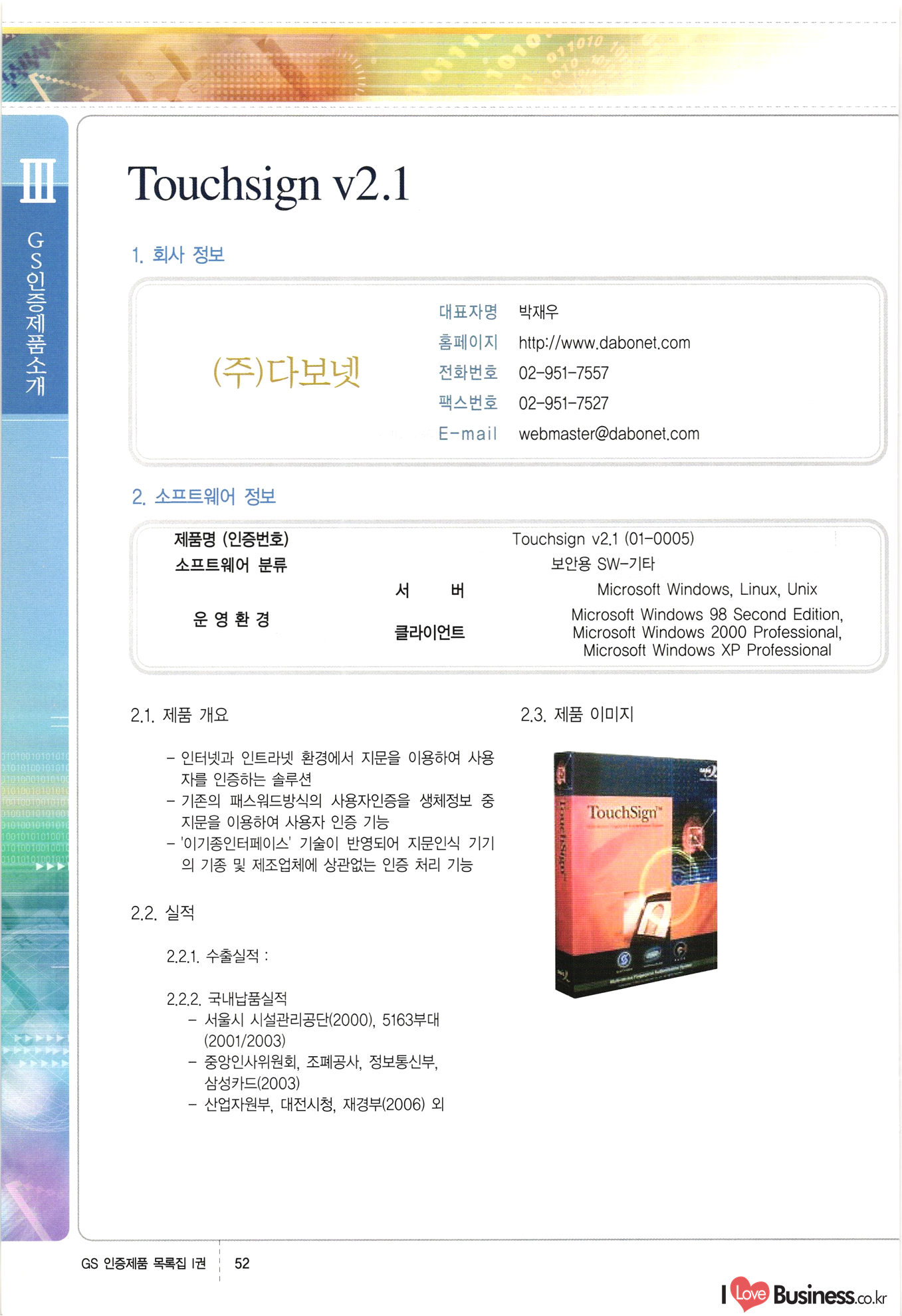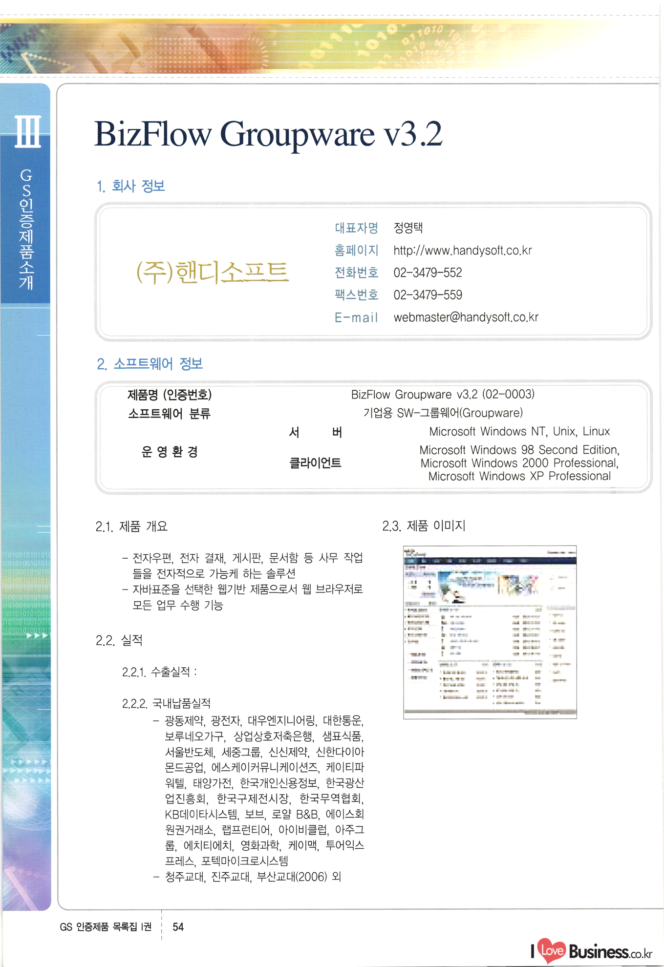 | III. GS 인증제품 목록 | 권-페이지번호 | 권-페이지번호 VT : VeriTest 국제 인증 GS인증제품목록 회사명 삼성에스디에스(주) 제품. EasyBase v4.1 페이지 50 1 제이엔에스 3DM Survey System v1.0 2 | 51 1 (주)싸이웍스 (주)테크다임 (주)다보넷 (주)로지스인포 CyberWALL 2000 v2.16 Jword v1.5 Touchsign v 2.1 키퍼엣홈 v1.0 78 52 (주)미래에듀테크 아이버스 v1.0 53 54 55 56 57 번호 | 인증번호 | 인증일자 01-0001 | 2001.07.25 101-0002 2001.10.22 (02-0027) | 01-0003 | 2001.11.27 | 01-0004 | 2001.11.27 | 01-0005 2001.11.27 5 | 01-0006 | 2001.12.27 02-0001 (02-0029) 2002.01.29 16 | | 02-0002 1 | 2002.02.16 | 02-0003 | 2002.02.16 02-0004 2002.02.27 9 | 02-0005 | 2002.02.27 110 | | 02-0006 | 2002.03.27 11 | || 02-0007 | 2002.03.27 | 02-0008 | 2002.04.30 | 02-0009 | 2002.04.30 | 02-0010 | 2002.04.30 15. | 02-0011 | 2002.04.30 16 102-0012 | 2002.04.30 | 17 | 02-0013 | 2002.05.30 | 18 | 02-0014 | 2002.05.30 | 02-0015 2002.06.28 | 20 | 02-0016 | 2002.06.28 02-0017 1 2002.06.28 | 02-0018 1 | 2002.06.28 23 | 02-0019 | 2002.06.28 24 02-0020 | 2002.07.31 25 | 02-0021 | 2002.07.31 224 58 14 59 118 (주)마크애니 (주)핸디소프트 (주)슈퍼테크놀러지 (주)스펙트라 이래정보시스템(주) (주)컴리빙아이티 | (주)시큐브 (주)케이게이트 (주)소프트4소프트 스페이스인터네셔널(주) (주)컴리빙아이티 (주)그린벨시스템즈 닉스테크(주) 심플소프트 (주)한국데이타비즈네스 (주)테크다임 (주)수세리눅스코리아 (주)한컴리눅스 소프트온넷(주) 와우리눅스(주) 60 61 Document Safer v1.0 | BizFlow Groupware v3.21 | Eg columbus || v1.0 | | eNomix v1.0 Blue Eyes v3.0 i-Class Five v1.05 Secuve TOS WG v1.0 위즈웹3 v3.0 RESORT v1.01 CD Tower v2.0 i-Class One2one v1.05 MANTIS-Professional v1.0 | | SAFEpc v1.5 Simple Gallery v1.00 통합카드발급프로그램 v1.0 Techdigm JCalc v2.0 Suse Linux 7.1K Professional Hancom Linux OS 2.2 Professional | Z!Stream v2.0 와우리눅스 7.1 파란 Secuve TOS WG Agent (Secuve Tos WG Manager) | SMERP v1.1 상하수도범용/ZEUS v1.0 U-Solver v1.0 dDIMS v3.0 DAL v2.5 101010101 1000 101003010101 190 1001010101 21 78. 122 | UL 63 64 65 26 | VT-02-001 | 2002.08.29 (주)시큐브 224 27 1 66 67 | 28 29 130 | 02-0022 | 2002.08.30 | 02-0023 | 2002.10.31 | 02-0024 | 2002.10.31 | 02-0025 | 2002.11.27 | 02-0026 | 2002.11.27 02-0027 (01-0002) 2002.11.27 | 02-0028 (03-0021) 2002.12.09 | 대한상공회의소 한국통신데이타(주) (주)지노시스템 유니온정보시스템(주) (주) 스 68 69 | 70 311 제이엔에스 소프트(구 제이엔에스) 3DM Survey System v1.0 (주)한국지능형정보시스템 한국관(상하수도 범용/TGW) v1.00 92 GS 인증제품 목록집 1권 | 26 I Love Business.co.kr Software Quality, 111 Evaluation Center | 권-페이지번호 II권페이지번호 VT : VeriTest 국제 인증 페이지 회사명 (주)포스데이타 제품 | iSign v2.0 | GS인증제품목록 171 | 34 | 02-0029 (주)제이슨테크(구 미래에듀테크) 아이버스 v1.0 91 72 73. 74 (주)인텔리젼스웨어 (주)하나디에스디 (주)연성정보기술 (주)포스정보 (주)켈코인 (주)포스데이타 스페이스인터내셔널 연희정보통신(주) (주)뉴테크웨이브 c-napse(GSS) v1.0 Life EduBuilder v1.0 | Email+ v3.0 1 책꽃이KDC v3.1 Challenger Webzine Webschool v3.0 1 Biz Binder v1.0 CD-Tower v3.1 상하수도 범용/UFCom v1.0 | | VirusChaser v5.0 | 175 76 118. (주)웨어벨리 Orange for ORACLE v2.2 | 번호 | 인증번호 | 인증일자 | 33 |VT-02-0022002.12.12 | | 2002.12.24 (02-0001) 35 | VT-02-003 | 2002.12.30 | 36 | 03-0001 | 2003.02.28 37. 03-0002 | 2003.02.28 | 38 | 03-0003 | 2003.02.28 | 39 | 03-0004 | 2003.02.28 40 | VT-03-001 | 2003.03.10 41 | VT-03-002) 2003.03.10 1 42 | 03-0005 | 2003.04.07 43 | 03-0006 | 2003.04.07 03-0007 2003.04.30 (03-0026) | 03-0008 | 2003.04.30 45 | 03-0009 | 2003.04.30 | 03-0010 | 2003.04.30 | 47 | 03-0011 | 2003.04.30 | 48 VT-03-003 2003.05.26 49 | 03-0012 | 2003.06.05 | 50 | 03-0013 | 2003.06.05 | 51 | 03-0014 | 2003.06.05 | 52 | 03-0015 | 2003.07.10 | 53 | 03-0016 | 2003.07.10 | 54 | 03-0017 | 2003.07.10 | | 55 | 03-0018 | 2003.07.10 | 56 | 03-0019 | 2003.08.06 57 | | 03-0020 | 2003.08.06 44 1 18 46 80 81 82 83 | (주)테크다임 (주)엔지스테크널러지 삼성에스디에스(주) 삼성에스디에스(주) (주)미디어랜드 인터컴소프트웨어(주) 에스케이씨앤씨(주) 아이티로직스(주) (주)에이씨티소프트 (주)위즈북 (주)에스오엔코리아 (주)아리수미디어 한진정보통신(주) (주)인텔리전스웨어 (주)웨어밸리 (구 (주)오알솔루션즈코리아) Techdigm Office v2.0 | G-Solution Waterworks/Sewerage v1.0 | | 79 UniCITY Standard v1.0 UniCITY Enterprise v1.0 TCO!stream 2002 v4.0 | ServerGuard v3.0 | SK-UPEX v1.0 84 NexWeb v1.2 e-Library Deluxe v4.1.5 86 DL Pro v1.0 SiR v1.01 파워CD뱅크 v4.0 89 InfoMatrix v1.00 190 Bizpus v1.0 91 85 87 88 10010010101.03 1101010100101 1100100100107 58 |VT-03-004 2003.08.12 Orange for ORACLE v2.2 | 111 59 (주)티지더블유 (구 한국지능형정보시스템) 한국관(상하수도 범용/TGW) v1.0 92 93 GIS Free v1.0 DeskPlus v2.0 1 | 94 ArcCITY v1.0 110 03-0021 (02-0028) | 2003.09.04 | 60 | 03-0022 | 2003.09.30 03-0023 | 2003.09.30 03-0024 (04-0011) | 2003.09.30 | 03-0025 | 2003.09.30 03-0026 (03-0007) | 2003.10.07 63 | 03-0027 | 2003.11.12 64 | 03-0028 | 2003.11.12 622 세광정보시스템(주) 제오스페이스(주) (주)선도소프트 (구 (주)캐드랜드) 중앙항업(주) (주)웨어밸리 (구 (주)오알솔루션즈코리아) (주)우암닷컴 (주)오투라인 geoCUBE상하수도 v1.0 95 Orange for ORACLE V2.2 111 96 RAVCOMS Eyecon v4.0 오투스쿨 v2.01 97 GS 인증제품 목록집 1권 I Love Business.co.kr | 권-페이지번호 | 권 - 페이지번호 VT : VeriTest 국제 인증 번호 페이지 회사명 소프트캠프