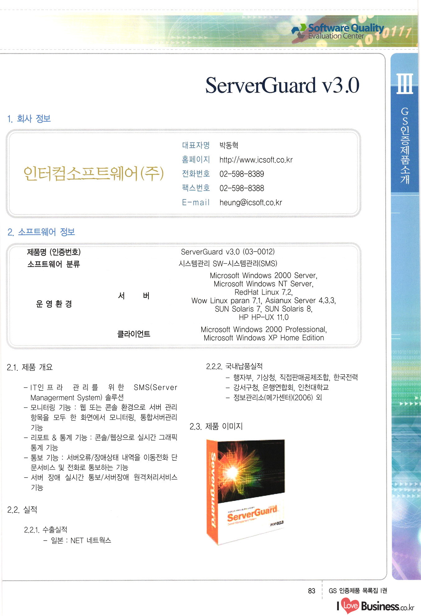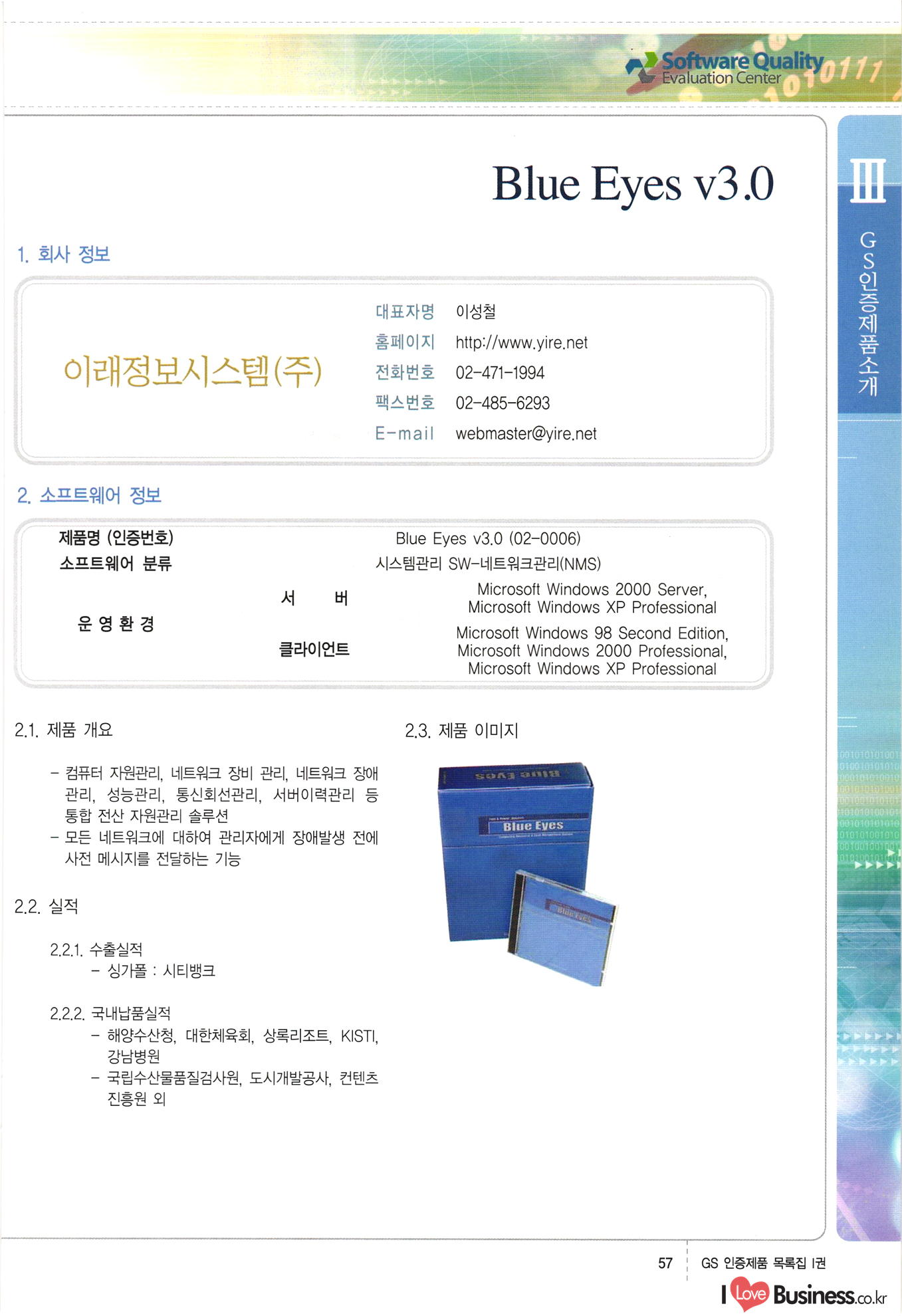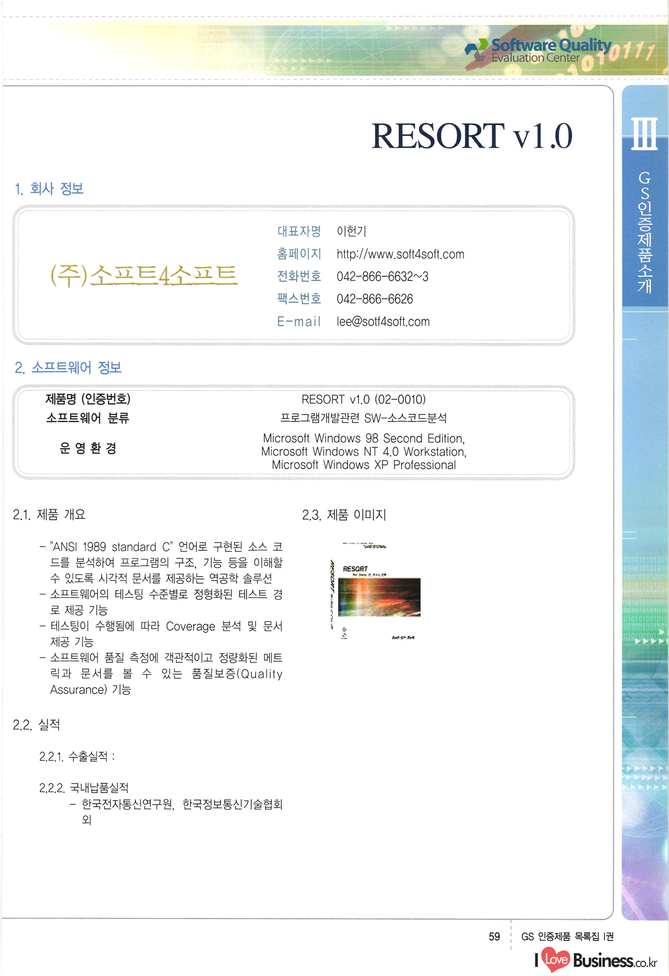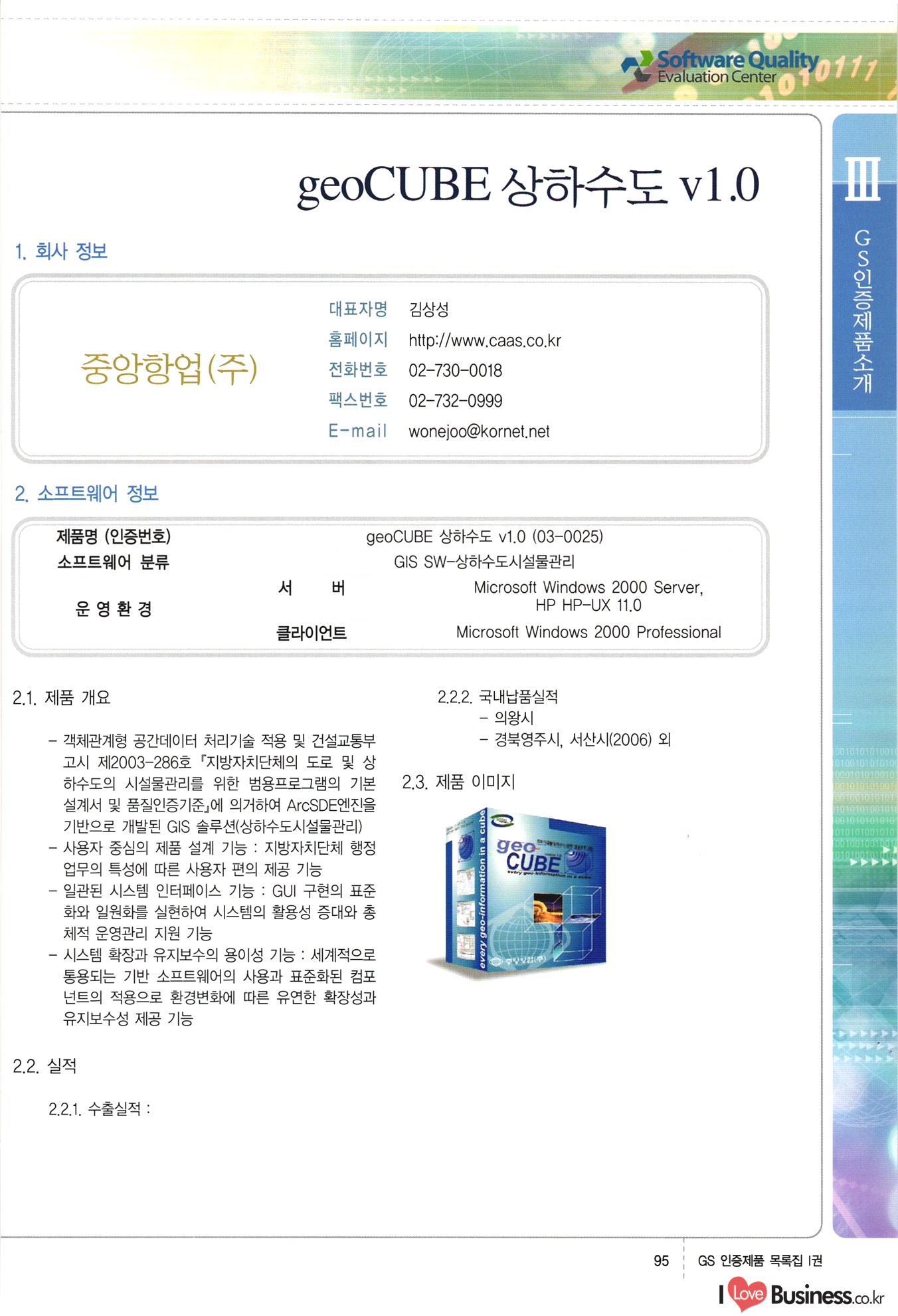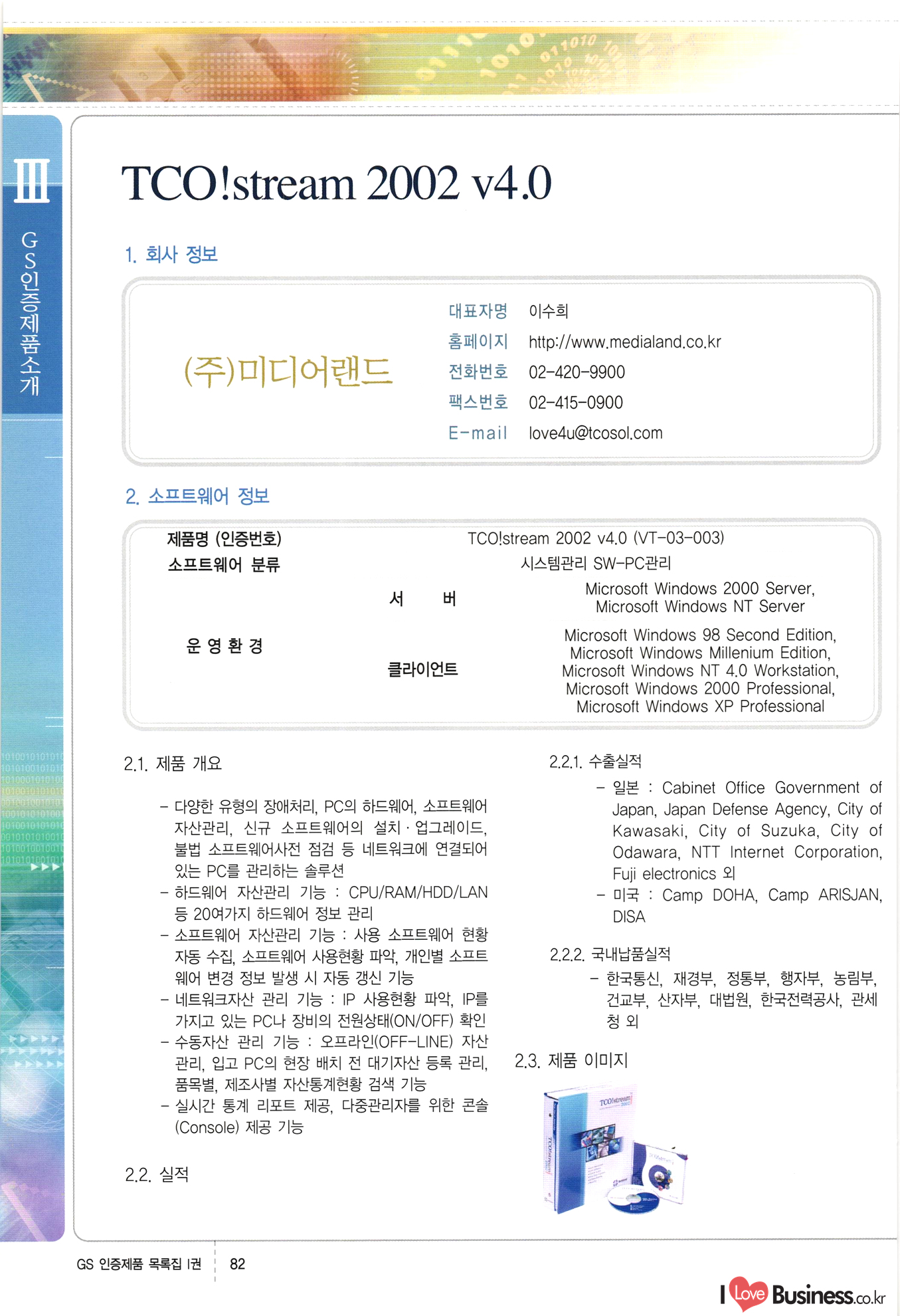 | III. GS 인증제품 목록 | 권-페이지번호 | 권-페이지번호 VT : VeriTest 국제 인증 GS인증제품목록 회사명 삼성에스디에스(주) 제품. EasyBase v4.1 페이지 50 1 제이엔에스 3DM Survey System v1.0 2 | 51 1 (주)싸이웍스 (주)테크다임 (주)다보넷 (주)로지스인포 CyberWALL 2000 v2.16 Jword v1.5 Touchsign v 2.1 키퍼엣홈 v1.0 78 52 (주)미래에듀테크 아이버스 v1.0 53 54 55 56 57 번호 | 인증번호 | 인증일자 01-0001 | 2001.07.25 101-0002 2001.10.22 (02-0027) | 01-0003 | 2001.11.27 | 01-0004 | 2001.11.27 | 01-0005 2001.11.27 5 | 01-0006 | 2001.12.27 02-0001 (02-0029) 2002.01.29 16 | | 02-0002 1 | 2002.02.16 | 02-0003 | 2002.02.16 02-0004 2002.02.27 9 | 02-0005 | 2002.02.27 110 | | 02-0006 | 2002.03.27 11 | || 02-0007 | 2002.03.27 | 02-0008 | 2002.04.30 | 02-0009 | 2002.04.30 | 02-0010 | 2002.04.30 15. | 02-0011 | 2002.04.30 16 102-0012 | 2002.04.30 | 17 | 02-0013 | 2002.05.30 | 18 | 02-0014 | 2002.05.30 | 02-0015 2002.06.28 | 20 | 02-0016 | 2002.06.28 02-0017 1 2002.06.28 | 02-0018 1 | 2002.06.28 23 | 02-0019 | 2002.06.28 24 02-0020 | 2002.07.31 25 | 02-0021 | 2002.07.31 224 58 14 59 118 (주)마크애니 (주)핸디소프트 (주)슈퍼테크놀러지 (주)스펙트라 이래정보시스템(주) (주)컴리빙아이티 | (주)시큐브 (주)케이게이트 (주)소프트4소프트 스페이스인터네셔널(주) (주)컴리빙아이티 (주)그린벨시스템즈 닉스테크(주) 심플소프트 (주)한국데이타비즈네스 (주)테크다임 (주)수세리눅스코리아 (주)한컴리눅스 소프트온넷(주) 와우리눅스(주) 60 61 Document Safer v1.0 | BizFlow Groupware v3.21 | Eg columbus || v1.0 | | eNomix v1.0 Blue Eyes v3.0 i-Class Five v1.05 Secuve TOS WG v1.0 위즈웹3 v3.0 RESORT v1.01 CD Tower v2.0 i-Class One2one v1.05 MANTIS-Professional v1.0 | | SAFEpc v1.5 Simple Gallery v1.00 통합카드발급프로그램 v1.0 Techdigm JCalc v2.0 Suse Linux 7.1K Professional Hancom Linux OS 2.2 Professional | Z!Stream v2.0 와우리눅스 7.1 파란 Secuve TOS WG Agent (Secuve Tos WG Manager) | SMERP v1.1 상하수도범용/ZEUS v1.0 U-Solver v1.0 dDIMS v3.0 DAL v2.5 101010101 1000 101003010101 190 1001010101 21 78. 122 | UL 63 64 65 26 | VT-02-001 | 2002.08.29 (주)시큐브 224 27 1 66 67 | 28 29 130 | 02-0022 | 2002.08.30 | 02-0023 | 2002.10.31 | 02-0024 | 2002.10.31 | 02-0025 | 2002.11.27 | 02-0026 | 2002.11.27 02-0027 (01-0002) 2002.11.27 | 02-0028 (03-0021) 2002.12.09 | 대한상공회의소 한국통신데이타(주) (주)지노시스템 유니온정보시스템(주) (주) 스 68 69 | 70 311 제이엔에스 소프트(구 제이엔에스) 3DM Survey System v1.0 (주)한국지능형정보시스템 한국관(상하수도 범용/TGW) v1.00 92 GS 인증제품 목록집 1권 | 26 I Love Business.co.kr Software Quality, 111 Evaluation Center | 권-페이지번호 II권페이지번호 VT : VeriTest 국제 인증 페이지 회사명 (주)포스데이타 제품 | iSign v2.0 | GS인증제품목록 171 | 34 | 02-0029 (주)제이슨테크(구 미래에듀테크) 아이버스 v1.0 91 72 73. 74 (주)인텔리젼스웨어 (주)하나디에스디 (주)연성정보기술 (주)포스정보 (주)켈코인 (주)포스데이타 스페이스인터내셔널 연희정보통신(주) (주)뉴테크웨이브 c-napse(GSS) v1.0 Life EduBuilder v1.0 | Email+ v3.0 1 책꽃이KDC v3.1 Challenger Webzine Webschool v3.0 1 Biz Binder v1.0 CD-Tower v3.1 상하수도 범용/UFCom v1.0 | | VirusChaser v5.0 | 175 76 118. (주)웨어벨리 Orange for ORACLE v2.2 | 번호 | 인증번호 | 인증일자 | 33 |VT-02-0022002.12.12 | | 2002.12.24 (02-0001) 35 | VT-02-003 | 2002.12.30 | 36 | 03-0001 | 2003.02.28 37. 03-0002 | 2003.02.28 | 38 | 03-0003 | 2003.02.28 | 39 | 03-0004 | 2003.02.28 40 | VT-03-001 | 2003.03.10 41 | VT-03-002) 2003.03.10 1 42 | 03-0005 | 2003.04.07 43 | 03-0006 | 2003.04.07 03-0007 2003.04.30 (03-0026) | 03-0008 | 2003.04.30 45 | 03-0009 | 2003.04.30 | 03-0010 | 2003.04.30 | 47 | 03-0011 | 2003.04.30 | 48 VT-03-003 2003.05.26 49 | 03-0012 | 2003.06.05 | 50 | 03-0013 | 2003.06.05 | 51 | 03-0014 | 2003.06.05 | 52 | 03-0015 | 2003.07.10 | 53 | 03-0016 | 2003.07.10 | 54 | 03-0017 | 2003.07.10 | | 55 | 03-0018 | 2003.07.10 | 56 | 03-0019 | 2003.08.06 57 | | 03-0020 | 2003.08.06 44 1 18 46 80 81 82 83 | (주)테크다임 (주)엔지스테크널러지 삼성에스디에스(주) 삼성에스디에스(주) (주)미디어랜드 인터컴소프트웨어(주) 에스케이씨앤씨(주) 아이티로직스(주) (주)에이씨티소프트 (주)위즈북 (주)에스오엔코리아 (주)아리수미디어 한진정보통신(주) (주)인텔리전스웨어 (주)웨어밸리 (구 (주)오알솔루션즈코리아) Techdigm Office v2.0 | G-Solution Waterworks/Sewerage v1.0 | | 79 UniCITY Standard v1.0 UniCITY Enterprise v1.0 TCO!stream 2002 v4.0 | ServerGuard v3.0 | SK-UPEX v1.0 84 NexWeb v1.2 e-Library Deluxe v4.1.5 86 DL Pro v1.0 SiR v1.01 파워CD뱅크 v4.0 89 InfoMatrix v1.00 190 Bizpus v1.0 91 85 87 88 10010010101.03 1101010100101 1100100100107 58 |VT-03-004 2003.08.12 Orange for ORACLE v2.2 | 111 59 (주)티지더블유 (구 한국지능형정보시스템) 한국관(상하수도 범용/TGW) v1.0 92 93 GIS Free v1.0 DeskPlus v2.0 1 | 94 ArcCITY v1.0 110 03-0021 (02-0028) | 2003.09.04 | 60 | 03-0022 | 2003.09.30 03-0023 | 2003.09.30 03-0024 (04-0011) | 2003.09.30 | 03-0025 | 2003.09.30 03-0026 (03-0007) | 2003.10.07 63 | 03-0027 | 2003.11.12 64 | 03-0028 | 2003.11.12 622 세광정보시스템(주) 제오스페이스(주) (주)선도소프트 (구 (주)캐드랜드) 중앙항업(주) (주)웨어밸리 (구 (주)오알솔루션즈코리아) (주)우암닷컴 (주)오투라인 geoCUBE상하수도 v1.0 95 Orange for ORACLE V2.2 111 96 RAVCOMS Eyecon v4.0 오투스쿨 v2.01 97 GS 인증제품 목록집 1권 I Love Business.co.kr | 권-페이지번호 | 권 - 페이지번호 VT : VeriTest 국제 인증 번호 페이지 회사명 소프트캠프