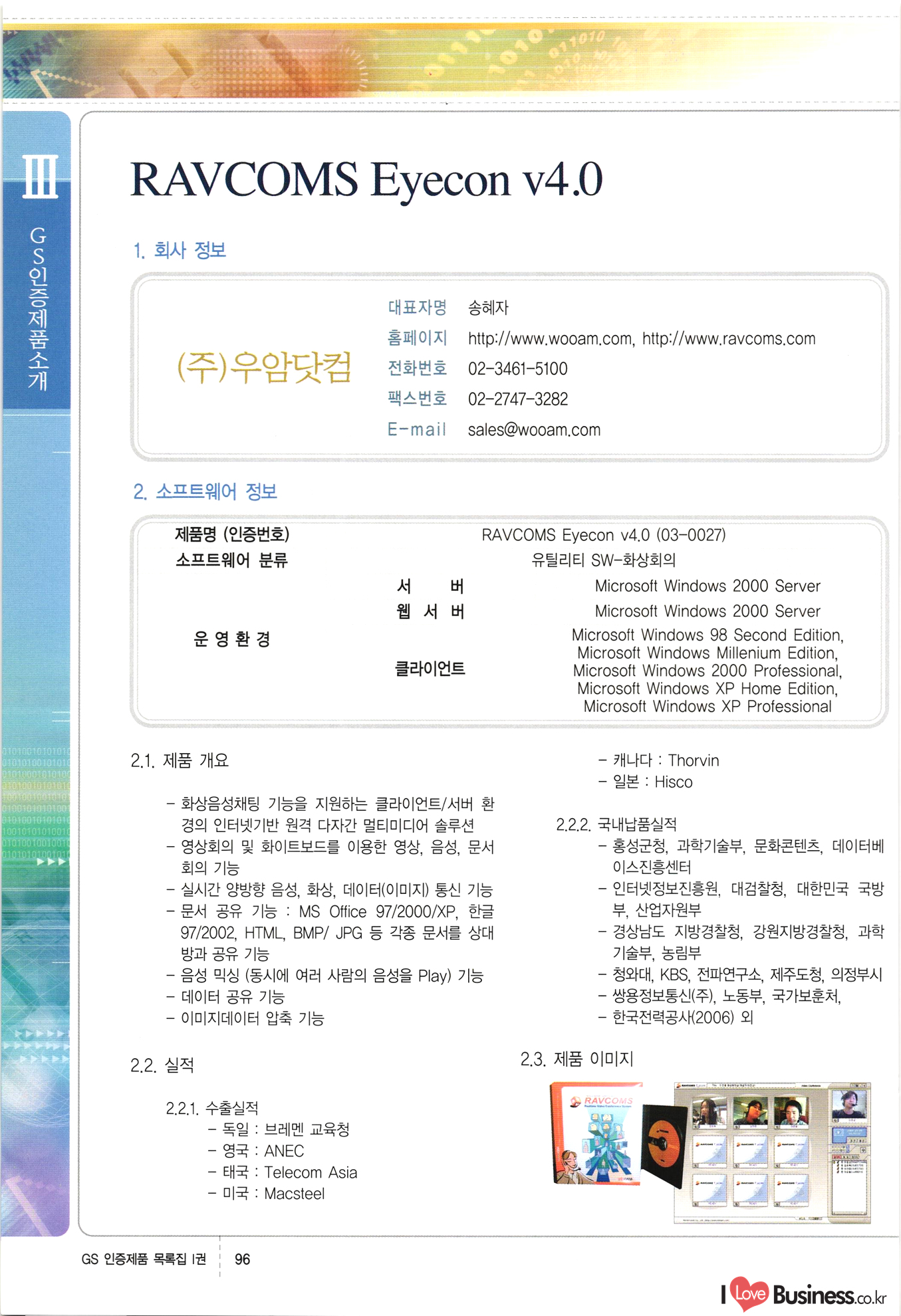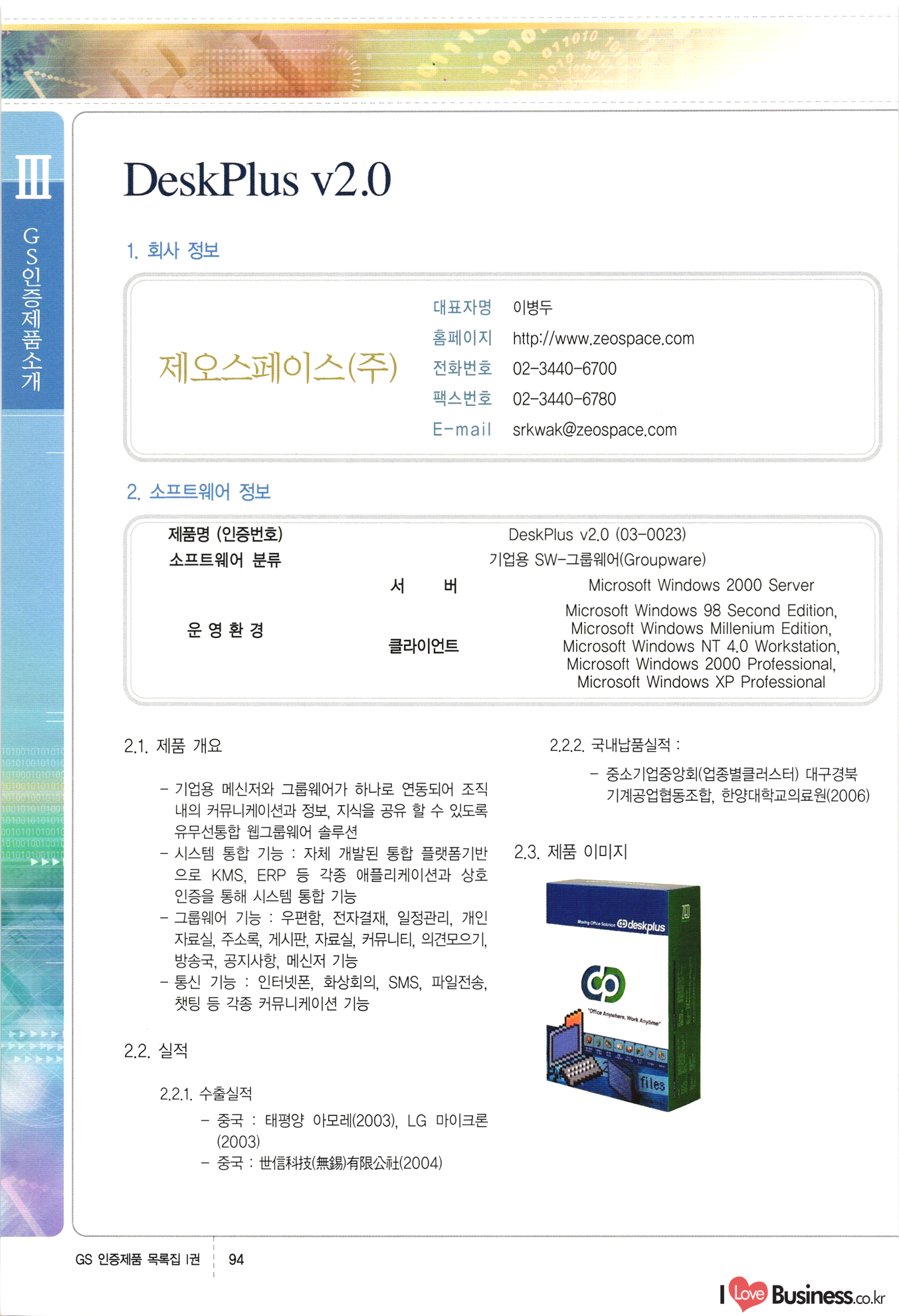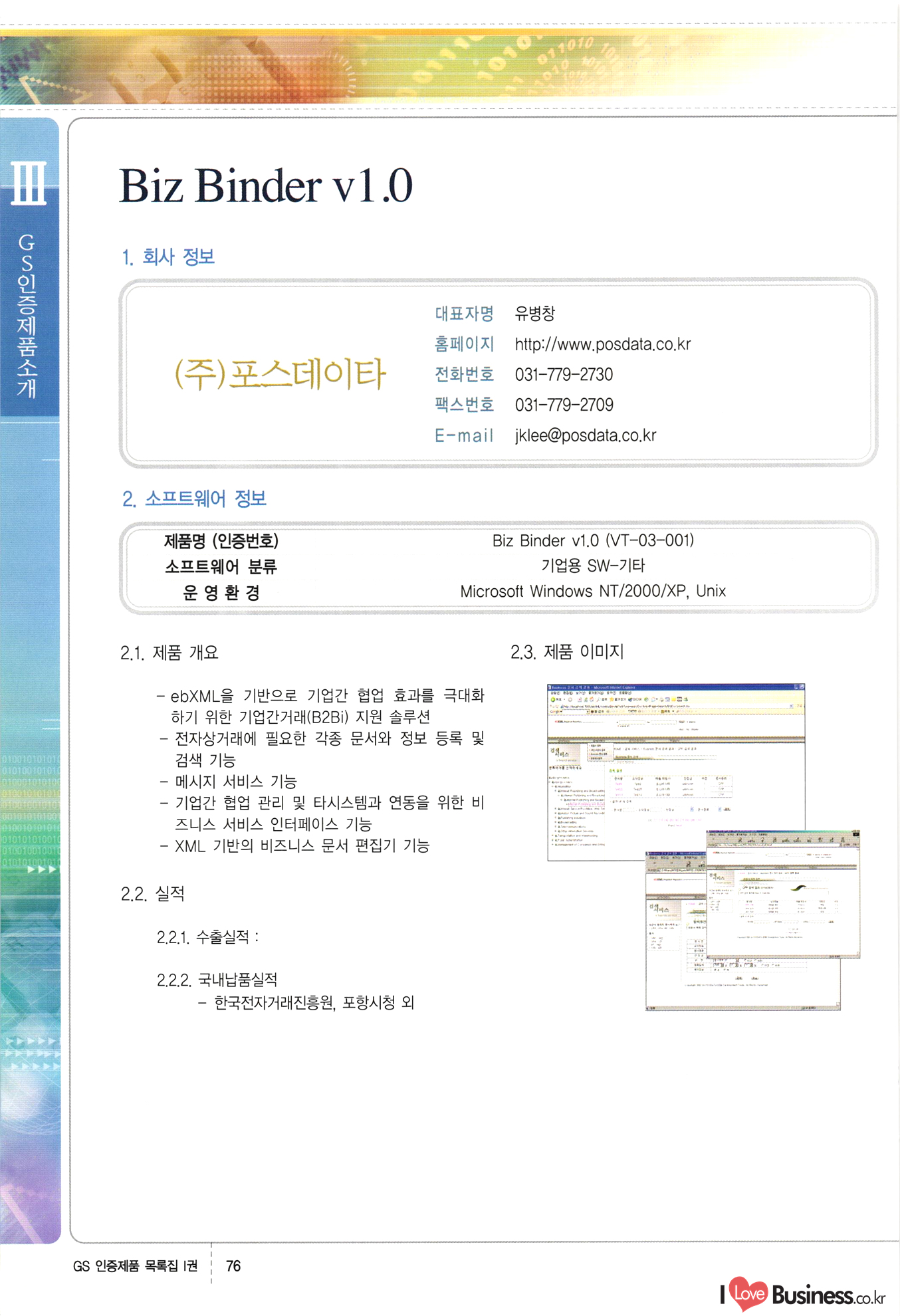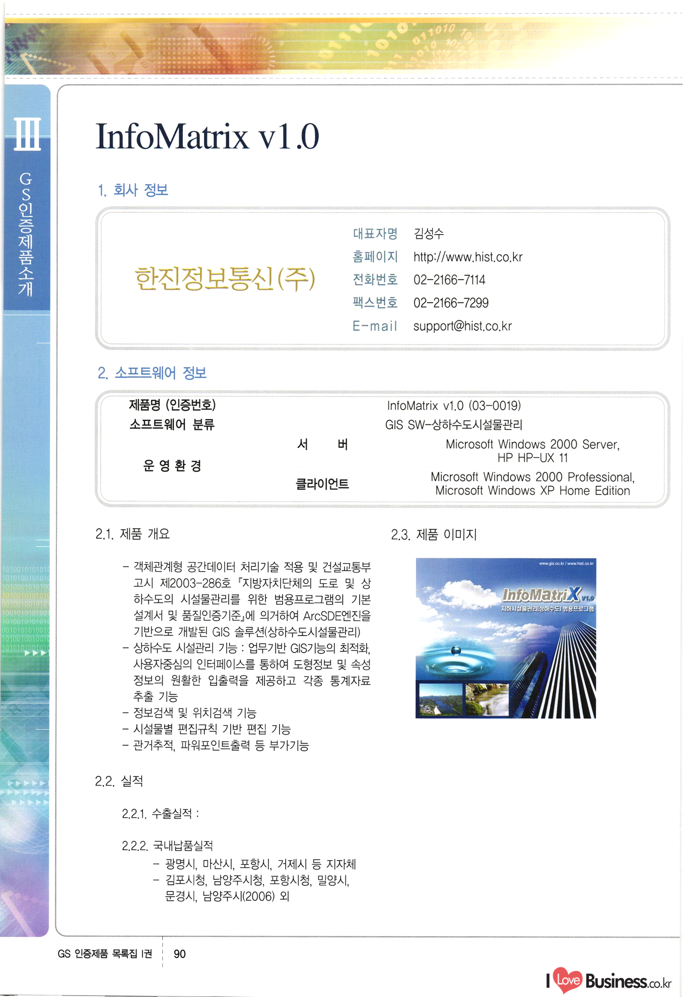 | III. GS 인증제품 목록 | 권-페이지번호 | 권-페이지번호 VT : VeriTest 국제 인증 GS인증제품목록 회사명 삼성에스디에스(주) 제품. EasyBase v4.1 페이지 50 1 제이엔에스 3DM Survey System v1.0 2 | 51 1 (주)싸이웍스 (주)테크다임 (주)다보넷 (주)로지스인포 CyberWALL 2000 v2.16 Jword v1.5 Touchsign v 2.1 키퍼엣홈 v1.0 78 52 (주)미래에듀테크 아이버스 v1.0 53 54 55 56 57 번호 | 인증번호 | 인증일자 01-0001 | 2001.07.25 101-0002 2001.10.22 (02-0027) | 01-0003 | 2001.11.27 | 01-0004 | 2001.11.27 | 01-0005 2001.11.27 5 | 01-0006 | 2001.12.27 02-0001 (02-0029) 2002.01.29 16 | | 02-0002 1 | 2002.02.16 | 02-0003 | 2002.02.16 02-0004 2002.02.27 9 | 02-0005 | 2002.02.27 110 | | 02-0006 | 2002.03.27 11 | || 02-0007 | 2002.03.27 | 02-0008 | 2002.04.30 | 02-0009 | 2002.04.30 | 02-0010 | 2002.04.30 15. | 02-0011 | 2002.04.30 16 102-0012 | 2002.04.30 | 17 | 02-0013 | 2002.05.30 | 18 | 02-0014 | 2002.05.30 | 02-0015 2002.06.28 | 20 | 02-0016 | 2002.06.28 02-0017 1 2002.06.28 | 02-0018 1 | 2002.06.28 23 | 02-0019 | 2002.06.28 24 02-0020 | 2002.07.31 25 | 02-0021 | 2002.07.31 224 58 14 59 118 (주)마크애니 (주)핸디소프트 (주)슈퍼테크놀러지 (주)스펙트라 이래정보시스템(주) (주)컴리빙아이티 | (주)시큐브 (주)케이게이트 (주)소프트4소프트 스페이스인터네셔널(주) (주)컴리빙아이티 (주)그린벨시스템즈 닉스테크(주) 심플소프트 (주)한국데이타비즈네스 (주)테크다임 (주)수세리눅스코리아 (주)한컴리눅스 소프트온넷(주) 와우리눅스(주) 60 61 Document Safer v1.0 | BizFlow Groupware v3.21 | Eg columbus || v1.0 | | eNomix v1.0 Blue Eyes v3.0 i-Class Five v1.05 Secuve TOS WG v1.0 위즈웹3 v3.0 RESORT v1.01 CD Tower v2.0 i-Class One2one v1.05 MANTIS-Professional v1.0 | | SAFEpc v1.5 Simple Gallery v1.00 통합카드발급프로그램 v1.0 Techdigm JCalc v2.0 Suse Linux 7.1K Professional Hancom Linux OS 2.2 Professional | Z!Stream v2.0 와우리눅스 7.1 파란 Secuve TOS WG Agent (Secuve Tos WG Manager) | SMERP v1.1 상하수도범용/ZEUS v1.0 U-Solver v1.0 dDIMS v3.0 DAL v2.5 101010101 1000 101003010101 190 1001010101 21 78. 122 | UL 63 64 65 26 | VT-02-001 | 2002.08.29 (주)시큐브 224 27 1 66 67 | 28 29 130 | 02-0022 | 2002.08.30 | 02-0023 | 2002.10.31 | 02-0024 | 2002.10.31 | 02-0025 | 2002.11.27 | 02-0026 | 2002.11.27 02-0027 (01-0002) 2002.11.27 | 02-0028 (03-0021) 2002.12.09 | 대한상공회의소 한국통신데이타(주) (주)지노시스템 유니온정보시스템(주) (주) 스 68 69 | 70 311 제이엔에스 소프트(구 제이엔에스) 3DM Survey System v1.0 (주)한국지능형정보시스템 한국관(상하수도 범용/TGW) v1.00 92 GS 인증제품 목록집 1권 | 26 I Love Business.co.kr Software Quality, 111 Evaluation Center | 권-페이지번호 II권페이지번호 VT : VeriTest 국제 인증 페이지 회사명 (주)포스데이타 제품 | iSign v2.0 | GS인증제품목록 171 | 34 | 02-0029 (주)제이슨테크(구 미래에듀테크) 아이버스 v1.0 91 72 73. 74 (주)인텔리젼스웨어 (주)하나디에스디 (주)연성정보기술 (주)포스정보 (주)켈코인 (주)포스데이타 스페이스인터내셔널 연희정보통신(주) (주)뉴테크웨이브 c-napse(GSS) v1.0 Life EduBuilder v1.0 | Email+ v3.0 1 책꽃이KDC v3.1 Challenger Webzine Webschool v3.0 1 Biz Binder v1.0 CD-Tower v3.1 상하수도 범용/UFCom v1.0 | | VirusChaser v5.0 | 175 76 118. (주)웨어벨리 Orange for ORACLE v2.2 | 번호 | 인증번호 | 인증일자 | 33 |VT-02-0022002.12.12 | | 2002.12.24 (02-0001) 35 | VT-02-003 | 2002.12.30 | 36 | 03-0001 | 2003.02.28 37. 03-0002 | 2003.02.28 | 38 | 03-0003 | 2003.02.28 | 39 | 03-0004 | 2003.02.28 40 | VT-03-001 | 2003.03.10 41 | VT-03-002) 2003.03.10 1 42 | 03-0005 | 2003.04.07 43 | 03-0006 | 2003.04.07 03-0007 2003.04.30 (03-0026) | 03-0008 | 2003.04.30 45 | 03-0009 | 2003.04.30 | 03-0010 | 2003.04.30 | 47 | 03-0011 | 2003.04.30 | 48 VT-03-003 2003.05.26 49 | 03-0012 | 2003.06.05 | 50 | 03-0013 | 2003.06.05 | 51 | 03-0014 | 2003.06.05 | 52 | 03-0015 | 2003.07.10 | 53 | 03-0016 | 2003.07.10 | 54 | 03-0017 | 2003.07.10 | | 55 | 03-0018 | 2003.07.10 | 56 | 03-0019 | 2003.08.06 57 | | 03-0020 | 2003.08.06 44 1 18 46 80 81 82 83 | (주)테크다임 (주)엔지스테크널러지 삼성에스디에스(주) 삼성에스디에스(주) (주)미디어랜드 인터컴소프트웨어(주) 에스케이씨앤씨(주) 아이티로직스(주) (주)에이씨티소프트 (주)위즈북 (주)에스오엔코리아 (주)아리수미디어 한진정보통신(주) (주)인텔리전스웨어 (주)웨어밸리 (구 (주)오알솔루션즈코리아) Techdigm Office v2.0 | G-Solution Waterworks/Sewerage v1.0 | | 79 UniCITY Standard v1.0 UniCITY Enterprise v1.0 TCO!stream 2002 v4.0 | ServerGuard v3.0 | SK-UPEX v1.0 84 NexWeb v1.2 e-Library Deluxe v4.1.5 86 DL Pro v1.0 SiR v1.01 파워CD뱅크 v4.0 89 InfoMatrix v1.00 190 Bizpus v1.0 91 85 87 88 10010010101.03 1101010100101 1100100100107 58 |VT-03-004 2003.08.12 Orange for ORACLE v2.2 | 111 59 (주)티지더블유 (구 한국지능형정보시스템) 한국관(상하수도 범용/TGW) v1.0 92 93 GIS Free v1.0 DeskPlus v2.0 1 | 94 ArcCITY v1.0 110 03-0021 (02-0028) | 2003.09.04 | 60 | 03-0022 | 2003.09.30 03-0023 | 2003.09.30 03-0024 (04-0011) | 2003.09.30 | 03-0025 | 2003.09.30 03-0026 (03-0007) | 2003.10.07 63 | 03-0027 | 2003.11.12 64 | 03-0028 | 2003.11.12 622 세광정보시스템(주) 제오스페이스(주) (주)선도소프트 (구 (주)캐드랜드) 중앙항업(주) (주)웨어밸리 (구 (주)오알솔루션즈코리아) (주)우암닷컴 (주)오투라인 geoCUBE상하수도 v1.0 95 Orange for ORACLE V2.2 111 96 RAVCOMS Eyecon v4.0 오투스쿨 v2.01 97 GS 인증제품 목록집 1권 I Love Business.co.kr | 권-페이지번호 | 권 - 페이지번호 VT : VeriTest 국제 인증 번호 페이지 회사명 소프트캠프