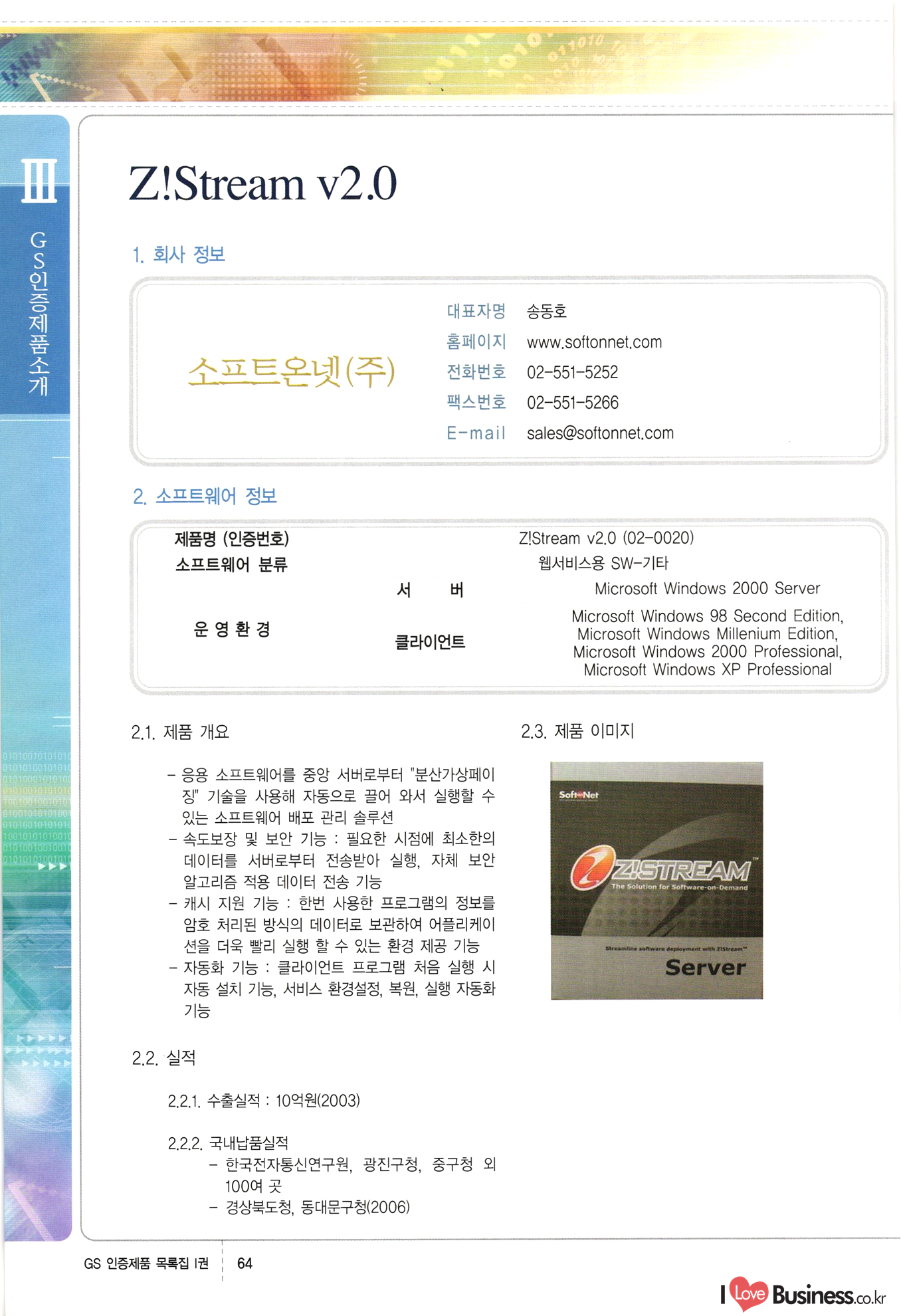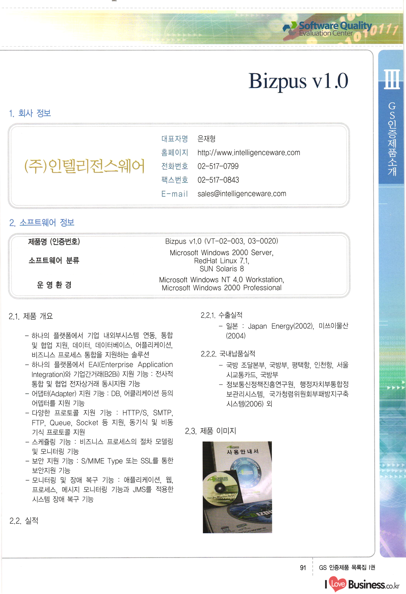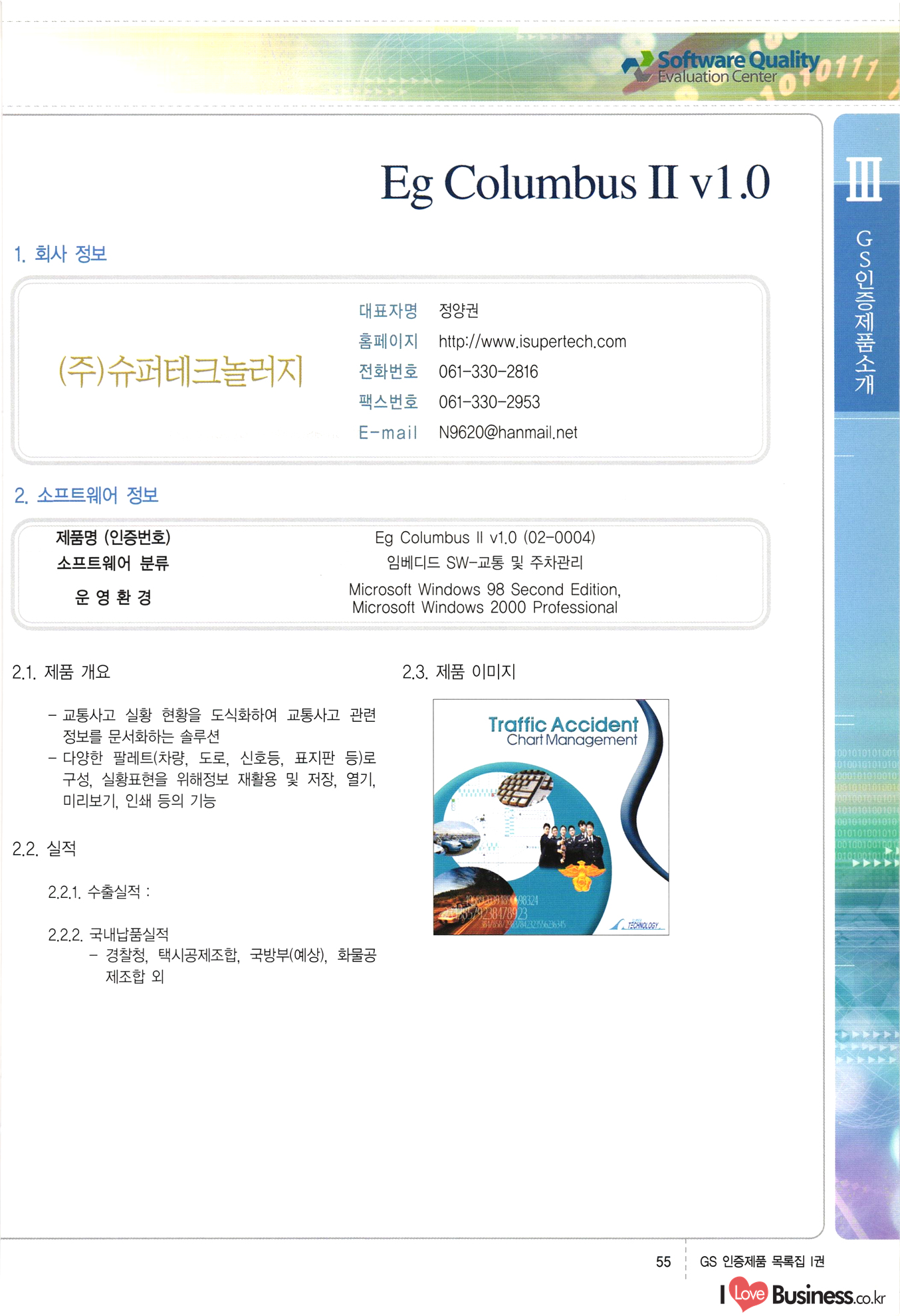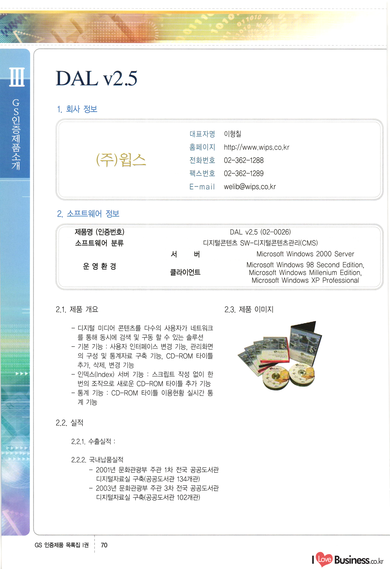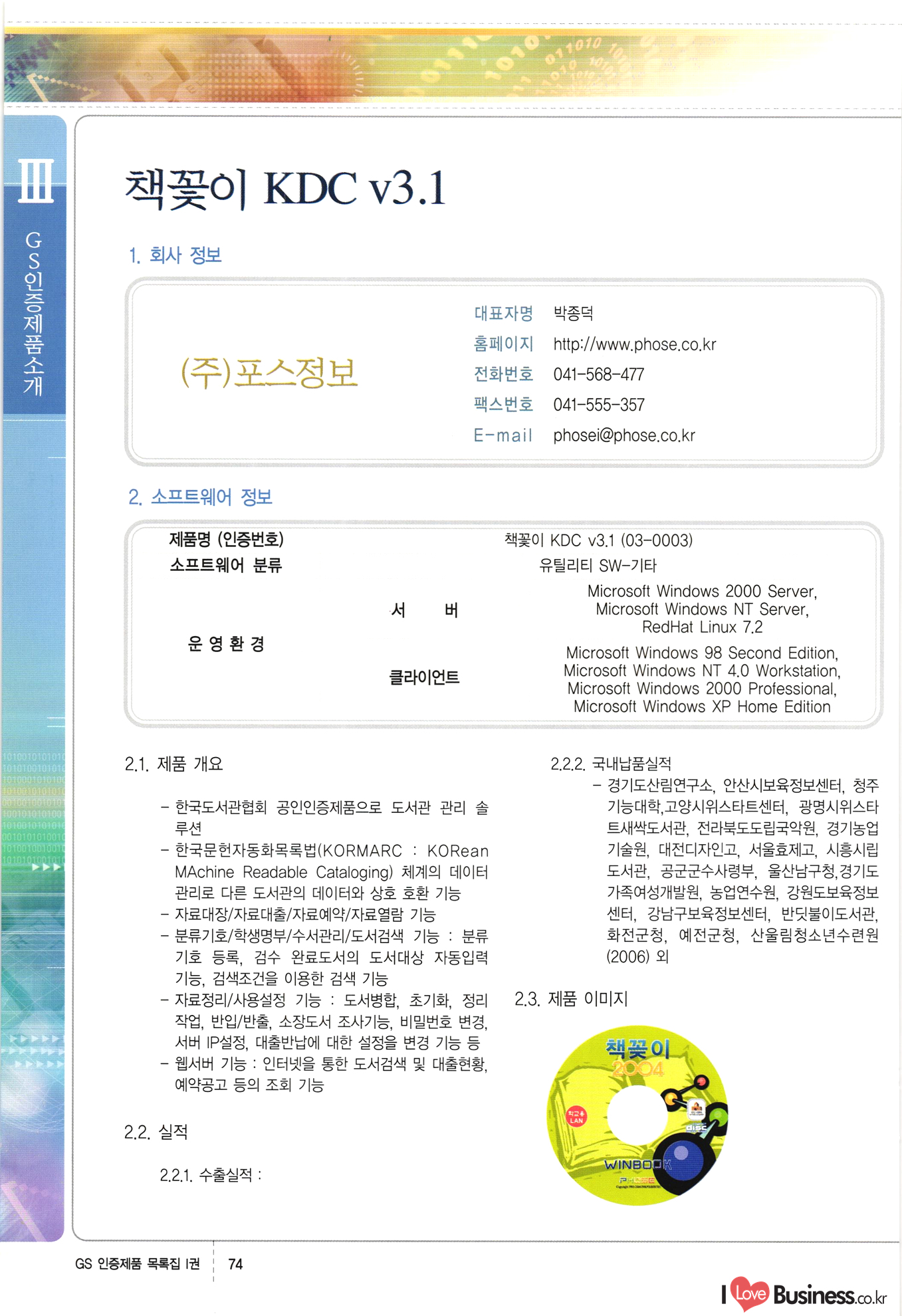 | III. GS 인증제품 목록 | 권-페이지번호 | 권-페이지번호 VT : VeriTest 국제 인증 GS인증제품목록 회사명 삼성에스디에스(주) 제품. EasyBase v4.1 페이지 50 1 제이엔에스 3DM Survey System v1.0 2 | 51 1 (주)싸이웍스 (주)테크다임 (주)다보넷 (주)로지스인포 CyberWALL 2000 v2.16 Jword v1.5 Touchsign v 2.1 키퍼엣홈 v1.0 78 52 (주)미래에듀테크 아이버스 v1.0 53 54 55 56 57 번호 | 인증번호 | 인증일자 01-0001 | 2001.07.25 101-0002 2001.10.22 (02-0027) | 01-0003 | 2001.11.27 | 01-0004 | 2001.11.27 | 01-0005 2001.11.27 5 | 01-0006 | 2001.12.27 02-0001 (02-0029) 2002.01.29 16 | | 02-0002 1 | 2002.02.16 | 02-0003 | 2002.02.16 02-0004 2002.02.27 9 | 02-0005 | 2002.02.27 110 | | 02-0006 | 2002.03.27 11 | || 02-0007 | 2002.03.27 | 02-0008 | 2002.04.30 | 02-0009 | 2002.04.30 | 02-0010 | 2002.04.30 15. | 02-0011 | 2002.04.30 16 102-0012 | 2002.04.30 | 17 | 02-0013 | 2002.05.30 | 18 | 02-0014 | 2002.05.30 | 02-0015 2002.06.28 | 20 | 02-0016 | 2002.06.28 02-0017 1 2002.06.28 | 02-0018 1 | 2002.06.28 23 | 02-0019 | 2002.06.28 24 02-0020 | 2002.07.31 25 | 02-0021 | 2002.07.31 224 58 14 59 118 (주)마크애니 (주)핸디소프트 (주)슈퍼테크놀러지 (주)스펙트라 이래정보시스템(주) (주)컴리빙아이티 | (주)시큐브 (주)케이게이트 (주)소프트4소프트 스페이스인터네셔널(주) (주)컴리빙아이티 (주)그린벨시스템즈 닉스테크(주) 심플소프트 (주)한국데이타비즈네스 (주)테크다임 (주)수세리눅스코리아 (주)한컴리눅스 소프트온넷(주) 와우리눅스(주) 60 61 Document Safer v1.0 | BizFlow Groupware v3.21 | Eg columbus || v1.0 | | eNomix v1.0 Blue Eyes v3.0 i-Class Five v1.05 Secuve TOS WG v1.0 위즈웹3 v3.0 RESORT v1.01 CD Tower v2.0 i-Class One2one v1.05 MANTIS-Professional v1.0 | | SAFEpc v1.5 Simple Gallery v1.00 통합카드발급프로그램 v1.0 Techdigm JCalc v2.0 Suse Linux 7.1K Professional Hancom Linux OS 2.2 Professional | Z!Stream v2.0 와우리눅스 7.1 파란 Secuve TOS WG Agent (Secuve Tos WG Manager) | SMERP v1.1 상하수도범용/ZEUS v1.0 U-Solver v1.0 dDIMS v3.0 DAL v2.5 101010101 1000 101003010101 190 1001010101 21 78. 122 | UL 63 64 65 26 | VT-02-001 | 2002.08.29 (주)시큐브 224 27 1 66 67 | 28 29 130 | 02-0022 | 2002.08.30 | 02-0023 | 2002.10.31 | 02-0024 | 2002.10.31 | 02-0025 | 2002.11.27 | 02-0026 | 2002.11.27 02-0027 (01-0002) 2002.11.27 | 02-0028 (03-0021) 2002.12.09 | 대한상공회의소 한국통신데이타(주) (주)지노시스템 유니온정보시스템(주) (주) 스 68 69 | 70 311 제이엔에스 소프트(구 제이엔에스) 3DM Survey System v1.0 (주)한국지능형정보시스템 한국관(상하수도 범용/TGW) v1.00 92 GS 인증제품 목록집 1권 | 26 I Love Business.co.kr Software Quality, 111 Evaluation Center | 권-페이지번호 II권페이지번호 VT : VeriTest 국제 인증 페이지 회사명 (주)포스데이타 제품 | iSign v2.0 | GS인증제품목록 171 | 34 | 02-0029 (주)제이슨테크(구 미래에듀테크) 아이버스 v1.0 91 72 73. 74 (주)인텔리젼스웨어 (주)하나디에스디 (주)연성정보기술 (주)포스정보 (주)켈코인 (주)포스데이타 스페이스인터내셔널 연희정보통신(주) (주)뉴테크웨이브 c-napse(GSS) v1.0 Life EduBuilder v1.0 | Email+ v3.0 1 책꽃이KDC v3.1 Challenger Webzine Webschool v3.0 1 Biz Binder v1.0 CD-Tower v3.1 상하수도 범용/UFCom v1.0 | | VirusChaser v5.0 | 175 76 118. (주)웨어벨리 Orange for ORACLE v2.2 | 번호 | 인증번호 | 인증일자 | 33 |VT-02-0022002.12.12 | | 2002.12.24 (02-0001) 35 | VT-02-003 | 2002.12.30 | 36 | 03-0001 | 2003.02.28 37. 03-0002 | 2003.02.28 | 38 | 03-0003 | 2003.02.28 | 39 | 03-0004 | 2003.02.28 40 | VT-03-001 | 2003.03.10 41 | VT-03-002) 2003.03.10 1 42 | 03-0005 | 2003.04.07 43 | 03-0006 | 2003.04.07 03-0007 2003.04.30 (03-0026) | 03-0008 | 2003.04.30 45 | 03-0009 | 2003.04.30 | 03-0010 | 2003.04.30 | 47 | 03-0011 | 2003.04.30 | 48 VT-03-003 2003.05.26 49 | 03-0012 | 2003.06.05 | 50 | 03-0013 | 2003.06.05 | 51 | 03-0014 | 2003.06.05 | 52 | 03-0015 | 2003.07.10 | 53 | 03-0016 | 2003.07.10 | 54 | 03-0017 | 2003.07.10 | | 55 | 03-0018 | 2003.07.10 | 56 | 03-0019 | 2003.08.06 57 | | 03-0020 | 2003.08.06 44 1 18 46 80 81 82 83 | (주)테크다임 (주)엔지스테크널러지 삼성에스디에스(주) 삼성에스디에스(주) (주)미디어랜드 인터컴소프트웨어(주) 에스케이씨앤씨(주) 아이티로직스(주) (주)에이씨티소프트 (주)위즈북 (주)에스오엔코리아 (주)아리수미디어 한진정보통신(주) (주)인텔리전스웨어 (주)웨어밸리 (구 (주)오알솔루션즈코리아) Techdigm Office v2.0 | G-Solution Waterworks/Sewerage v1.0 | | 79 UniCITY Standard v1.0 UniCITY Enterprise v1.0 TCO!stream 2002 v4.0 | ServerGuard v3.0 | SK-UPEX v1.0 84 NexWeb v1.2 e-Library Deluxe v4.1.5 86 DL Pro v1.0 SiR v1.01 파워CD뱅크 v4.0 89 InfoMatrix v1.00 190 Bizpus v1.0 91 85 87 88 10010010101.03 1101010100101 1100100100107 58 |VT-03-004 2003.08.12 Orange for ORACLE v2.2 | 111 59 (주)티지더블유 (구 한국지능형정보시스템) 한국관(상하수도 범용/TGW) v1.0 92 93 GIS Free v1.0 DeskPlus v2.0 1 | 94 ArcCITY v1.0 110 03-0021 (02-0028) | 2003.09.04 | 60 | 03-0022 | 2003.09.30 03-0023 | 2003.09.30 03-0024 (04-0011) | 2003.09.30 | 03-0025 | 2003.09.30 03-0026 (03-0007) | 2003.10.07 63 | 03-0027 | 2003.11.12 64 | 03-0028 | 2003.11.12 622 세광정보시스템(주) 제오스페이스(주) (주)선도소프트 (구 (주)캐드랜드) 중앙항업(주) (주)웨어밸리 (구 (주)오알솔루션즈코리아) (주)우암닷컴 (주)오투라인 geoCUBE상하수도 v1.0 95 Orange for ORACLE V2.2 111 96 RAVCOMS Eyecon v4.0 오투스쿨 v2.01 97 GS 인증제품 목록집 1권 I Love Business.co.kr | 권-페이지번호 | 권 - 페이지번호 VT : VeriTest 국제 인증 번호 페이지 회사명 소프트캠프