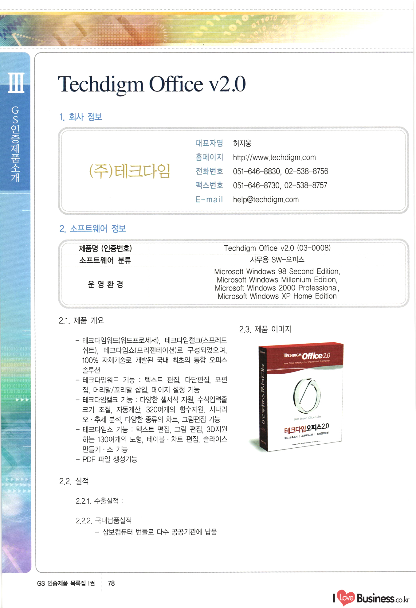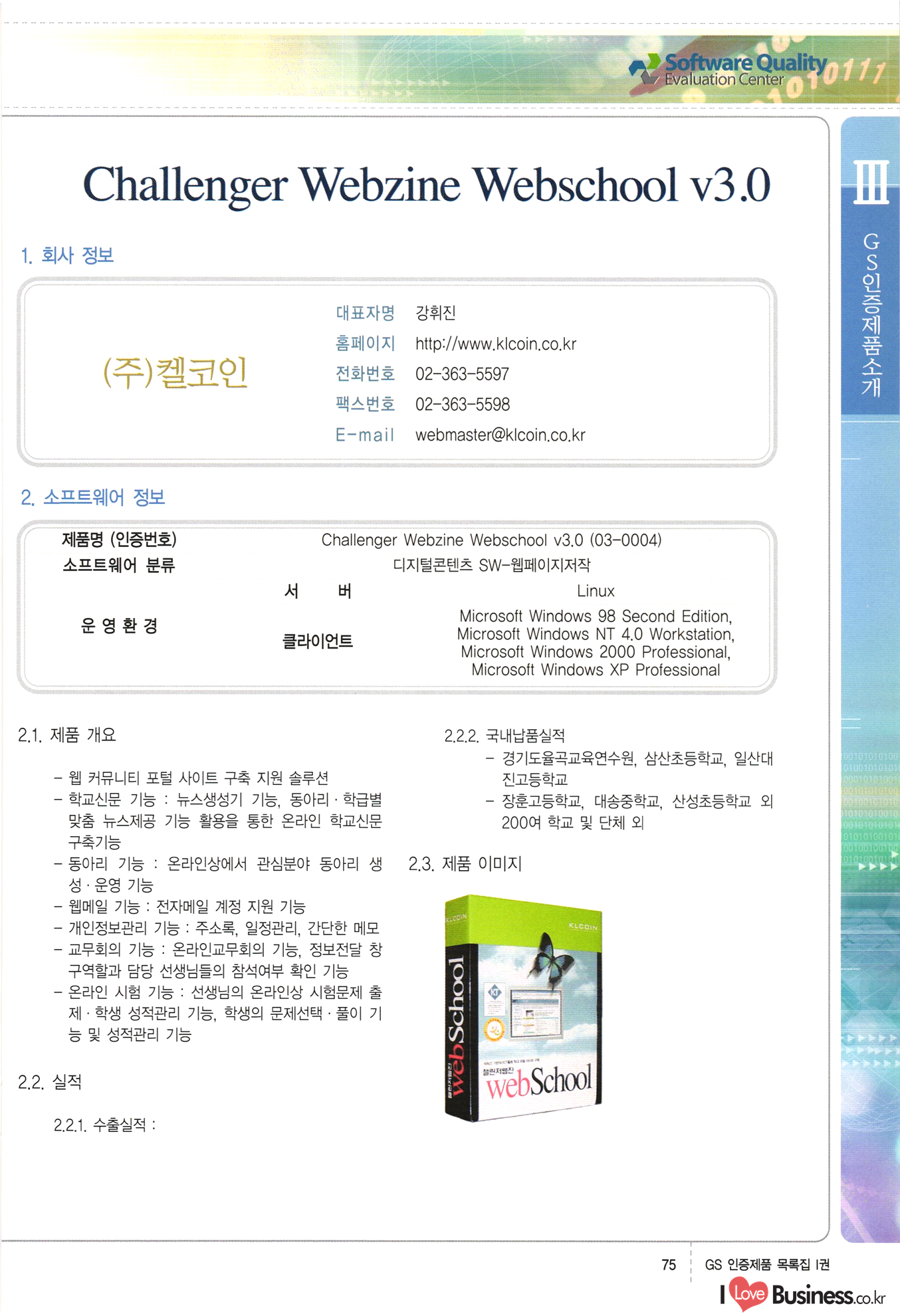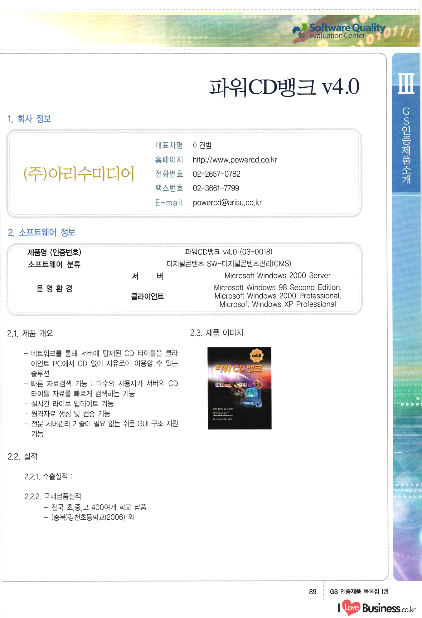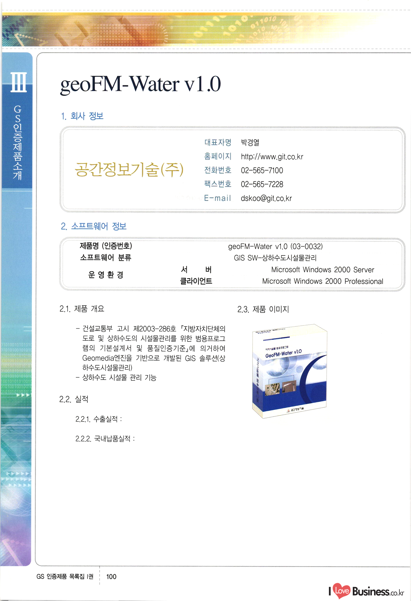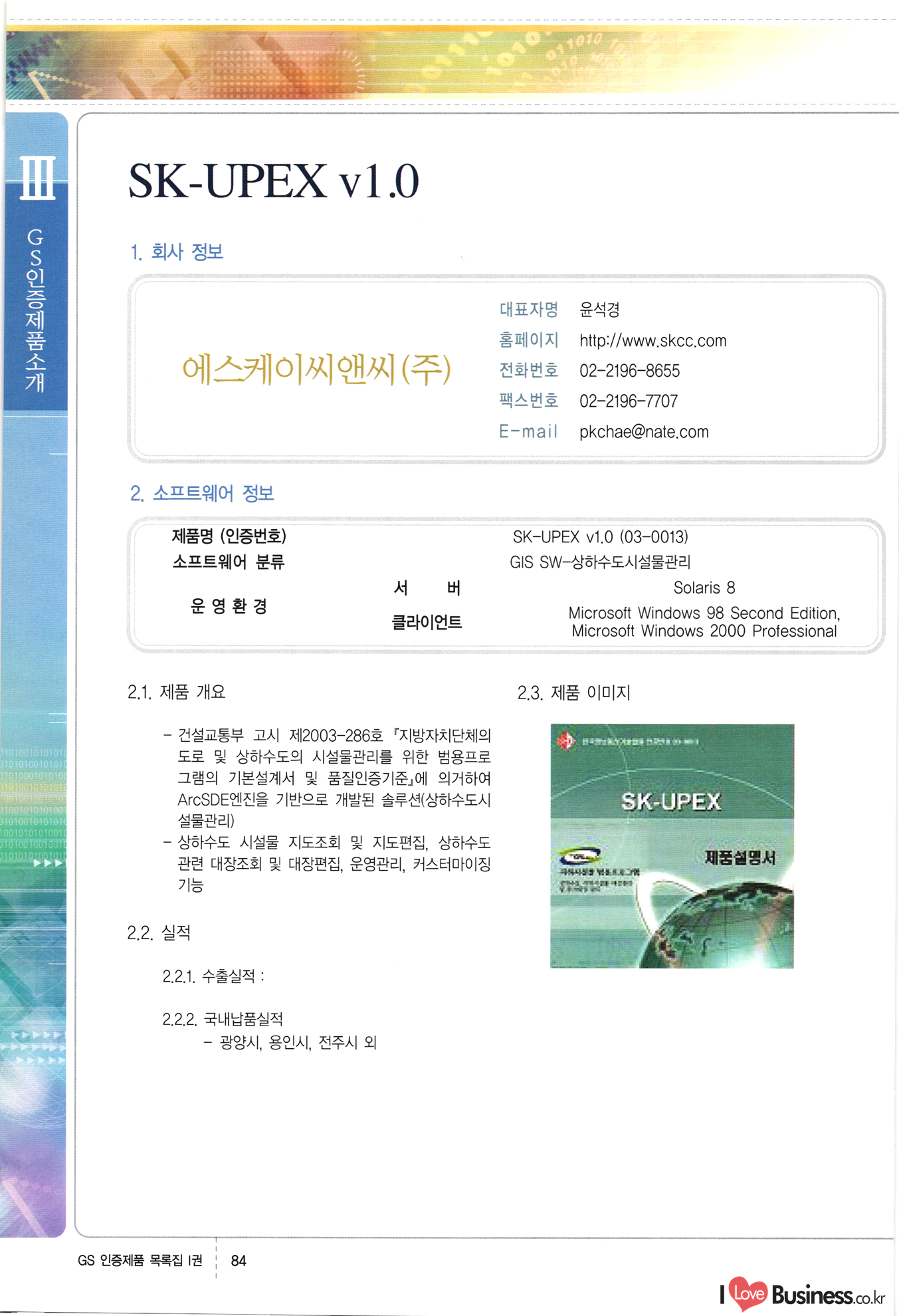| III. GS 인증제품 목록 | 권-페이지번호 | 권-페이지번호 VT : VeriTest 국제 인증 GS인증제품목록 회사명 삼성에스디에스(주) 제품. EasyBase v4.1 페이지 50 1 제이엔에스 3DM Survey System v1.0 2 | 51 1 (주)싸이웍스 (주)테크다임 (주)다보넷 (주)로지스인포 CyberWALL 2000 v2.16 Jword v1.5 Touchsign v 2.1 키퍼엣홈 v1.0 78 52 (주)미래에듀테크 아이버스 v1.0 53 54 55 56 57 번호 | 인증번호 | 인증일자 01-0001 | 2001.07.25 101-0002 2001.10.22 (02-0027) | 01-0003 | 2001.11.27 | 01-0004 | 2001.11.27 | 01-0005 2001.11.27 5 | 01-0006 | 2001.12.27 02-0001 (02-0029) 2002.01.29 16 | | 02-0002 1 | 2002.02.16 | 02-0003 | 2002.02.16 02-0004 2002.02.27 9 | 02-0005 | 2002.02.27 110 | | 02-0006 | 2002.03.27 11 | || 02-0007 | 2002.03.27 | 02-0008 | 2002.04.30 | 02-0009 | 2002.04.30 | 02-0010 | 2002.04.30 15. | 02-0011 | 2002.04.30 16 102-0012 | 2002.04.30 | 17 | 02-0013 | 2002.05.30 | 18 | 02-0014 | 2002.05.30 | 02-0015 2002.06.28 | 20 | 02-0016 | 2002.06.28 02-0017 1 2002.06.28 | 02-0018 1 | 2002.06.28 23 | 02-0019 | 2002.06.28 24 02-0020 | 2002.07.31 25 | 02-0021 | 2002.07.31 224 58 14 59 118 (주)마크애니 (주)핸디소프트 (주)슈퍼테크놀러지 (주)스펙트라 이래정보시스템(주) (주)컴리빙아이티 | (주)시큐브 (주)케이게이트 (주)소프트4소프트 스페이스인터네셔널(주) (주)컴리빙아이티 (주)그린벨시스템즈 닉스테크(주) 심플소프트 (주)한국데이타비즈네스 (주)테크다임 (주)수세리눅스코리아 (주)한컴리눅스 소프트온넷(주) 와우리눅스(주) 60 61 Document Safer v1.0 | BizFlow Groupware v3.21 | Eg columbus || v1.0 | | eNomix v1.0 Blue Eyes v3.0 i-Class Five v1.05 Secuve TOS WG v1.0 위즈웹3 v3.0 RESORT v1.01 CD Tower v2.0 i-Class One2one v1.05 MANTIS-Professional v1.0 | | SAFEpc v1.5 Simple Gallery v1.00 통합카드발급프로그램 v1.0 Techdigm JCalc v2.0 Suse Linux 7.1K Professional Hancom Linux OS 2.2 Professional | Z!Stream v2.0 와우리눅스 7.1 파란 Secuve TOS WG Agent (Secuve Tos WG Manager) | SMERP v1.1 상하수도범용/ZEUS v1.0 U-Solver v1.0 dDIMS v3.0 DAL v2.5 101010101 1000 101003010101 190 1001010101 21 78. 122 | UL 63 64 65 26 | VT-02-001 | 2002.08.29 (주)시큐브 224 27 1 66 67 | 28 29 130 | 02-0022 | 2002.08.30 | 02-0023 | 2002.10.31 | 02-0024 | 2002.10.31 | 02-0025 | 2002.11.27 | 02-0026 | 2002.11.27 02-0027 (01-0002) 2002.11.27 | 02-0028 (03-0021) 2002.12.09 | 대한상공회의소 한국통신데이타(주) (주)지노시스템 유니온정보시스템(주) (주) 스 68 69 | 70 311 제이엔에스 소프트(구 제이엔에스) 3DM Survey System v1.0 (주)한국지능형정보시스템 한국관(상하수도 범용/TGW) v1.00 92 GS 인증제품 목록집 1권 | 26 I Love Business.co.kr Software Quality, 111 Evaluation Center | 권-페이지번호 II권페이지번호 VT : VeriTest 국제 인증 페이지 회사명 (주)포스데이타 제품 | iSign v2.0 | GS인증제품목록 171 | 34 | 02-0029 (주)제이슨테크(구 미래에듀테크) 아이버스 v1.0 91 72 73. 74 (주)인텔리젼스웨어 (주)하나디에스디 (주)연성정보기술 (주)포스정보 (주)켈코인 (주)포스데이타 스페이스인터내셔널 연희정보통신(주) (주)뉴테크웨이브 c-napse(GSS) v1.0 Life EduBuilder v1.0 | Email+ v3.0 1 책꽃이KDC v3.1 Challenger Webzine Webschool v3.0 1 Biz Binder v1.0 CD-Tower v3.1 상하수도 범용/UFCom v1.0 | | VirusChaser v5.0 | 175 76 118. (주)웨어벨리 Orange for ORACLE v2.2 | 번호 | 인증번호 | 인증일자 | 33 |VT-02-0022002.12.12 | | 2002.12.24 (02-0001) 35 | VT-02-003 | 2002.12.30 | 36 | 03-0001 | 2003.02.28 37. 03-0002 | 2003.02.28 | 38 | 03-0003 | 2003.02.28 | 39 | 03-0004 | 2003.02.28 40 | VT-03-001 | 2003.03.10 41 | VT-03-002) 2003.03.10 1 42 | 03-0005 | 2003.04.07 43 | 03-0006 | 2003.04.07 03-0007 2003.04.30 (03-0026) | 03-0008 | 2003.04.30 45 | 03-0009 | 2003.04.30 | 03-0010 | 2003.04.30 | 47 | 03-0011 | 2003.04.30 | 48 VT-03-003 2003.05.26 49 | 03-0012 | 2003.06.05 | 50 | 03-0013 | 2003.06.05 | 51 | 03-0014 | 2003.06.05 | 52 | 03-0015 | 2003.07.10 | 53 | 03-0016 | 2003.07.10 | 54 | 03-0017 | 2003.07.10 | | 55 | 03-0018 | 2003.07.10 | 56 | 03-0019 | 2003.08.06 57 | | 03-0020 | 2003.08.06 44 1 18 46 80 81 82 83 | (주)테크다임 (주)엔지스테크널러지 삼성에스디에스(주) 삼성에스디에스(주) (주)미디어랜드 인터컴소프트웨어(주) 에스케이씨앤씨(주) 아이티로직스(주) (주)에이씨티소프트 (주)위즈북 (주)에스오엔코리아 (주)아리수미디어 한진정보통신(주) (주)인텔리전스웨어 (주)웨어밸리 (구 (주)오알솔루션즈코리아) Techdigm Office v2.0 | G-Solution Waterworks/Sewerage v1.0 | | 79 UniCITY Standard v1.0 UniCITY Enterprise v1.0 TCO!stream 2002 v4.0 | ServerGuard v3.0 | SK-UPEX v1.0 84 NexWeb v1.2 e-Library Deluxe v4.1.5 86 DL Pro v1.0 SiR v1.01 파워CD뱅크 v4.0 89 InfoMatrix v1.00 190 Bizpus v1.0 91 85 87 88 10010010101.03 1101010100101 1100100100107 58 |VT-03-004 2003.08.12 Orange for ORACLE v2.2 | 111 59 (주)티지더블유 (구 한국지능형정보시스템) 한국관(상하수도 범용/TGW) v1.0 92 93 GIS Free v1.0 DeskPlus v2.0 1 | 94 ArcCITY v1.0 110 03-0021 (02-0028) | 2003.09.04 | 60 | 03-0022 | 2003.09.30 03-0023 | 2003.09.30 03-0024 (04-0011) | 2003.09.30 | 03-0025 | 2003.09.30 03-0026 (03-0007) | 2003.10.07 63 | 03-0027 | 2003.11.12 64 | 03-0028 | 2003.11.12 622 세광정보시스템(주) 제오스페이스(주) (주)선도소프트 (구 (주)캐드랜드) 중앙항업(주) (주)웨어밸리 (구 (주)오알솔루션즈코리아) (주)우암닷컴 (주)오투라인 geoCUBE상하수도 v1.0 95 Orange for ORACLE V2.2 111 96 RAVCOMS Eyecon v4.0 오투스쿨 v2.01 97 GS 인증제품 목록집 1권 I Love Business.co.kr | 권-페이지번호 | 권 - 페이지번호 VT : VeriTest 국제 인증 번호 페이지 회사명 소프트캠프