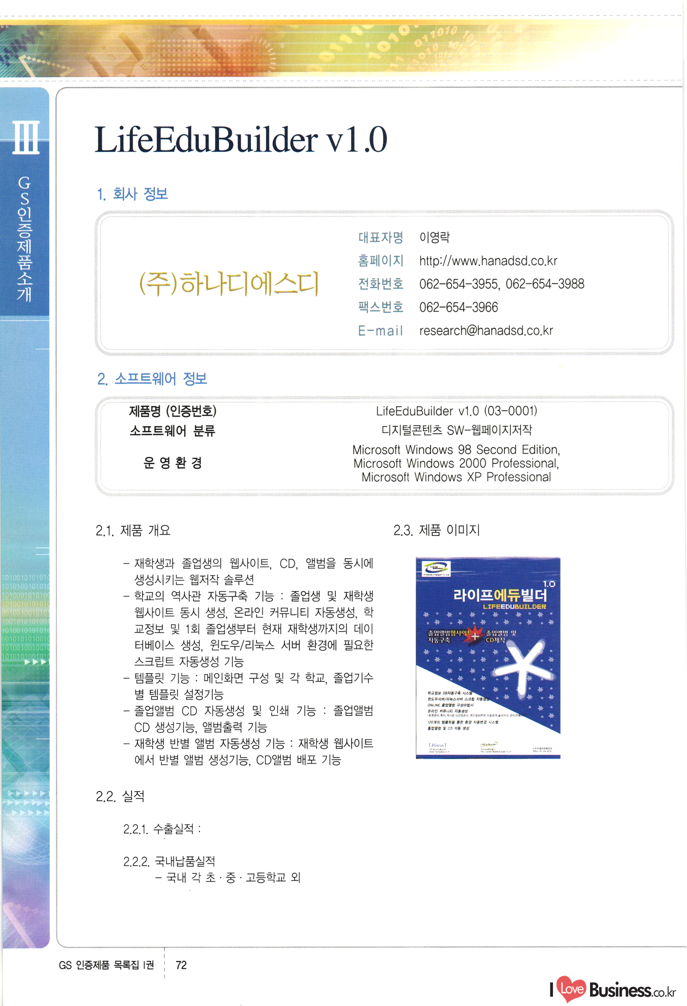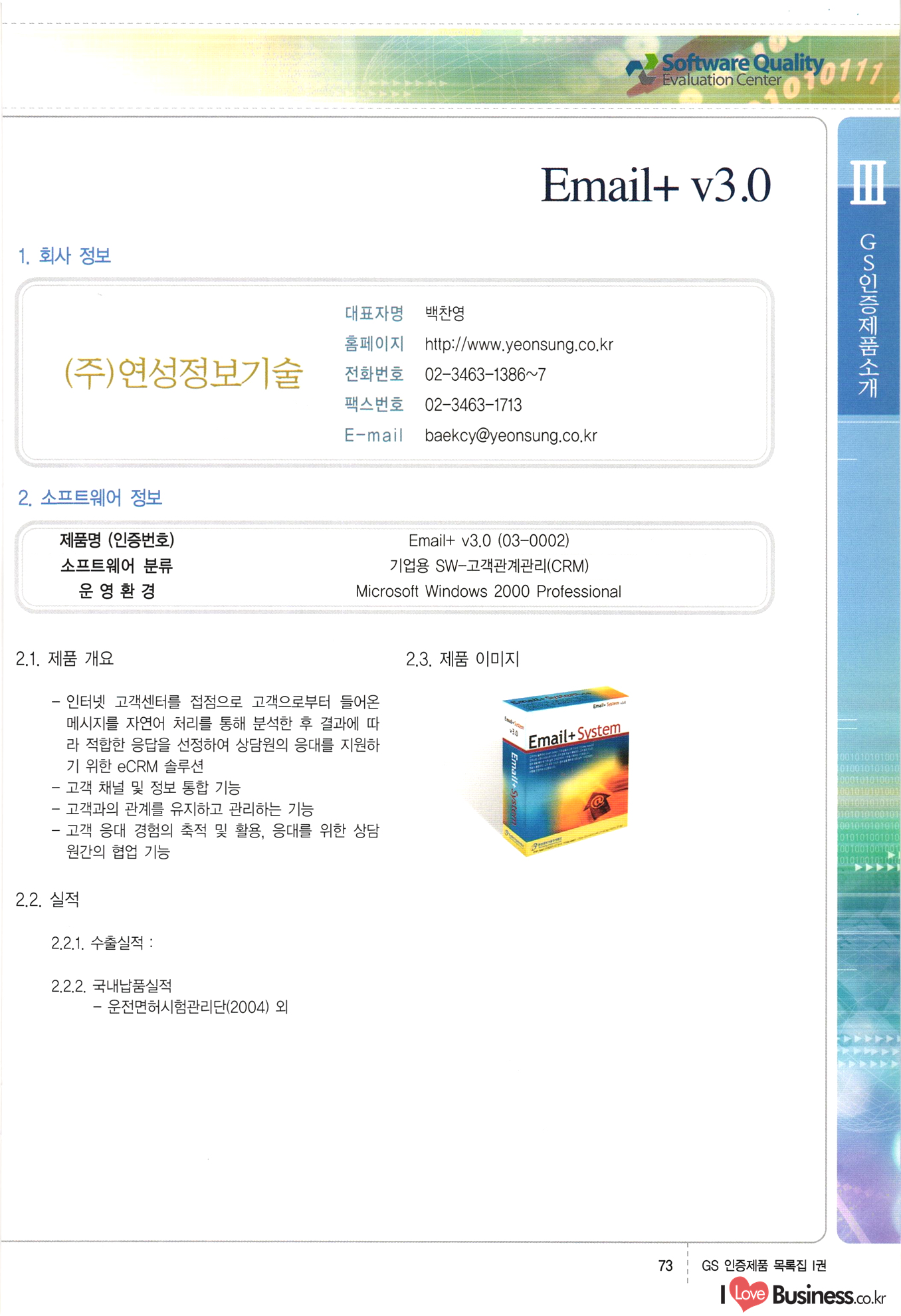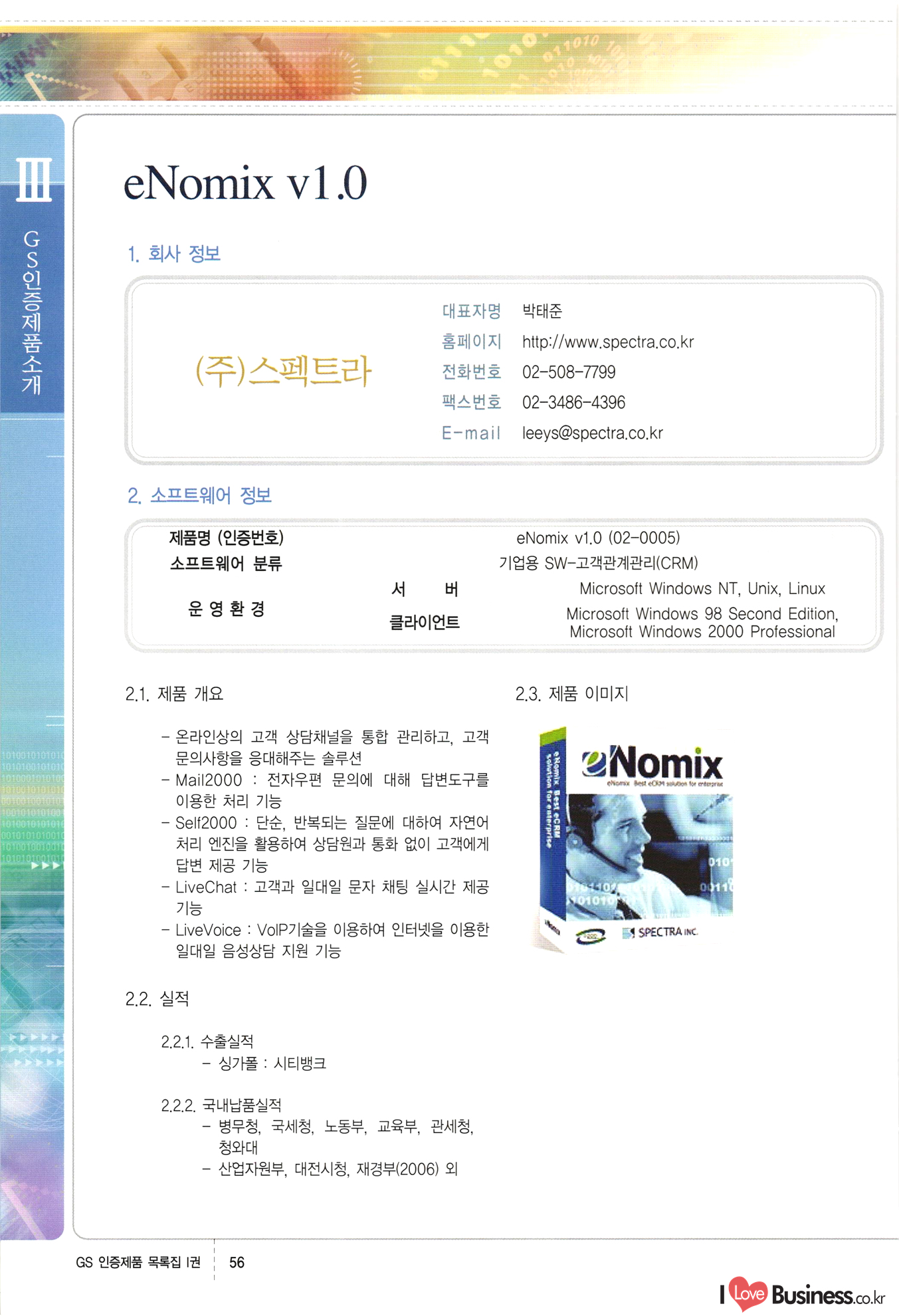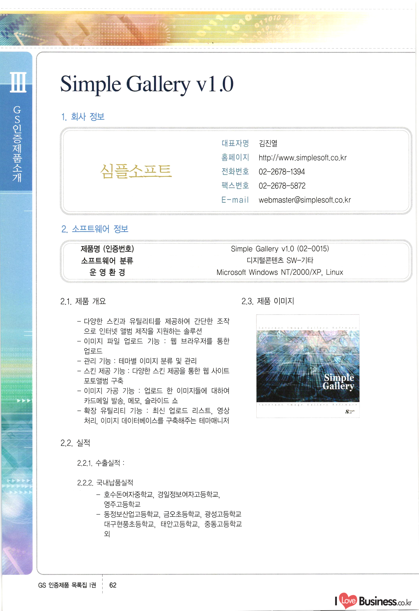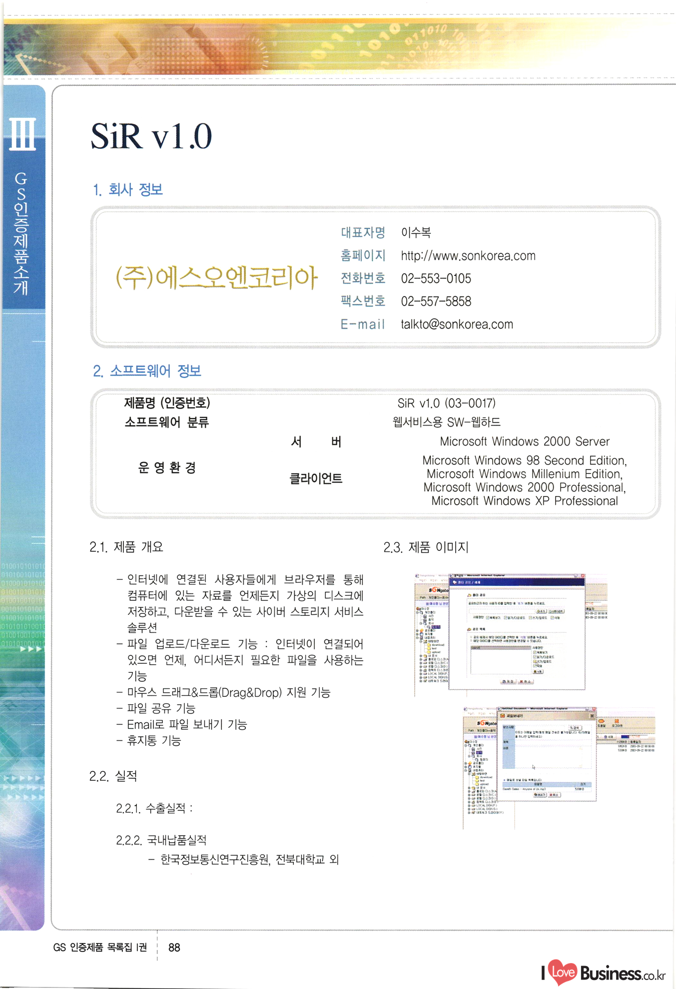 | III. GS 인증제품 목록 | 권-페이지번호 | 권-페이지번호 VT : VeriTest 국제 인증 GS인증제품목록 회사명 삼성에스디에스(주) 제품. EasyBase v4.1 페이지 50 1 제이엔에스 3DM Survey System v1.0 2 | 51 1 (주)싸이웍스 (주)테크다임 (주)다보넷 (주)로지스인포 CyberWALL 2000 v2.16 Jword v1.5 Touchsign v 2.1 키퍼엣홈 v1.0 78 52 (주)미래에듀테크 아이버스 v1.0 53 54 55 56 57 번호 | 인증번호 | 인증일자 01-0001 | 2001.07.25 101-0002 2001.10.22 (02-0027) | 01-0003 | 2001.11.27 | 01-0004 | 2001.11.27 | 01-0005 2001.11.27 5 | 01-0006 | 2001.12.27 02-0001 (02-0029) 2002.01.29 16 | | 02-0002 1 | 2002.02.16 | 02-0003 | 2002.02.16 02-0004 2002.02.27 9 | 02-0005 | 2002.02.27 110 | | 02-0006 | 2002.03.27 11 | || 02-0007 | 2002.03.27 | 02-0008 | 2002.04.30 | 02-0009 | 2002.04.30 | 02-0010 | 2002.04.30 15. | 02-0011 | 2002.04.30 16 102-0012 | 2002.04.30 | 17 | 02-0013 | 2002.05.30 | 18 | 02-0014 | 2002.05.30 | 02-0015 2002.06.28 | 20 | 02-0016 | 2002.06.28 02-0017 1 2002.06.28 | 02-0018 1 | 2002.06.28 23 | 02-0019 | 2002.06.28 24 02-0020 | 2002.07.31 25 | 02-0021 | 2002.07.31 224 58 14 59 118 (주)마크애니 (주)핸디소프트 (주)슈퍼테크놀러지 (주)스펙트라 이래정보시스템(주) (주)컴리빙아이티 | (주)시큐브 (주)케이게이트 (주)소프트4소프트 스페이스인터네셔널(주) (주)컴리빙아이티 (주)그린벨시스템즈 닉스테크(주) 심플소프트 (주)한국데이타비즈네스 (주)테크다임 (주)수세리눅스코리아 (주)한컴리눅스 소프트온넷(주) 와우리눅스(주) 60 61 Document Safer v1.0 | BizFlow Groupware v3.21 | Eg columbus || v1.0 | | eNomix v1.0 Blue Eyes v3.0 i-Class Five v1.05 Secuve TOS WG v1.0 위즈웹3 v3.0 RESORT v1.01 CD Tower v2.0 i-Class One2one v1.05 MANTIS-Professional v1.0 | | SAFEpc v1.5 Simple Gallery v1.00 통합카드발급프로그램 v1.0 Techdigm JCalc v2.0 Suse Linux 7.1K Professional Hancom Linux OS 2.2 Professional | Z!Stream v2.0 와우리눅스 7.1 파란 Secuve TOS WG Agent (Secuve Tos WG Manager) | SMERP v1.1 상하수도범용/ZEUS v1.0 U-Solver v1.0 dDIMS v3.0 DAL v2.5 101010101 1000 101003010101 190 1001010101 21 78. 122 | UL 63 64 65 26 | VT-02-001 | 2002.08.29 (주)시큐브 224 27 1 66 67 | 28 29 130 | 02-0022 | 2002.08.30 | 02-0023 | 2002.10.31 | 02-0024 | 2002.10.31 | 02-0025 | 2002.11.27 | 02-0026 | 2002.11.27 02-0027 (01-0002) 2002.11.27 | 02-0028 (03-0021) 2002.12.09 | 대한상공회의소 한국통신데이타(주) (주)지노시스템 유니온정보시스템(주) (주) 스 68 69 | 70 311 제이엔에스 소프트(구 제이엔에스) 3DM Survey System v1.0 (주)한국지능형정보시스템 한국관(상하수도 범용/TGW) v1.00 92 GS 인증제품 목록집 1권 | 26 I Love Business.co.kr Software Quality, 111 Evaluation Center | 권-페이지번호 II권페이지번호 VT : VeriTest 국제 인증 페이지 회사명 (주)포스데이타 제품 | iSign v2.0 | GS인증제품목록 171 | 34 | 02-0029 (주)제이슨테크(구 미래에듀테크) 아이버스 v1.0 91 72 73. 74 (주)인텔리젼스웨어 (주)하나디에스디 (주)연성정보기술 (주)포스정보 (주)켈코인 (주)포스데이타 스페이스인터내셔널 연희정보통신(주) (주)뉴테크웨이브 c-napse(GSS) v1.0 Life EduBuilder v1.0 | Email+ v3.0 1 책꽃이KDC v3.1 Challenger Webzine Webschool v3.0 1 Biz Binder v1.0 CD-Tower v3.1 상하수도 범용/UFCom v1.0 | | VirusChaser v5.0 | 175 76 118. (주)웨어벨리 Orange for ORACLE v2.2 | 번호 | 인증번호 | 인증일자 | 33 |VT-02-0022002.12.12 | | 2002.12.24 (02-0001) 35 | VT-02-003 | 2002.12.30 | 36 | 03-0001 | 2003.02.28 37. 03-0002 | 2003.02.28 | 38 | 03-0003 | 2003.02.28 | 39 | 03-0004 | 2003.02.28 40 | VT-03-001 | 2003.03.10 41 | VT-03-002) 2003.03.10 1 42 | 03-0005 | 2003.04.07 43 | 03-0006 | 2003.04.07 03-0007 2003.04.30 (03-0026) | 03-0008 | 2003.04.30 45 | 03-0009 | 2003.04.30 | 03-0010 | 2003.04.30 | 47 | 03-0011 | 2003.04.30 | 48 VT-03-003 2003.05.26 49 | 03-0012 | 2003.06.05 | 50 | 03-0013 | 2003.06.05 | 51 | 03-0014 | 2003.06.05 | 52 | 03-0015 | 2003.07.10 | 53 | 03-0016 | 2003.07.10 | 54 | 03-0017 | 2003.07.10 | | 55 | 03-0018 | 2003.07.10 | 56 | 03-0019 | 2003.08.06 57 | | 03-0020 | 2003.08.06 44 1 18 46 80 81 82 83 | (주)테크다임 (주)엔지스테크널러지 삼성에스디에스(주) 삼성에스디에스(주) (주)미디어랜드 인터컴소프트웨어(주) 에스케이씨앤씨(주) 아이티로직스(주) (주)에이씨티소프트 (주)위즈북 (주)에스오엔코리아 (주)아리수미디어 한진정보통신(주) (주)인텔리전스웨어 (주)웨어밸리 (구 (주)오알솔루션즈코리아) Techdigm Office v2.0 | G-Solution Waterworks/Sewerage v1.0 | | 79 UniCITY Standard v1.0 UniCITY Enterprise v1.0 TCO!stream 2002 v4.0 | ServerGuard v3.0 | SK-UPEX v1.0 84 NexWeb v1.2 e-Library Deluxe v4.1.5 86 DL Pro v1.0 SiR v1.01 파워CD뱅크 v4.0 89 InfoMatrix v1.00 190 Bizpus v1.0 91 85 87 88 10010010101.03 1101010100101 1100100100107 58 |VT-03-004 2003.08.12 Orange for ORACLE v2.2 | 111 59 (주)티지더블유 (구 한국지능형정보시스템) 한국관(상하수도 범용/TGW) v1.0 92 93 GIS Free v1.0 DeskPlus v2.0 1 | 94 ArcCITY v1.0 110 03-0021 (02-0028) | 2003.09.04 | 60 | 03-0022 | 2003.09.30 03-0023 | 2003.09.30 03-0024 (04-0011) | 2003.09.30 | 03-0025 | 2003.09.30 03-0026 (03-0007) | 2003.10.07 63 | 03-0027 | 2003.11.12 64 | 03-0028 | 2003.11.12 622 세광정보시스템(주) 제오스페이스(주) (주)선도소프트 (구 (주)캐드랜드) 중앙항업(주) (주)웨어밸리 (구 (주)오알솔루션즈코리아) (주)우암닷컴 (주)오투라인 geoCUBE상하수도 v1.0 95 Orange for ORACLE V2.2 111 96 RAVCOMS Eyecon v4.0 오투스쿨 v2.01 97 GS 인증제품 목록집 1권 I Love Business.co.kr | 권-페이지번호 | 권 - 페이지번호 VT : VeriTest 국제 인증 번호 페이지 회사명 소프트캠프