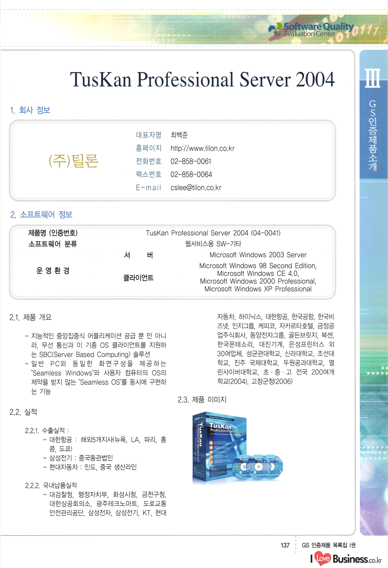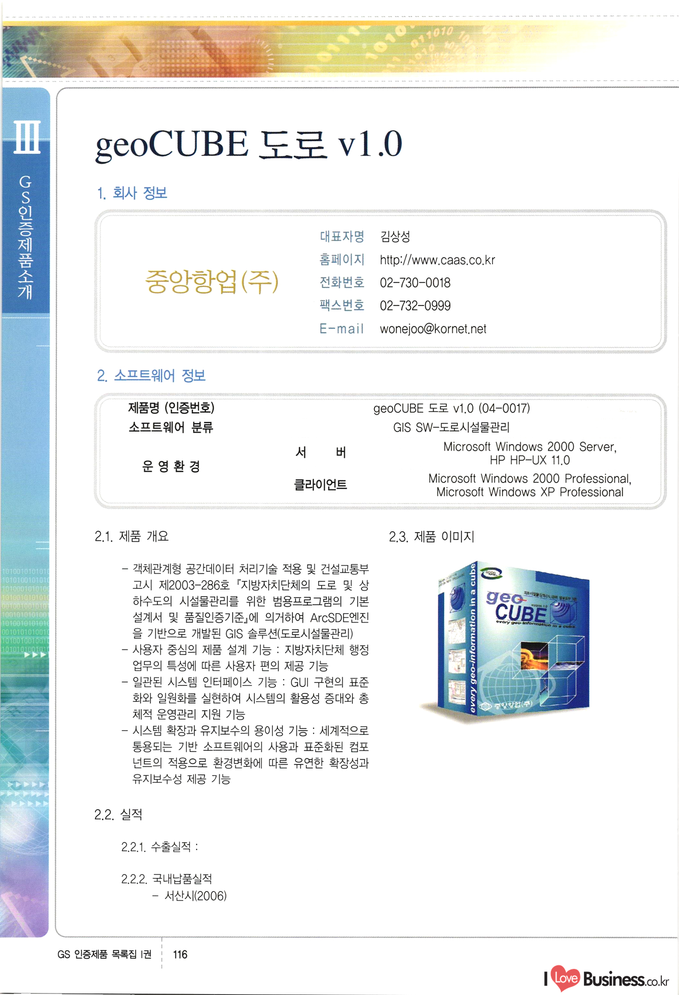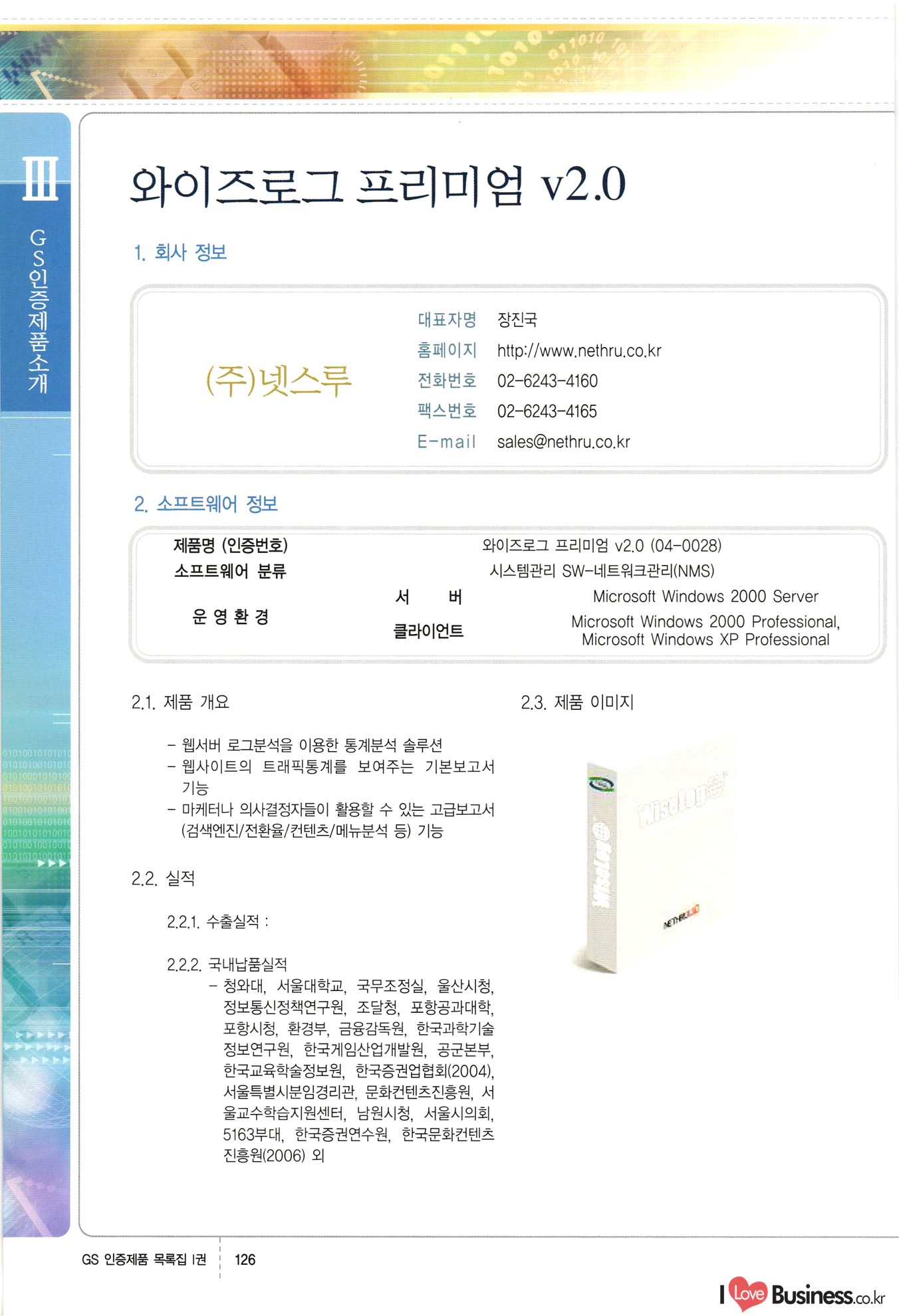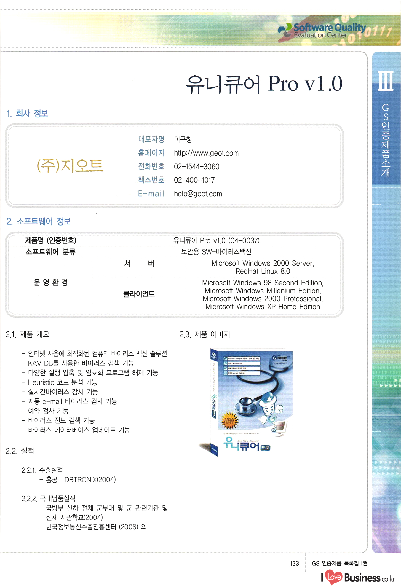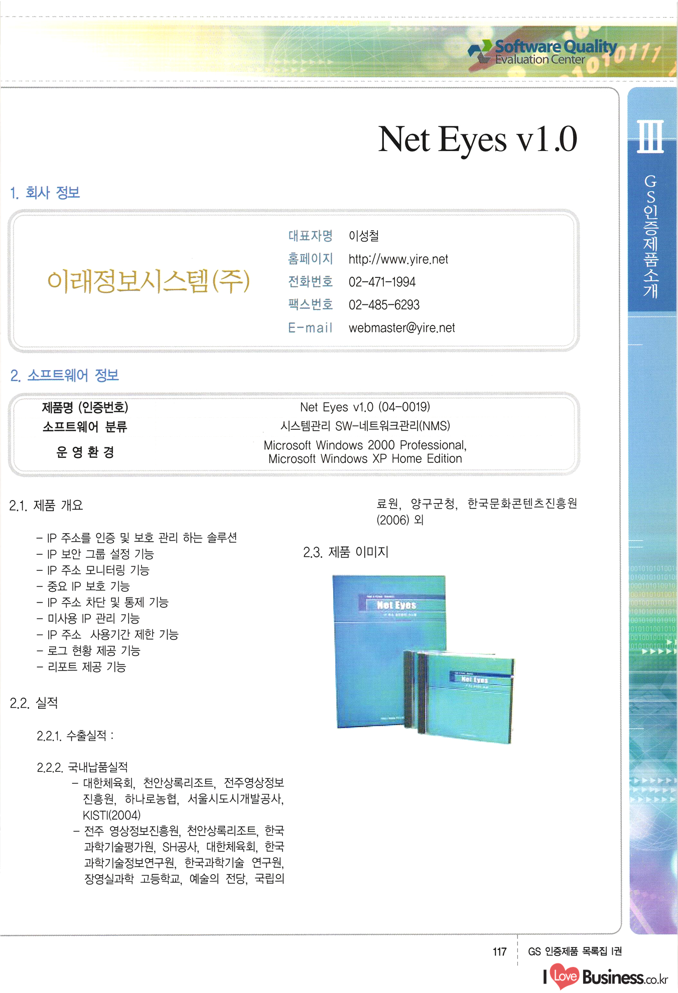 | III. GS 인증제품 목록 | 권-페이지번호 | 권-페이지번호 VT : VeriTest 국제 인증 GS인증제품목록 회사명 삼성에스디에스(주) 제품. EasyBase v4.1 페이지 50 1 제이엔에스 3DM Survey System v1.0 2 | 51 1 (주)싸이웍스 (주)테크다임 (주)다보넷 (주)로지스인포 CyberWALL 2000 v2.16 Jword v1.5 Touchsign v 2.1 키퍼엣홈 v1.0 78 52 (주)미래에듀테크 아이버스 v1.0 53 54 55 56 57 번호 | 인증번호 | 인증일자 01-0001 | 2001.07.25 101-0002 2001.10.22 (02-0027) | 01-0003 | 2001.11.27 | 01-0004 | 2001.11.27 | 01-0005 2001.11.27 5 | 01-0006 | 2001.12.27 02-0001 (02-0029) 2002.01.29 16 | | 02-0002 1 | 2002.02.16 | 02-0003 | 2002.02.16 02-0004 2002.02.27 9 | 02-0005 | 2002.02.27 110 | | 02-0006 | 2002.03.27 11 | || 02-0007 | 2002.03.27 | 02-0008 | 2002.04.30 | 02-0009 | 2002.04.30 | 02-0010 | 2002.04.30 15. | 02-0011 | 2002.04.30 16 102-0012 | 2002.04.30 | 17 | 02-0013 | 2002.05.30 | 18 | 02-0014 | 2002.05.30 | 02-0015 2002.06.28 | 20 | 02-0016 | 2002.06.28 02-0017 1 2002.06.28 | 02-0018 1 | 2002.06.28 23 | 02-0019 | 2002.06.28 24 02-0020 | 2002.07.31 25 | 02-0021 | 2002.07.31 224 58 14 59 118 (주)마크애니 (주)핸디소프트 (주)슈퍼테크놀러지 (주)스펙트라 이래정보시스템(주) (주)컴리빙아이티 | (주)시큐브 (주)케이게이트 (주)소프트4소프트 스페이스인터네셔널(주) (주)컴리빙아이티 (주)그린벨시스템즈 닉스테크(주) 심플소프트 (주)한국데이타비즈네스 (주)테크다임 (주)수세리눅스코리아 (주)한컴리눅스 소프트온넷(주) 와우리눅스(주) 60 61 Document Safer v1.0 | BizFlow Groupware v3.21 | Eg columbus || v1.0 | | eNomix v1.0 Blue Eyes v3.0 i-Class Five v1.05 Secuve TOS WG v1.0 위즈웹3 v3.0 RESORT v1.01 CD Tower v2.0 i-Class One2one v1.05 MANTIS-Professional v1.0 | | SAFEpc v1.5 Simple Gallery v1.00 통합카드발급프로그램 v1.0 Techdigm JCalc v2.0 Suse Linux 7.1K Professional Hancom Linux OS 2.2 Professional | Z!Stream v2.0 와우리눅스 7.1 파란 Secuve TOS WG Agent (Secuve Tos WG Manager) | SMERP v1.1 상하수도범용/ZEUS v1.0 U-Solver v1.0 dDIMS v3.0 DAL v2.5 101010101 1000 101003010101 190 1001010101 21 78. 122 | UL 63 64 65 26 | VT-02-001 | 2002.08.29 (주)시큐브 224 27 1 66 67 | 28 29 130 | 02-0022 | 2002.08.30 | 02-0023 | 2002.10.31 | 02-0024 | 2002.10.31 | 02-0025 | 2002.11.27 | 02-0026 | 2002.11.27 02-0027 (01-0002) 2002.11.27 | 02-0028 (03-0021) 2002.12.09 | 대한상공회의소 한국통신데이타(주) (주)지노시스템 유니온정보시스템(주) (주) 스 68 69 | 70 311 제이엔에스 소프트(구 제이엔에스) 3DM Survey System v1.0 (주)한국지능형정보시스템 한국관(상하수도 범용/TGW) v1.00 92 GS 인증제품 목록집 1권 | 26 I Love Business.co.kr Software Quality, 111 Evaluation Center | 권-페이지번호 II권페이지번호 VT : VeriTest 국제 인증 페이지 회사명 (주)포스데이타 제품 | iSign v2.0 | GS인증제품목록 171 | 34 | 02-0029 (주)제이슨테크(구 미래에듀테크) 아이버스 v1.0 91 72 73. 74 (주)인텔리젼스웨어 (주)하나디에스디 (주)연성정보기술 (주)포스정보 (주)켈코인 (주)포스데이타 스페이스인터내셔널 연희정보통신(주) (주)뉴테크웨이브 c-napse(GSS) v1.0 Life EduBuilder v1.0 | Email+ v3.0 1 책꽃이KDC v3.1 Challenger Webzine Webschool v3.0 1 Biz Binder v1.0 CD-Tower v3.1 상하수도 범용/UFCom v1.0 | | VirusChaser v5.0 | 175 76 118. (주)웨어벨리 Orange for ORACLE v2.2 | 번호 | 인증번호 | 인증일자 | 33 |VT-02-0022002.12.12 | | 2002.12.24 (02-0001) 35 | VT-02-003 | 2002.12.30 | 36 | 03-0001 | 2003.02.28 37. 03-0002 | 2003.02.28 | 38 | 03-0003 | 2003.02.28 | 39 | 03-0004 | 2003.02.28 40 | VT-03-001 | 2003.03.10 41 | VT-03-002) 2003.03.10 1 42 | 03-0005 | 2003.04.07 43 | 03-0006 | 2003.04.07 03-0007 2003.04.30 (03-0026) | 03-0008 | 2003.04.30 45 | 03-0009 | 2003.04.30 | 03-0010 | 2003.04.30 | 47 | 03-0011 | 2003.04.30 | 48 VT-03-003 2003.05.26 49 | 03-0012 | 2003.06.05 | 50 | 03-0013 | 2003.06.05 | 51 | 03-0014 | 2003.06.05 | 52 | 03-0015 | 2003.07.10 | 53 | 03-0016 | 2003.07.10 | 54 | 03-0017 | 2003.07.10 | | 55 | 03-0018 | 2003.07.10 | 56 | 03-0019 | 2003.08.06 57 | | 03-0020 | 2003.08.06 44 1 18 46 80 81 82 83 | (주)테크다임 (주)엔지스테크널러지 삼성에스디에스(주) 삼성에스디에스(주) (주)미디어랜드 인터컴소프트웨어(주) 에스케이씨앤씨(주) 아이티로직스(주) (주)에이씨티소프트 (주)위즈북 (주)에스오엔코리아 (주)아리수미디어 한진정보통신(주) (주)인텔리전스웨어 (주)웨어밸리 (구 (주)오알솔루션즈코리아) Techdigm Office v2.0 | G-Solution Waterworks/Sewerage v1.0 | | 79 UniCITY Standard v1.0 UniCITY Enterprise v1.0 TCO!stream 2002 v4.0 | ServerGuard v3.0 | SK-UPEX v1.0 84 NexWeb v1.2 e-Library Deluxe v4.1.5 86 DL Pro v1.0 SiR v1.01 파워CD뱅크 v4.0 89 InfoMatrix v1.00 190 Bizpus v1.0 91 85 87 88 10010010101.03 1101010100101 1100100100107 58 |VT-03-004 2003.08.12 Orange for ORACLE v2.2 | 111 59 (주)티지더블유 (구 한국지능형정보시스템) 한국관(상하수도 범용/TGW) v1.0 92 93 GIS Free v1.0 DeskPlus v2.0 1 | 94 ArcCITY v1.0 110 03-0021 (02-0028) | 2003.09.04 | 60 | 03-0022 | 2003.09.30 03-0023 | 2003.09.30 03-0024 (04-0011) | 2003.09.30 | 03-0025 | 2003.09.30 03-0026 (03-0007) | 2003.10.07 63 | 03-0027 | 2003.11.12 64 | 03-0028 | 2003.11.12 622 세광정보시스템(주) 제오스페이스(주) (주)선도소프트 (구 (주)캐드랜드) 중앙항업(주) (주)웨어밸리 (구 (주)오알솔루션즈코리아) (주)우암닷컴 (주)오투라인 geoCUBE상하수도 v1.0 95 Orange for ORACLE V2.2 111 96 RAVCOMS Eyecon v4.0 오투스쿨 v2.01 97 GS 인증제품 목록집 1권 I Love Business.co.kr | 권-페이지번호 | 권 - 페이지번호 VT : VeriTest 국제 인증 번호 페이지 회사명 소프트캠프