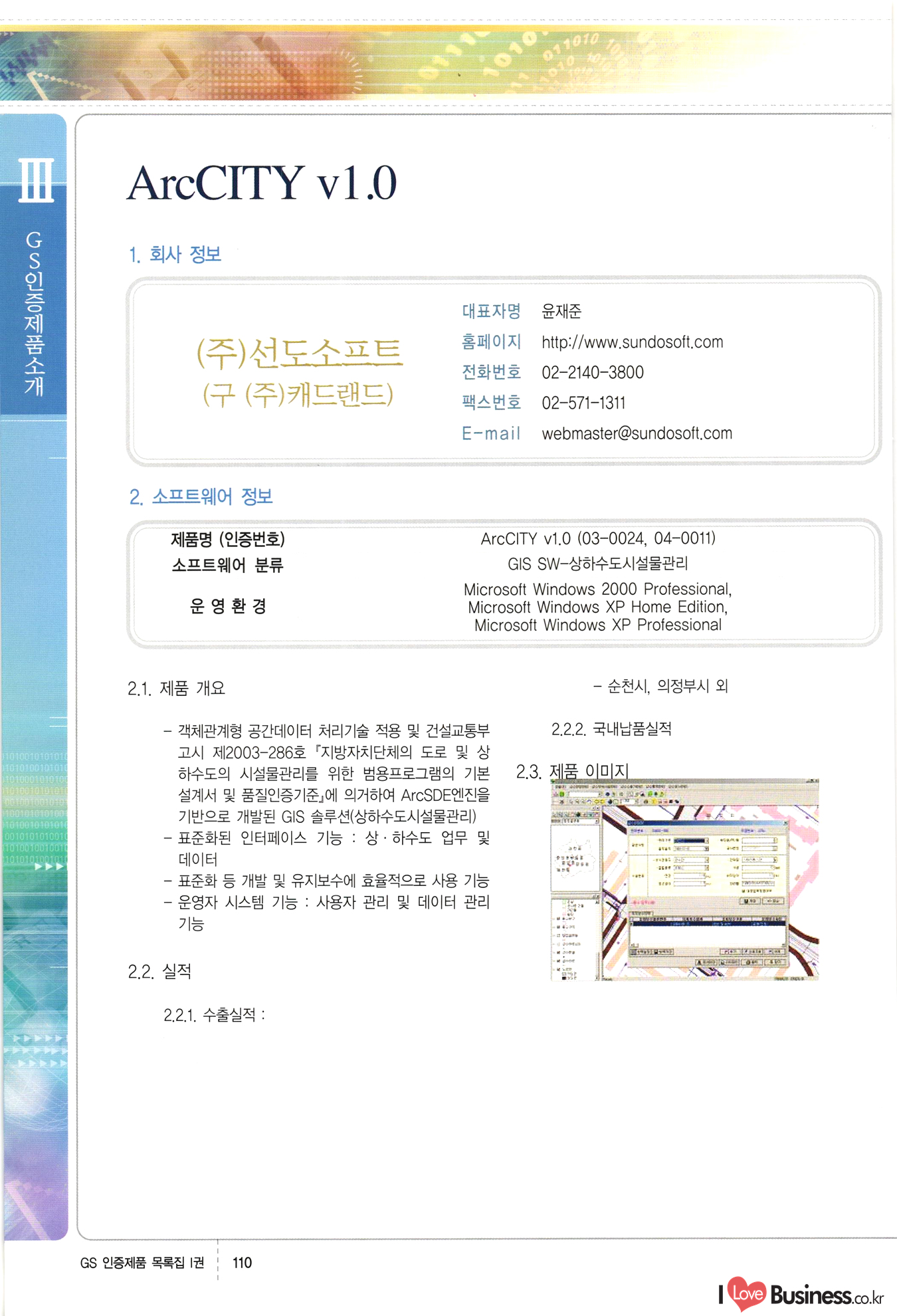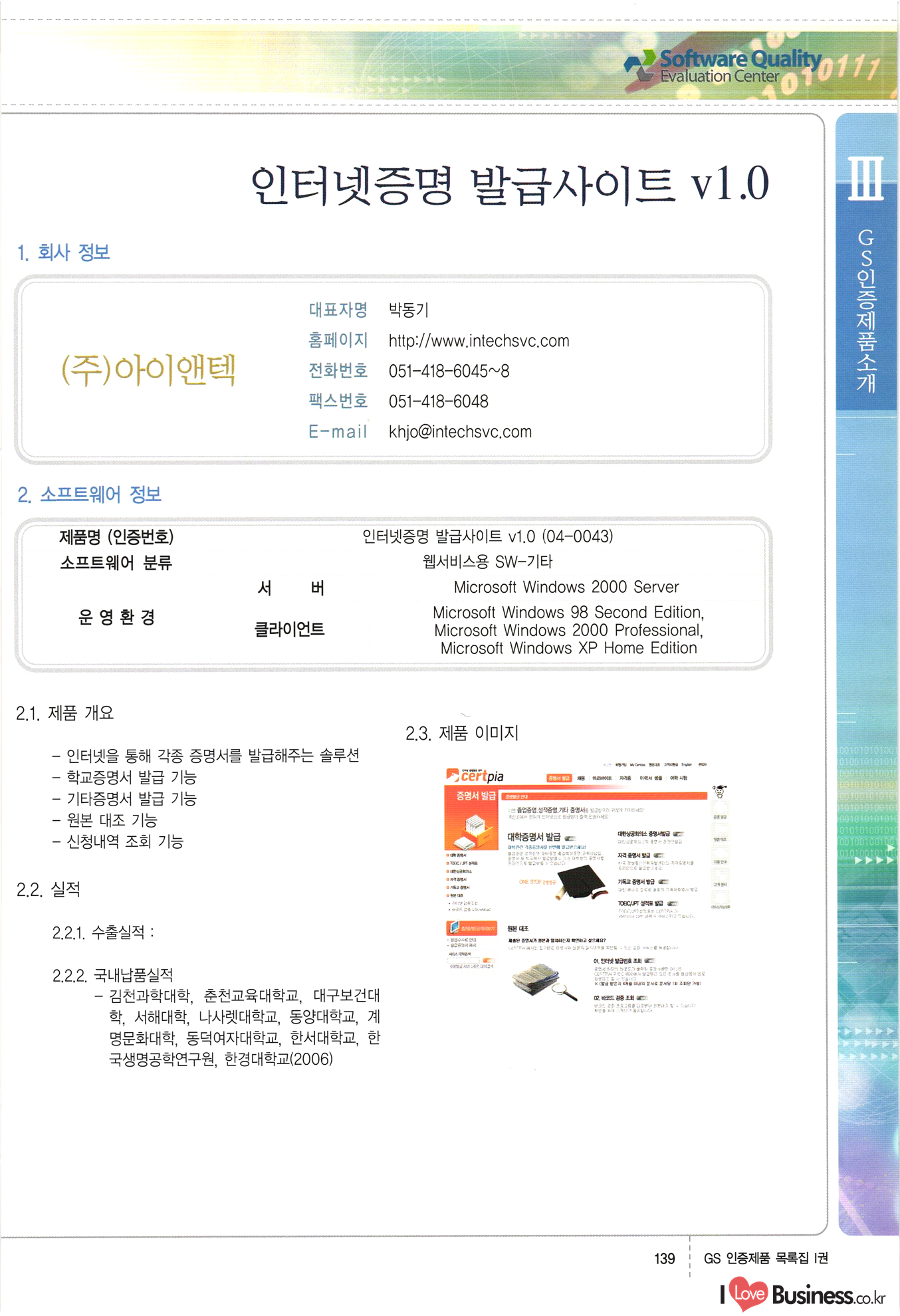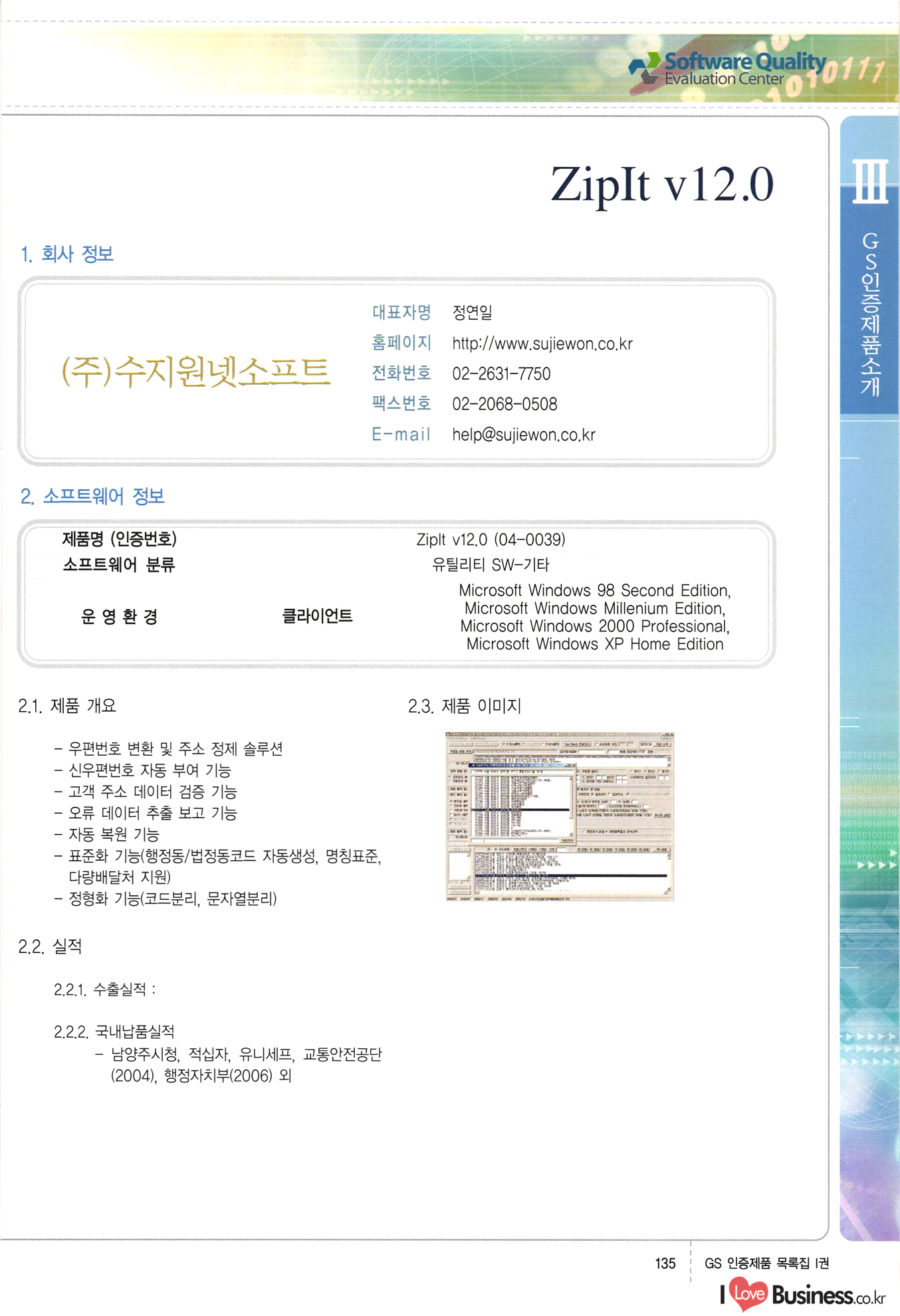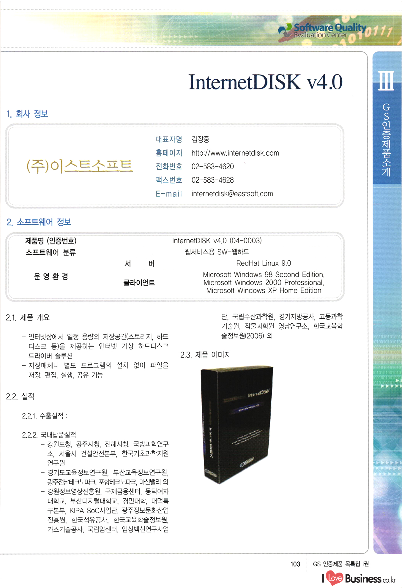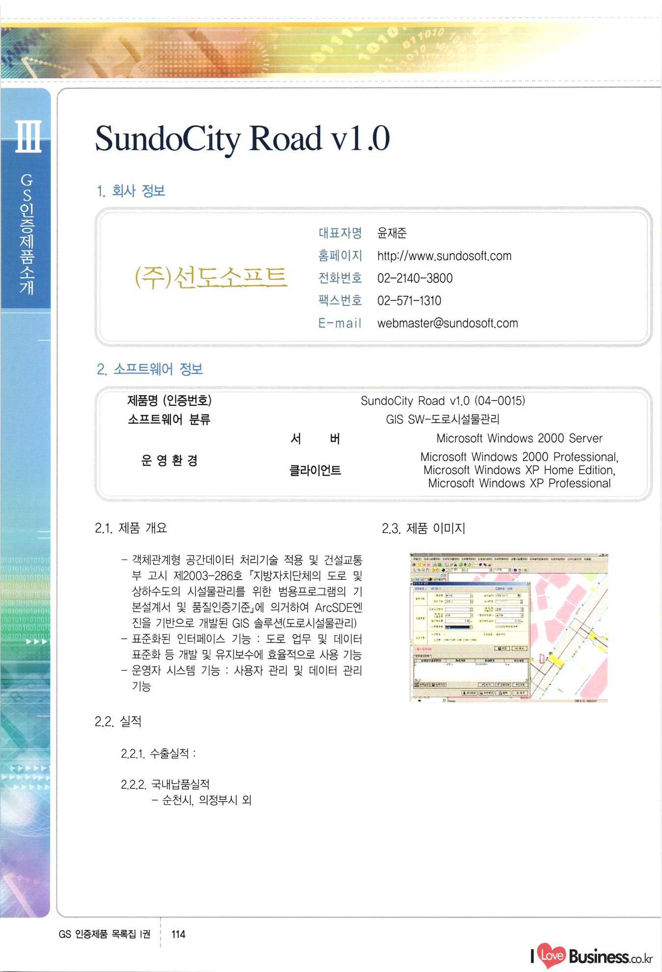 | III. GS 인증제품 목록 | 권-페이지번호 | 권-페이지번호 VT : VeriTest 국제 인증 GS인증제품목록 회사명 삼성에스디에스(주) 제품. EasyBase v4.1 페이지 50 1 제이엔에스 3DM Survey System v1.0 2 | 51 1 (주)싸이웍스 (주)테크다임 (주)다보넷 (주)로지스인포 CyberWALL 2000 v2.16 Jword v1.5 Touchsign v 2.1 키퍼엣홈 v1.0 78 52 (주)미래에듀테크 아이버스 v1.0 53 54 55 56 57 번호 | 인증번호 | 인증일자 01-0001 | 2001.07.25 101-0002 2001.10.22 (02-0027) | 01-0003 | 2001.11.27 | 01-0004 | 2001.11.27 | 01-0005 2001.11.27 5 | 01-0006 | 2001.12.27 02-0001 (02-0029) 2002.01.29 16 | | 02-0002 1 | 2002.02.16 | 02-0003 | 2002.02.16 02-0004 2002.02.27 9 | 02-0005 | 2002.02.27 110 | | 02-0006 | 2002.03.27 11 | || 02-0007 | 2002.03.27 | 02-0008 | 2002.04.30 | 02-0009 | 2002.04.30 | 02-0010 | 2002.04.30 15. | 02-0011 | 2002.04.30 16 102-0012 | 2002.04.30 | 17 | 02-0013 | 2002.05.30 | 18 | 02-0014 | 2002.05.30 | 02-0015 2002.06.28 | 20 | 02-0016 | 2002.06.28 02-0017 1 2002.06.28 | 02-0018 1 | 2002.06.28 23 | 02-0019 | 2002.06.28 24 02-0020 | 2002.07.31 25 | 02-0021 | 2002.07.31 224 58 14 59 118 (주)마크애니 (주)핸디소프트 (주)슈퍼테크놀러지 (주)스펙트라 이래정보시스템(주) (주)컴리빙아이티 | (주)시큐브 (주)케이게이트 (주)소프트4소프트 스페이스인터네셔널(주) (주)컴리빙아이티 (주)그린벨시스템즈 닉스테크(주) 심플소프트 (주)한국데이타비즈네스 (주)테크다임 (주)수세리눅스코리아 (주)한컴리눅스 소프트온넷(주) 와우리눅스(주) 60 61 Document Safer v1.0 | BizFlow Groupware v3.21 | Eg columbus || v1.0 | | eNomix v1.0 Blue Eyes v3.0 i-Class Five v1.05 Secuve TOS WG v1.0 위즈웹3 v3.0 RESORT v1.01 CD Tower v2.0 i-Class One2one v1.05 MANTIS-Professional v1.0 | | SAFEpc v1.5 Simple Gallery v1.00 통합카드발급프로그램 v1.0 Techdigm JCalc v2.0 Suse Linux 7.1K Professional Hancom Linux OS 2.2 Professional | Z!Stream v2.0 와우리눅스 7.1 파란 Secuve TOS WG Agent (Secuve Tos WG Manager) | SMERP v1.1 상하수도범용/ZEUS v1.0 U-Solver v1.0 dDIMS v3.0 DAL v2.5 101010101 1000 101003010101 190 1001010101 21 78. 122 | UL 63 64 65 26 | VT-02-001 | 2002.08.29 (주)시큐브 224 27 1 66 67 | 28 29 130 | 02-0022 | 2002.08.30 | 02-0023 | 2002.10.31 | 02-0024 | 2002.10.31 | 02-0025 | 2002.11.27 | 02-0026 | 2002.11.27 02-0027 (01-0002) 2002.11.27 | 02-0028 (03-0021) 2002.12.09 | 대한상공회의소 한국통신데이타(주) (주)지노시스템 유니온정보시스템(주) (주) 스 68 69 | 70 311 제이엔에스 소프트(구 제이엔에스) 3DM Survey System v1.0 (주)한국지능형정보시스템 한국관(상하수도 범용/TGW) v1.00 92 GS 인증제품 목록집 1권 | 26 I Love Business.co.kr Software Quality, 111 Evaluation Center | 권-페이지번호 II권페이지번호 VT : VeriTest 국제 인증 페이지 회사명 (주)포스데이타 제품 | iSign v2.0 | GS인증제품목록 171 | 34 | 02-0029 (주)제이슨테크(구 미래에듀테크) 아이버스 v1.0 91 72 73. 74 (주)인텔리젼스웨어 (주)하나디에스디 (주)연성정보기술 (주)포스정보 (주)켈코인 (주)포스데이타 스페이스인터내셔널 연희정보통신(주) (주)뉴테크웨이브 c-napse(GSS) v1.0 Life EduBuilder v1.0 | Email+ v3.0 1 책꽃이KDC v3.1 Challenger Webzine Webschool v3.0 1 Biz Binder v1.0 CD-Tower v3.1 상하수도 범용/UFCom v1.0 | | VirusChaser v5.0 | 175 76 118. (주)웨어벨리 Orange for ORACLE v2.2 | 번호 | 인증번호 | 인증일자 | 33 |VT-02-0022002.12.12 | | 2002.12.24 (02-0001) 35 | VT-02-003 | 2002.12.30 | 36 | 03-0001 | 2003.02.28 37. 03-0002 | 2003.02.28 | 38 | 03-0003 | 2003.02.28 | 39 | 03-0004 | 2003.02.28 40 | VT-03-001 | 2003.03.10 41 | VT-03-002) 2003.03.10 1 42 | 03-0005 | 2003.04.07 43 | 03-0006 | 2003.04.07 03-0007 2003.04.30 (03-0026) | 03-0008 | 2003.04.30 45 | 03-0009 | 2003.04.30 | 03-0010 | 2003.04.30 | 47 | 03-0011 | 2003.04.30 | 48 VT-03-003 2003.05.26 49 | 03-0012 | 2003.06.05 | 50 | 03-0013 | 2003.06.05 | 51 | 03-0014 | 2003.06.05 | 52 | 03-0015 | 2003.07.10 | 53 | 03-0016 | 2003.07.10 | 54 | 03-0017 | 2003.07.10 | | 55 | 03-0018 | 2003.07.10 | 56 | 03-0019 | 2003.08.06 57 | | 03-0020 | 2003.08.06 44 1 18 46 80 81 82 83 | (주)테크다임 (주)엔지스테크널러지 삼성에스디에스(주) 삼성에스디에스(주) (주)미디어랜드 인터컴소프트웨어(주) 에스케이씨앤씨(주) 아이티로직스(주) (주)에이씨티소프트 (주)위즈북 (주)에스오엔코리아 (주)아리수미디어 한진정보통신(주) (주)인텔리전스웨어 (주)웨어밸리 (구 (주)오알솔루션즈코리아) Techdigm Office v2.0 | G-Solution Waterworks/Sewerage v1.0 | | 79 UniCITY Standard v1.0 UniCITY Enterprise v1.0 TCO!stream 2002 v4.0 | ServerGuard v3.0 | SK-UPEX v1.0 84 NexWeb v1.2 e-Library Deluxe v4.1.5 86 DL Pro v1.0 SiR v1.01 파워CD뱅크 v4.0 89 InfoMatrix v1.00 190 Bizpus v1.0 91 85 87 88 10010010101.03 1101010100101 1100100100107 58 |VT-03-004 2003.08.12 Orange for ORACLE v2.2 | 111 59 (주)티지더블유 (구 한국지능형정보시스템) 한국관(상하수도 범용/TGW) v1.0 92 93 GIS Free v1.0 DeskPlus v2.0 1 | 94 ArcCITY v1.0 110 03-0021 (02-0028) | 2003.09.04 | 60 | 03-0022 | 2003.09.30 03-0023 | 2003.09.30 03-0024 (04-0011) | 2003.09.30 | 03-0025 | 2003.09.30 03-0026 (03-0007) | 2003.10.07 63 | 03-0027 | 2003.11.12 64 | 03-0028 | 2003.11.12 622 세광정보시스템(주) 제오스페이스(주) (주)선도소프트 (구 (주)캐드랜드) 중앙항업(주) (주)웨어밸리 (구 (주)오알솔루션즈코리아) (주)우암닷컴 (주)오투라인 geoCUBE상하수도 v1.0 95 Orange for ORACLE V2.2 111 96 RAVCOMS Eyecon v4.0 오투스쿨 v2.01 97 GS 인증제품 목록집 1권 I Love Business.co.kr | 권-페이지번호 | 권 - 페이지번호 VT : VeriTest 국제 인증 번호 페이지 회사명 소프트캠프