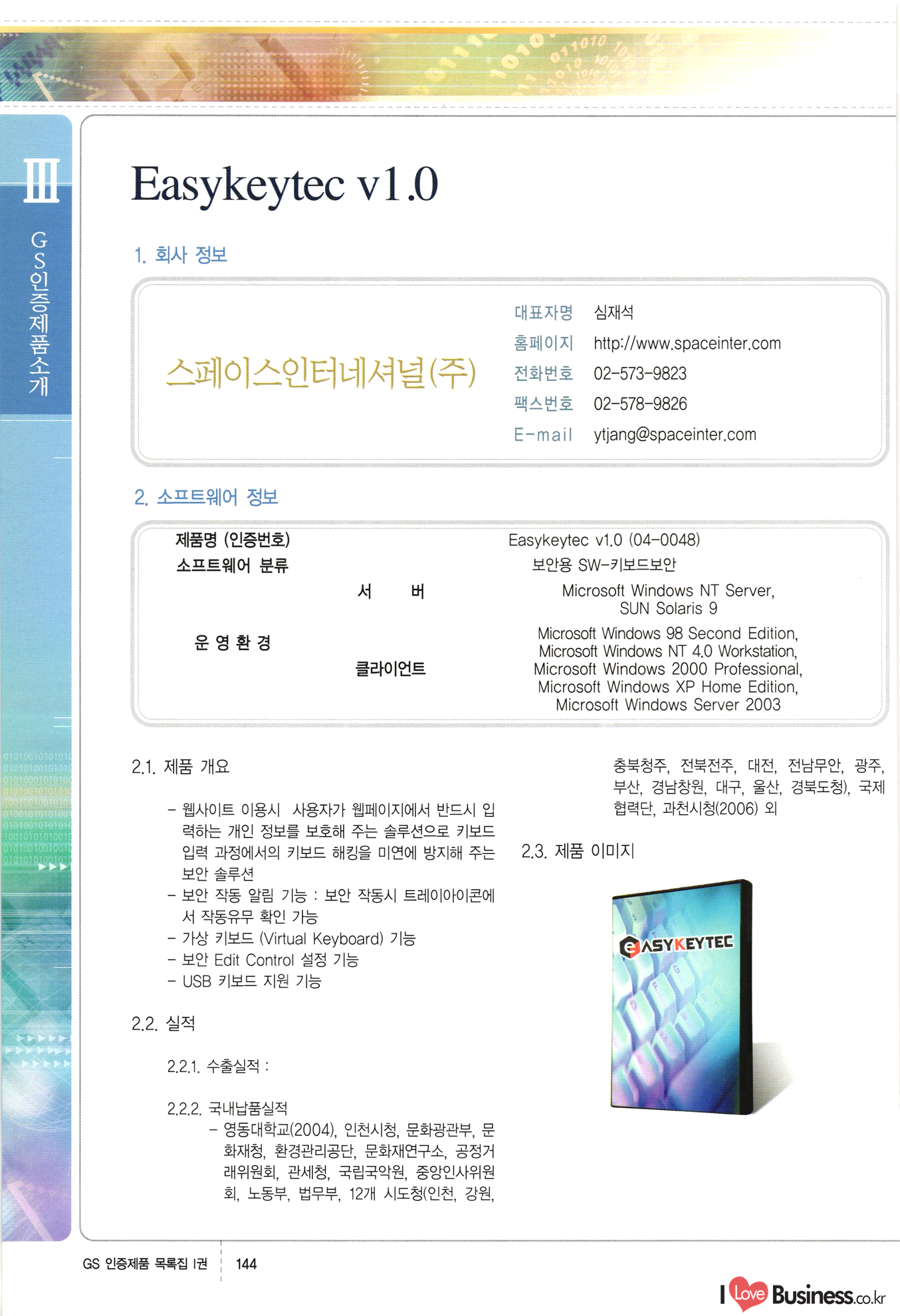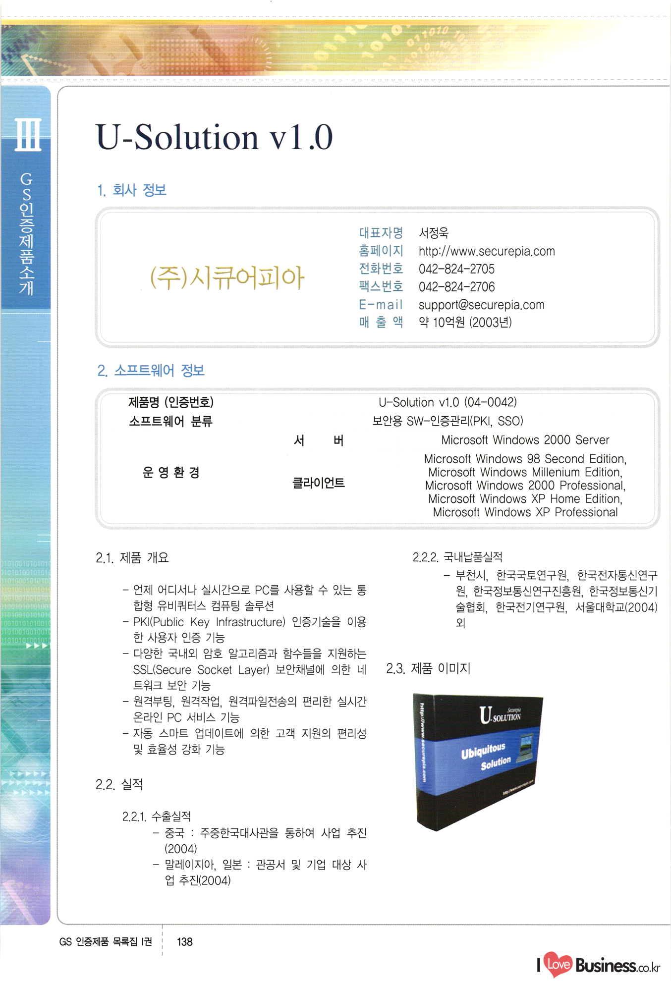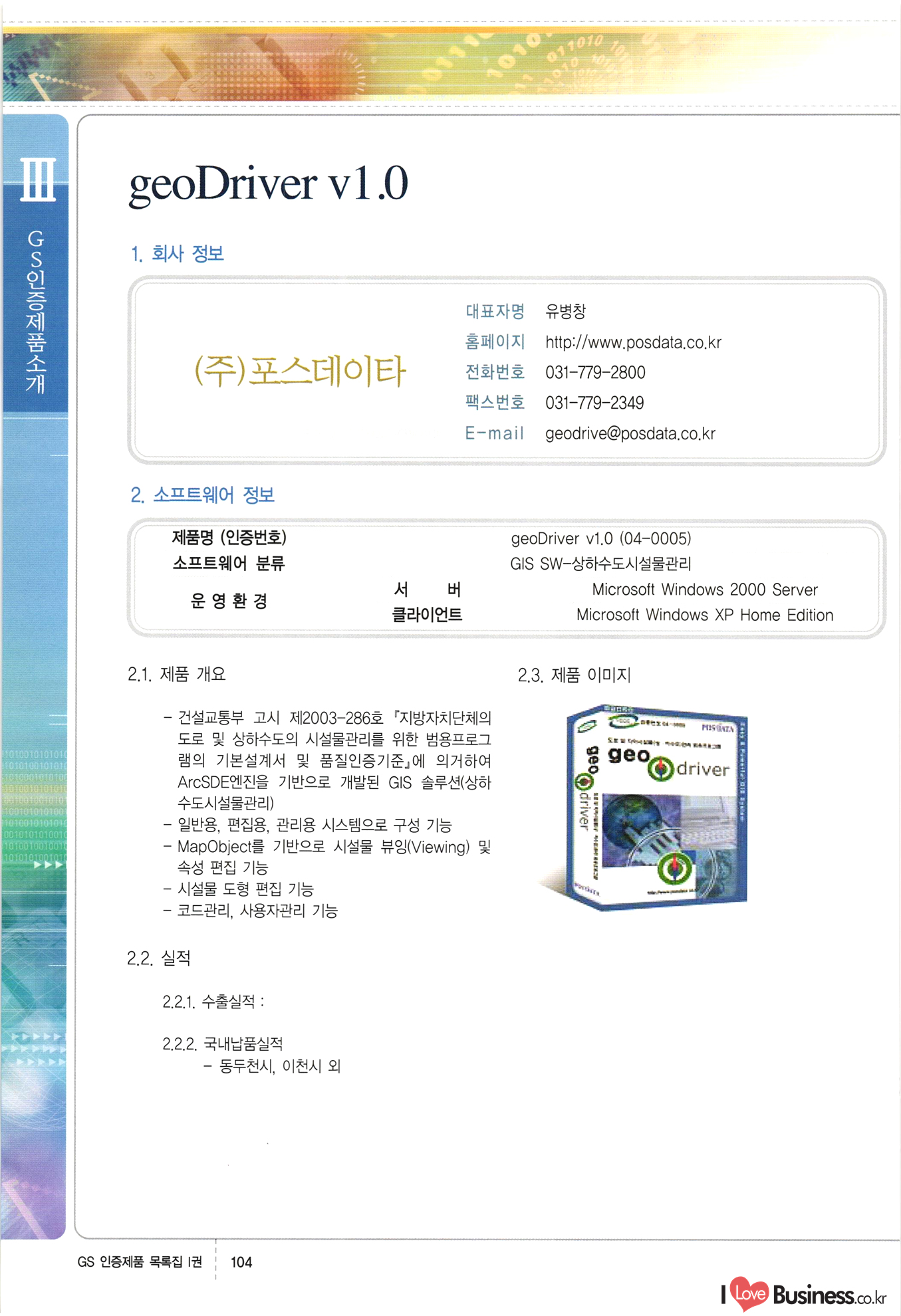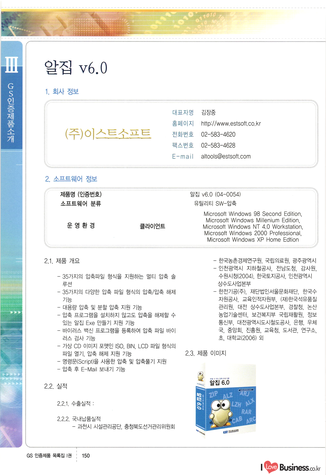 | III. GS 인증제품 목록 | 권-페이지번호 | 권-페이지번호 VT : VeriTest 국제 인증 GS인증제품목록 회사명 삼성에스디에스(주) 제품. EasyBase v4.1 페이지 50 1 제이엔에스 3DM Survey System v1.0 2 | 51 1 (주)싸이웍스 (주)테크다임 (주)다보넷 (주)로지스인포 CyberWALL 2000 v2.16 Jword v1.5 Touchsign v 2.1 키퍼엣홈 v1.0 78 52 (주)미래에듀테크 아이버스 v1.0 53 54 55 56 57 번호 | 인증번호 | 인증일자 01-0001 | 2001.07.25 101-0002 2001.10.22 (02-0027) | 01-0003 | 2001.11.27 | 01-0004 | 2001.11.27 | 01-0005 2001.11.27 5 | 01-0006 | 2001.12.27 02-0001 (02-0029) 2002.01.29 16 | | 02-0002 1 | 2002.02.16 | 02-0003 | 2002.02.16 02-0004 2002.02.27 9 | 02-0005 | 2002.02.27 110 | | 02-0006 | 2002.03.27 11 | || 02-0007 | 2002.03.27 | 02-0008 | 2002.04.30 | 02-0009 | 2002.04.30 | 02-0010 | 2002.04.30 15. | 02-0011 | 2002.04.30 16 102-0012 | 2002.04.30 | 17 | 02-0013 | 2002.05.30 | 18 | 02-0014 | 2002.05.30 | 02-0015 2002.06.28 | 20 | 02-0016 | 2002.06.28 02-0017 1 2002.06.28 | 02-0018 1 | 2002.06.28 23 | 02-0019 | 2002.06.28 24 02-0020 | 2002.07.31 25 | 02-0021 | 2002.07.31 224 58 14 59 118 (주)마크애니 (주)핸디소프트 (주)슈퍼테크놀러지 (주)스펙트라 이래정보시스템(주) (주)컴리빙아이티 | (주)시큐브 (주)케이게이트 (주)소프트4소프트 스페이스인터네셔널(주) (주)컴리빙아이티 (주)그린벨시스템즈 닉스테크(주) 심플소프트 (주)한국데이타비즈네스 (주)테크다임 (주)수세리눅스코리아 (주)한컴리눅스 소프트온넷(주) 와우리눅스(주) 60 61 Document Safer v1.0 | BizFlow Groupware v3.21 | Eg columbus || v1.0 | | eNomix v1.0 Blue Eyes v3.0 i-Class Five v1.05 Secuve TOS WG v1.0 위즈웹3 v3.0 RESORT v1.01 CD Tower v2.0 i-Class One2one v1.05 MANTIS-Professional v1.0 | | SAFEpc v1.5 Simple Gallery v1.00 통합카드발급프로그램 v1.0 Techdigm JCalc v2.0 Suse Linux 7.1K Professional Hancom Linux OS 2.2 Professional | Z!Stream v2.0 와우리눅스 7.1 파란 Secuve TOS WG Agent (Secuve Tos WG Manager) | SMERP v1.1 상하수도범용/ZEUS v1.0 U-Solver v1.0 dDIMS v3.0 DAL v2.5 101010101 1000 101003010101 190 1001010101 21 78. 122 | UL 63 64 65 26 | VT-02-001 | 2002.08.29 (주)시큐브 224 27 1 66 67 | 28 29 130 | 02-0022 | 2002.08.30 | 02-0023 | 2002.10.31 | 02-0024 | 2002.10.31 | 02-0025 | 2002.11.27 | 02-0026 | 2002.11.27 02-0027 (01-0002) 2002.11.27 | 02-0028 (03-0021) 2002.12.09 | 대한상공회의소 한국통신데이타(주) (주)지노시스템 유니온정보시스템(주) (주) 스 68 69 | 70 311 제이엔에스 소프트(구 제이엔에스) 3DM Survey System v1.0 (주)한국지능형정보시스템 한국관(상하수도 범용/TGW) v1.00 92 GS 인증제품 목록집 1권 | 26 I Love Business.co.kr Software Quality, 111 Evaluation Center | 권-페이지번호 II권페이지번호 VT : VeriTest 국제 인증 페이지 회사명 (주)포스데이타 제품 | iSign v2.0 | GS인증제품목록 171 | 34 | 02-0029 (주)제이슨테크(구 미래에듀테크) 아이버스 v1.0 91 72 73. 74 (주)인텔리젼스웨어 (주)하나디에스디 (주)연성정보기술 (주)포스정보 (주)켈코인 (주)포스데이타 스페이스인터내셔널 연희정보통신(주) (주)뉴테크웨이브 c-napse(GSS) v1.0 Life EduBuilder v1.0 | Email+ v3.0 1 책꽃이KDC v3.1 Challenger Webzine Webschool v3.0 1 Biz Binder v1.0 CD-Tower v3.1 상하수도 범용/UFCom v1.0 | | VirusChaser v5.0 | 175 76 118. (주)웨어벨리 Orange for ORACLE v2.2 | 번호 | 인증번호 | 인증일자 | 33 |VT-02-0022002.12.12 | | 2002.12.24 (02-0001) 35 | VT-02-003 | 2002.12.30 | 36 | 03-0001 | 2003.02.28 37. 03-0002 | 2003.02.28 | 38 | 03-0003 | 2003.02.28 | 39 | 03-0004 | 2003.02.28 40 | VT-03-001 | 2003.03.10 41 | VT-03-002) 2003.03.10 1 42 | 03-0005 | 2003.04.07 43 | 03-0006 | 2003.04.07 03-0007 2003.04.30 (03-0026) | 03-0008 | 2003.04.30 45 | 03-0009 | 2003.04.30 | 03-0010 | 2003.04.30 | 47 | 03-0011 | 2003.04.30 | 48 VT-03-003 2003.05.26 49 | 03-0012 | 2003.06.05 | 50 | 03-0013 | 2003.06.05 | 51 | 03-0014 | 2003.06.05 | 52 | 03-0015 | 2003.07.10 | 53 | 03-0016 | 2003.07.10 | 54 | 03-0017 | 2003.07.10 | | 55 | 03-0018 | 2003.07.10 | 56 | 03-0019 | 2003.08.06 57 | | 03-0020 | 2003.08.06 44 1 18 46 80 81 82 83 | (주)테크다임 (주)엔지스테크널러지 삼성에스디에스(주) 삼성에스디에스(주) (주)미디어랜드 인터컴소프트웨어(주) 에스케이씨앤씨(주) 아이티로직스(주) (주)에이씨티소프트 (주)위즈북 (주)에스오엔코리아 (주)아리수미디어 한진정보통신(주) (주)인텔리전스웨어 (주)웨어밸리 (구 (주)오알솔루션즈코리아) Techdigm Office v2.0 | G-Solution Waterworks/Sewerage v1.0 | | 79 UniCITY Standard v1.0 UniCITY Enterprise v1.0 TCO!stream 2002 v4.0 | ServerGuard v3.0 | SK-UPEX v1.0 84 NexWeb v1.2 e-Library Deluxe v4.1.5 86 DL Pro v1.0 SiR v1.01 파워CD뱅크 v4.0 89 InfoMatrix v1.00 190 Bizpus v1.0 91 85 87 88 10010010101.03 1101010100101 1100100100107 58 |VT-03-004 2003.08.12 Orange for ORACLE v2.2 | 111 59 (주)티지더블유 (구 한국지능형정보시스템) 한국관(상하수도 범용/TGW) v1.0 92 93 GIS Free v1.0 DeskPlus v2.0 1 | 94 ArcCITY v1.0 110 03-0021 (02-0028) | 2003.09.04 | 60 | 03-0022 | 2003.09.30 03-0023 | 2003.09.30 03-0024 (04-0011) | 2003.09.30 | 03-0025 | 2003.09.30 03-0026 (03-0007) | 2003.10.07 63 | 03-0027 | 2003.11.12 64 | 03-0028 | 2003.11.12 622 세광정보시스템(주) 제오스페이스(주) (주)선도소프트 (구 (주)캐드랜드) 중앙항업(주) (주)웨어밸리 (구 (주)오알솔루션즈코리아) (주)우암닷컴 (주)오투라인 geoCUBE상하수도 v1.0 95 Orange for ORACLE V2.2 111 96 RAVCOMS Eyecon v4.0 오투스쿨 v2.01 97 GS 인증제품 목록집 1권 I Love Business.co.kr | 권-페이지번호 | 권 - 페이지번호 VT : VeriTest 국제 인증 번호 페이지 회사명 소프트캠프